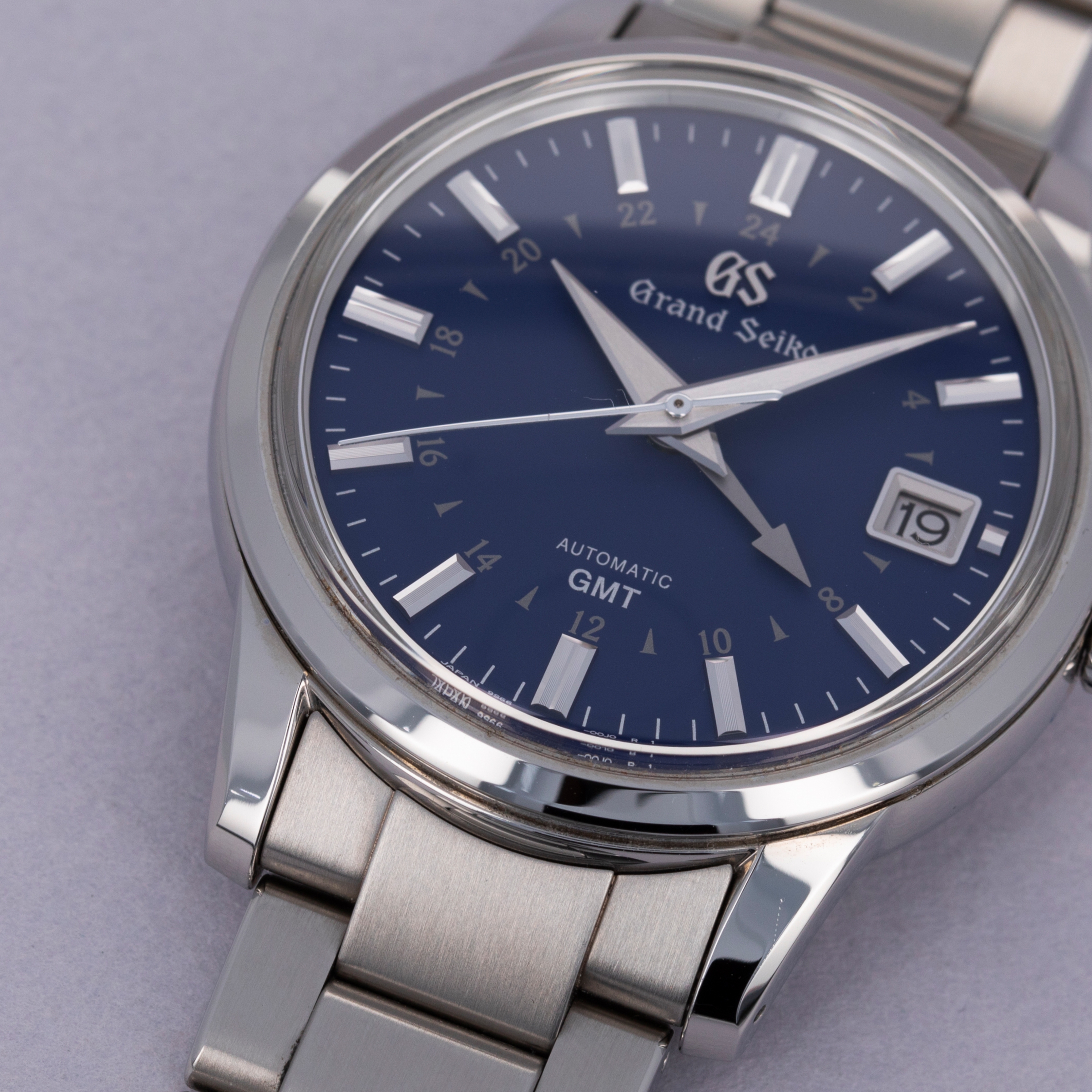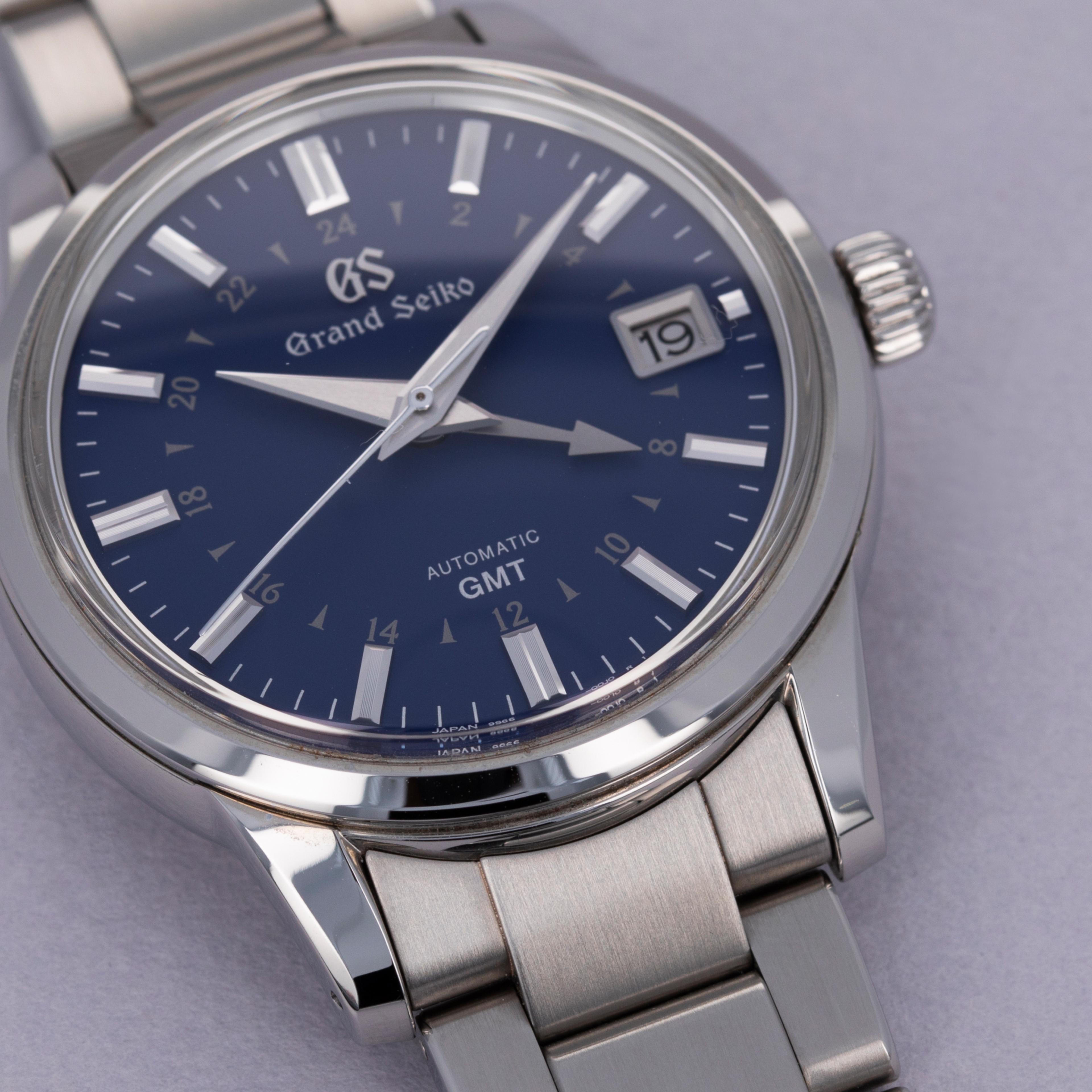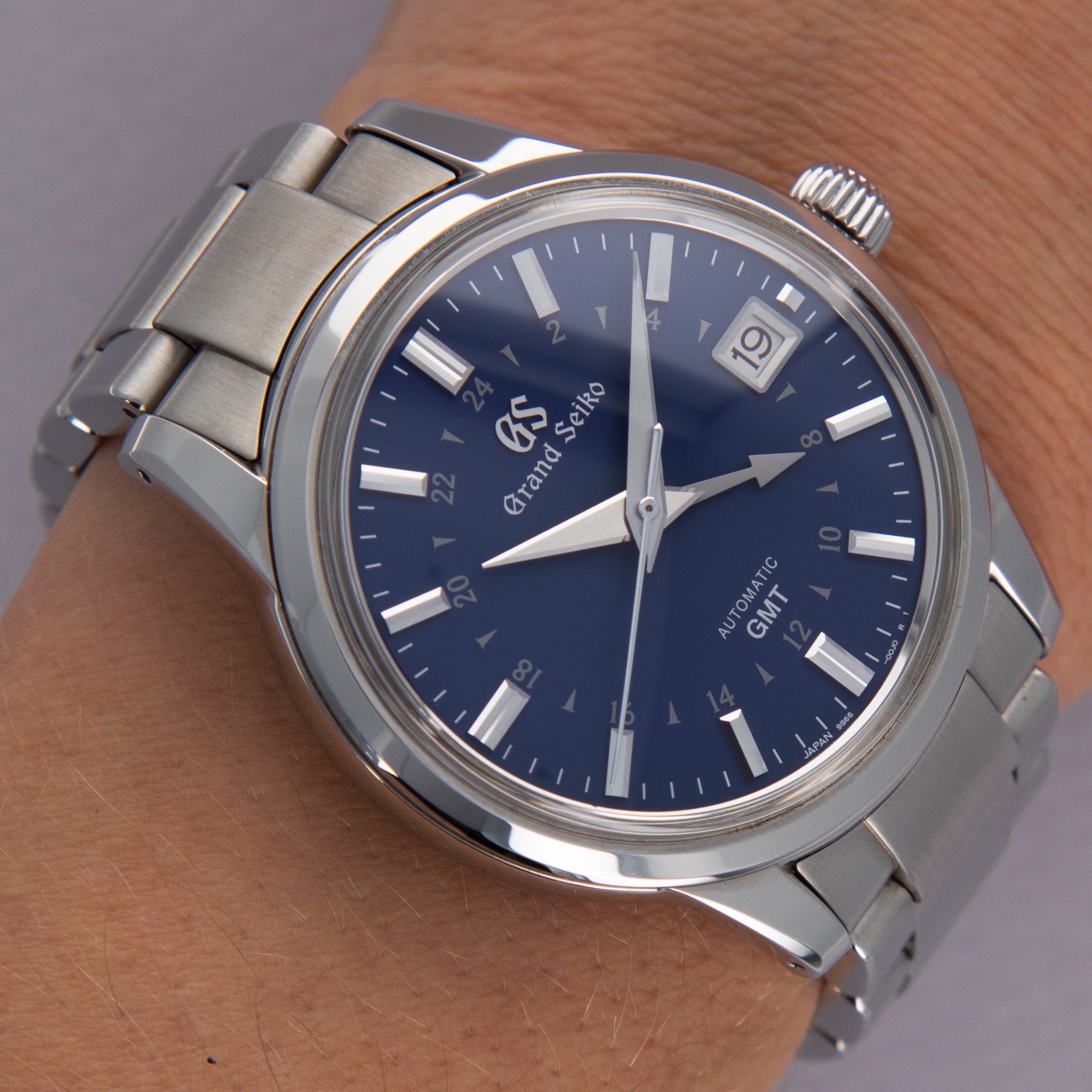 Displaying Grand Seiko's outstanding craftsmanship, the SBGM239's dial is partially inspired by the hours that contain the transition from day to night; dusk in English, or "Yūgure" in Japanese. With twilight blue as its main color, Hodinkee's signature shade of grey is used on the elements that relate to its GMT functions, such as its 24-hour scale and GMT hand.