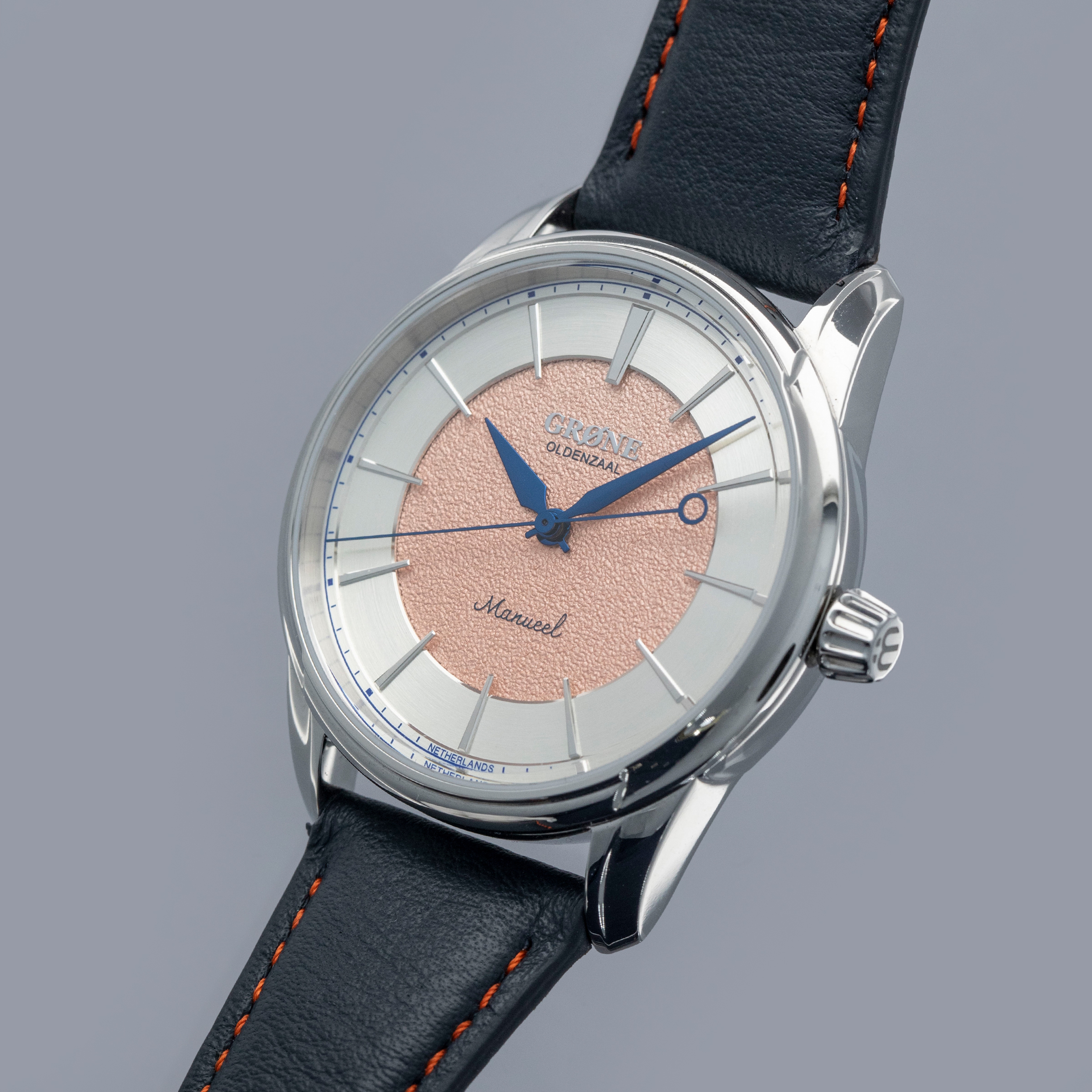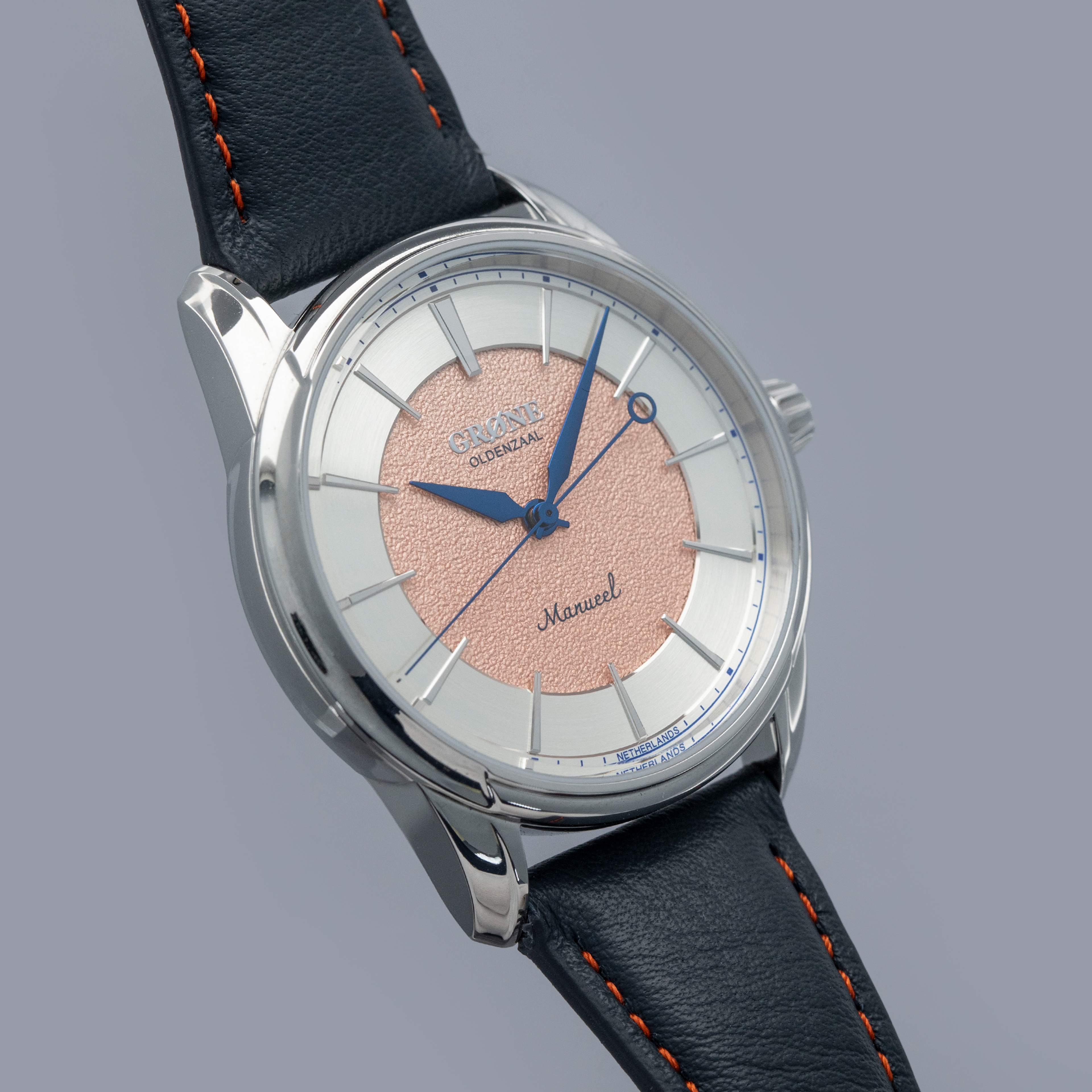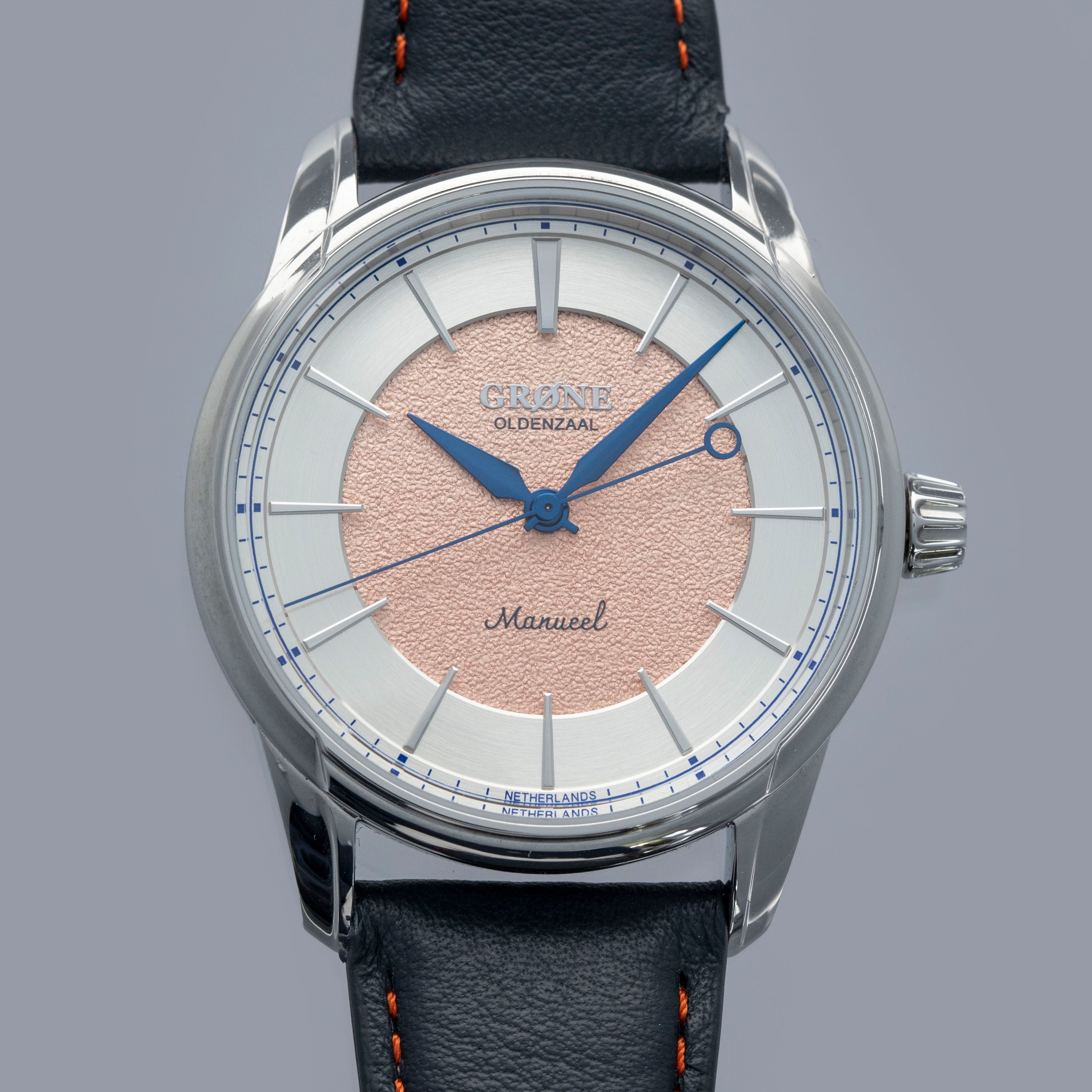 Founded by the Netherlands-based brothers Bart and Tim Gronefeld, their eponymous brand carries a legacy of watchmaking that dates back to 1912, bringing a wealth of expertise to each meticulously crafted timepiece. Combining contemporary aesthetics with classical mechanics, Gronefeld’s design language culminates in watches that are not merely timekeepers but wearable pieces of art. Taking their incredible success as one of independent watchmaking’s best-known brands to more collectors, Gronefeld launched their affordable sub-brand Grone in late 2024 with the Manueel One, which is the watch that we have here. Limited to only 388 pieces, made of stainless steel and boasting a salmon dial with a central tremblage finish surrounded by a rhodium-plated chapter ring and blued hands, the 38.5mm Manueel One lives and breathes Gronefeld’s iconic aesthetic, but at a fraction of the price under its new brand. With a stepped bezel and architectural lugs, the Manueel One carries a classical wrist presence much like Gronefeld’s Principia collection.