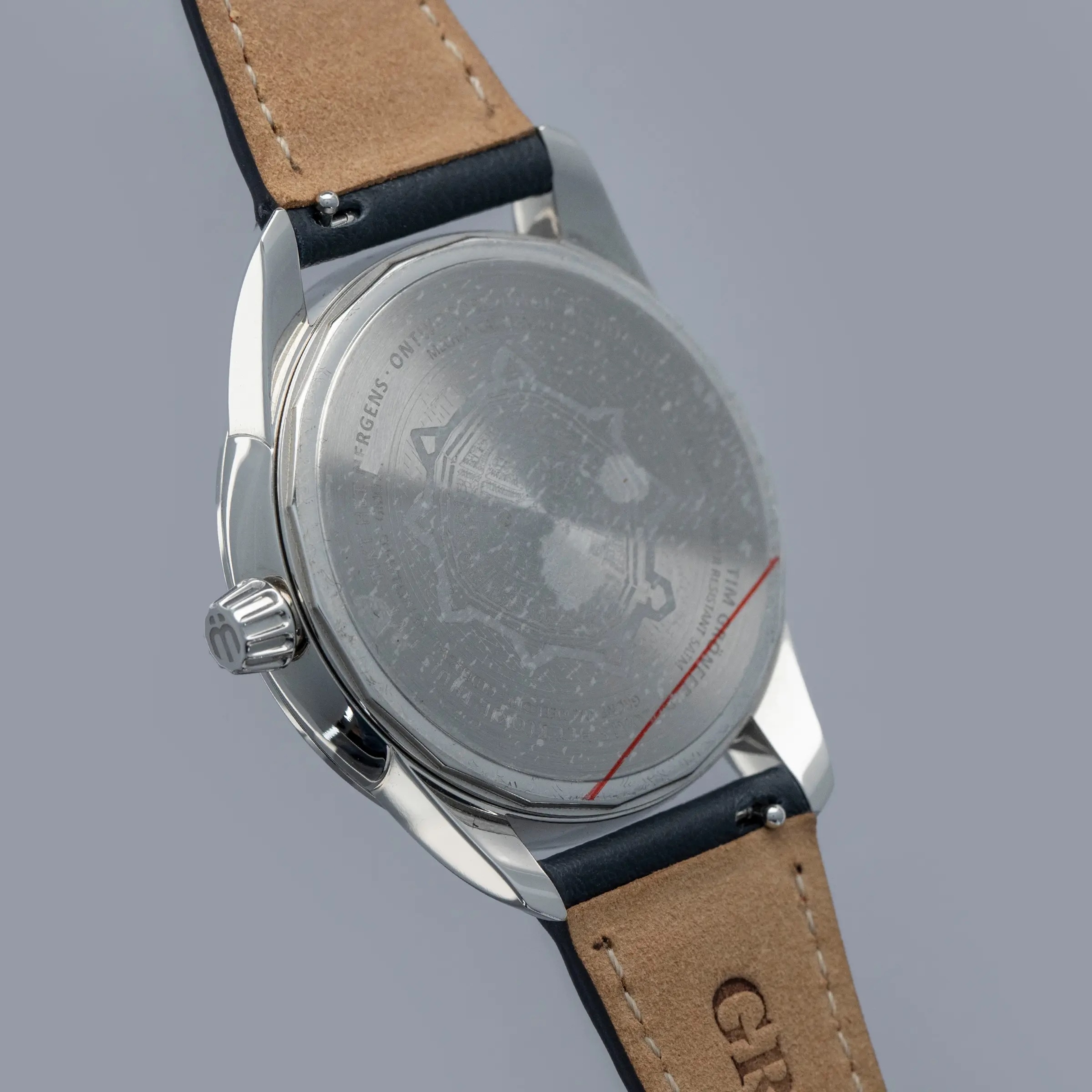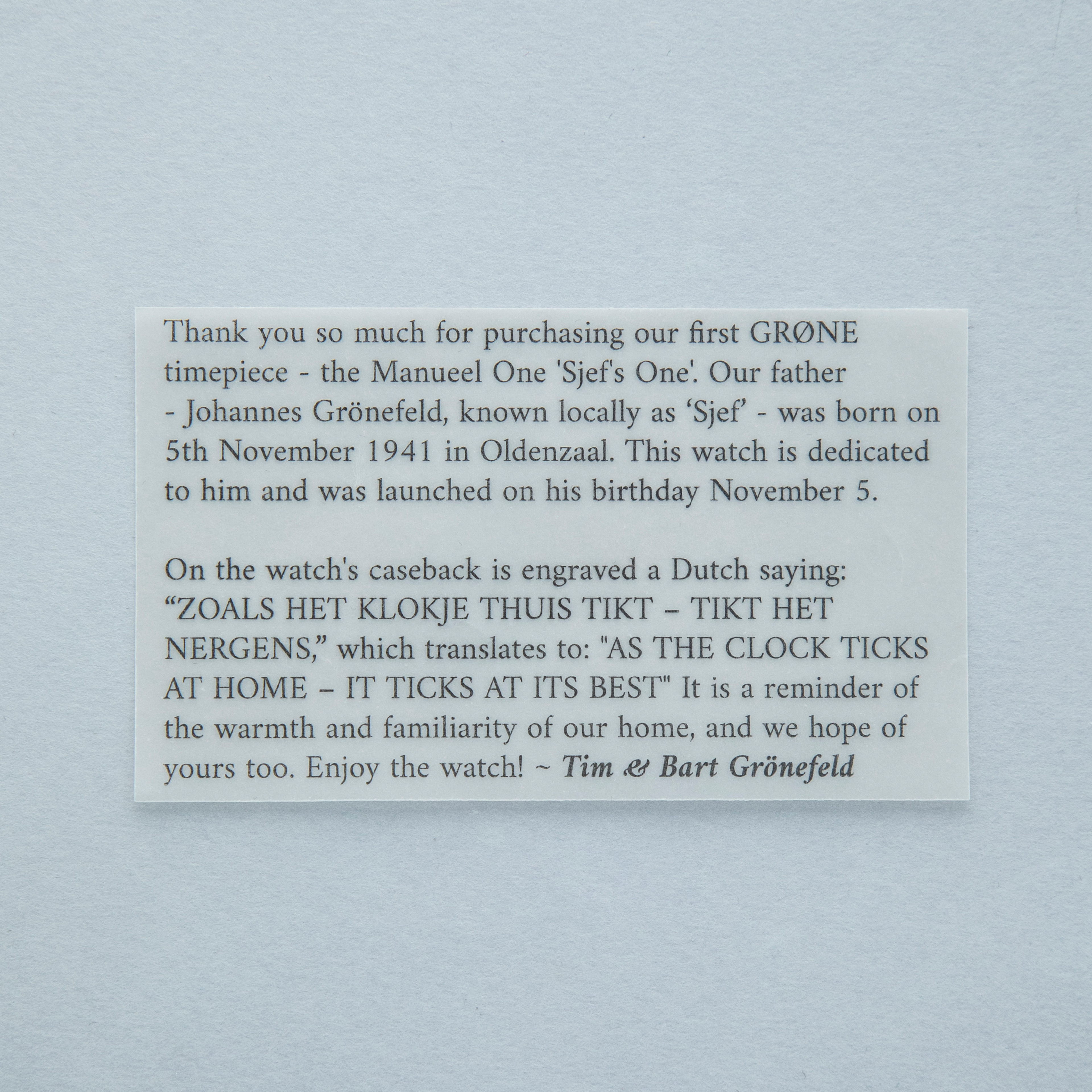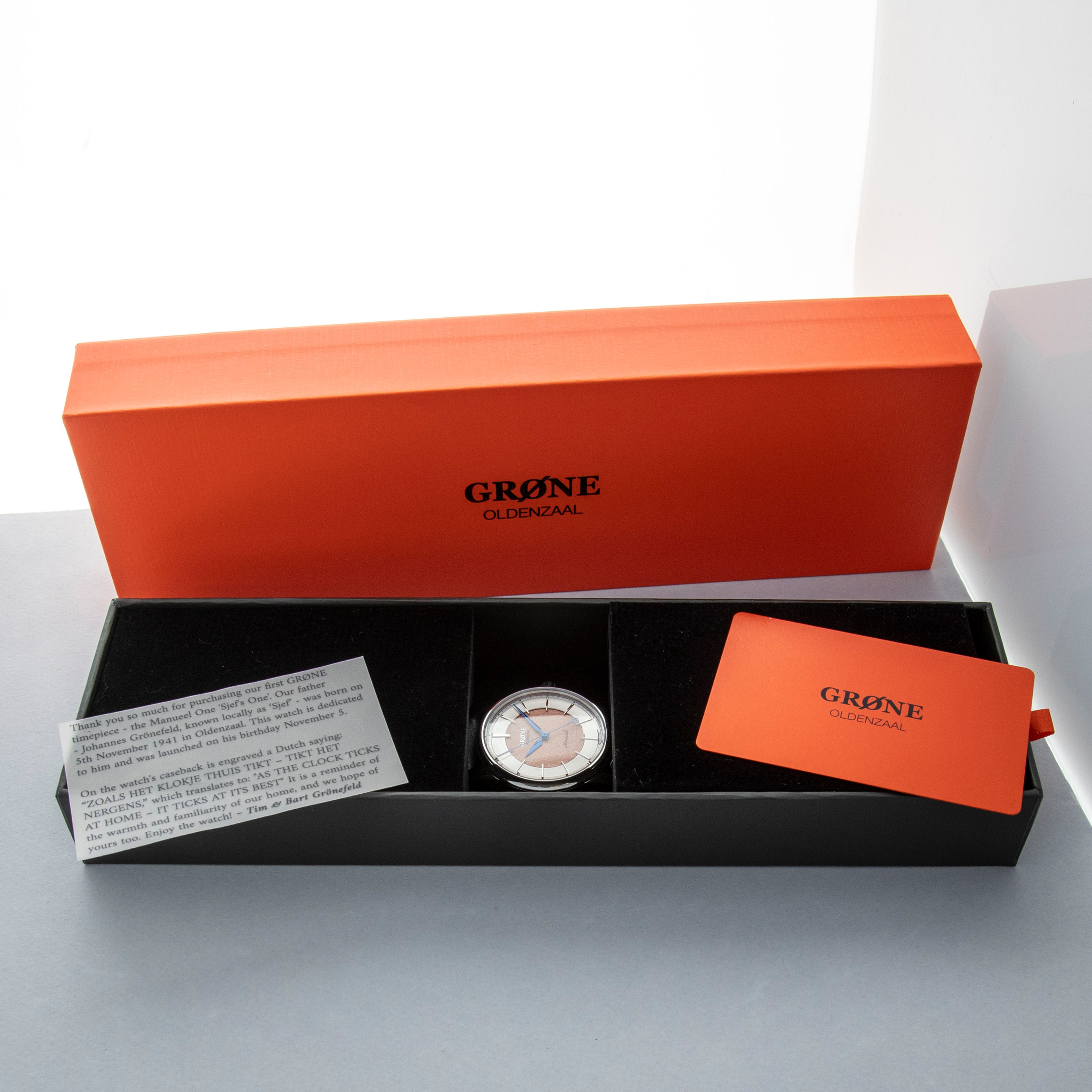Founded by the Netherlands-based brothers Bart and Tim Gronefeld, their eponymous brand carries a legacy of watchmaking that dates back to 1912, bringing a wealth of expertise to each meticulously crafted timepiece. Combining contemporary aesthetics with classical mechanics, Gronefeld’s design language culminates in watches that are not merely timekeepers but wearable pieces of art. Taking their incredible success as one of independent watchmaking’s best-known brands to more collectors, Gronefeld launched their affordable sub-brand Grone in late 2024 with the Manueel One, which is the watch that we have here. Limited to only 388 pieces, made of stainless steel and boasting a salmon dial with a central tremblage finish surrounded by a rhodium-plated chapter ring and blued hands, the 38.5mm Manueel One lives and breathes Gronefeld’s iconic aesthetic, but at a fraction of the price under its new brand. With a stepped bezel and architectural lugs, the Manueel One carries a classical wrist presence much like Gronefeld’s Principia collection.