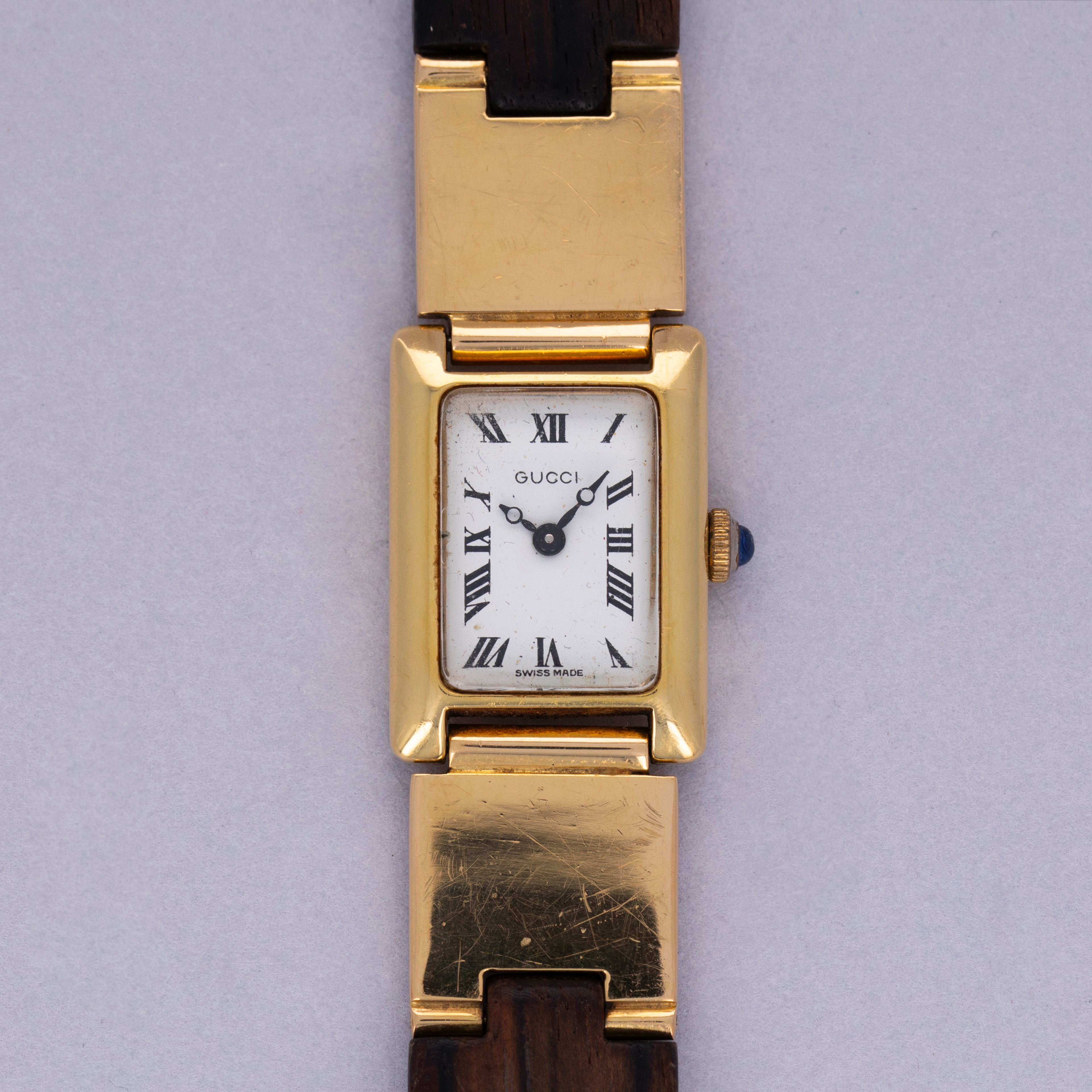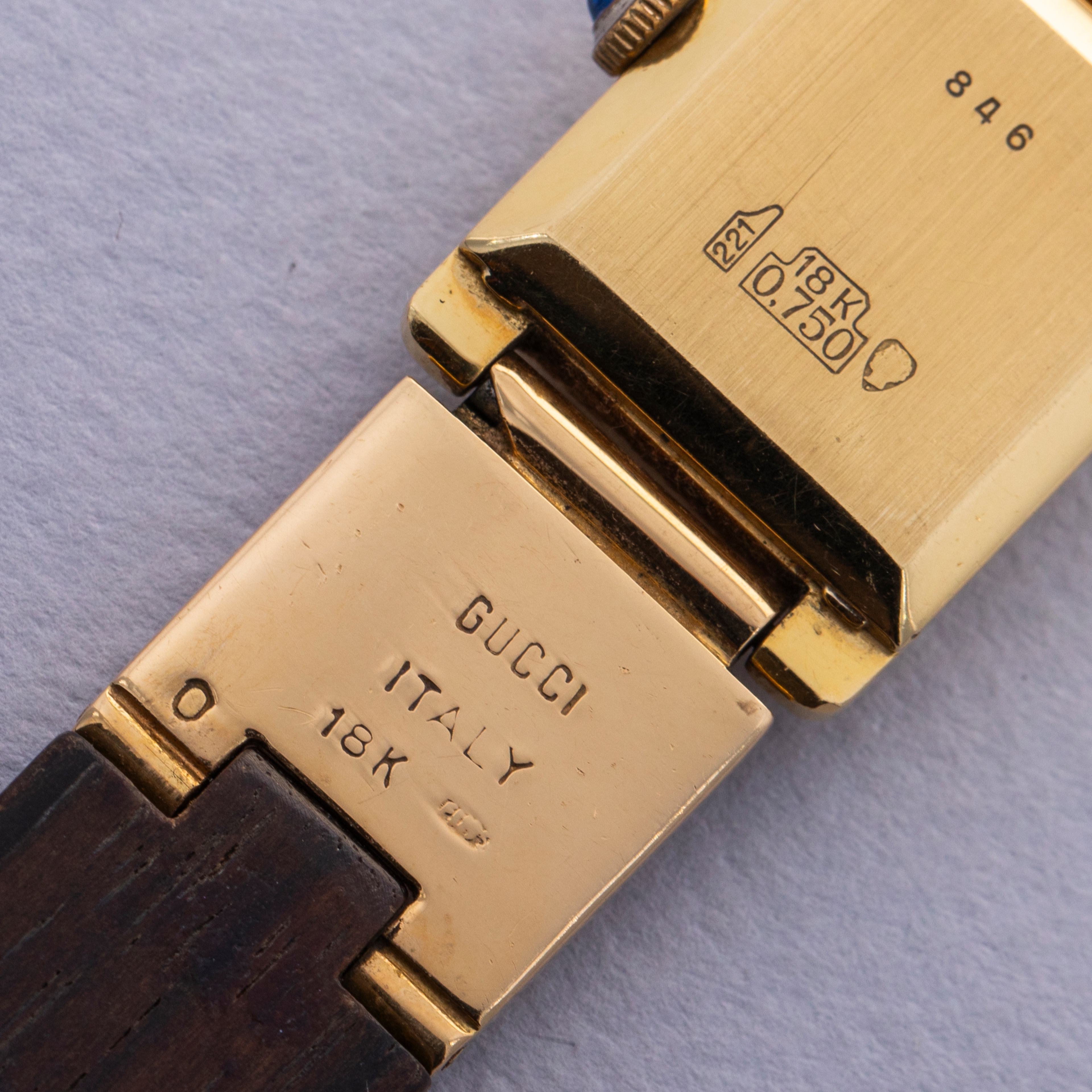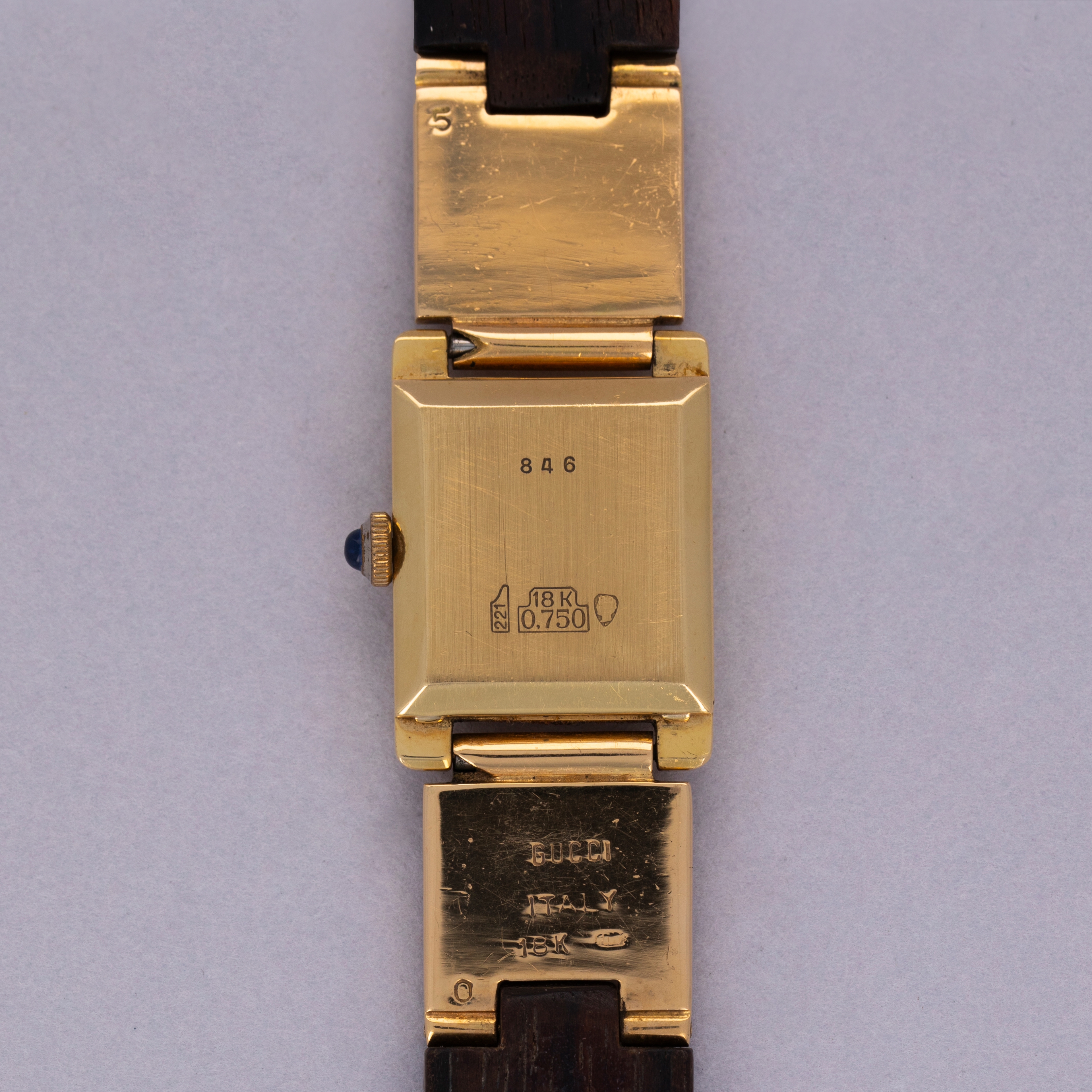 Boasting an 18kt yellow gold rectangular Tank-style case, this Gucci watch's departure from the rest of watchmaking's norms begins with its bracelet, which features a unique blend of 18kt gold and wooden links.