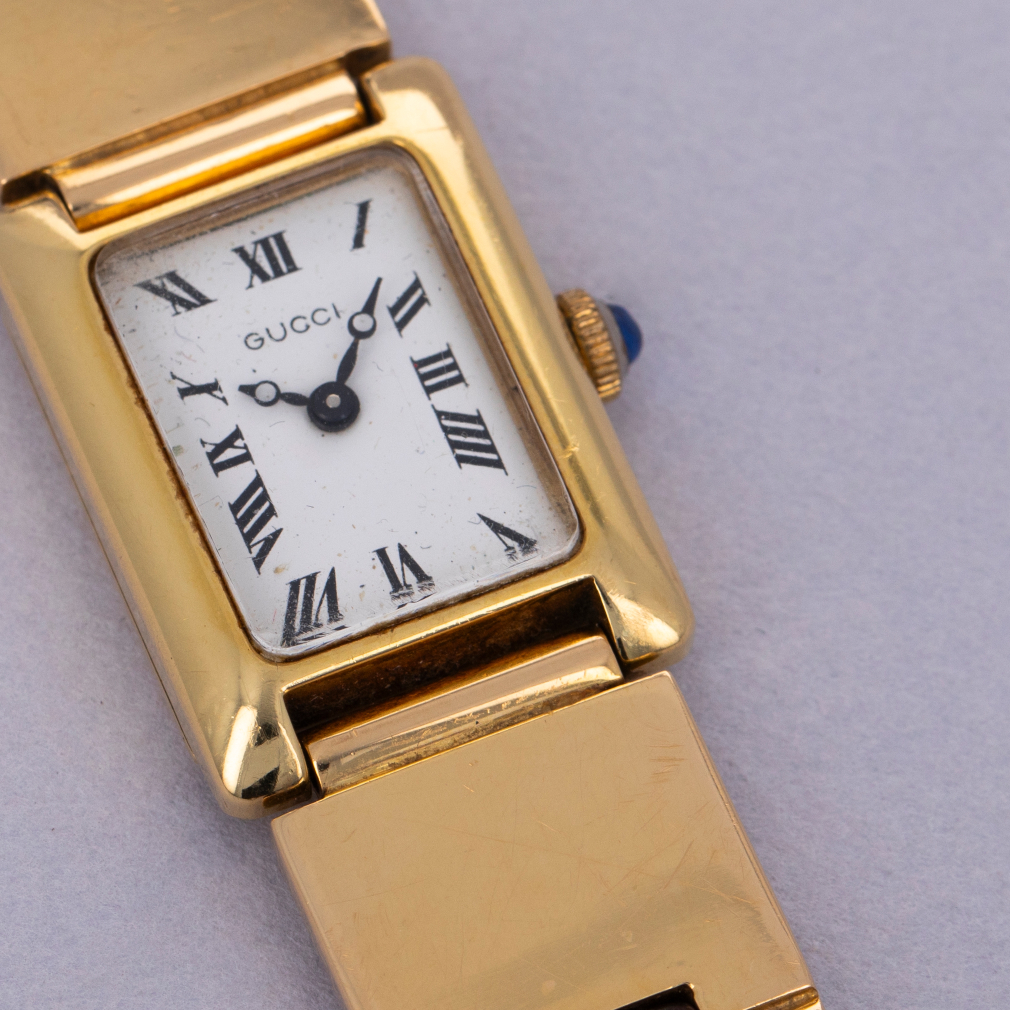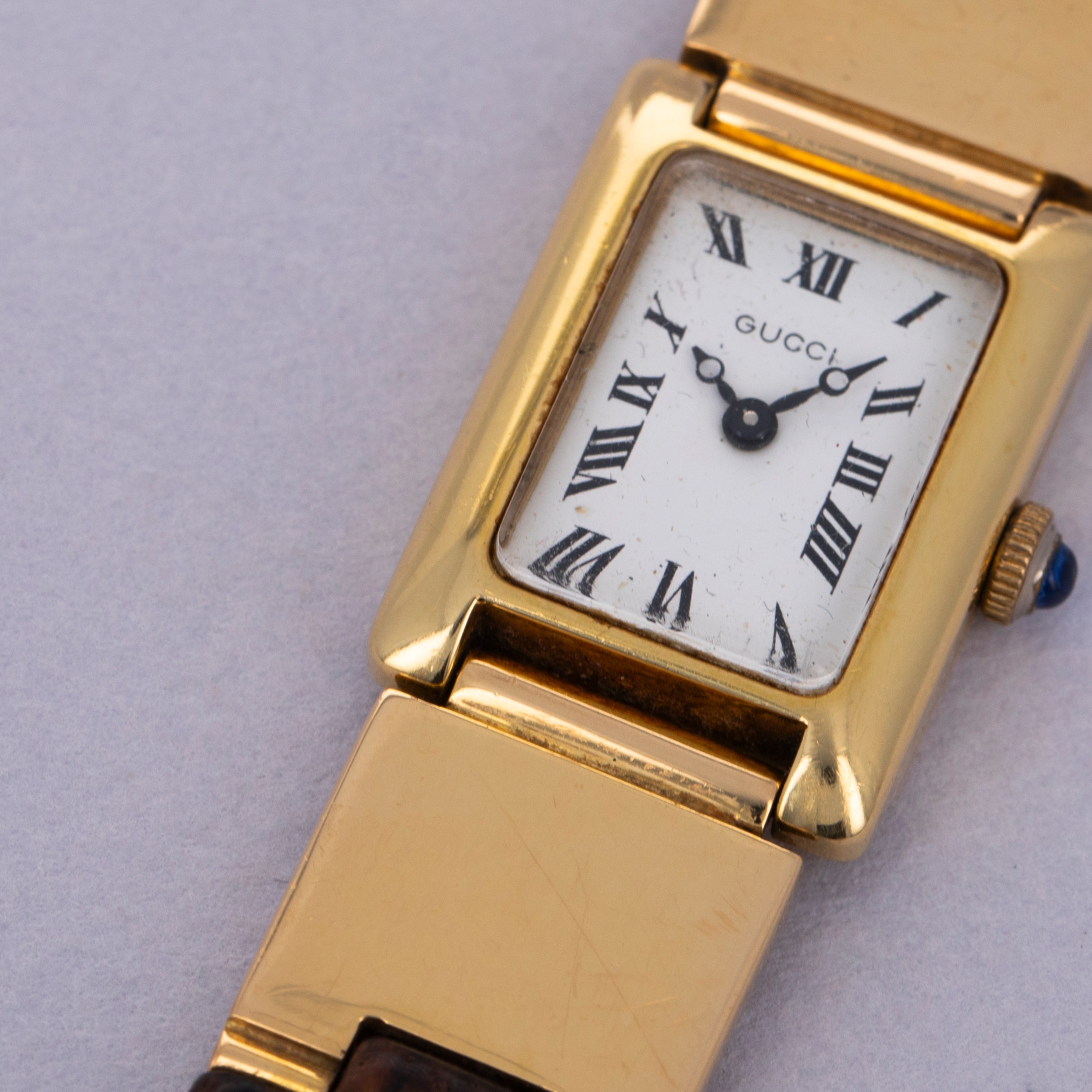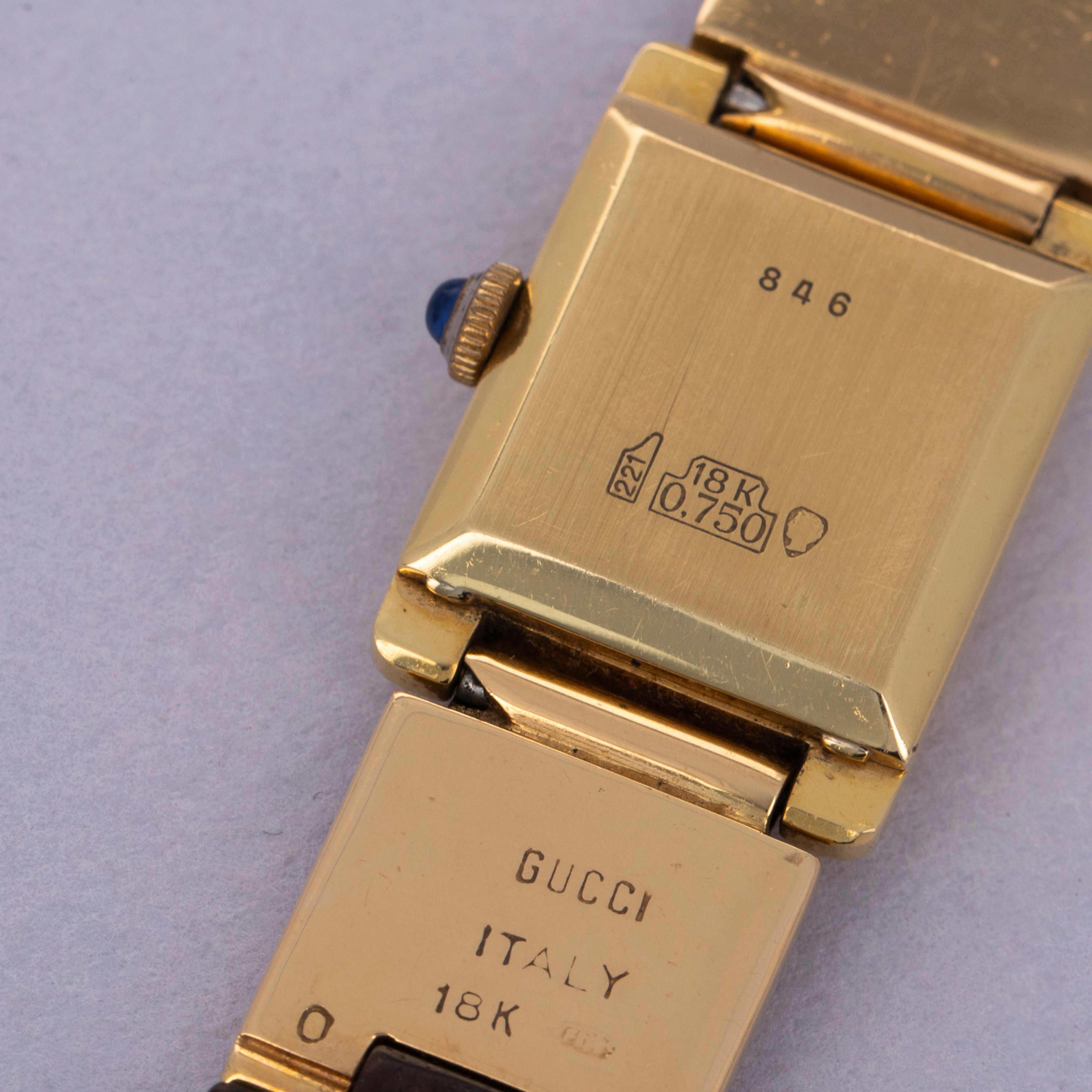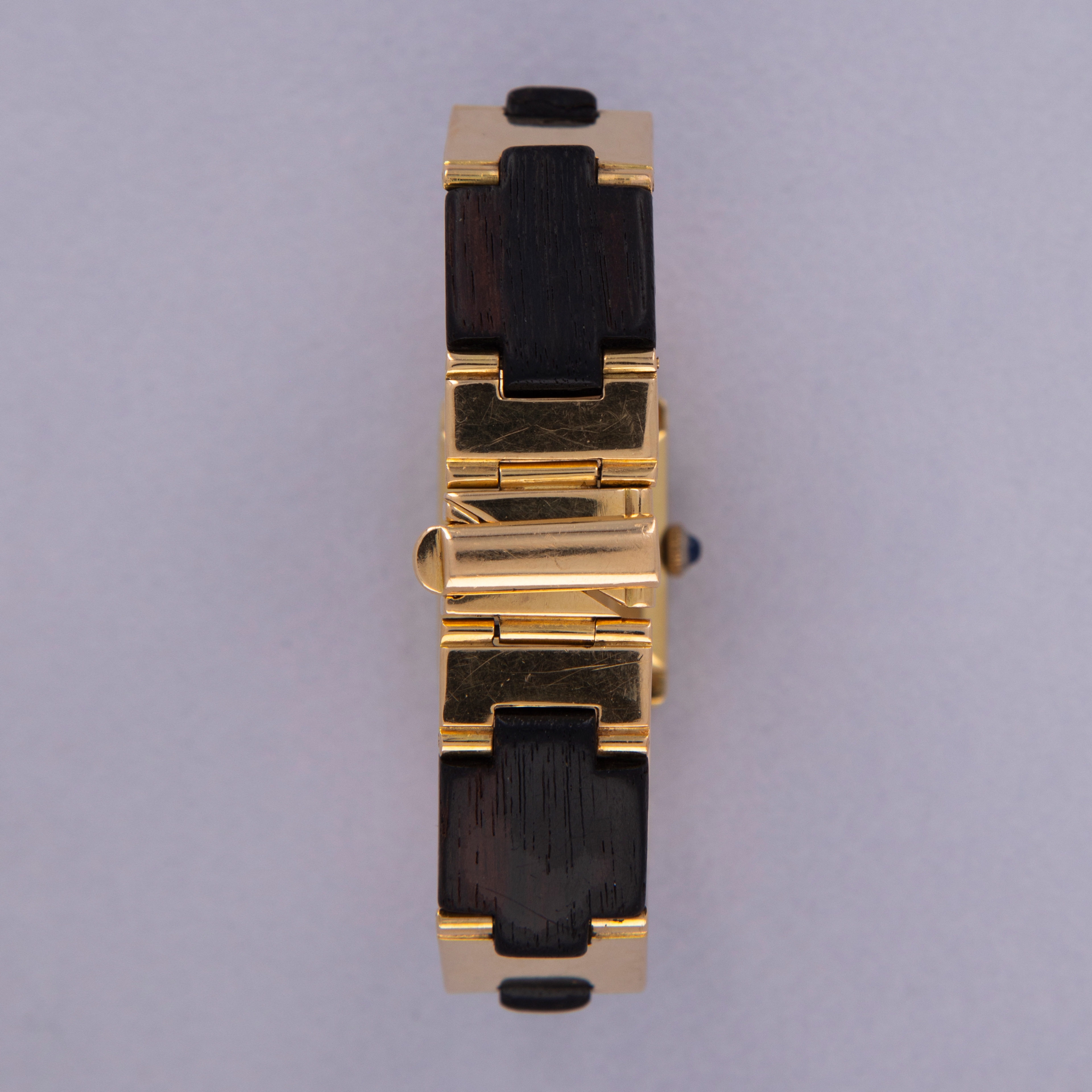 Boasting an 18kt yellow gold rectangular Tank-style case, this Gucci watch's departure from the rest of watchmaking's norms begins with its bracelet, which features a unique blend of 18kt gold and wooden links.
