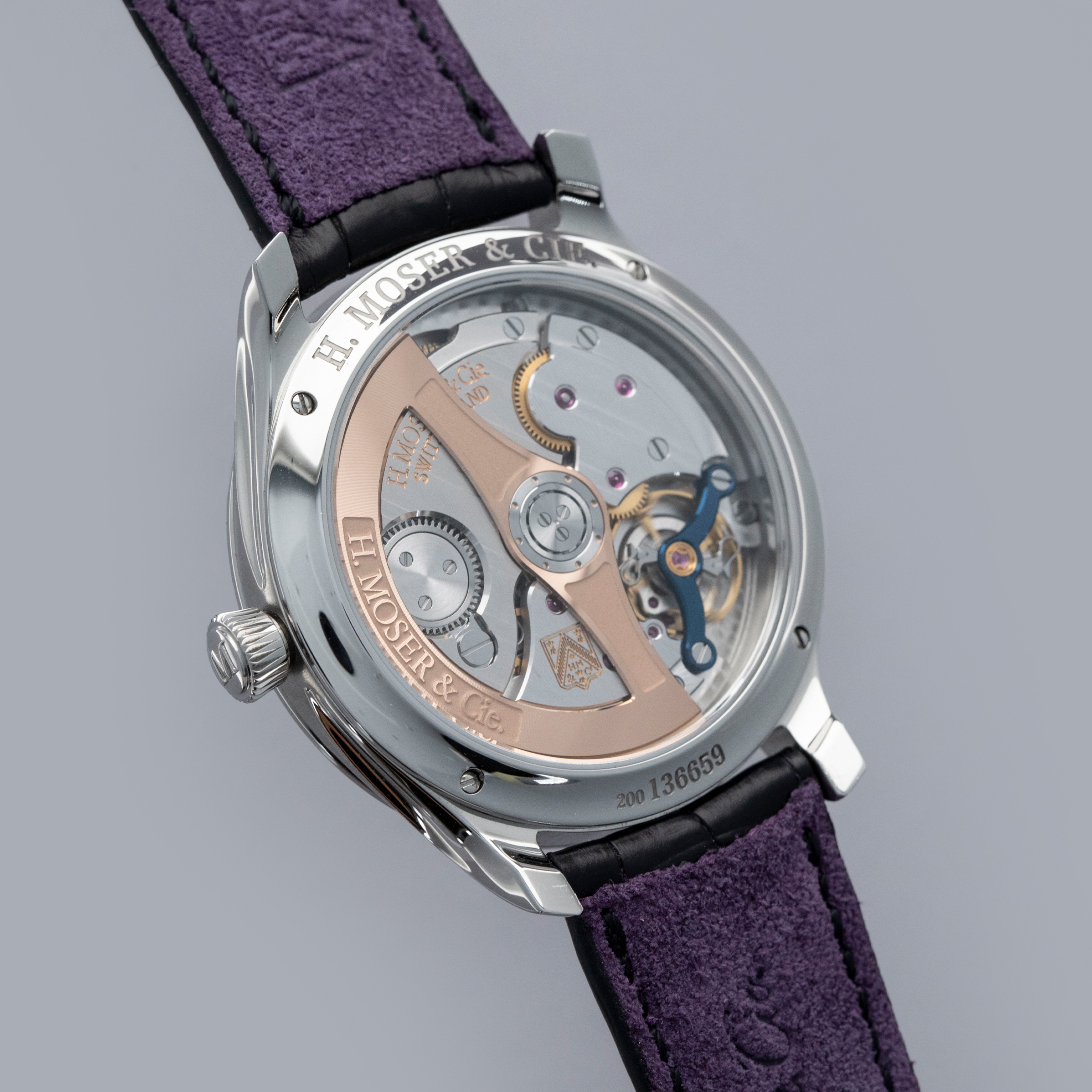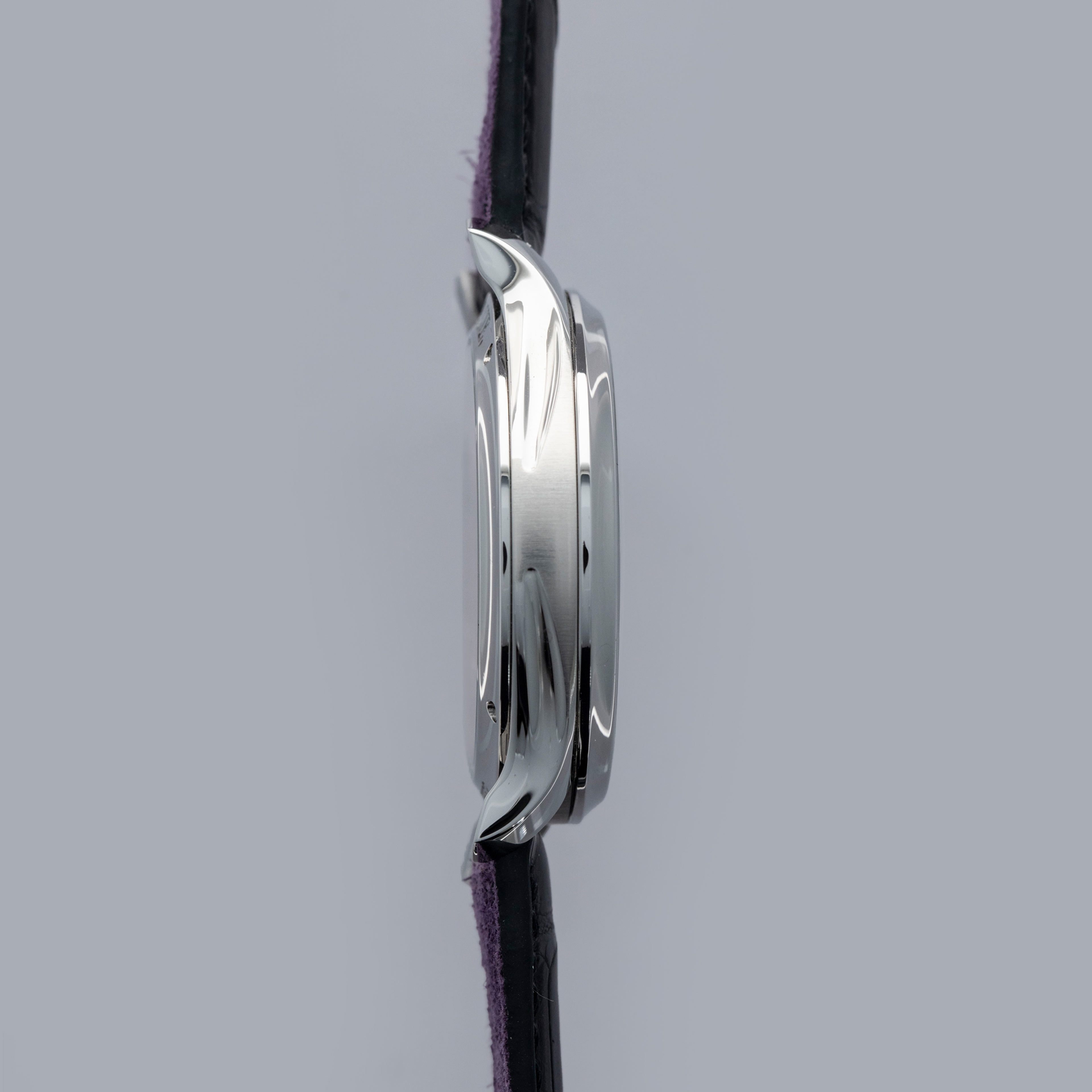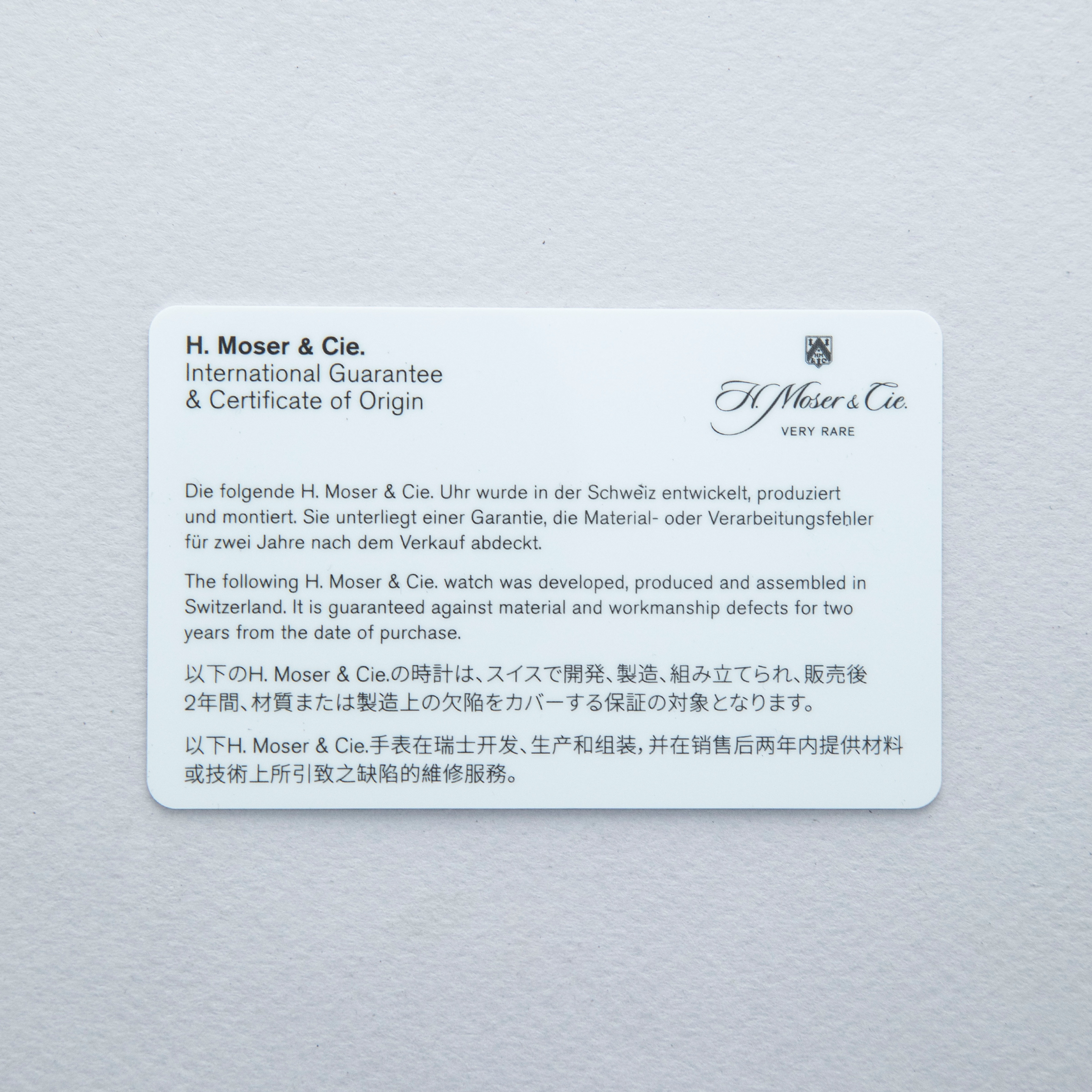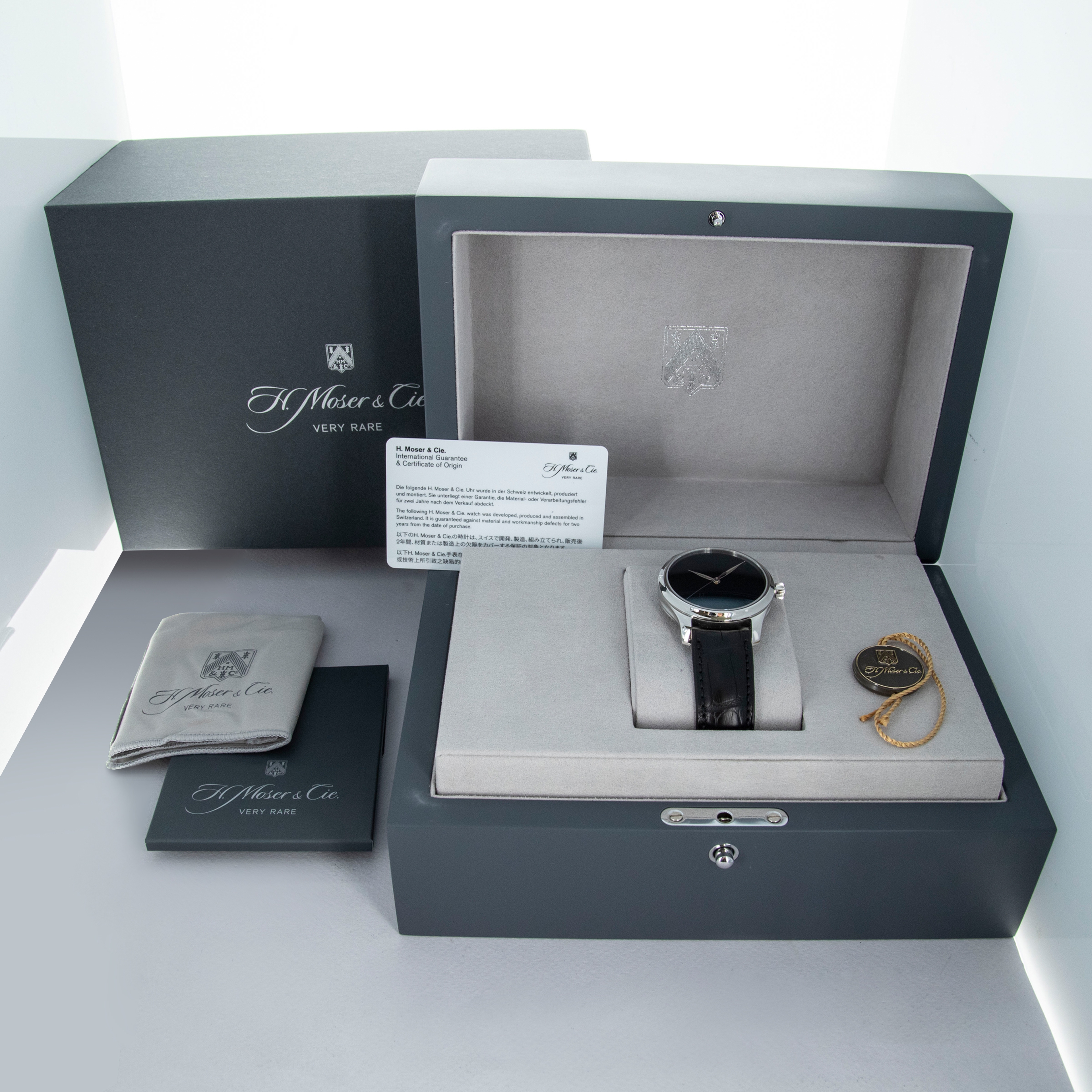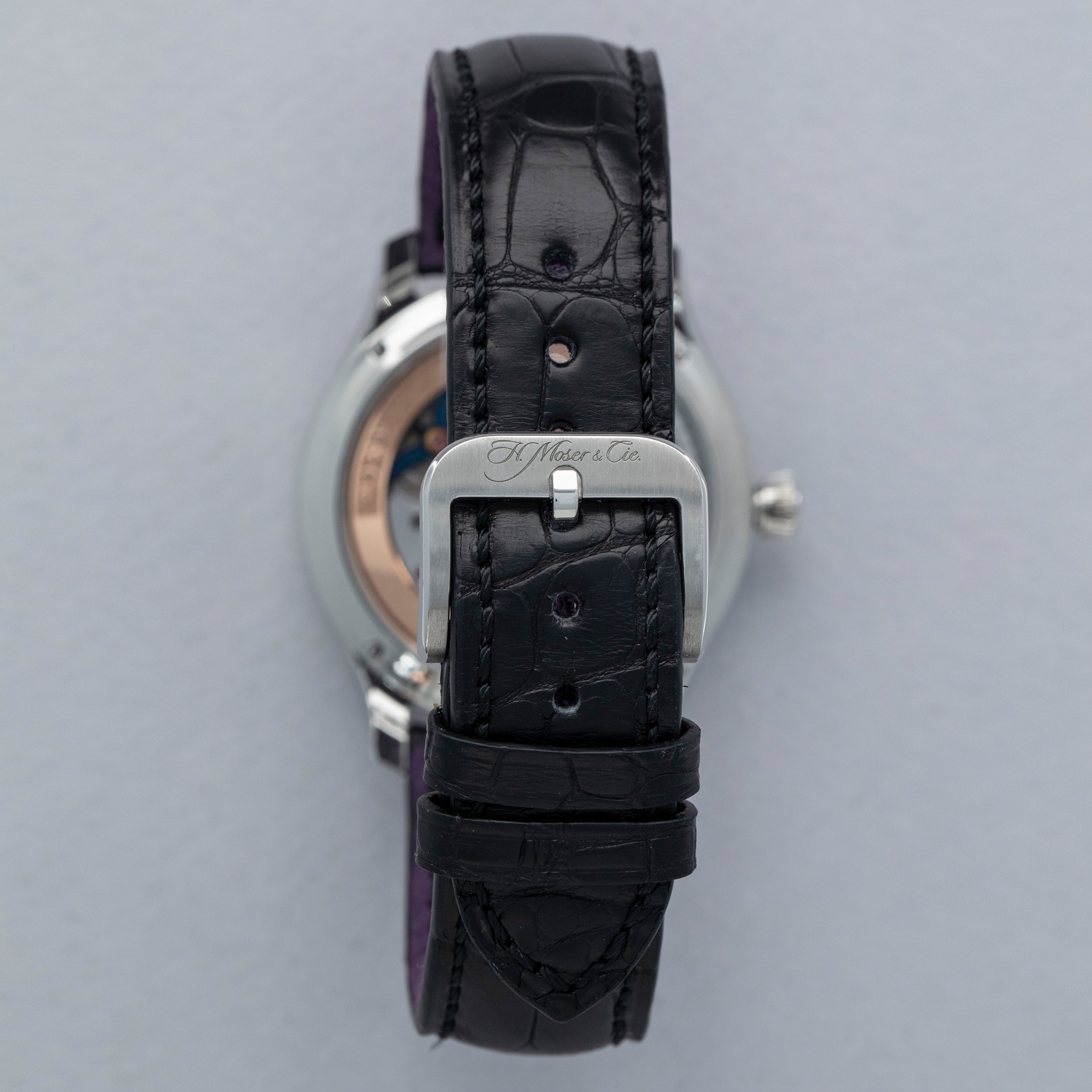 The watch is in overall near-mint condition. The steel case shows some signs of careful wear, with a few marks on the backs of the lugs from a strap change. The case back has crisp engravings around the edge. The dial and hands are like new. It is fitted with a black Moser alligator strap with a steel buckle showing light marks. The watch comes complete with boxes, warranty card, cloth, booklet, and hangtag.