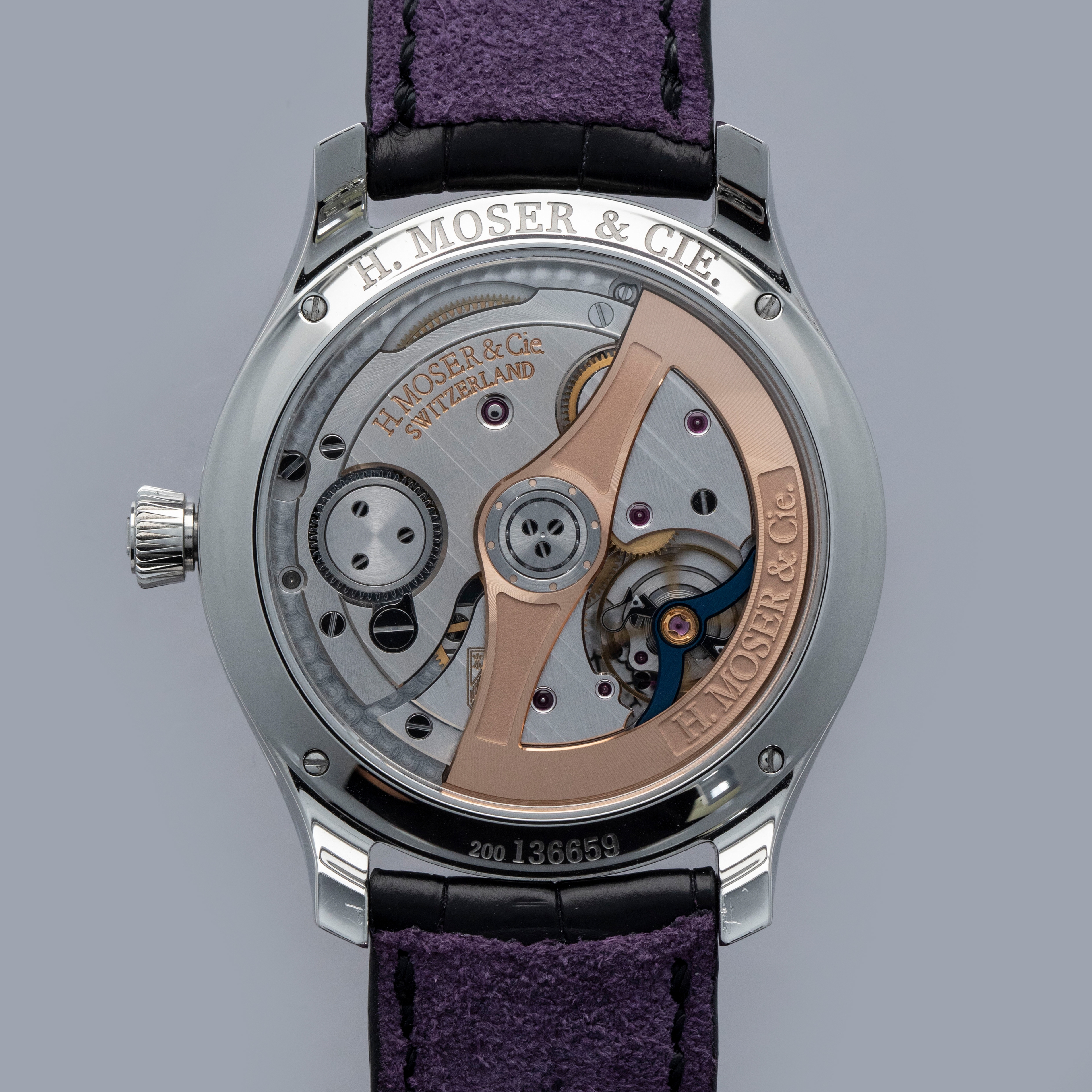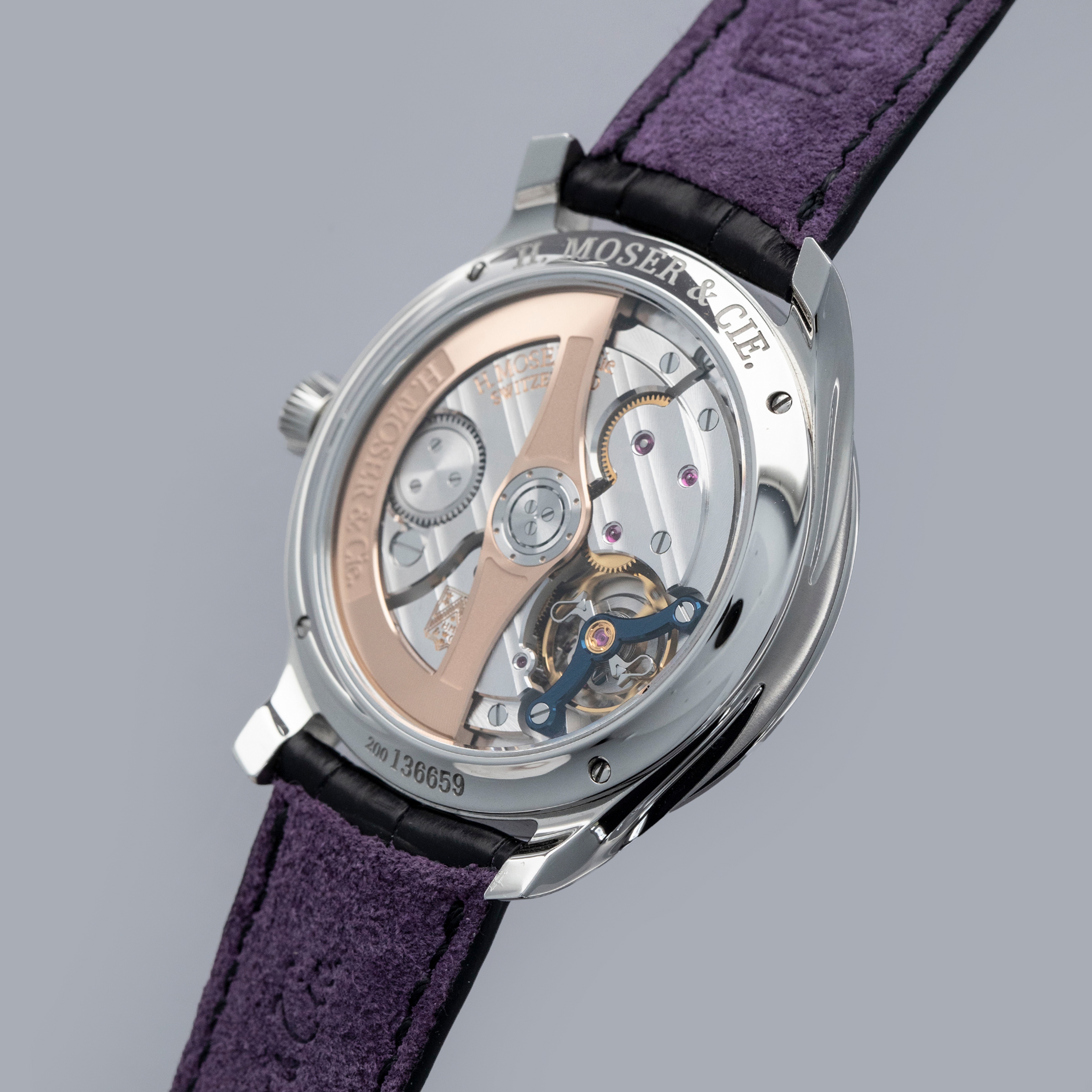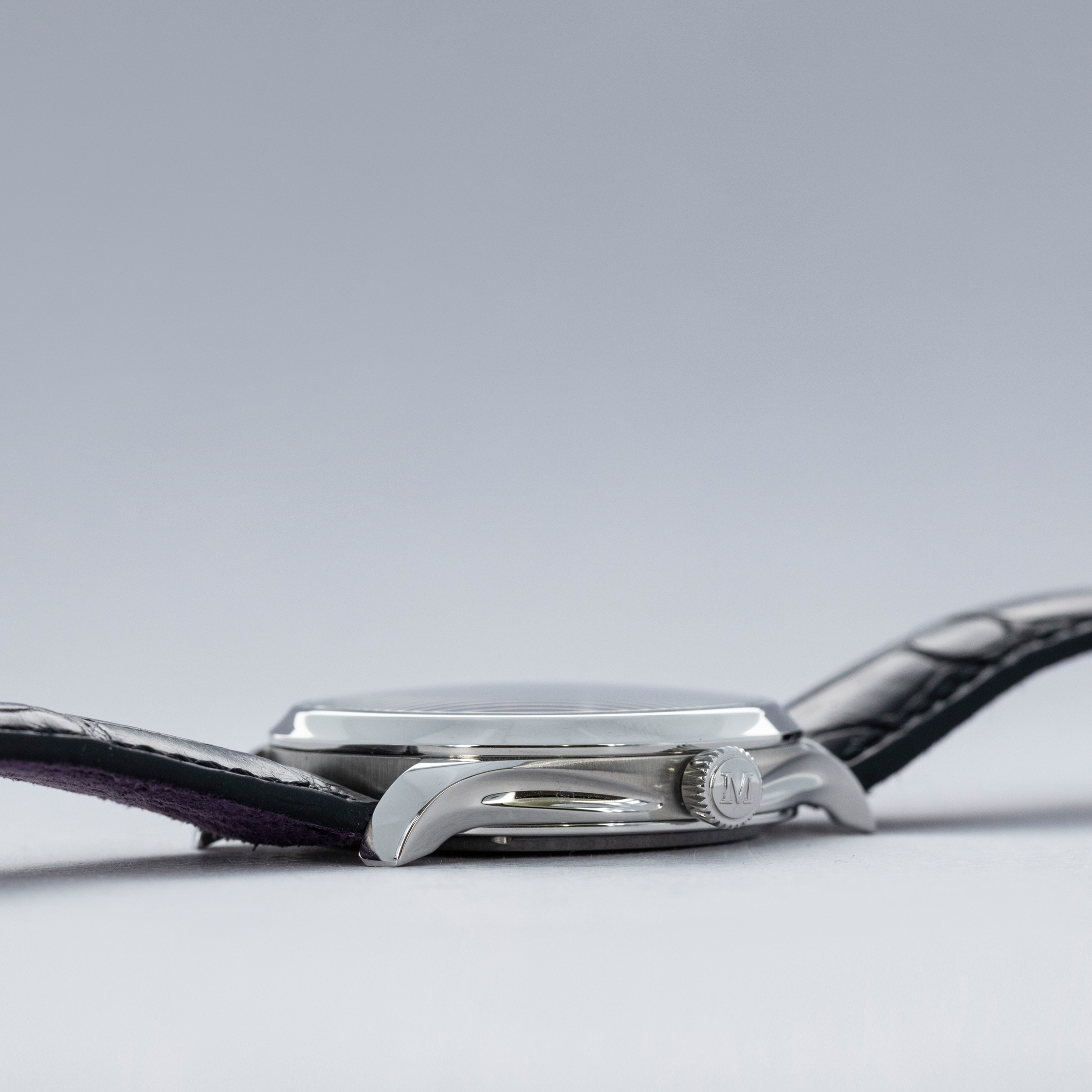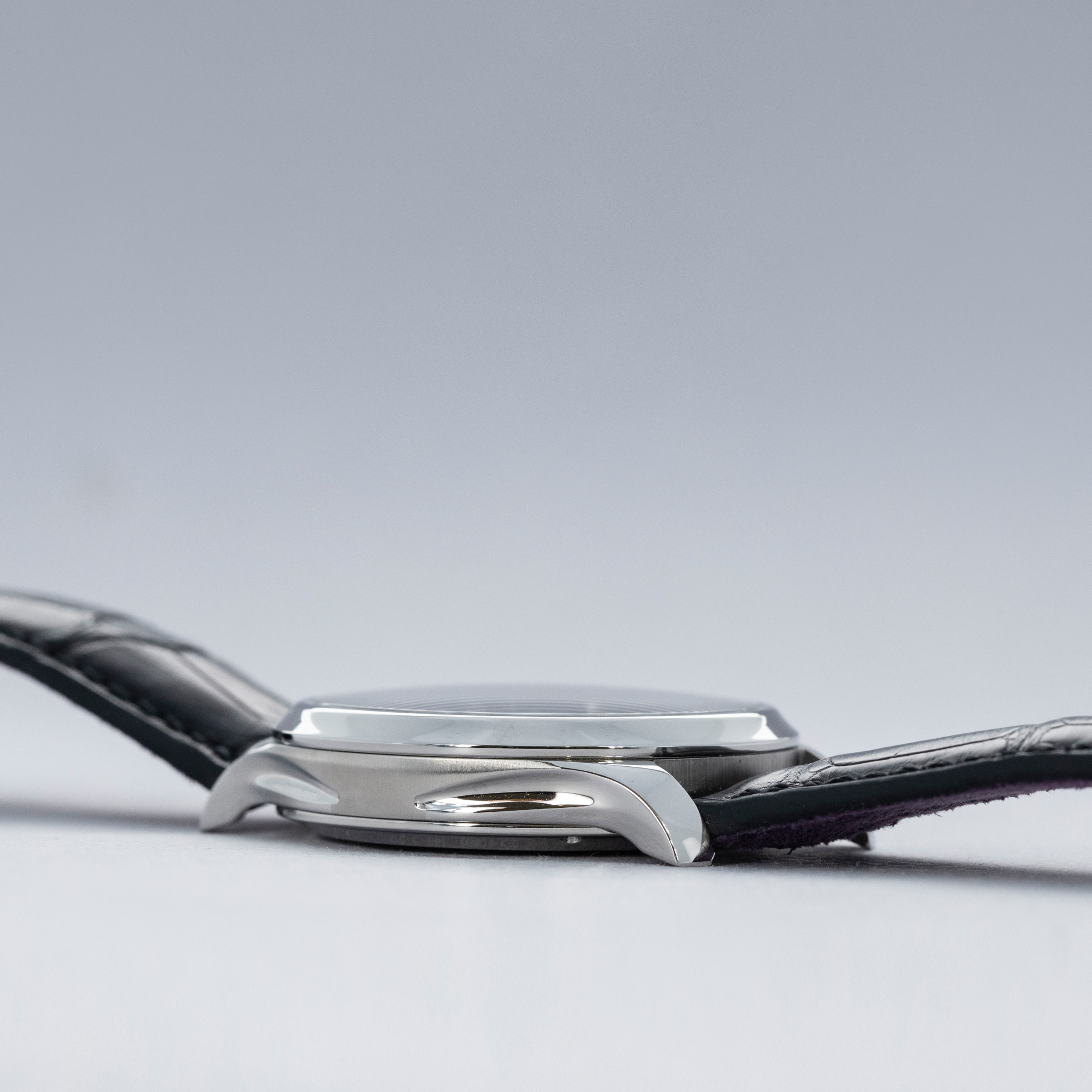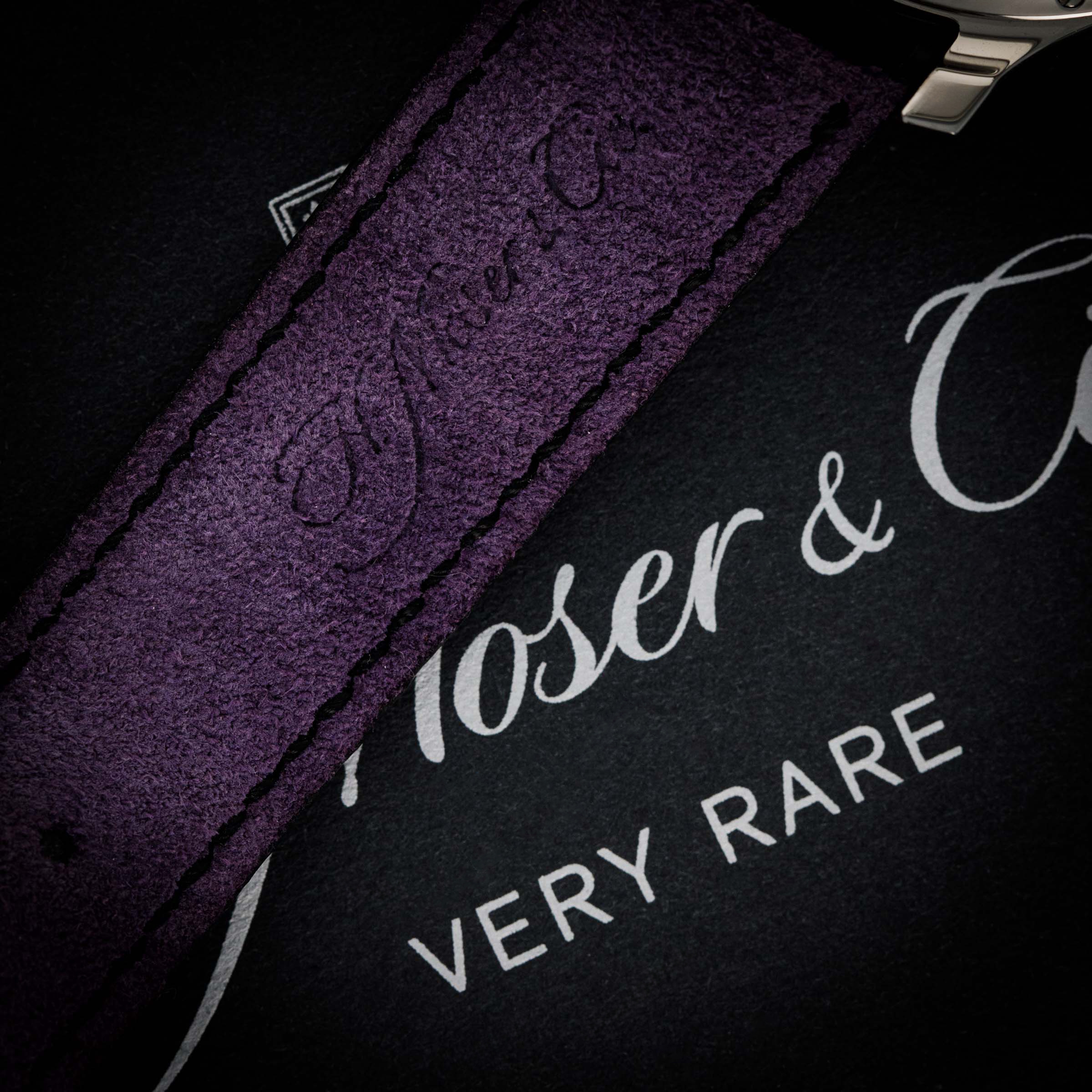 The watch is in overall near-mint condition. The steel case shows some signs of careful wear, with a few marks on the backs of the lugs from a strap change. The case back has crisp engravings around the edge. The dial and hands are like new. It is fitted with a black Moser alligator strap with a steel buckle showing light marks. The watch comes complete with boxes, warranty card, cloth, booklet, and hangtag.