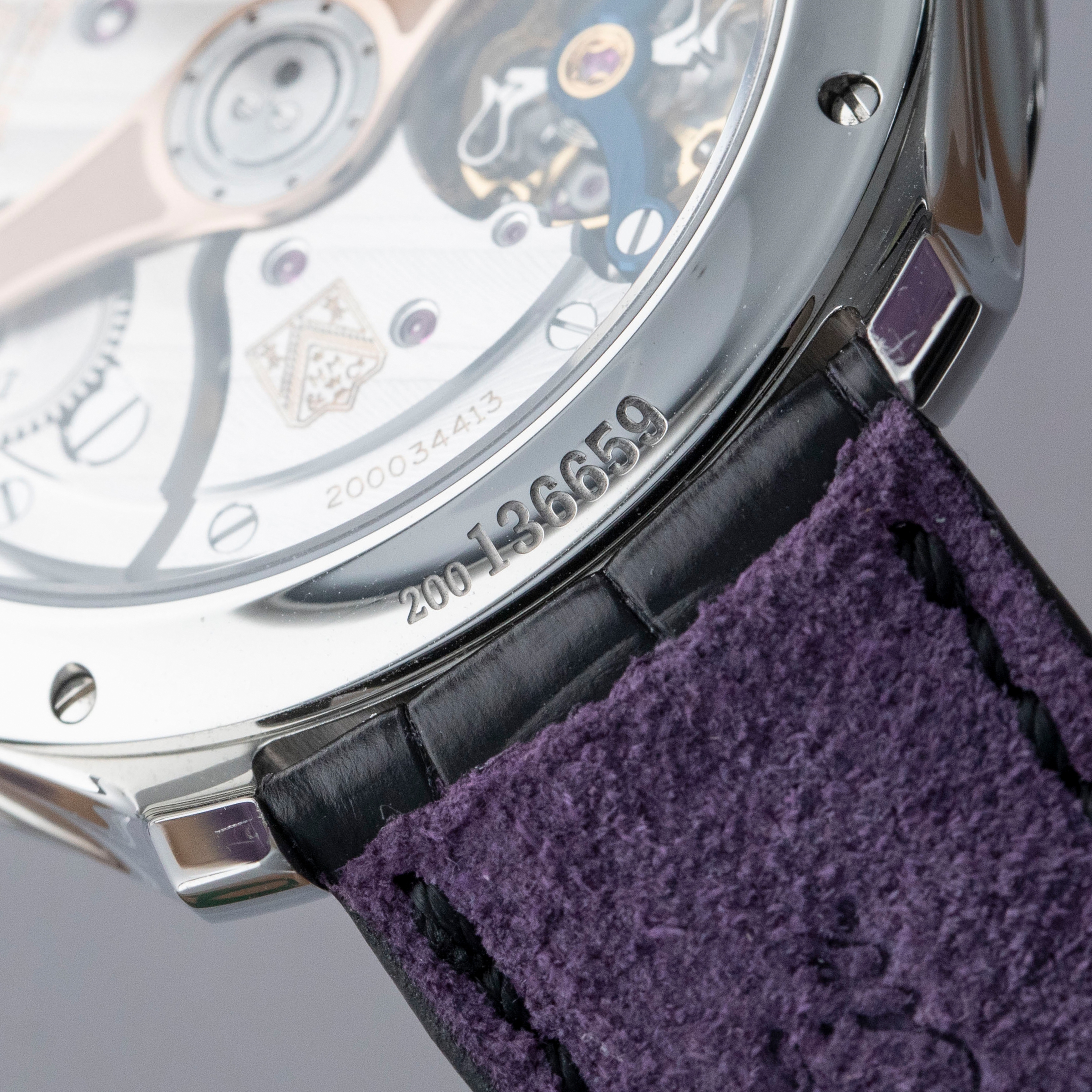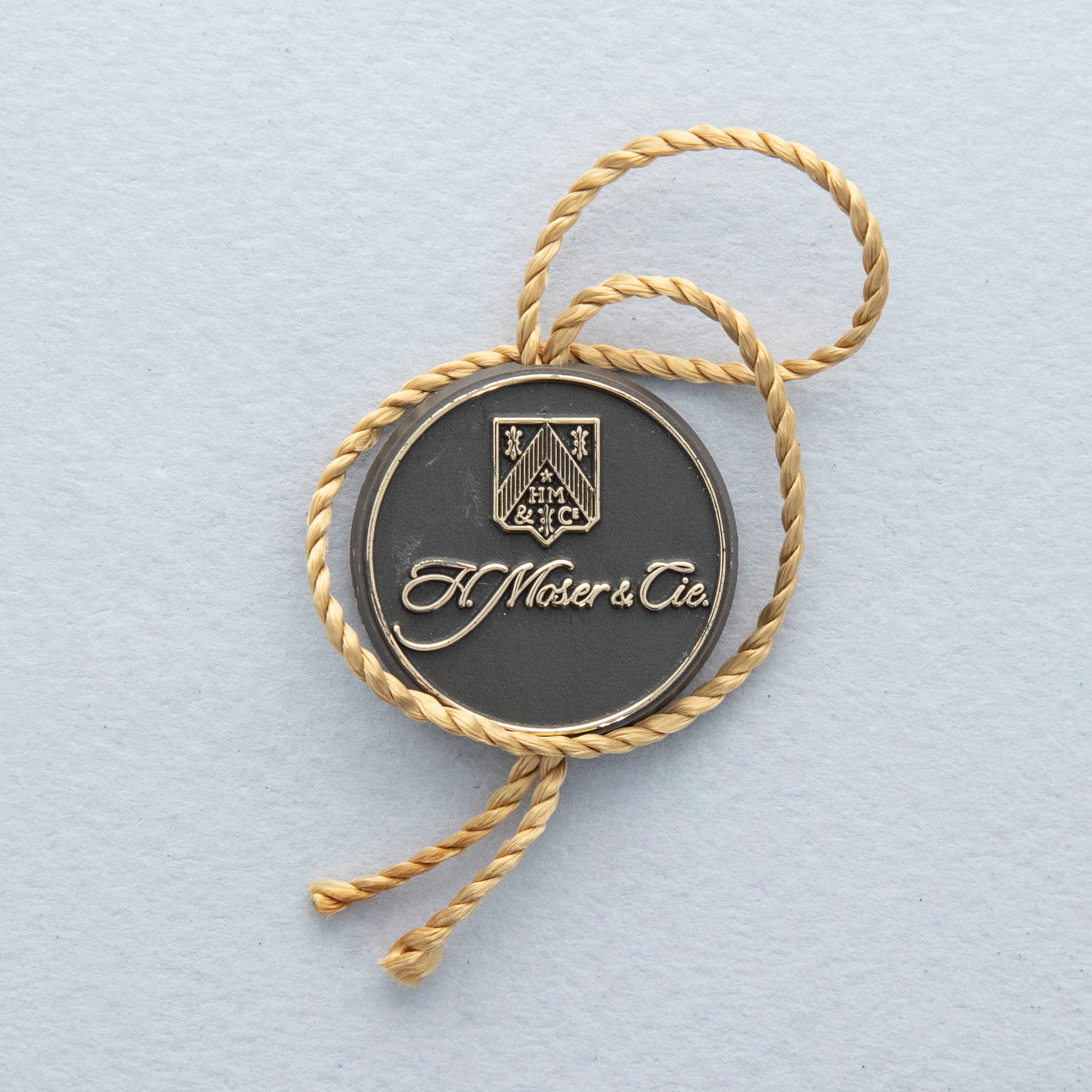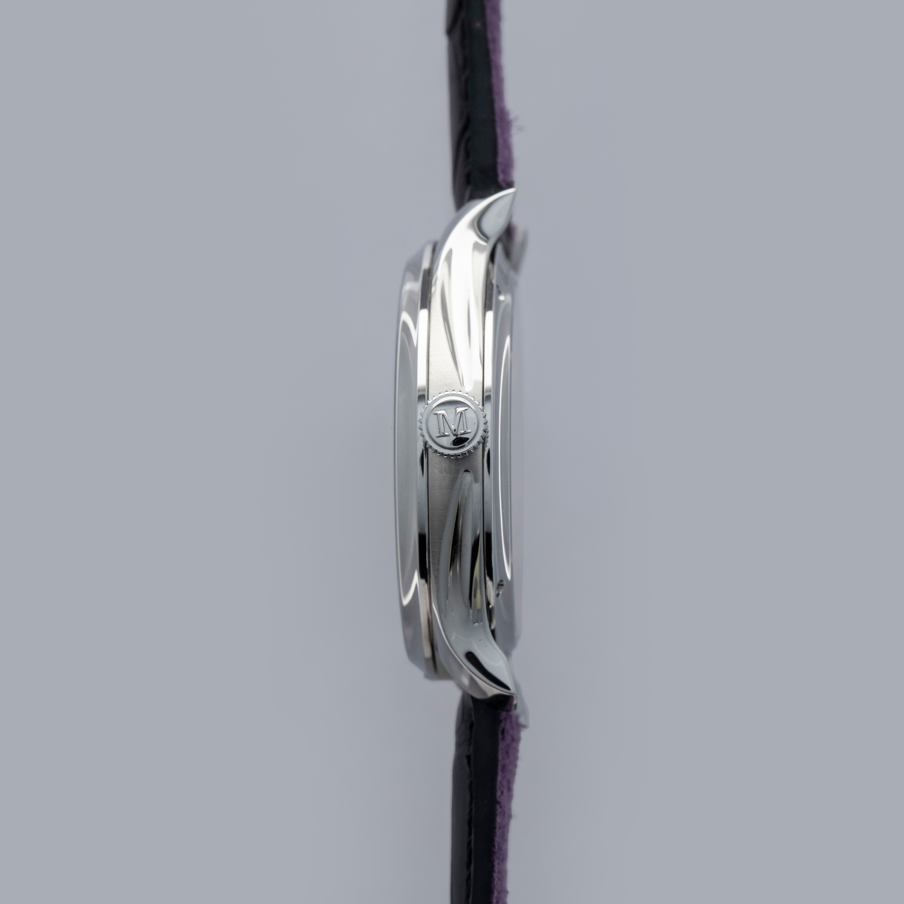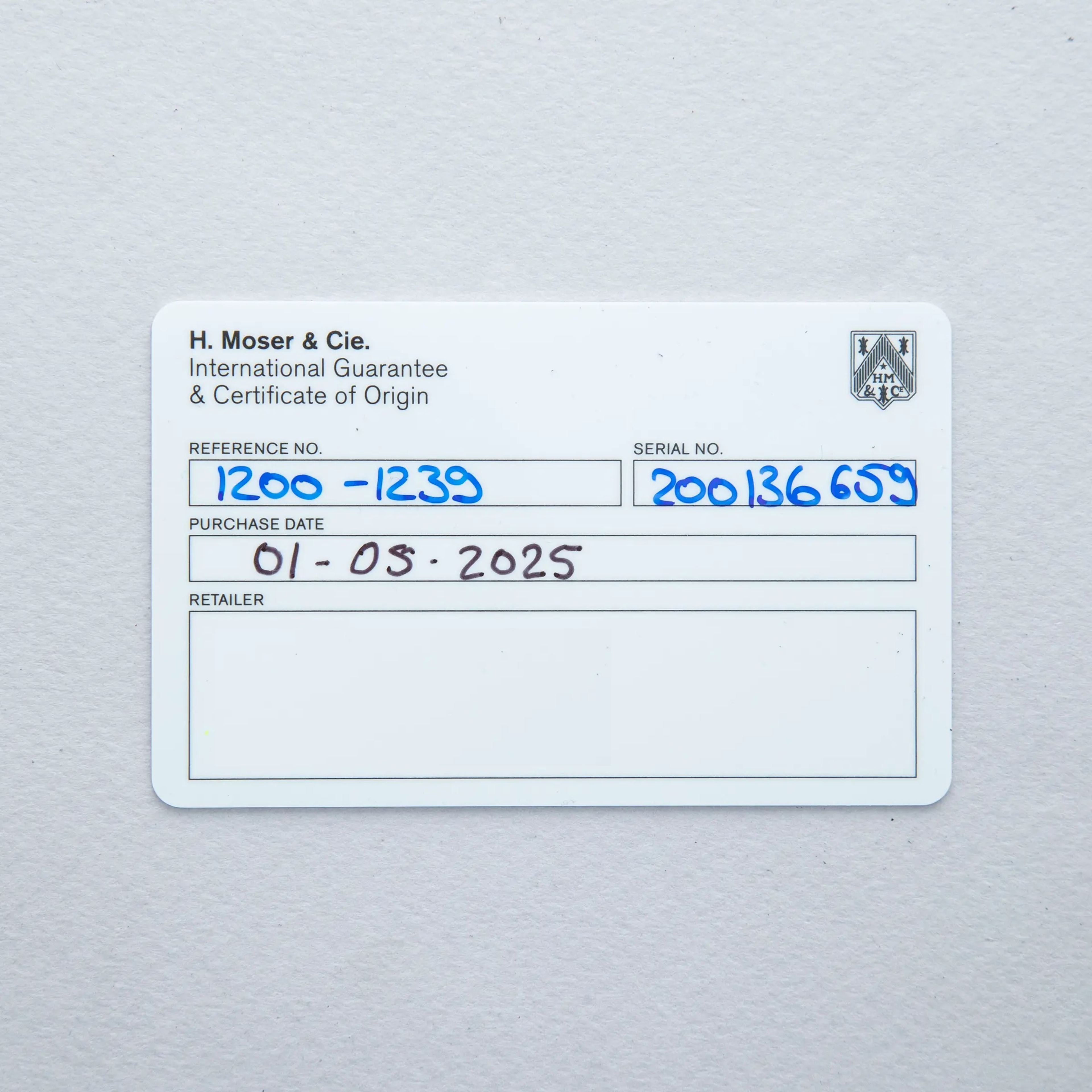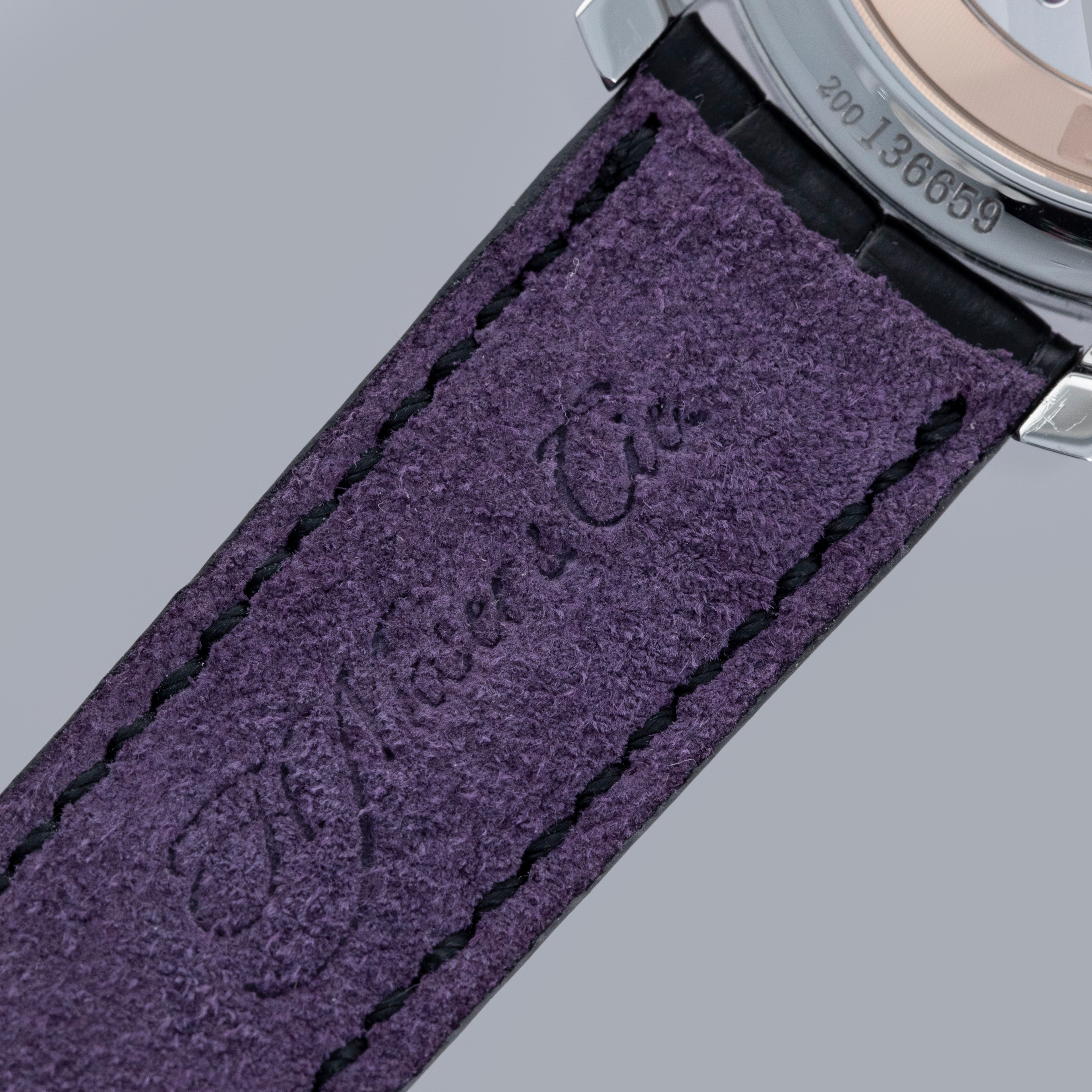 The watch is in overall near-mint condition. The steel case shows some signs of careful wear, with a few marks on the backs of the lugs from a strap change. The case back has crisp engravings around the edge. The dial and hands are like new. It is fitted with a black Moser alligator strap with a steel buckle showing light marks. The watch comes complete with boxes, warranty card, cloth, booklet, and hangtag.