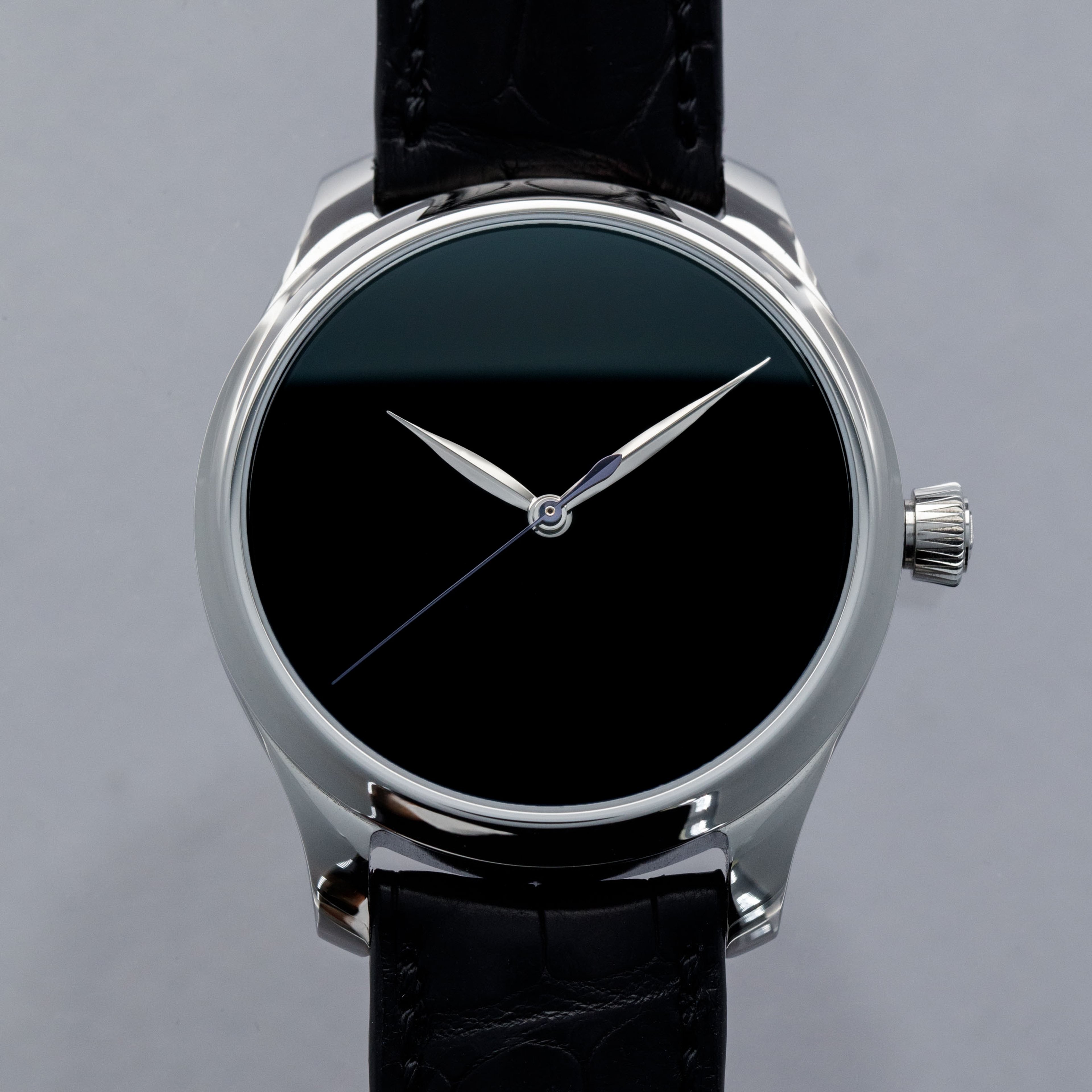 Painted with Vantblack, a pigment coating developed in 2014 by the British company Surrey Nanosystems that absorbs 99.965% of the light that hits it, this example's display is exceptionally unique, yet still within Moser's aesthetic, with its lack of branding or indices.