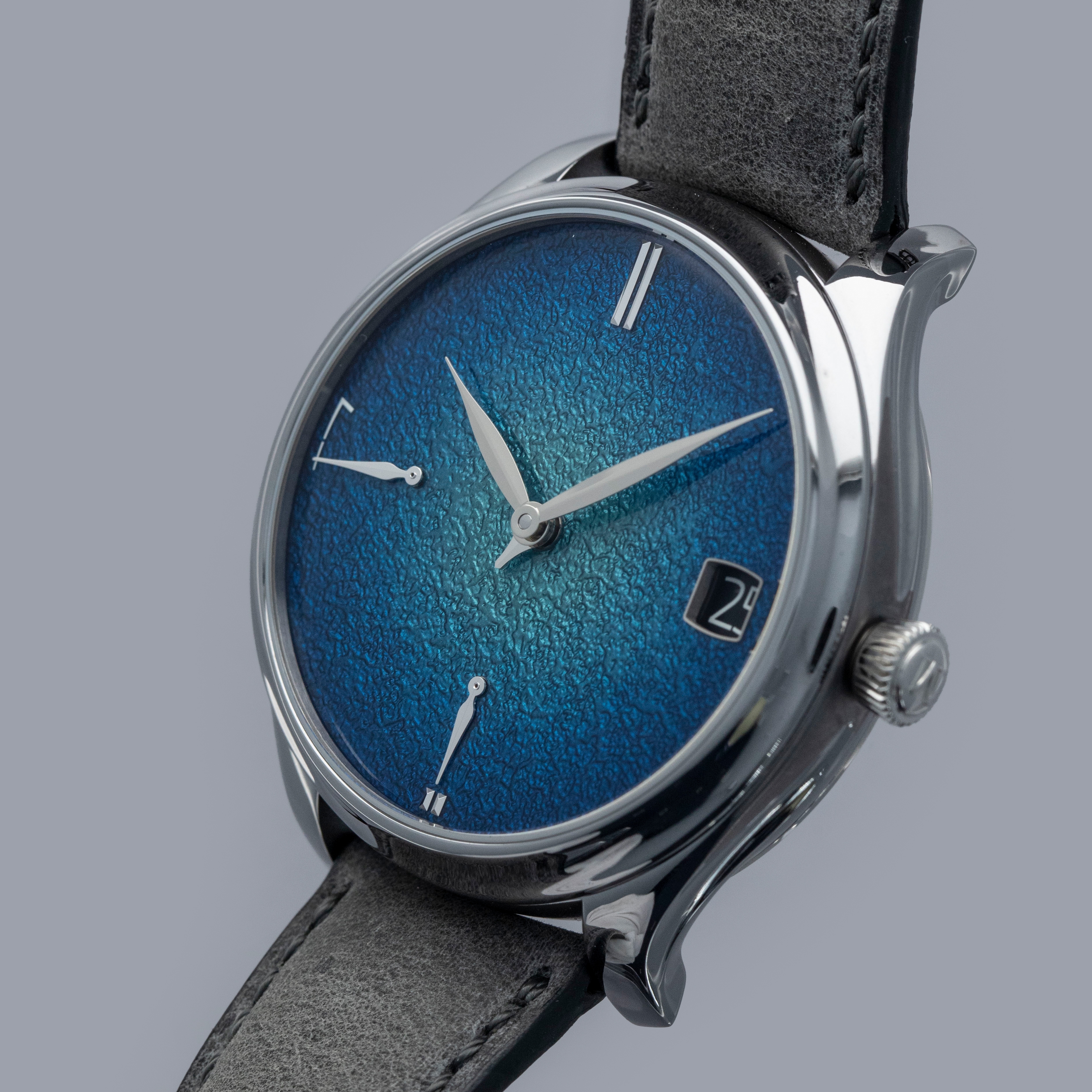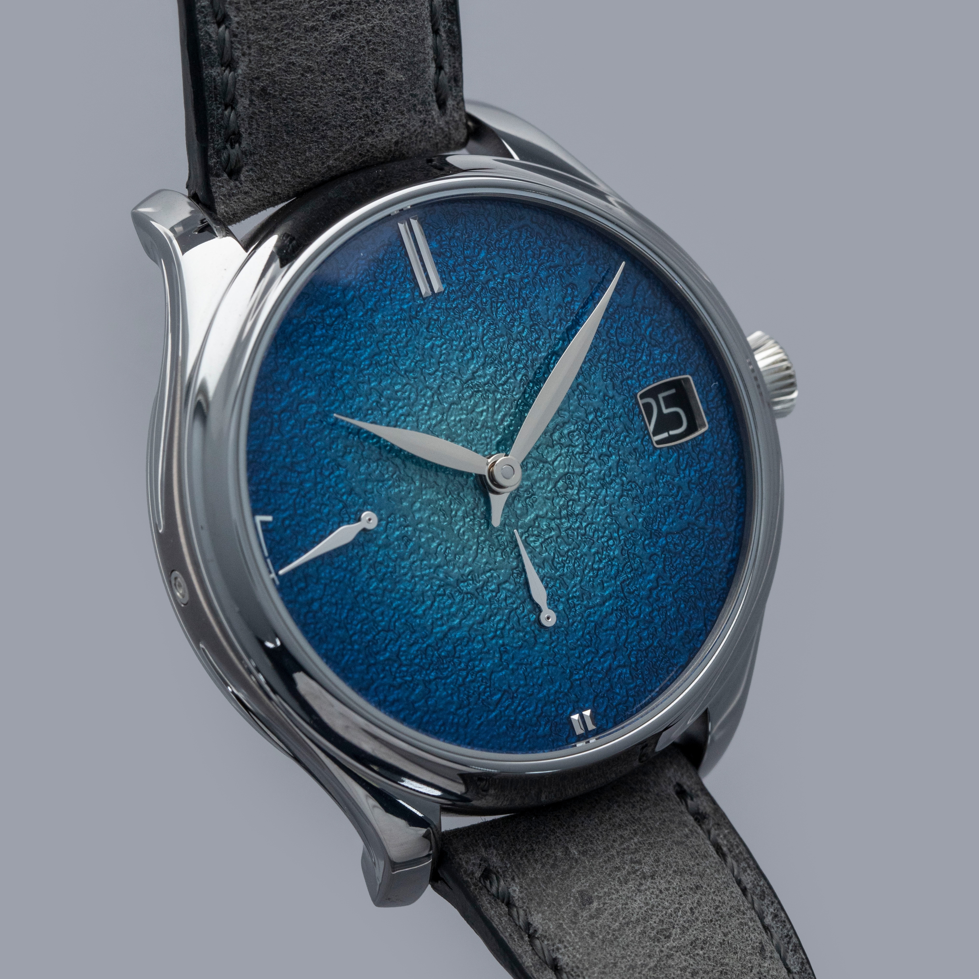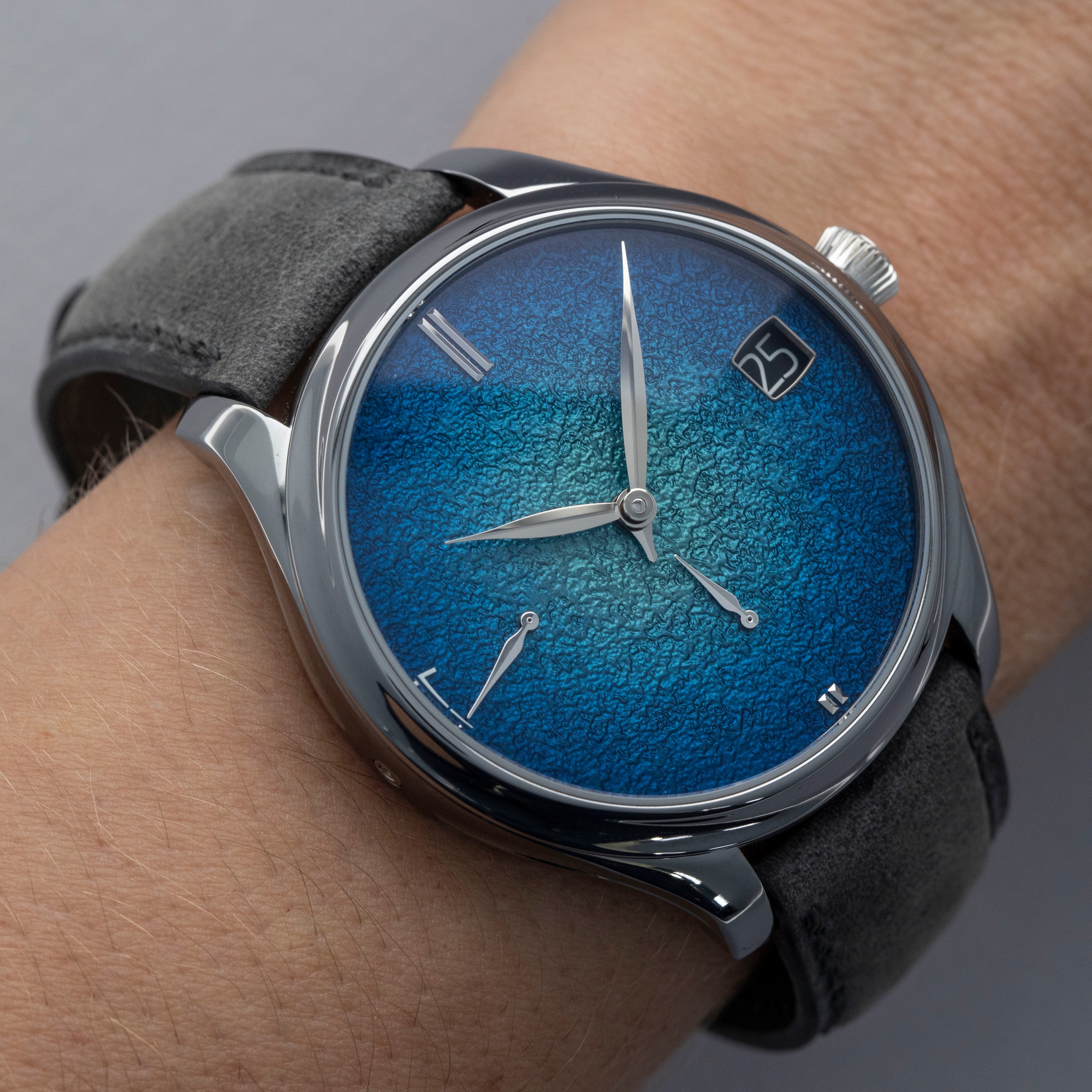 Classically Moser in its unfiltered simplicity, the Endeavour Perpetual Calendar's Abyss Blue's grand feu enamel dial features Moser's signature fumé effect whereby its center features a lighter shade of blue that gets darker as it approaches the peripheries, which if further accented by its subtle grained texture.