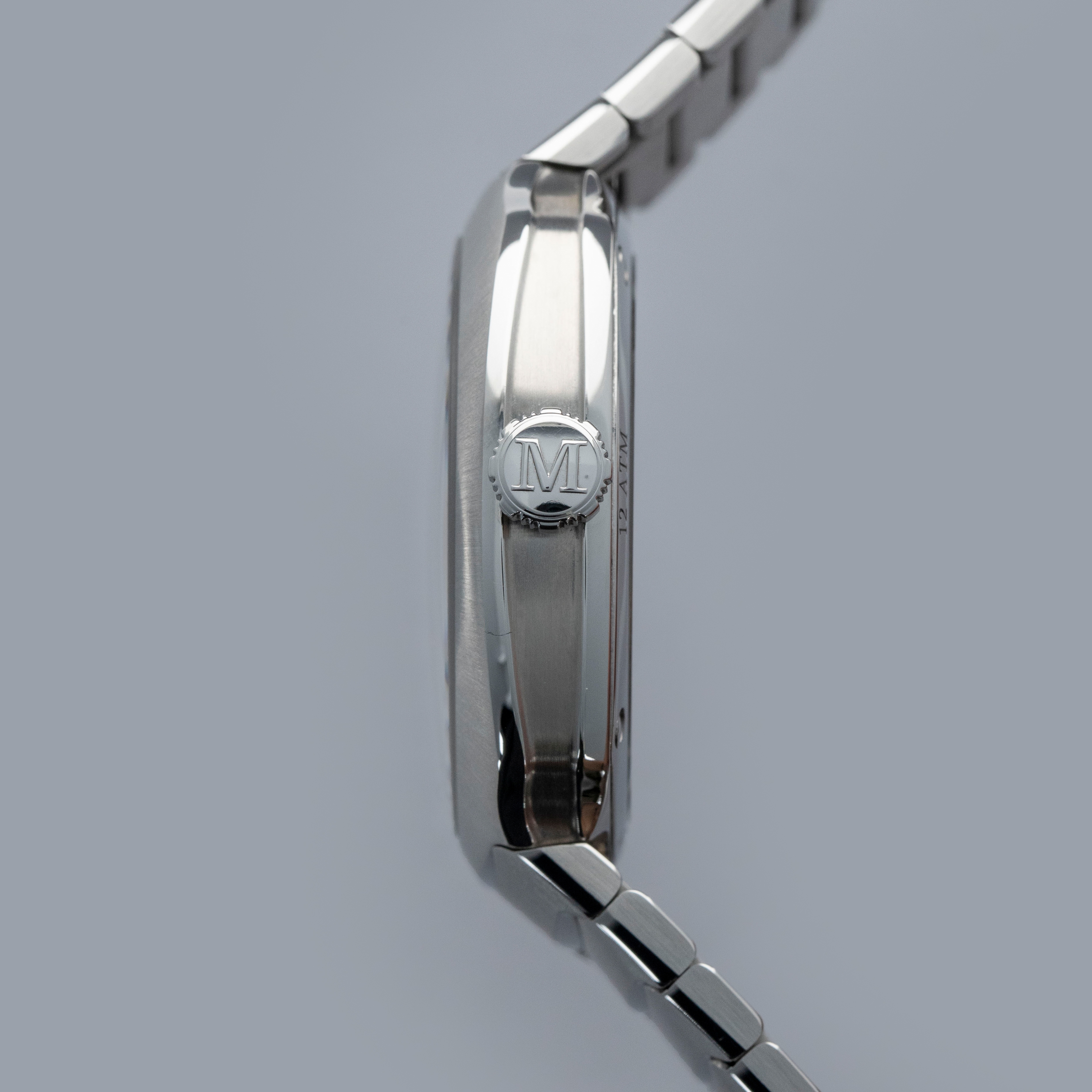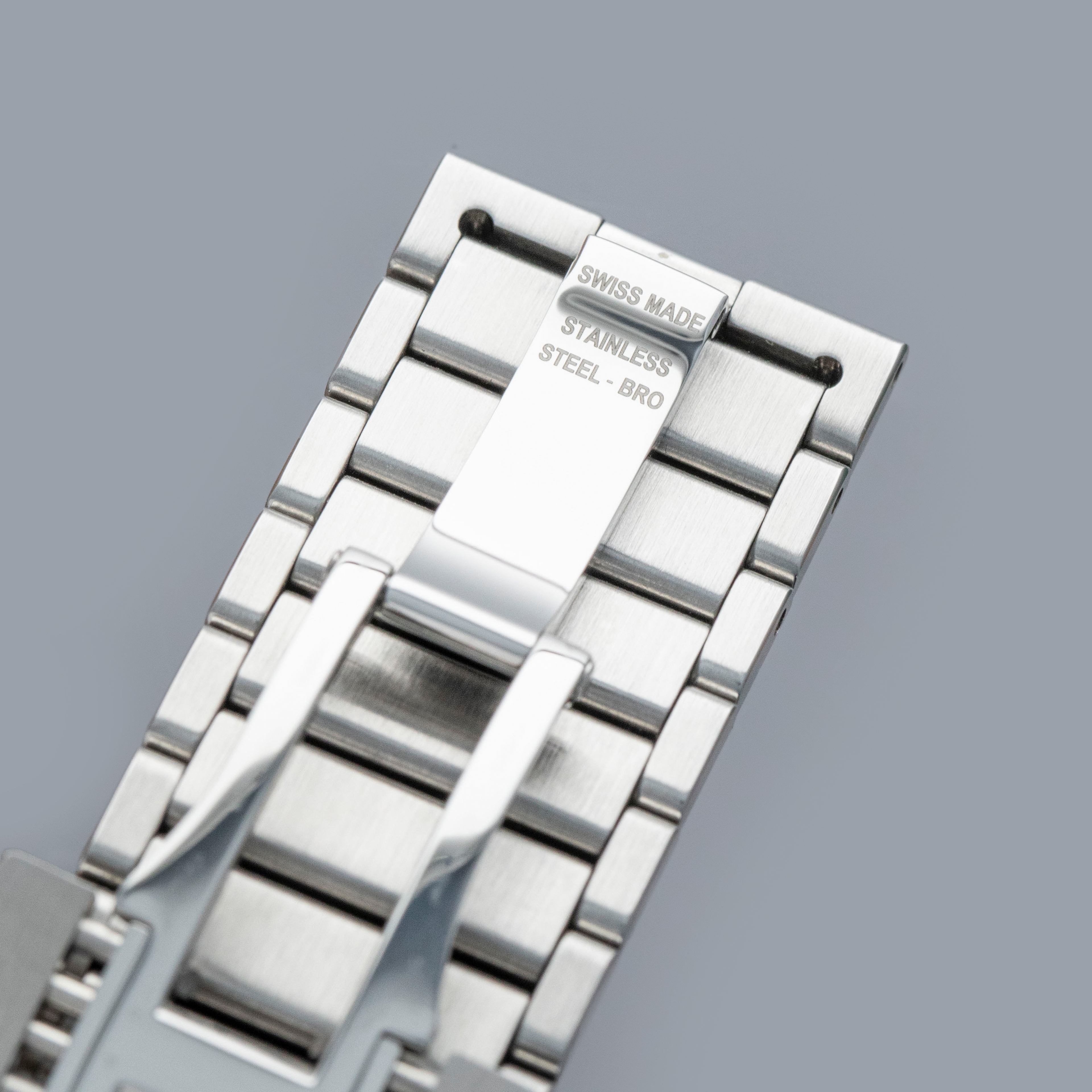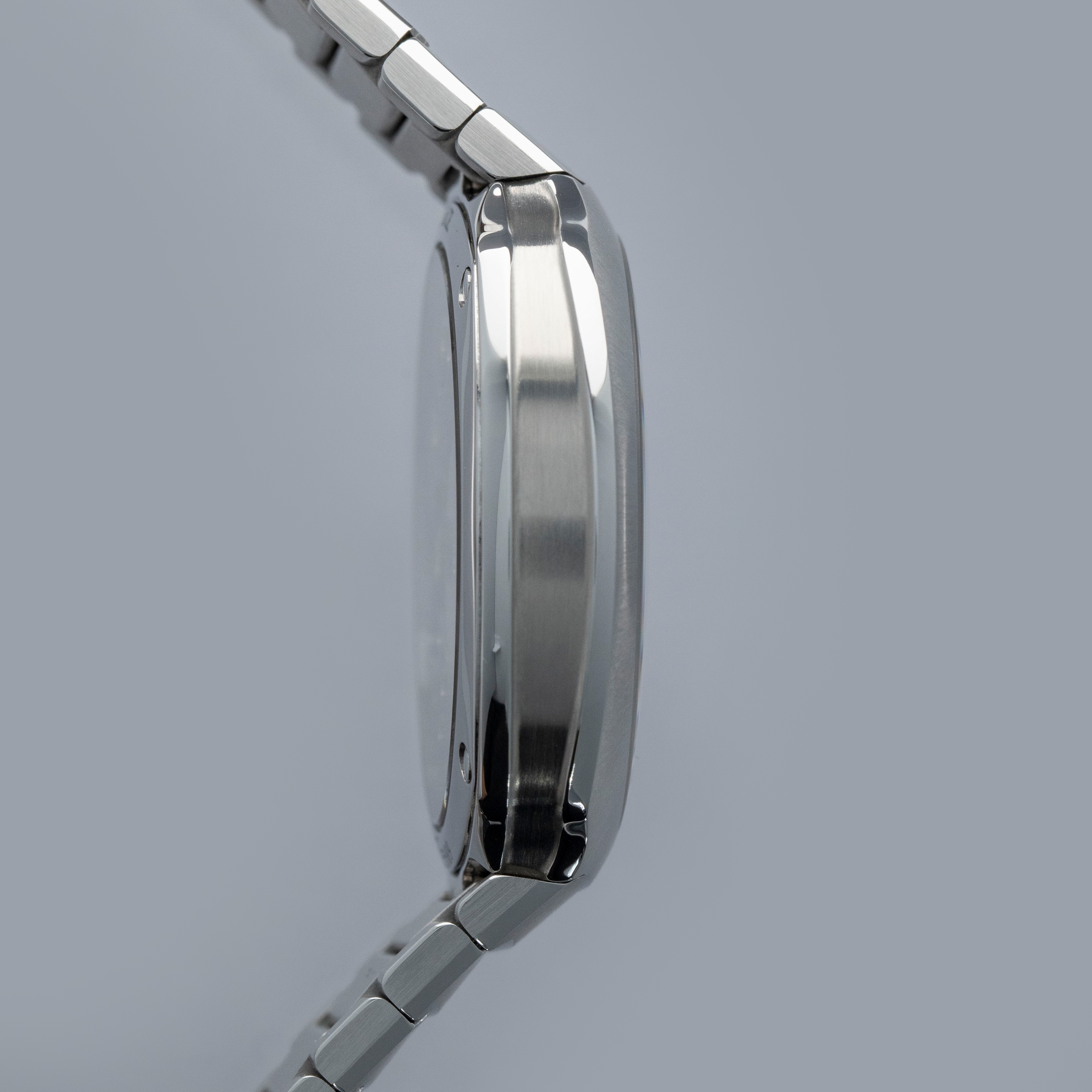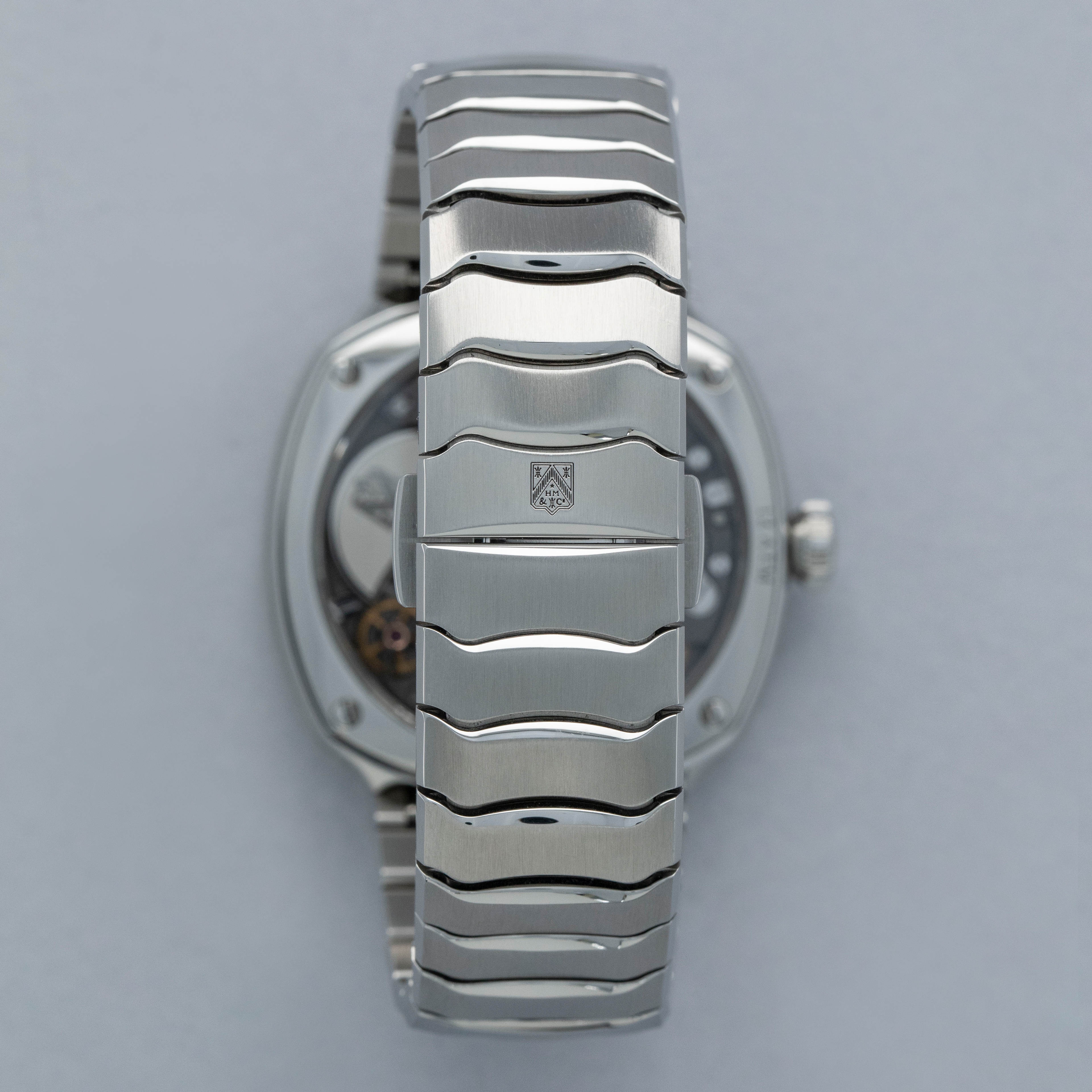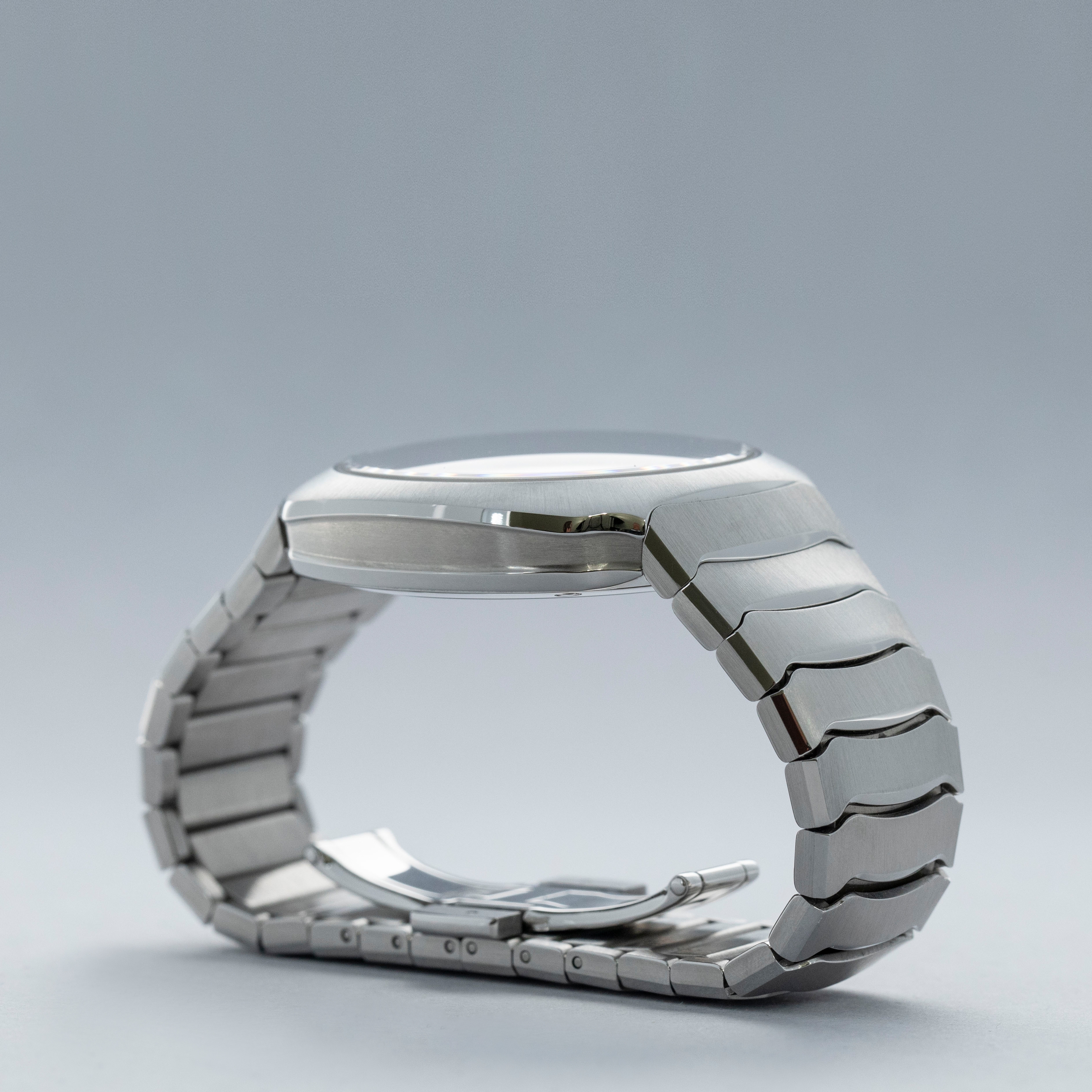 Fitted with a rare single-link bracelet design and a squared-off round case, the Streamliner wears on the wrist with a unique presence. Indeed, its 39mm stainless steel construction brings a sense of familiarity, but its profile is certainly not like anything else on the market.