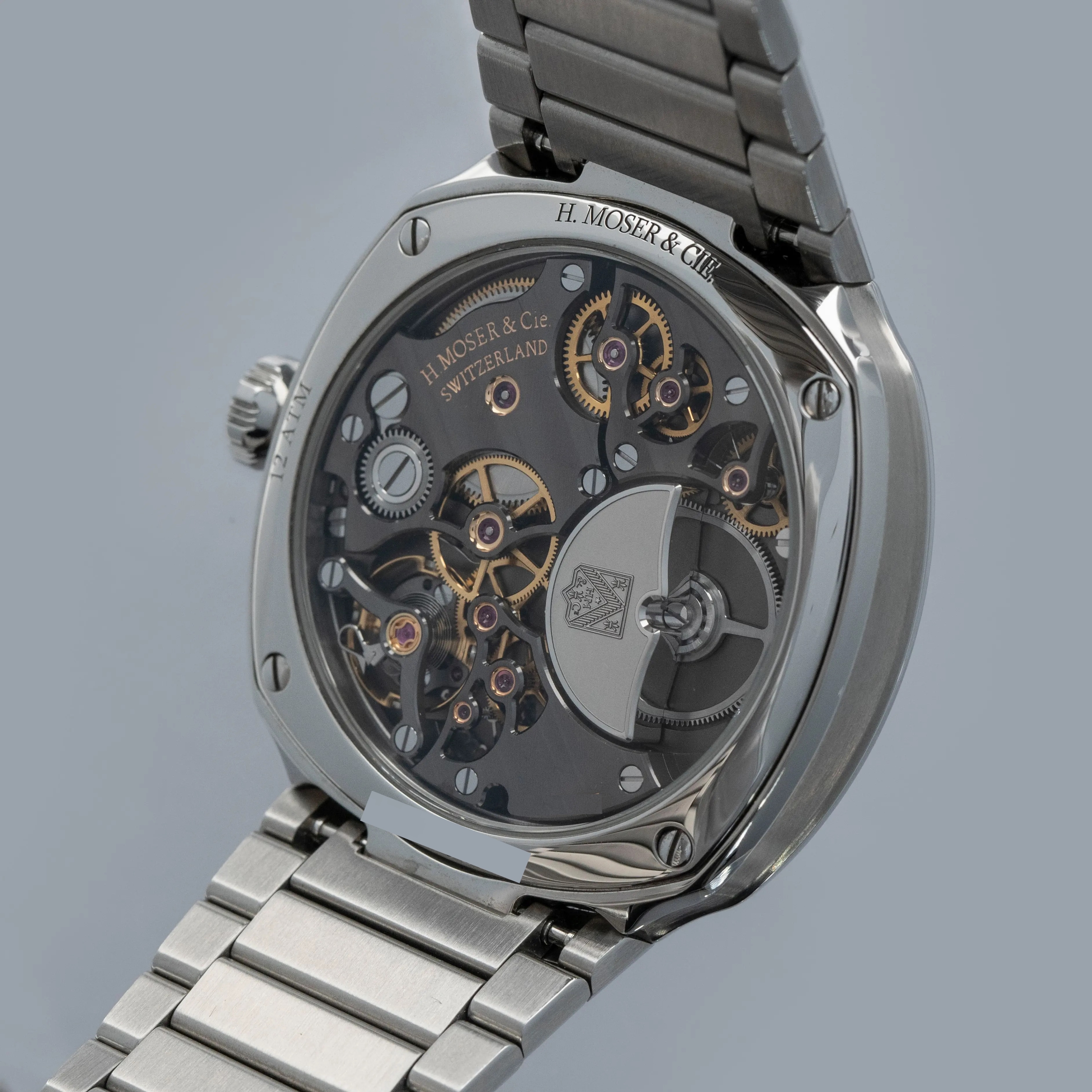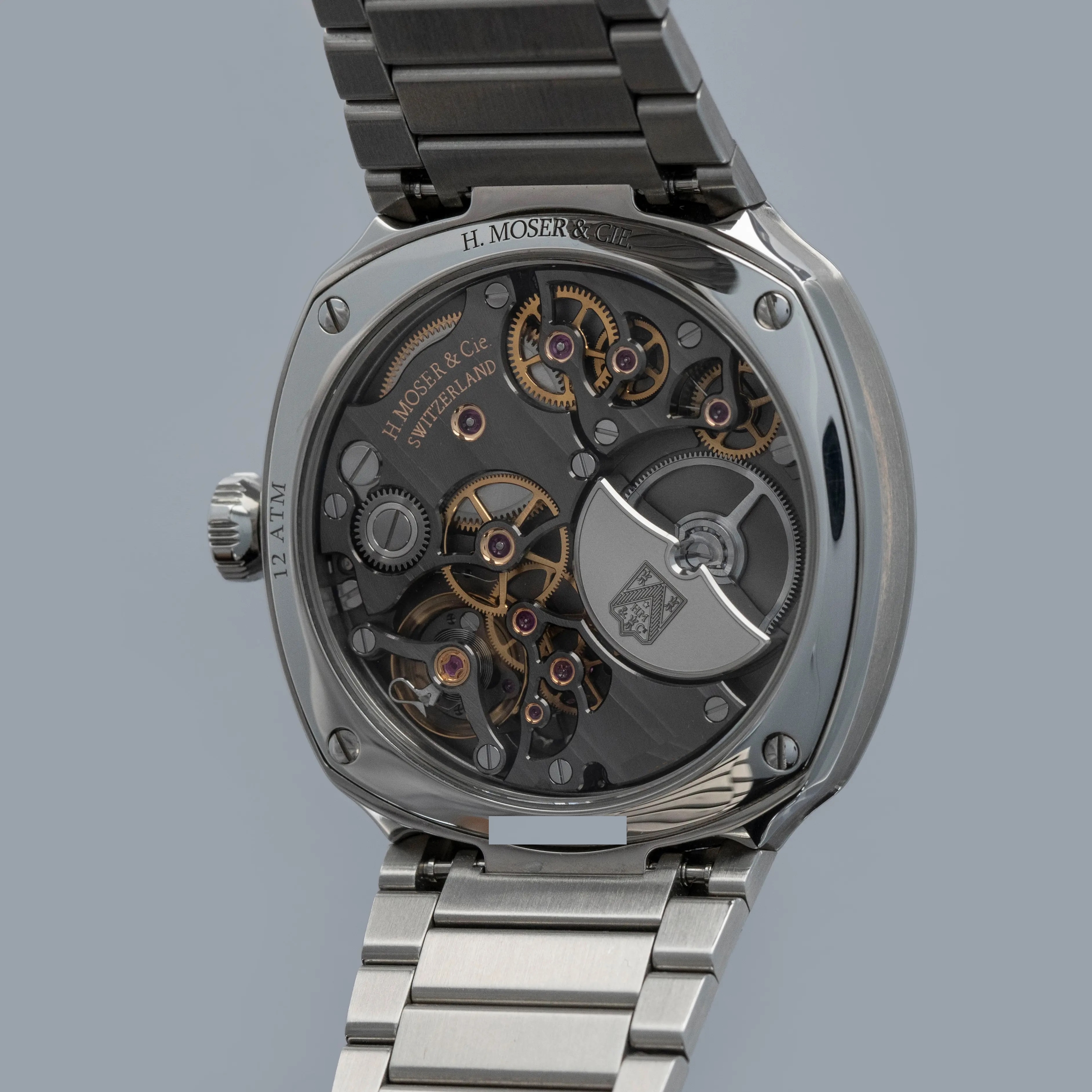 A unique timepiece from one of the most highly regarded and unique independent watchmakers on the market today, the H. Moser Streamliner Centre Seconds is a stunning sports watch inspired by the unlikely source that is the railroad. Launched in very early 2020 and designed for the avid watchmaking enthusiast looking to escape the confines of the traditional blue-chip brands, the Streamliner is a watch that retains some of the aesthetic codes that are popular today, such as its integrated bracelet and angular design, but with a splash of Moser’s revered design capability. Indeed, the Streamliner features a stainless steel construction and an amazingly comfortable single-link integrated bracelet that is completely unlike anything else on the market. Debuting in 2023, a few years after the collection’s initial release to market in January of 2020, the Small Seconds ref. 6500-1200 showcases the best of Moser’s work with dials, with its stunning blue Grand Feu fumé enamel display with a hammered texture finish that celebrates Moser’s speciality. Additionally, the ref. 6500-1200 also introduced a new, and more palatable, size of 39mm to the collection. Topping off its stunning design is its wonderfully robust automatic cal. HMC 500 movement that is displayed behind the Streamliner’s exhibition caseback. In typical Moser fashion, the Streamliner unites everything that is desirable in the market today into one package that is without equal, particularly when you consider the craftsmanship that has been achieved by Moser on the Streamliner, which is almost unparalleled for a watch in this category.