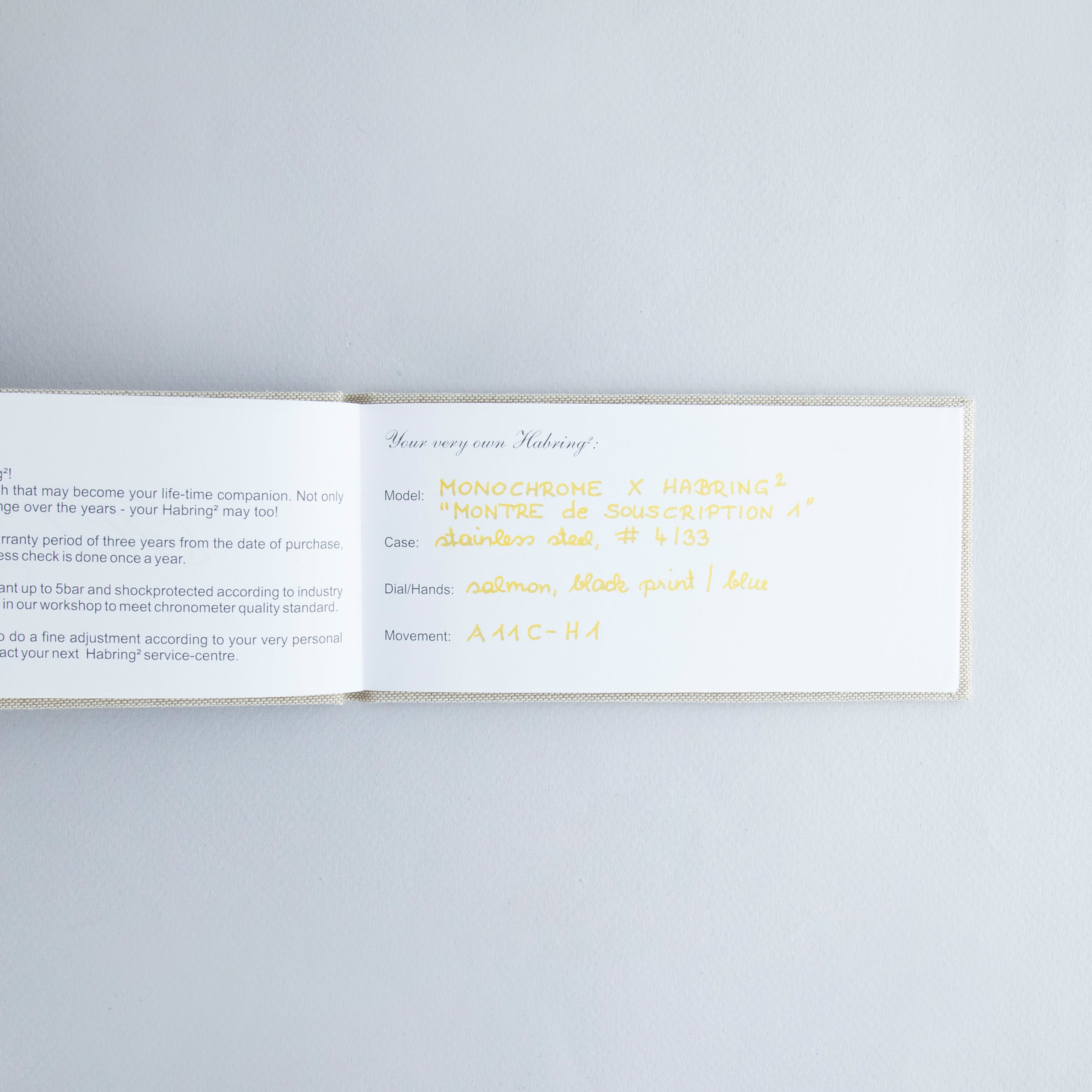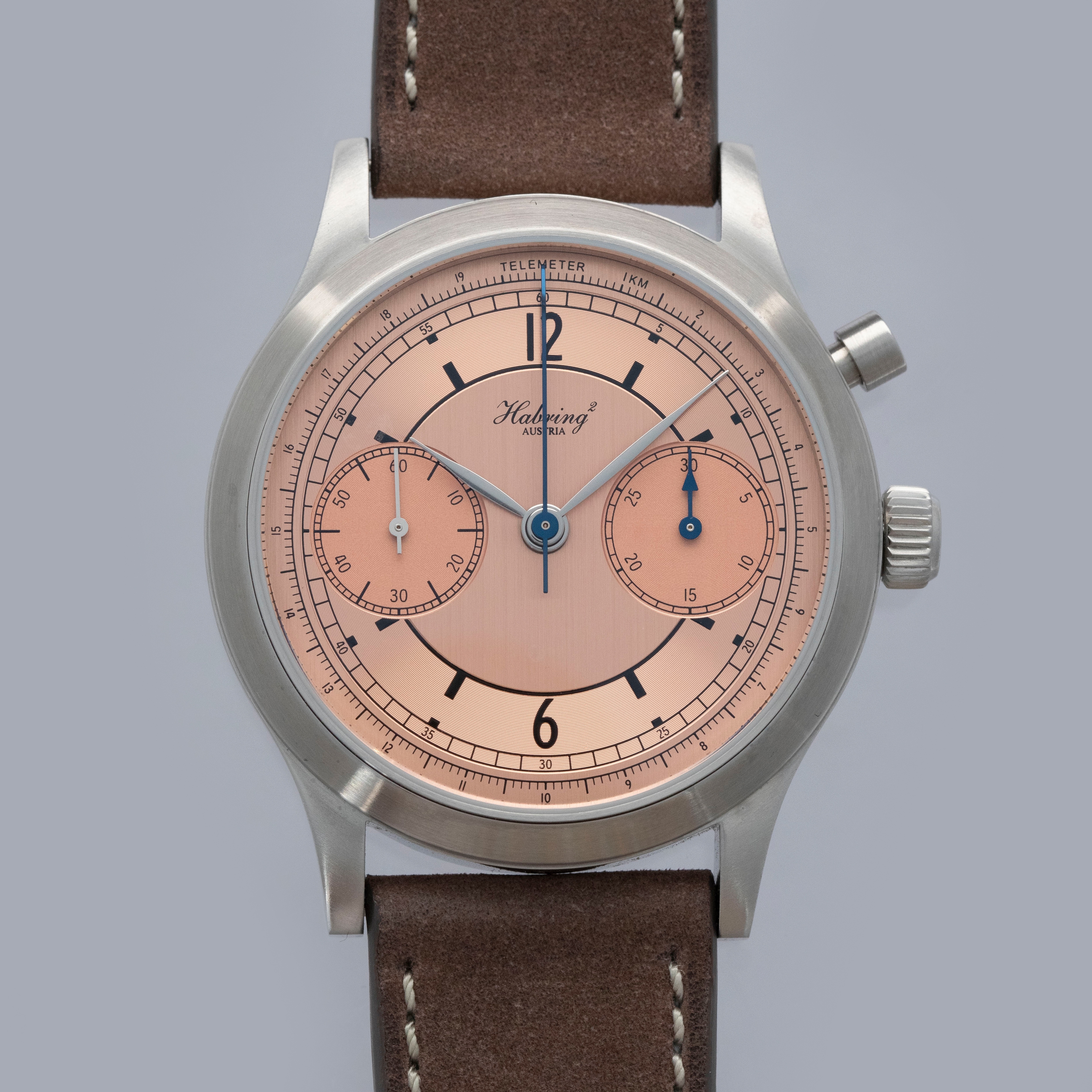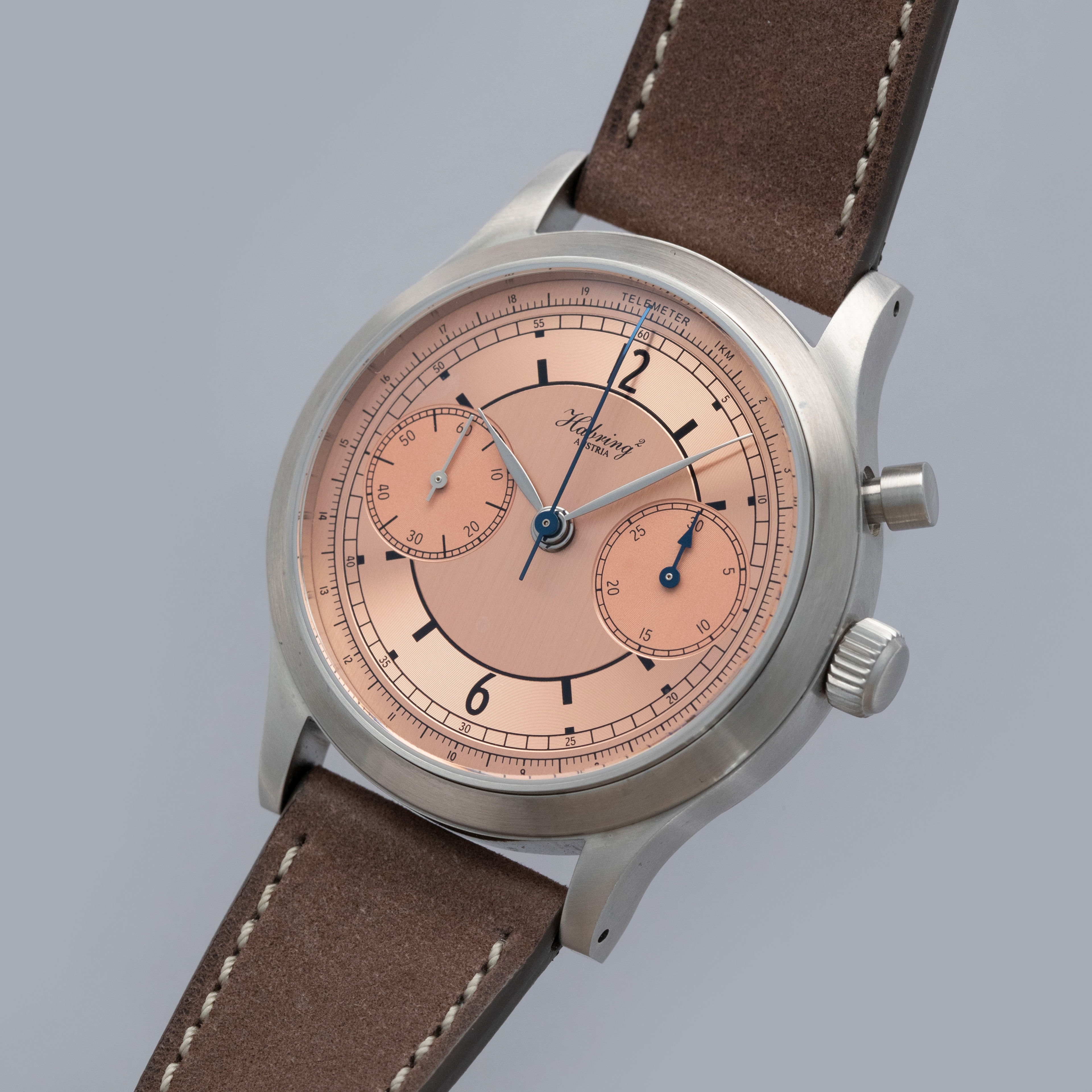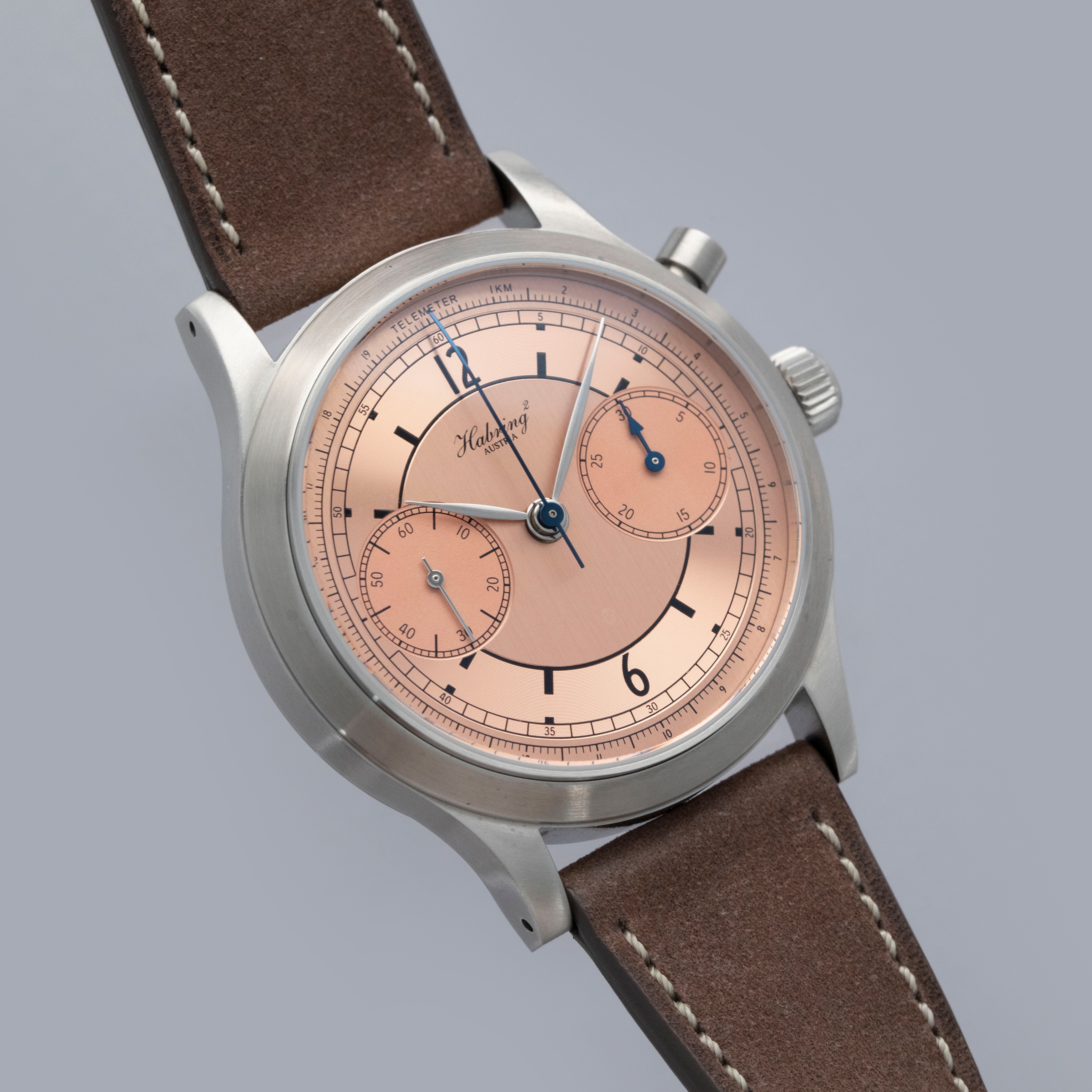 Founded in 2004 by husband-and-wife duo Richard and Maria Habring in the small town of Völkermarkt, Austria, Habring2 produces some of the most understated and technically impressive timepieces on the market for their relatively affordable price points. With a growing reputation for astoundingly well-produced timepieces, Habring2 joined with watch publication Monochrome Watches in 2021 to celebrate Monochrome’s 15 year anniversary with their very first collaboration timepiece; the MONOCHROME Montre De Souscription 1. Limited to just 33 timepieces, the MDS1 was, as its name suggests, sold via Souscription, an old system watchmakers would use whereby half of the watch was paid for before production, with the other half due upon delivery. Inspired by mid-century chronographs, the MDS1 boasts a stunning salmon sector dial like those of the 1940s and an in-house manual-wind chronograph movement produced by Habring2. Featuring a 38.5mm diameter stainless steel construction with a flat brushed bezel and case, the MDS1 merges modern-day sensibilities with its mid-century inspiration to produce a stunning experience on the wrist that is deserving of Habring2’s reputation and its place as Monochrome’s very first collaboration timepiece.