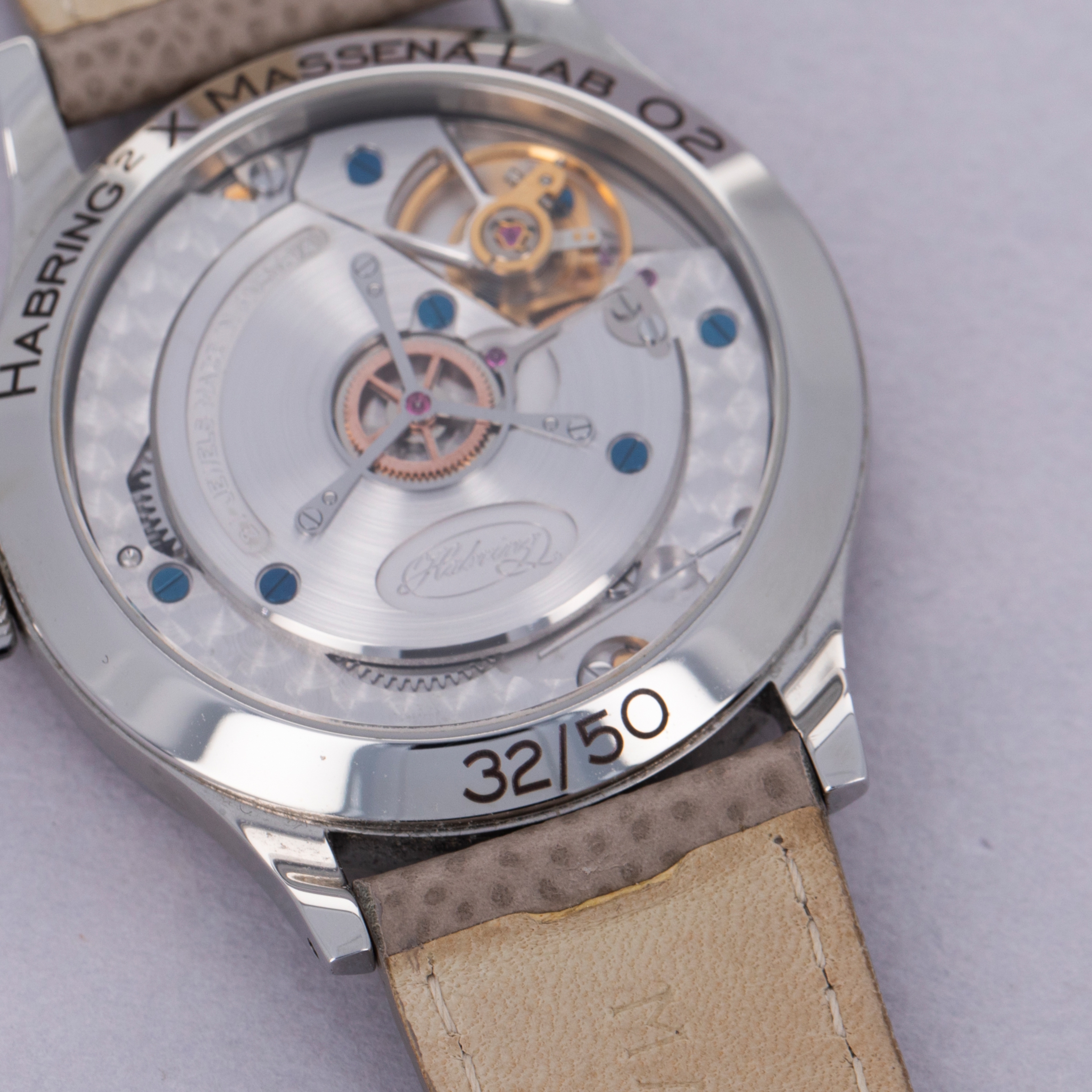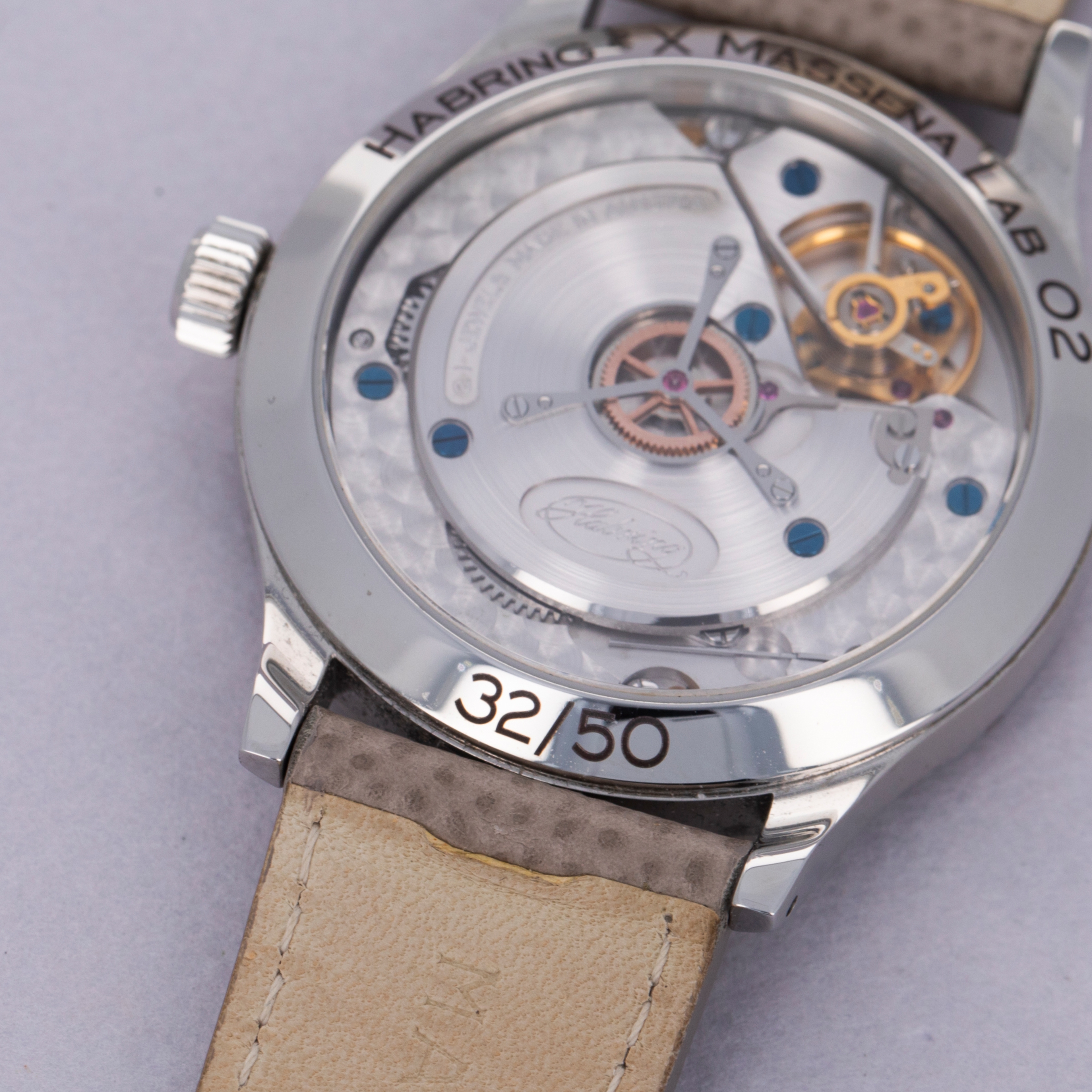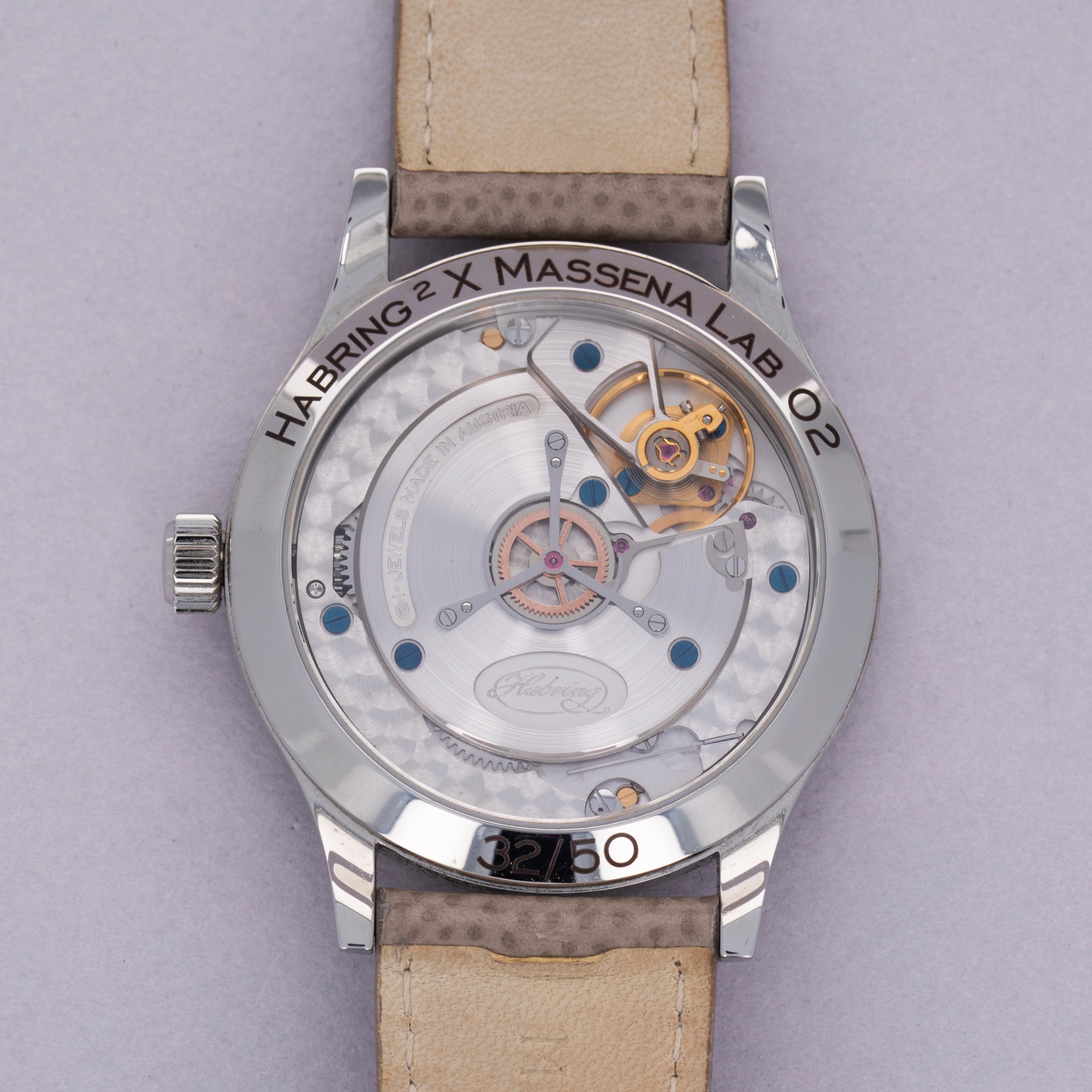 The world of independent watchmaking is particularly diverse, but two of the industry's most prominent names have been Habring2 and Massena Lab, founded by husband and wife duo Richard and Maria Kristina Habring and William Massena respectively. In 2020, these three independent powerhouses decided to collaborate for the second time and launch the Erwin LAB02 that we have here. Inspired by 1930s watchmaking like the Erwin LAB01, the LAB02 features a sector dial that is now a two-tone display with a silver center and a champagne chapter ring that houses its raised Arabic numerals. Continuing with the LAB01’s 1930’s dress watch-inspired aesthetic, the LAB02 features the same 38.5mm case construction, but in a more traditional stainless steel than the LAB01’s bronze case. However, unchanged from the LAB01, the LAB02’s caseback still provides a stunning view of its manual-wind movement, the cal. A11MS. Featuring the ever-complicated deadbeat function, the LAB02’s movement drives the second hand only once per second, giving the LAB02 the appearance of a quartz watch. A particularly complicated mechanism, the LAB02 had to be kept as a limited release like its predecessor, and so only 50 examples were produced.