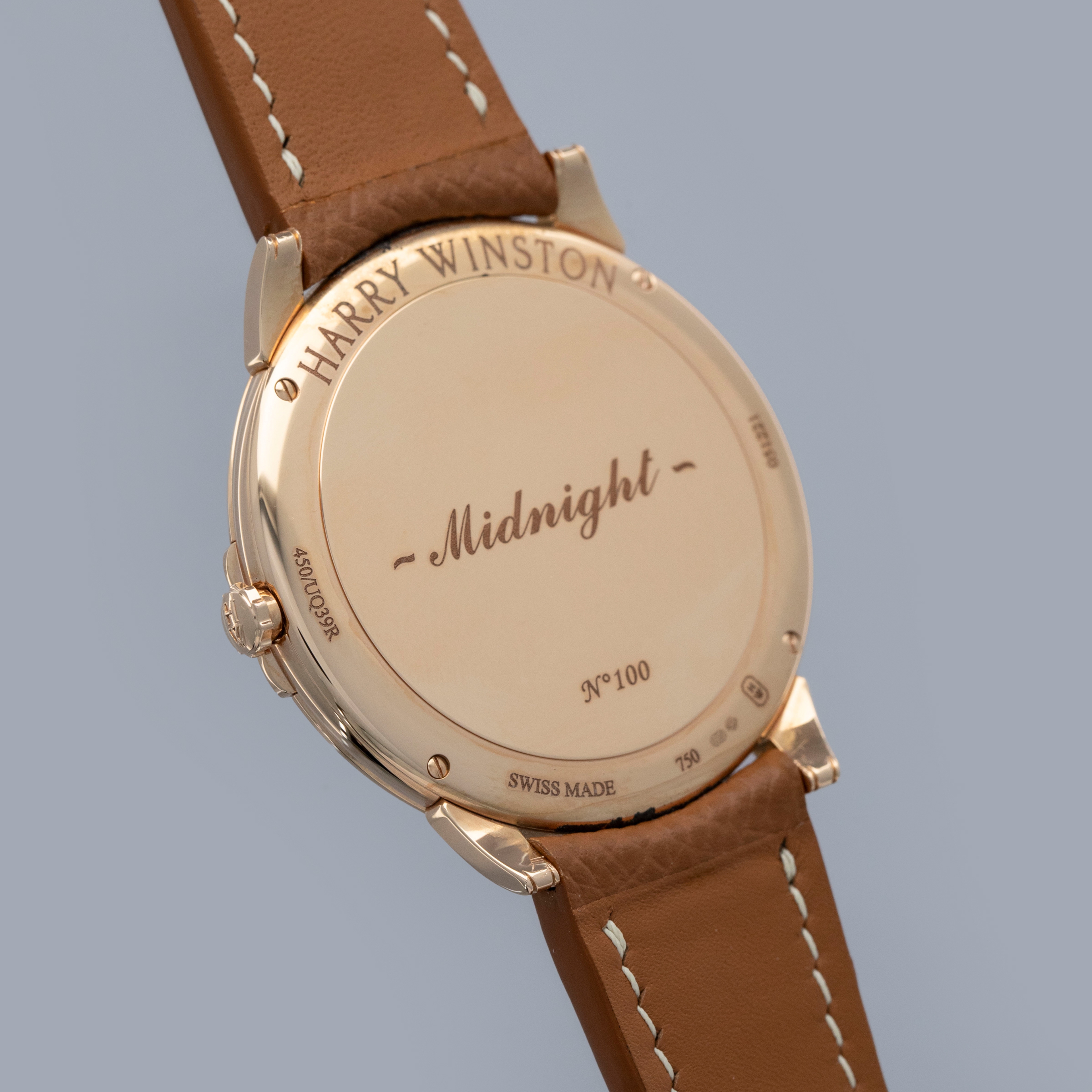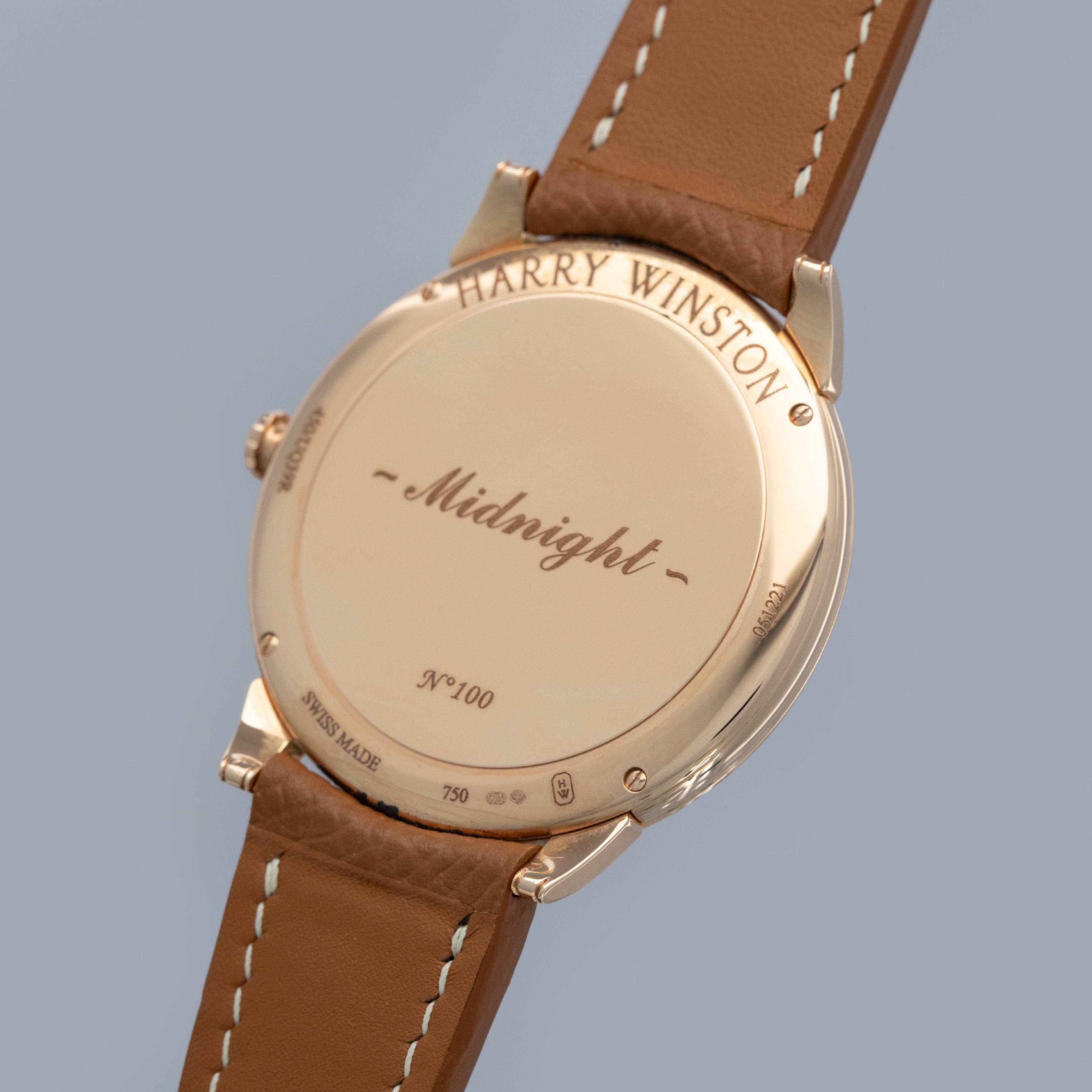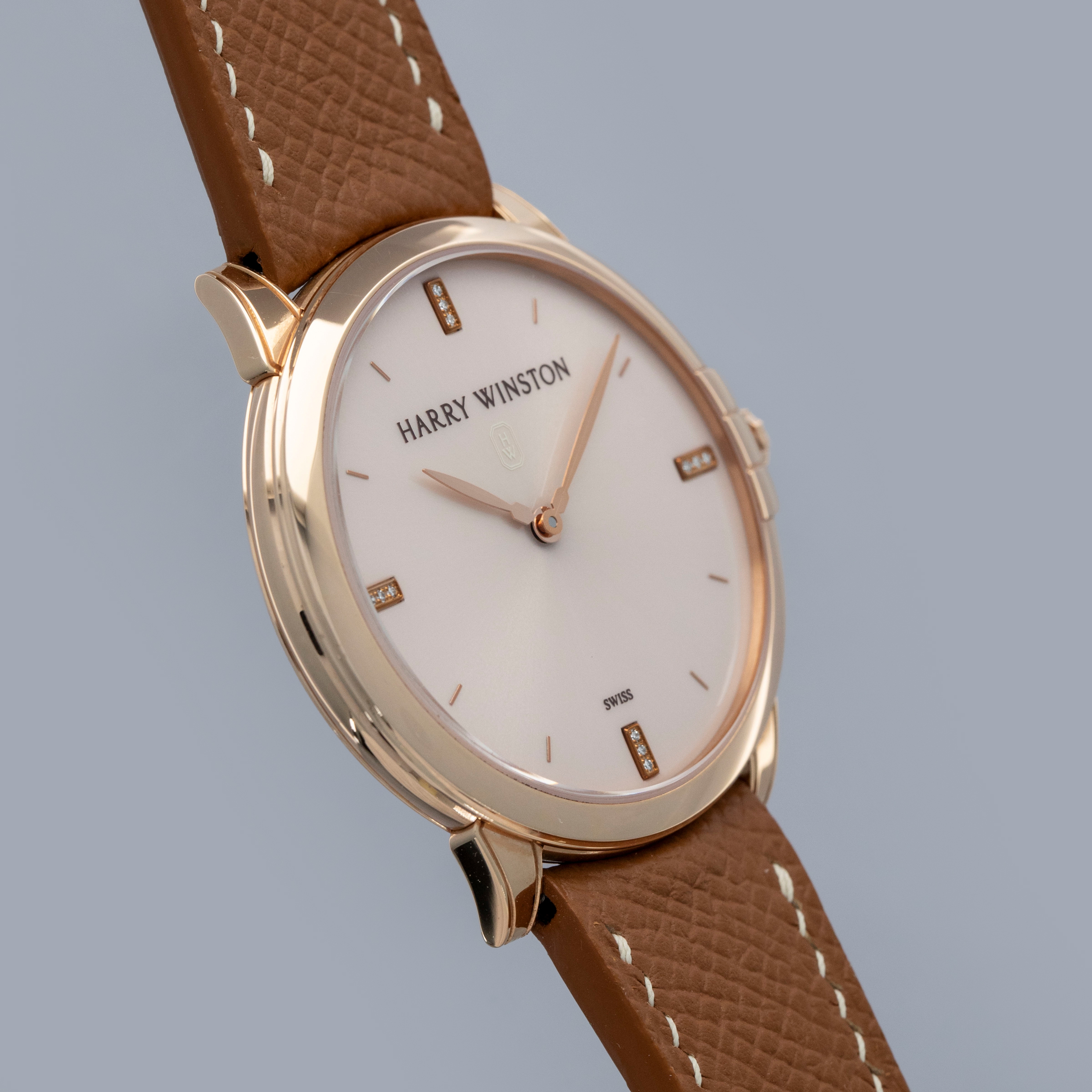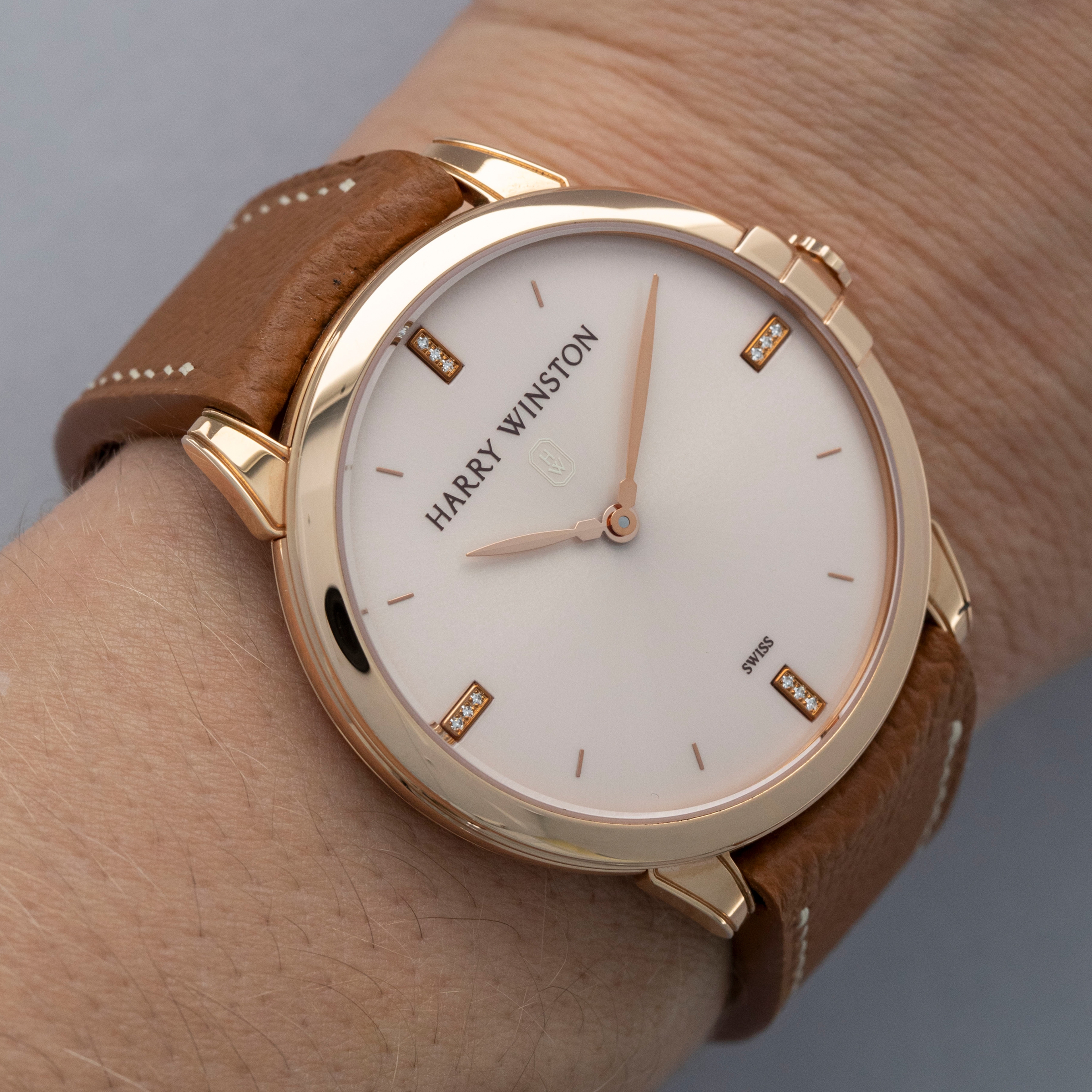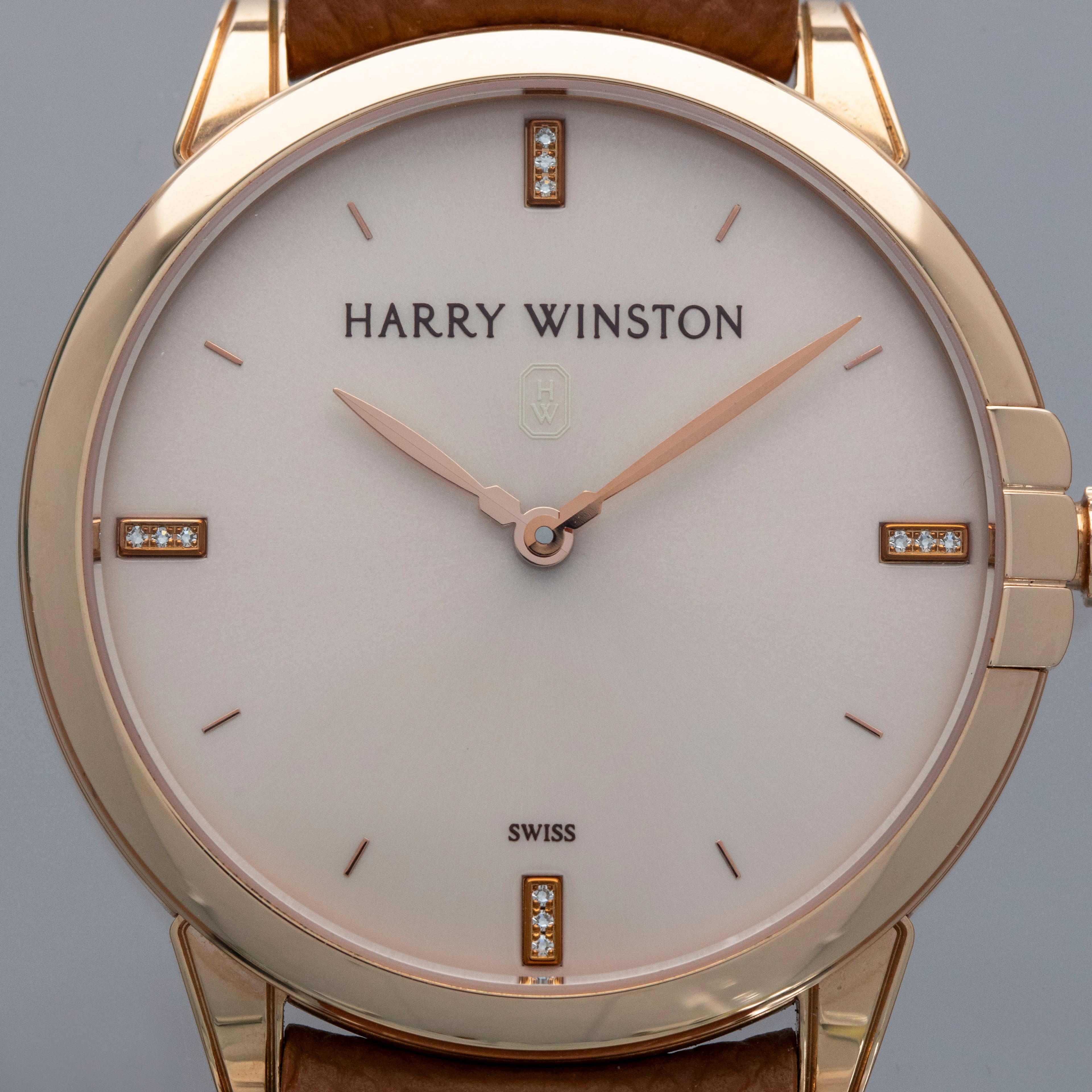The watch is in near-mint condition. The rose gold case shows light marks from careful wear. The case back features very crisp hallmarks and engravings, with some light wear to the screw heads and mild tarnishing at the top and bottom. There is additional tarnishing on the gold pin buckle. The dial and hands are like new. The watch is fitted with a new brown leather strap and a Harry Winston gold pin buckle in near-mint condition.