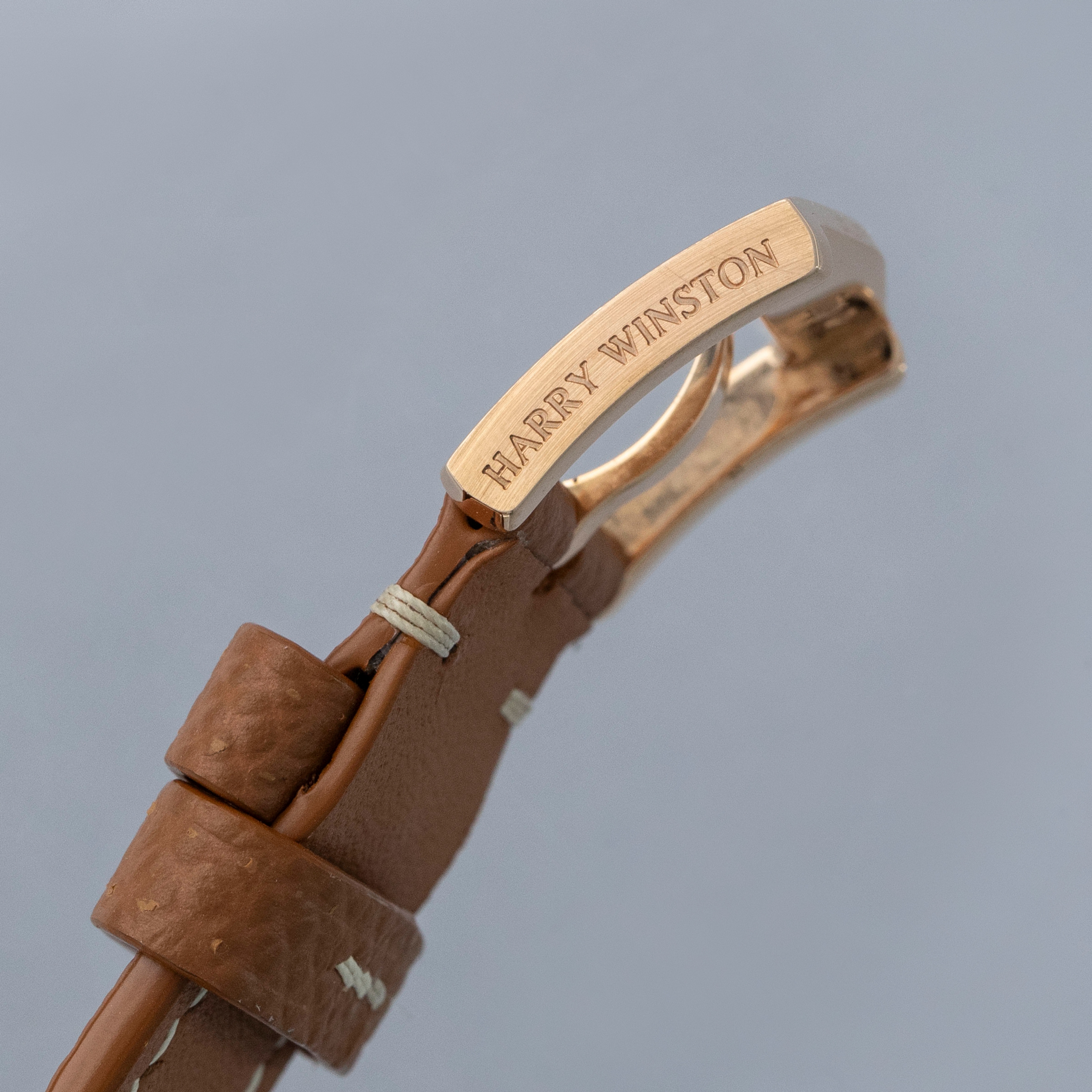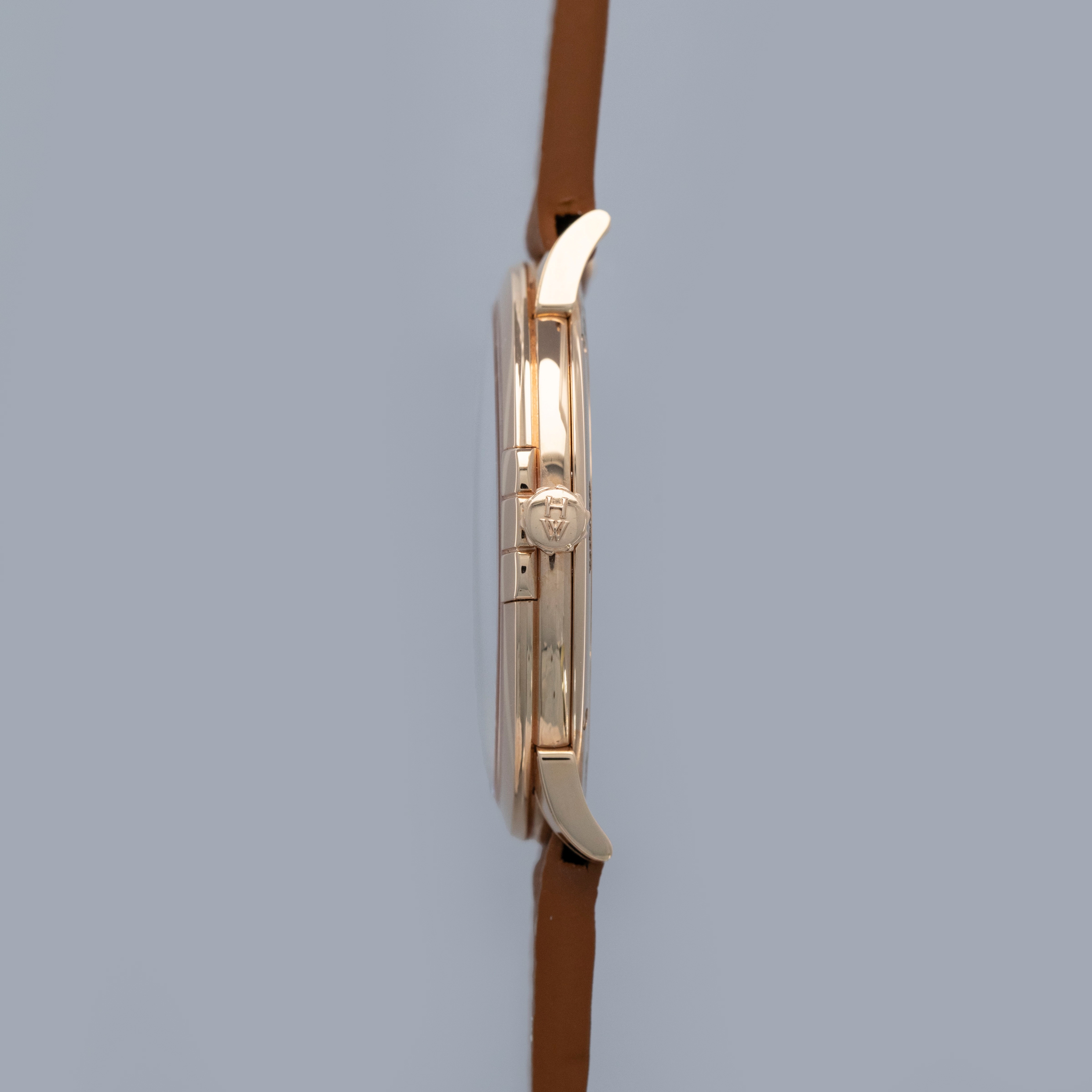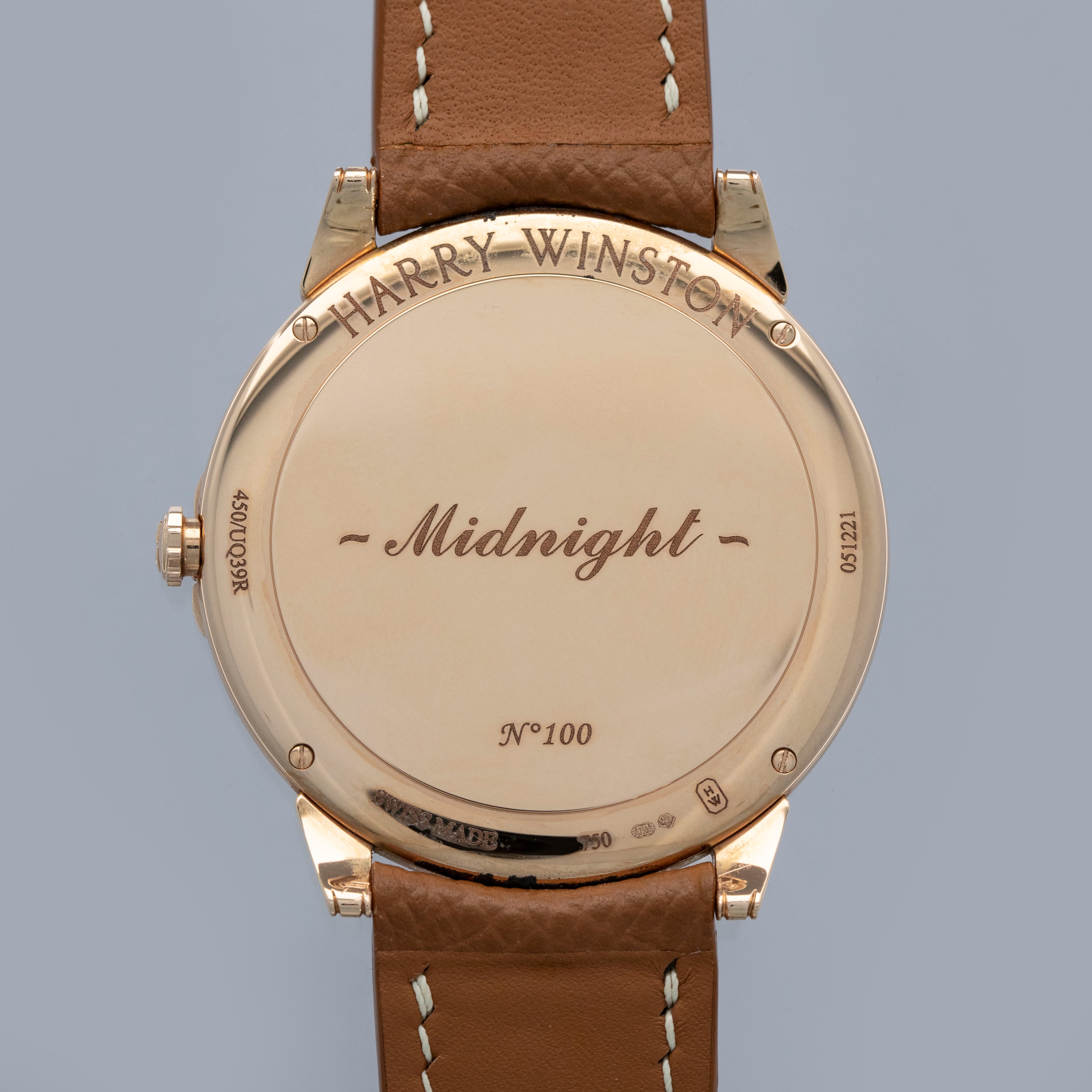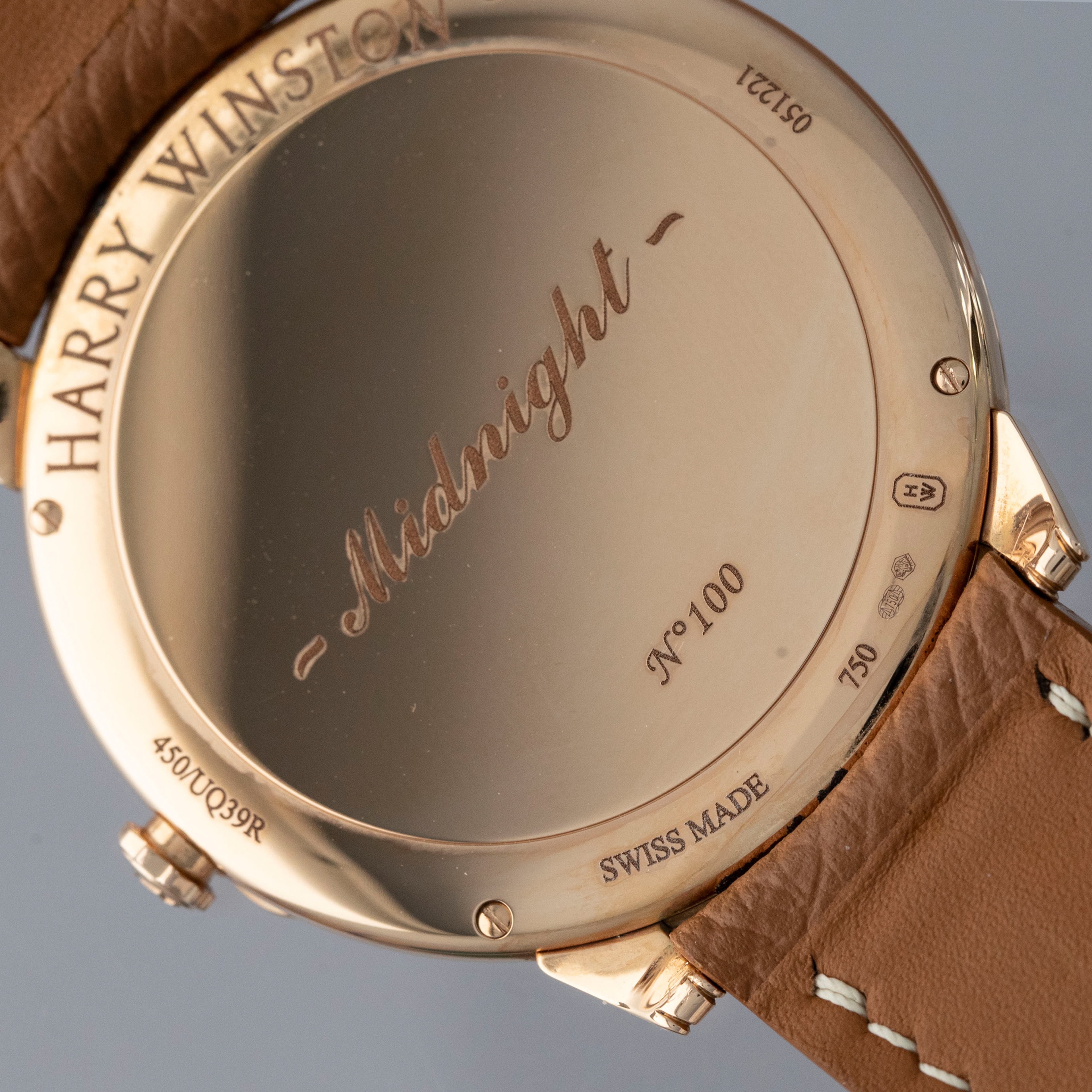 The watch is in near-mint condition. The rose gold case shows light marks from careful wear. The case back features very crisp hallmarks and engravings, with some light wear to the screw heads and mild tarnishing at the top and bottom. There is additional tarnishing on the gold pin buckle. The dial and hands are like new. The watch is fitted with a new brown leather strap and a Harry Winston gold pin buckle in near-mint condition.