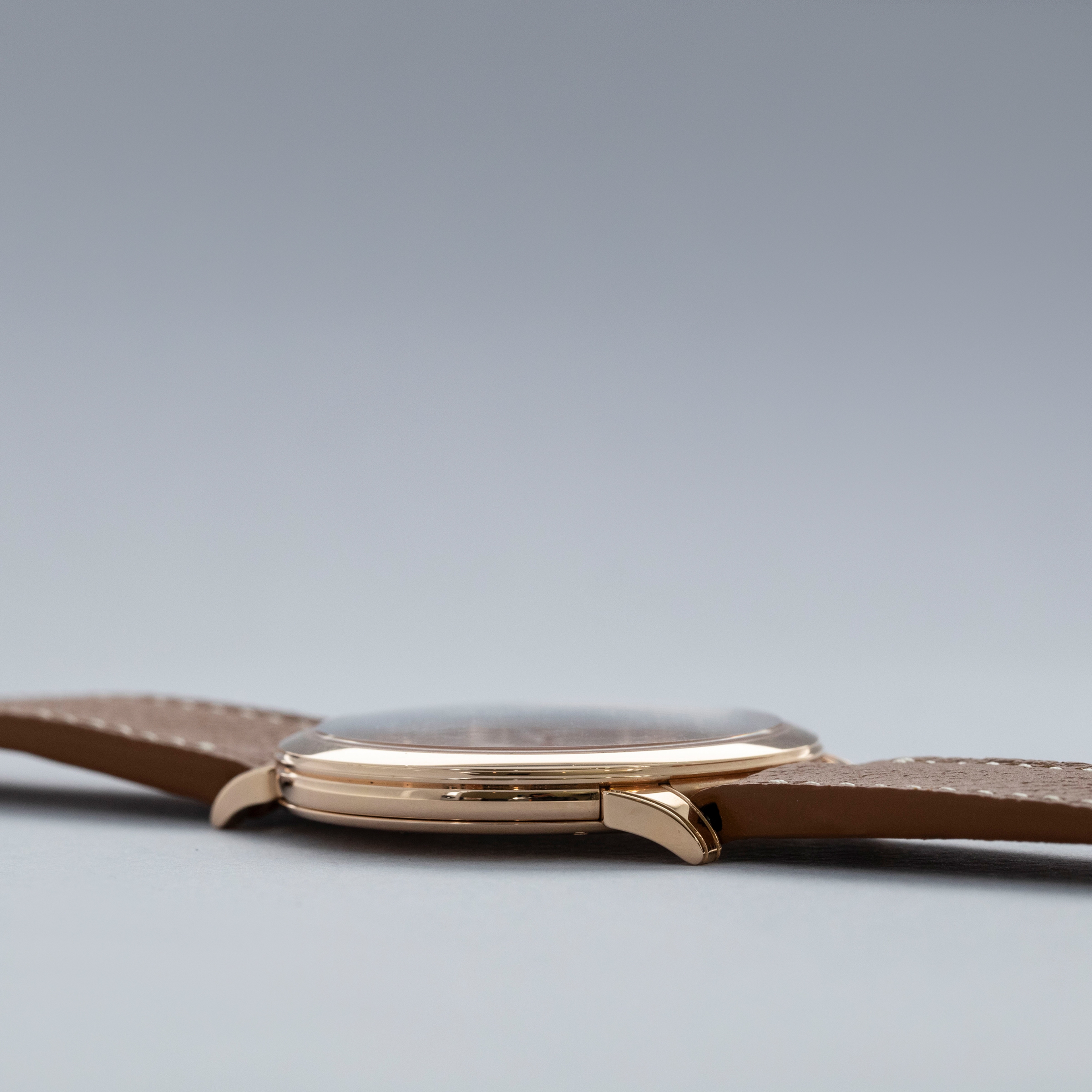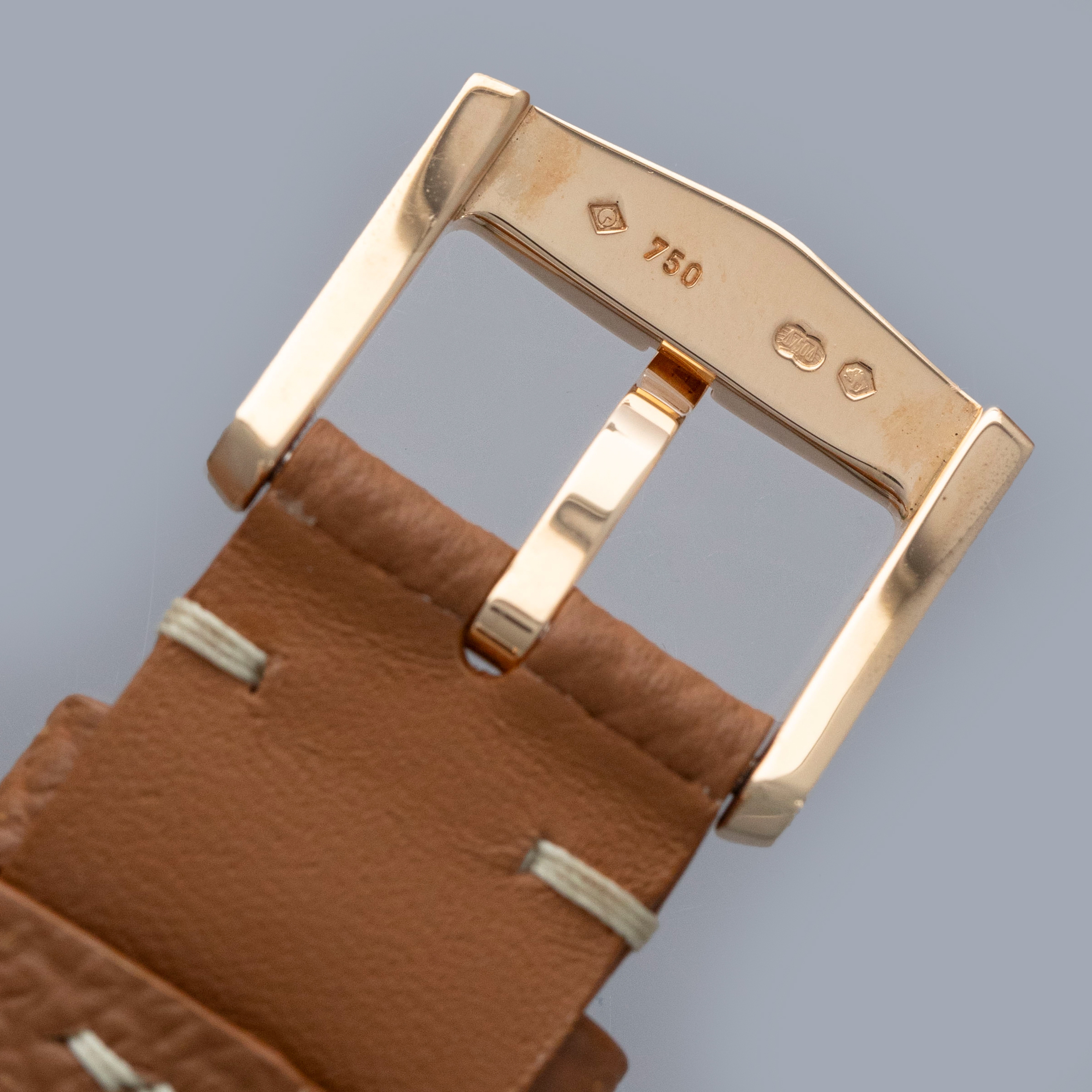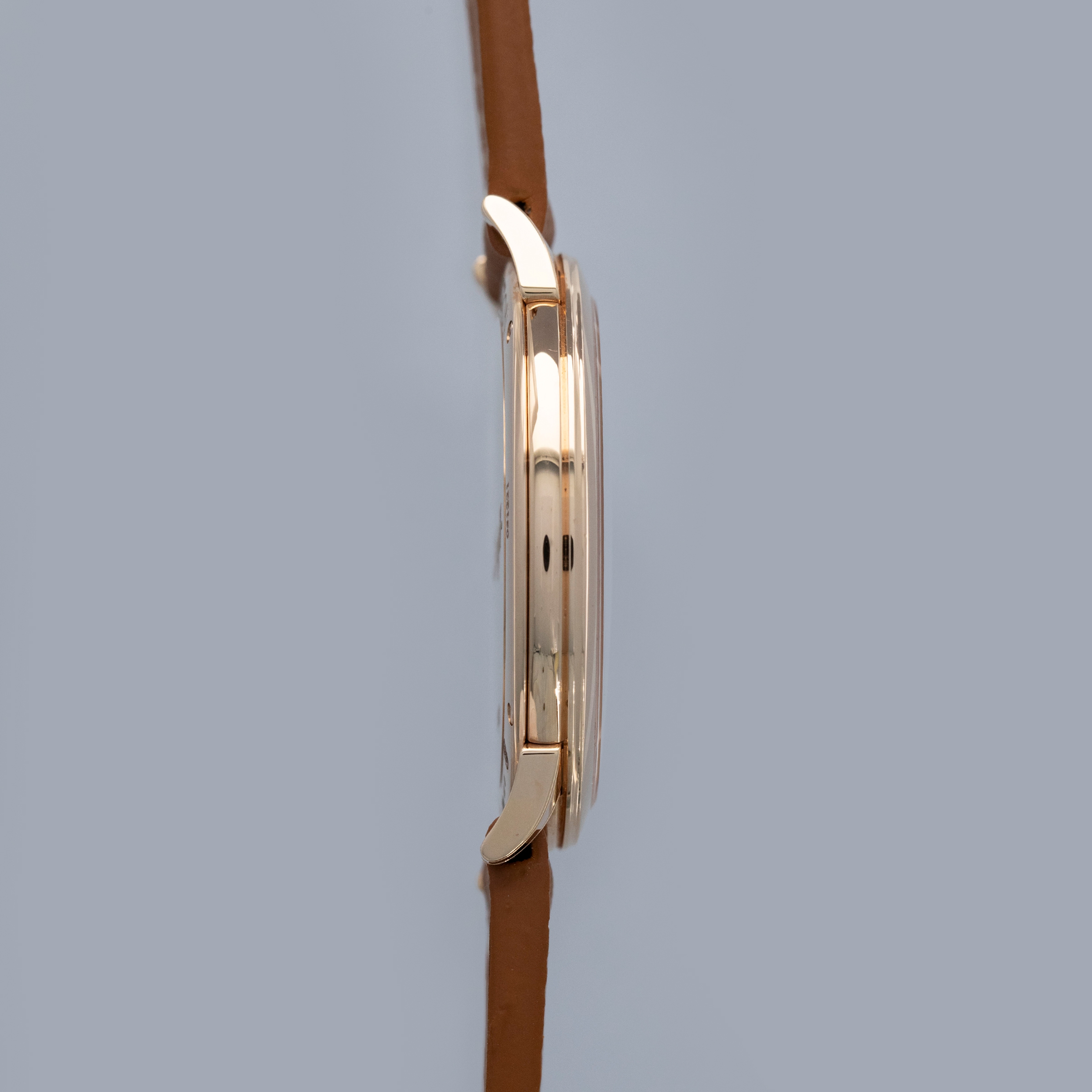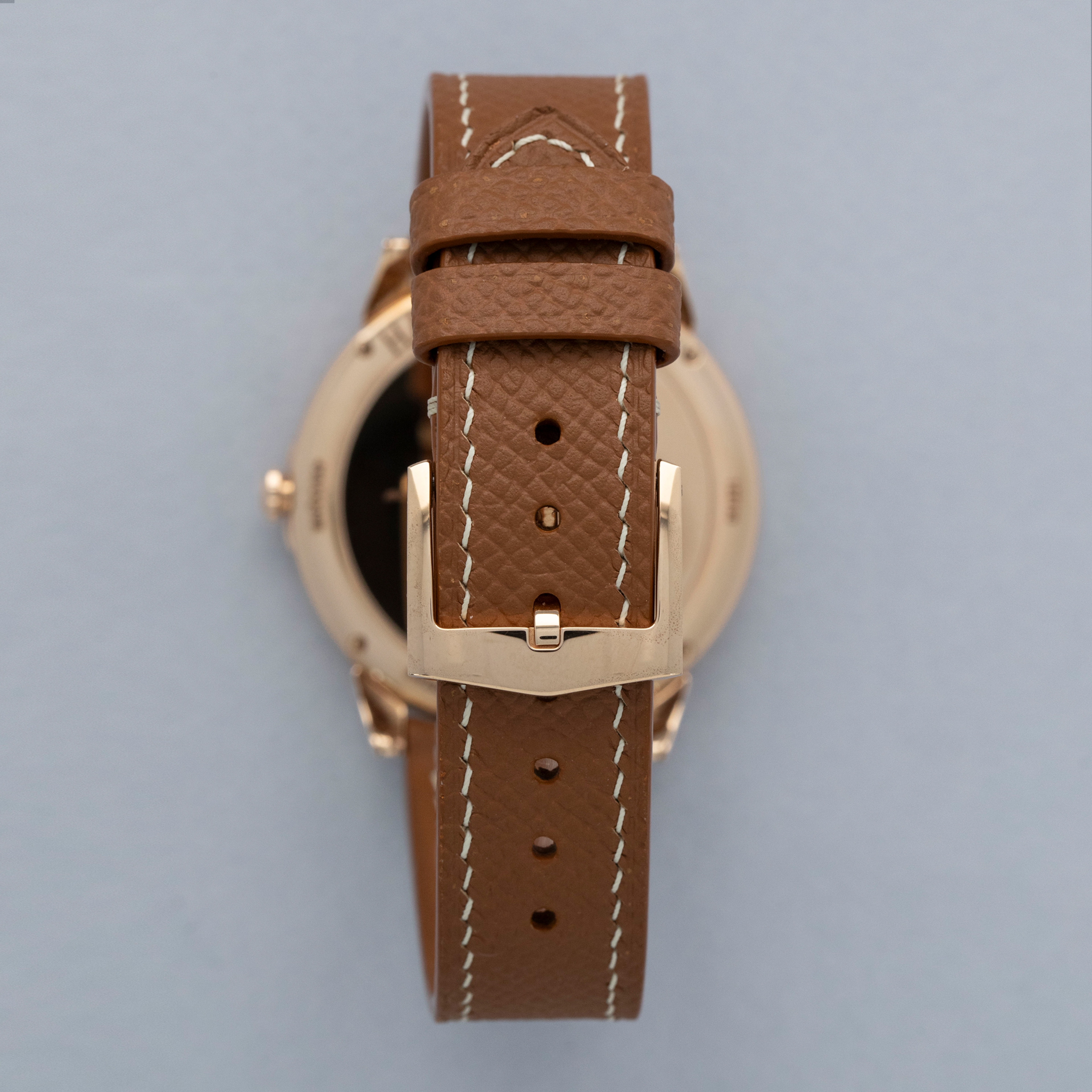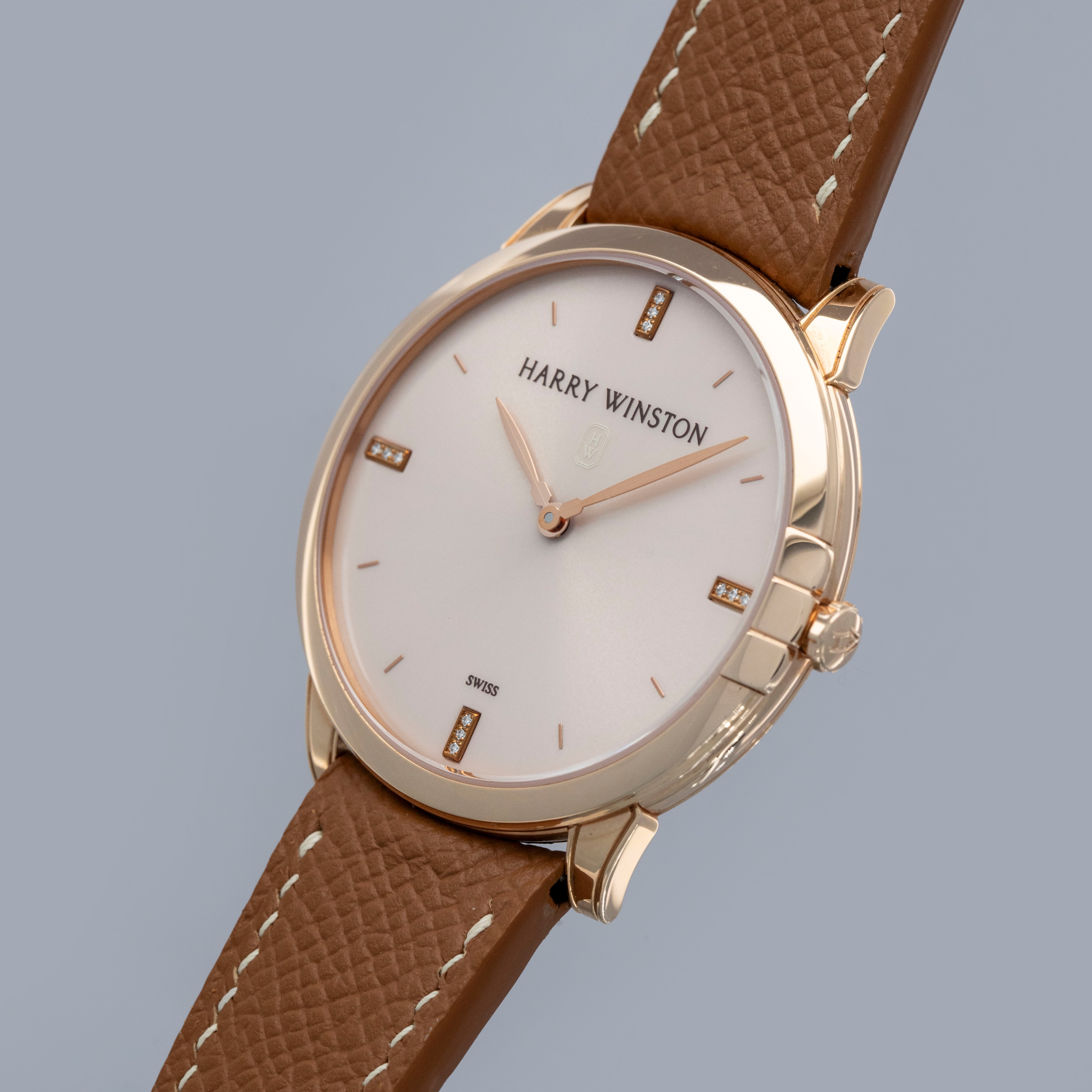 The watch is in near-mint condition. The rose gold case shows light marks from careful wear. The case back features very crisp hallmarks and engravings, with some light wear to the screw heads and mild tarnishing at the top and bottom. There is additional tarnishing on the gold pin buckle. The dial and hands are like new. The watch is fitted with a new brown leather strap and a Harry Winston gold pin buckle in near-mint condition.
