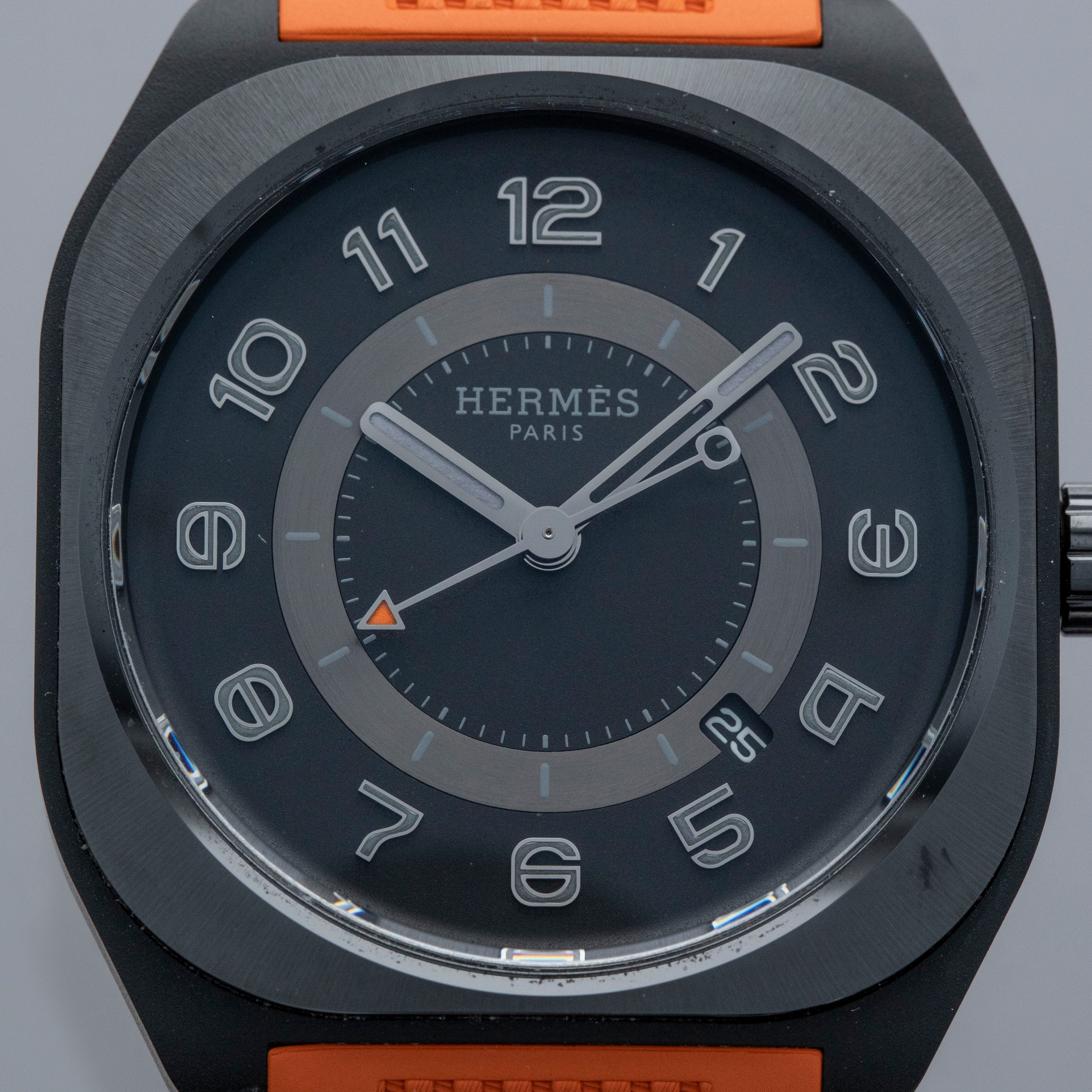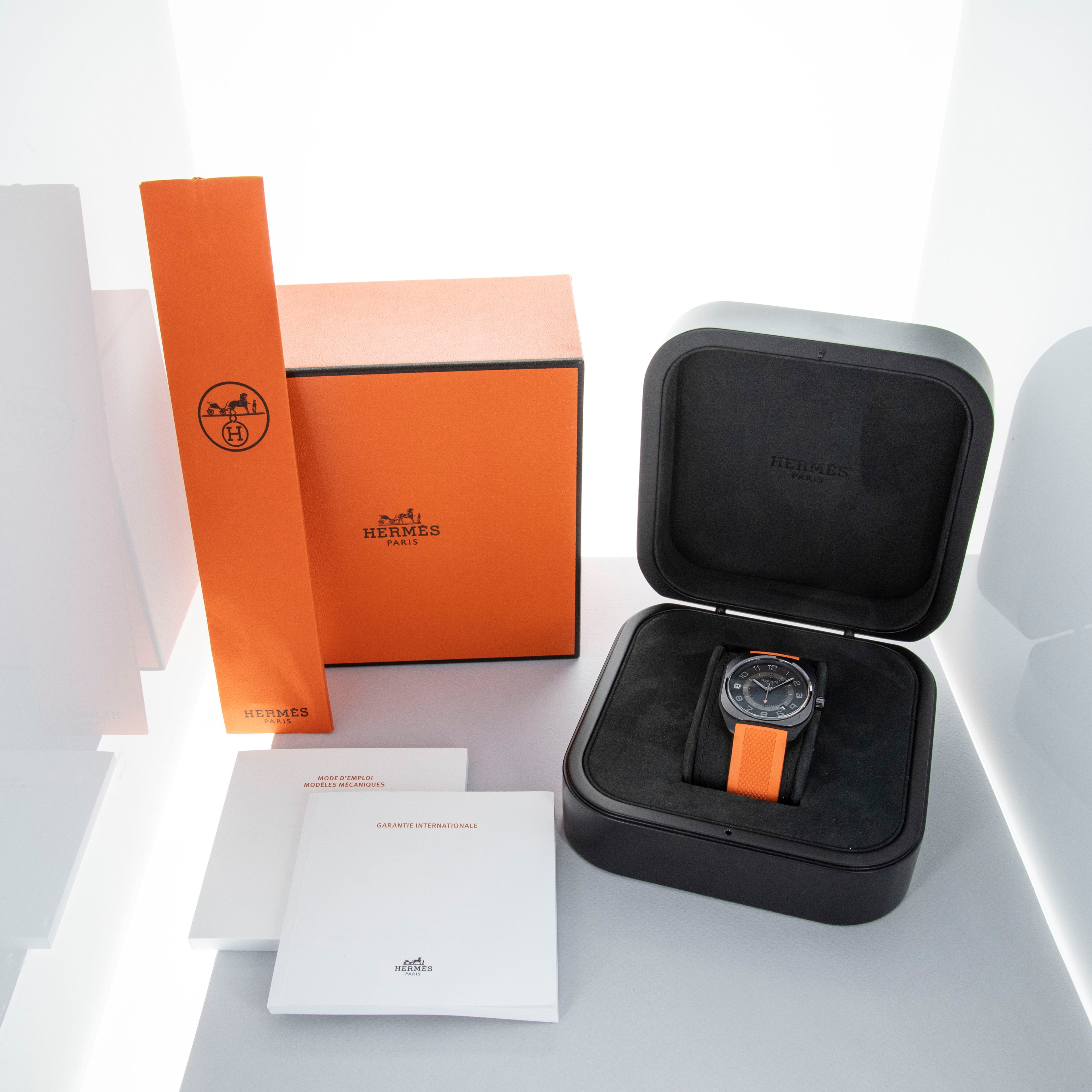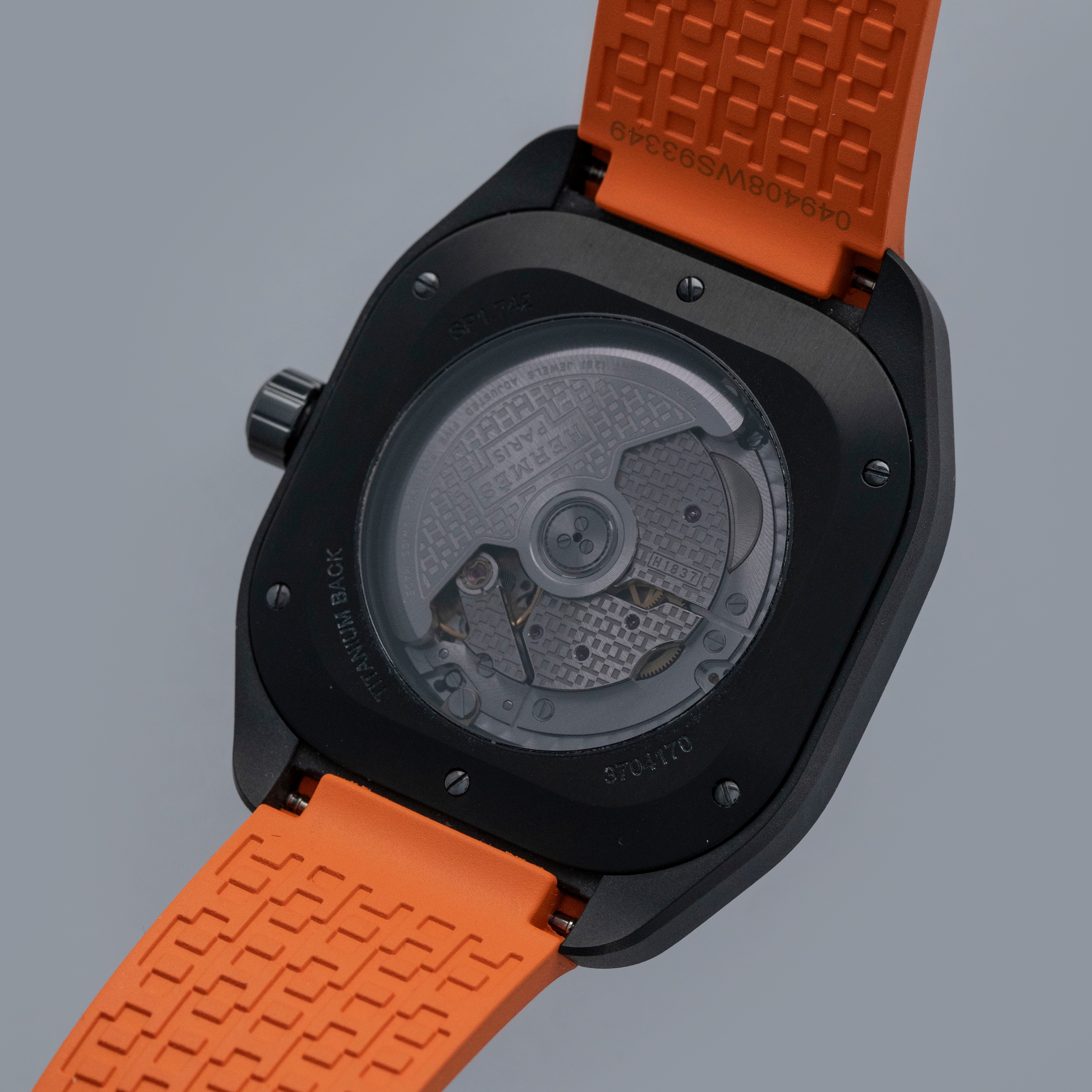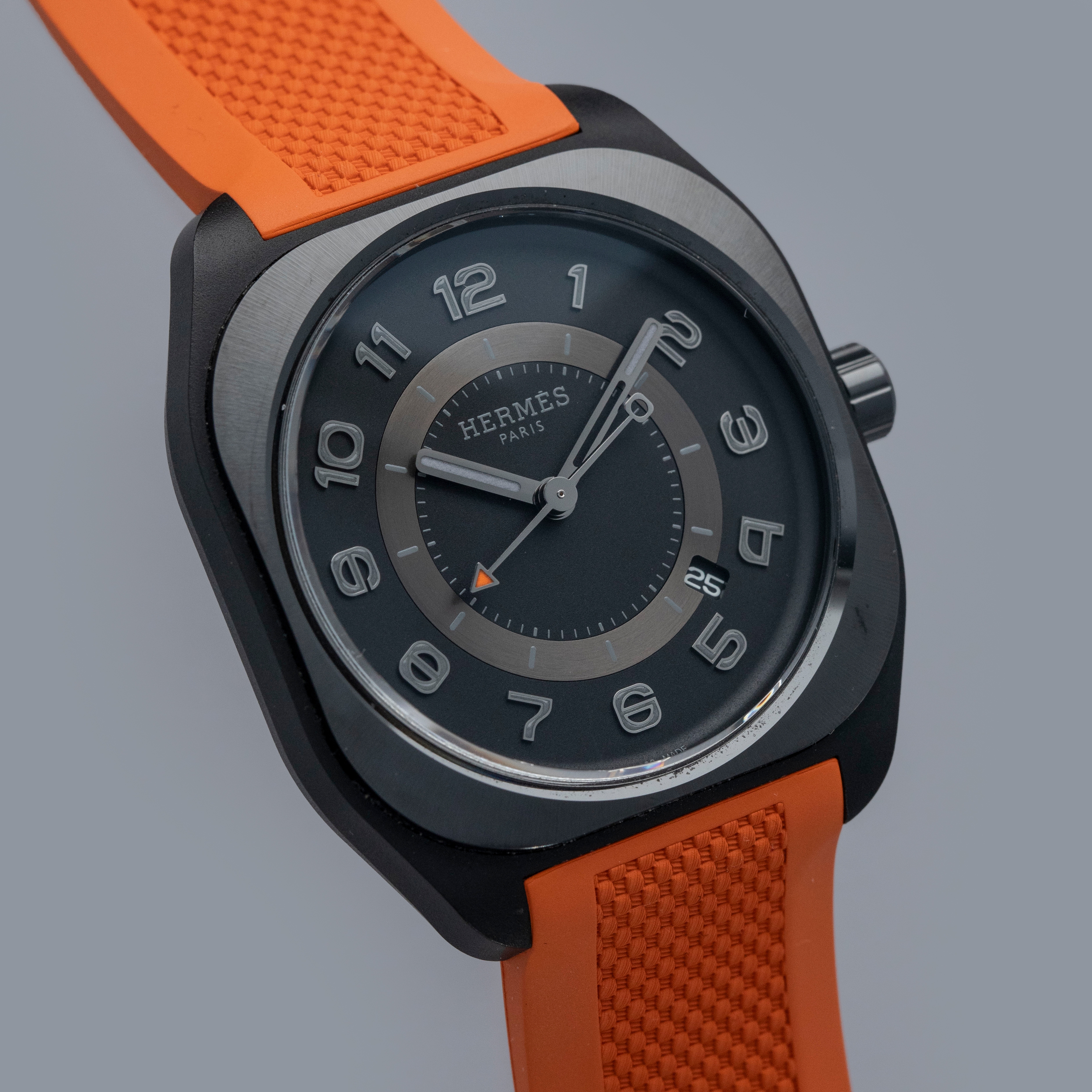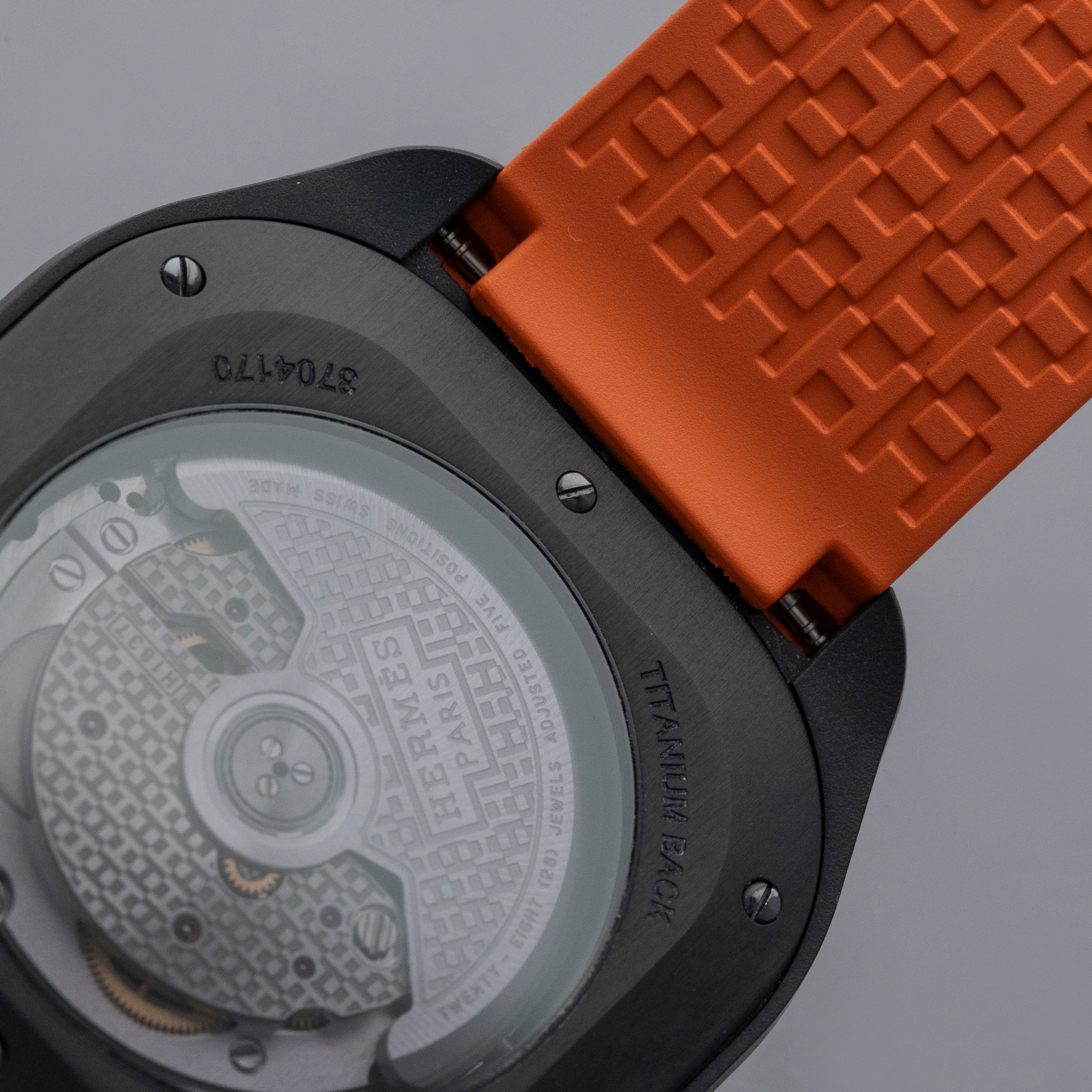 Watch is in overall near-mint condition. The graphite composite case shows a few light signs of wear, while the display case back displays some light surface marks with well-defined engravings around the edge. The dial and hands remain like new. It is fitted with an Hermès orange rubber strap and a black pin buckle, both remaining near mint, and includes a spare black Hermès rubber strap. Comes complete with inner and outer boxes and warranty booklets.