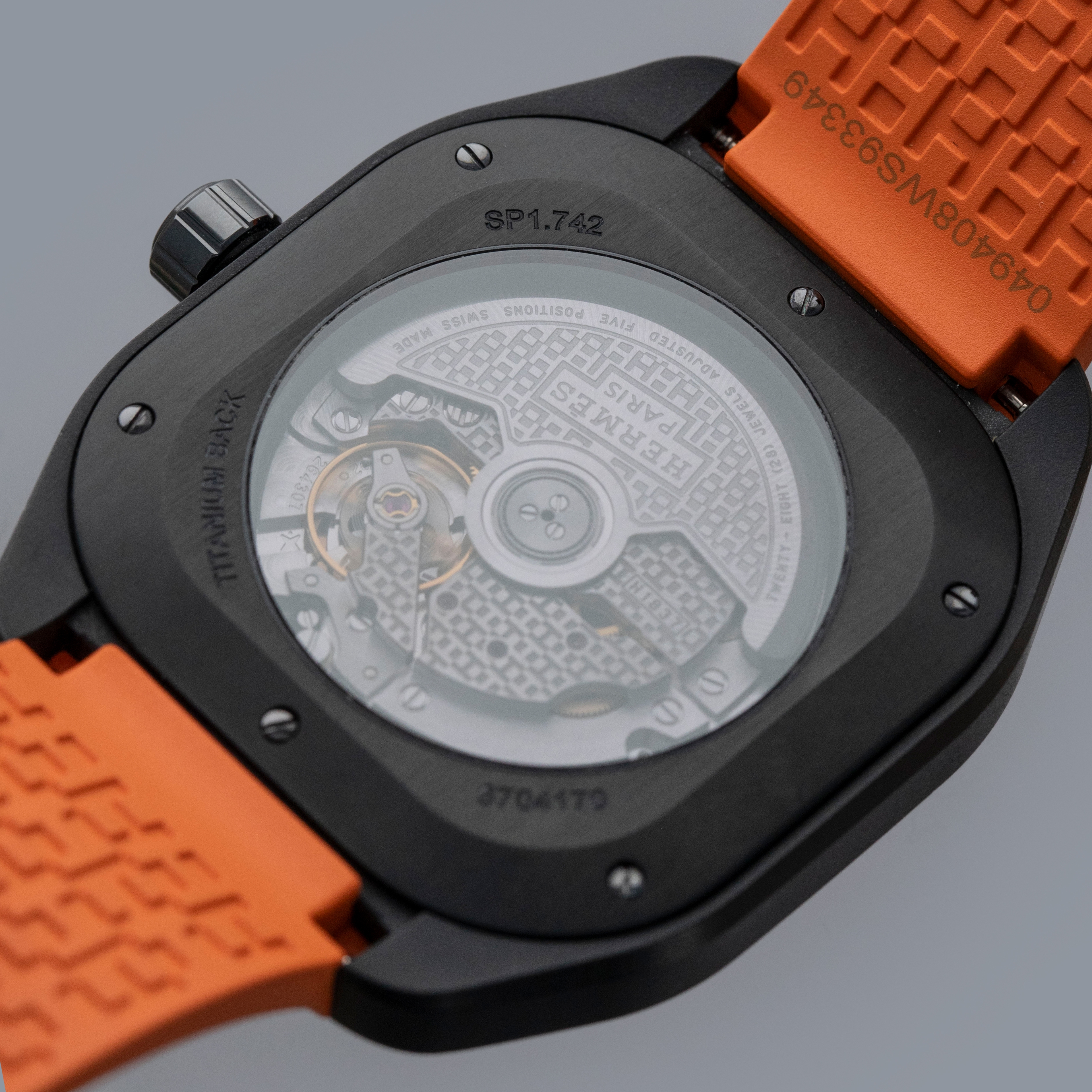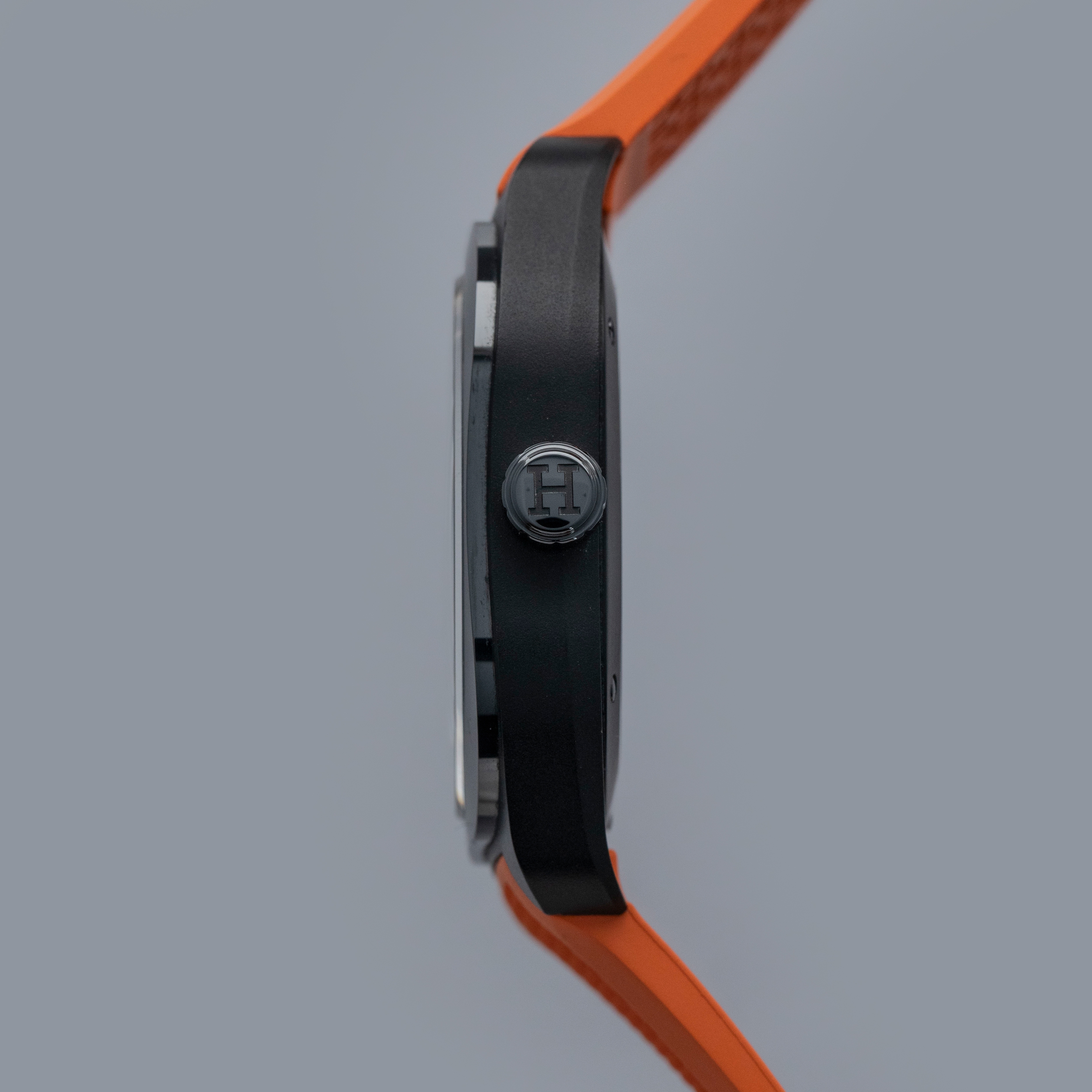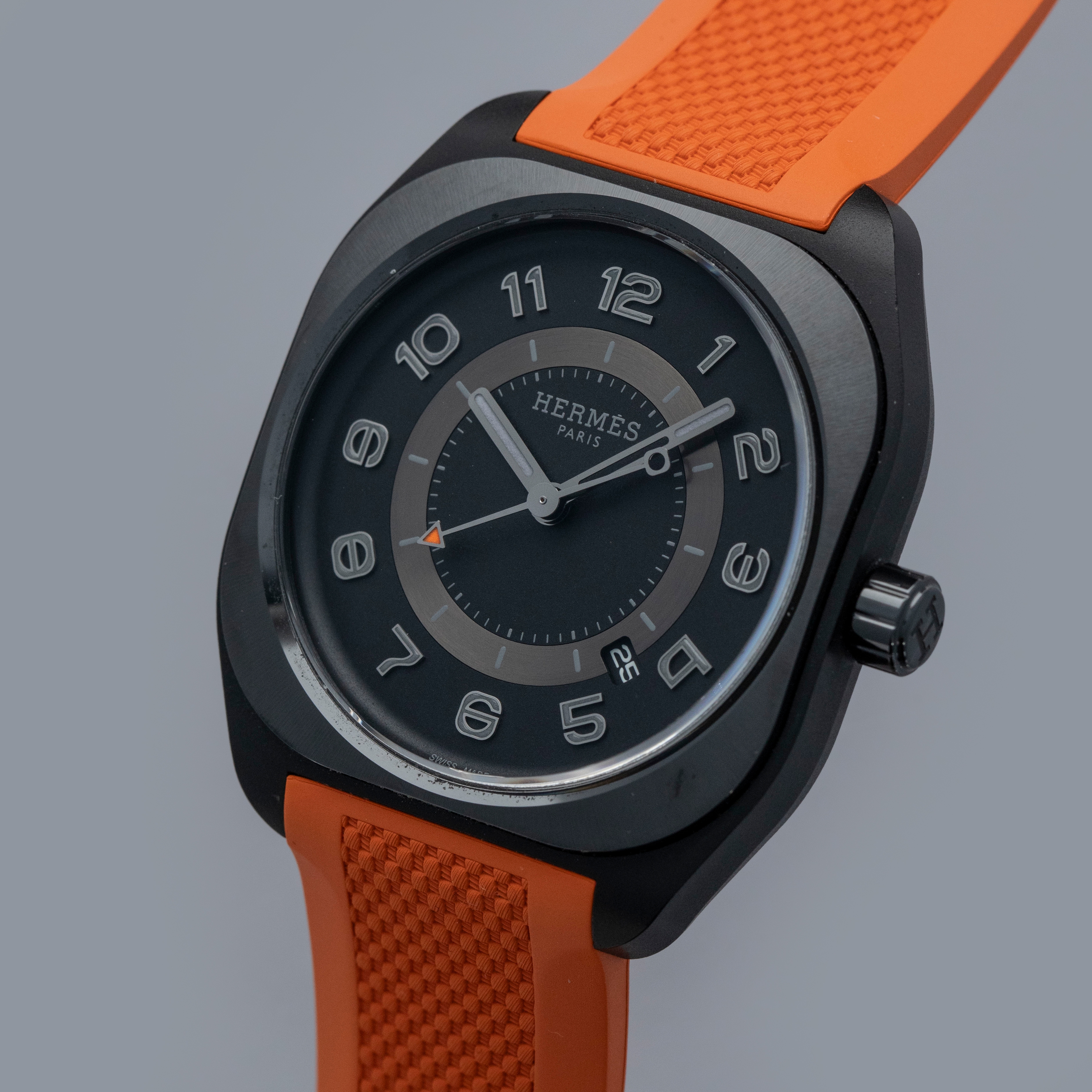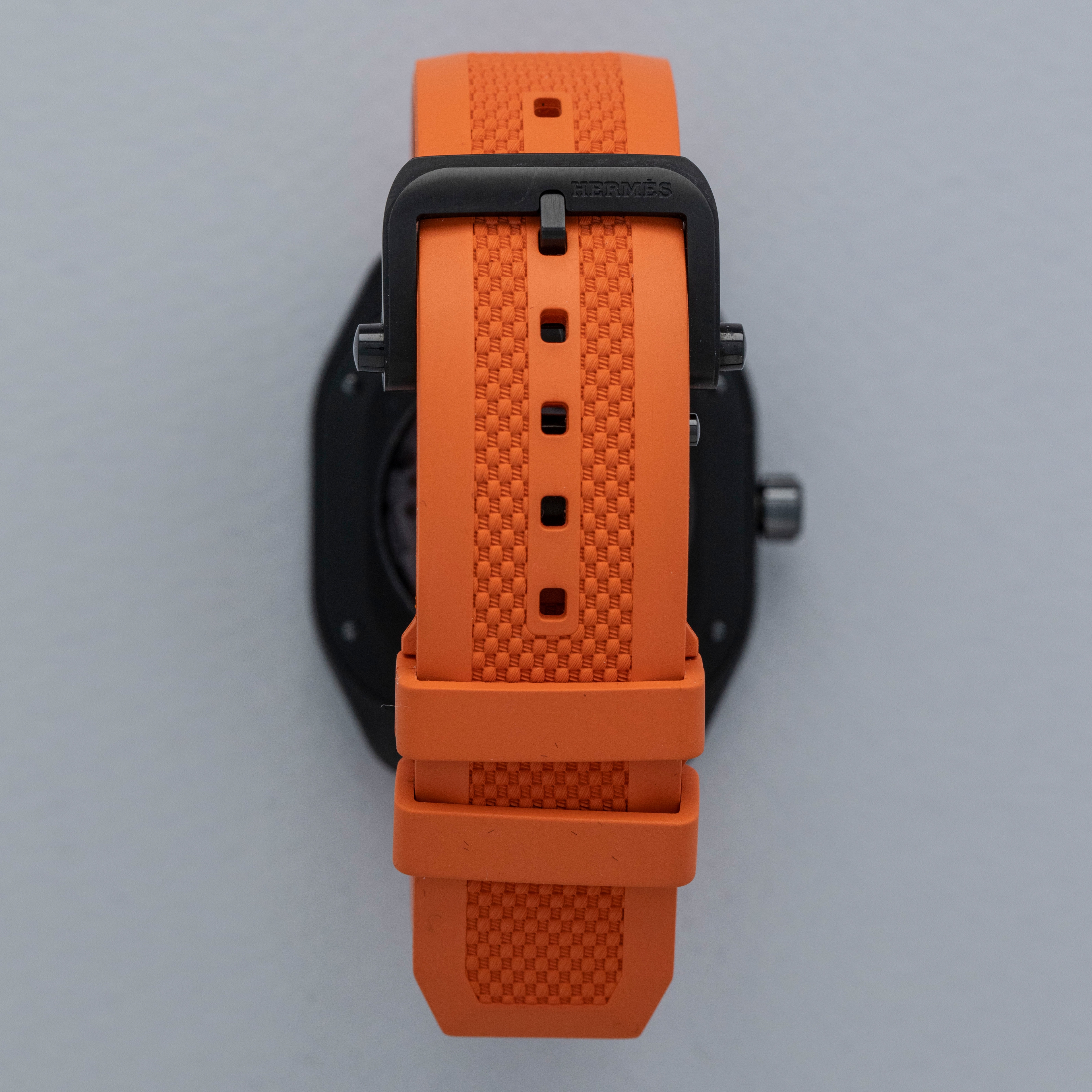 Watch is in overall near-mint condition. The graphite composite case shows a few light signs of wear, while the display case back displays some light surface marks with well-defined engravings around the edge. The dial and hands remain like new. It is fitted with an Hermès orange rubber strap and a black pin buckle, both remaining near mint, and includes a spare black Hermès rubber strap. Comes complete with inner and outer boxes and warranty booklets.