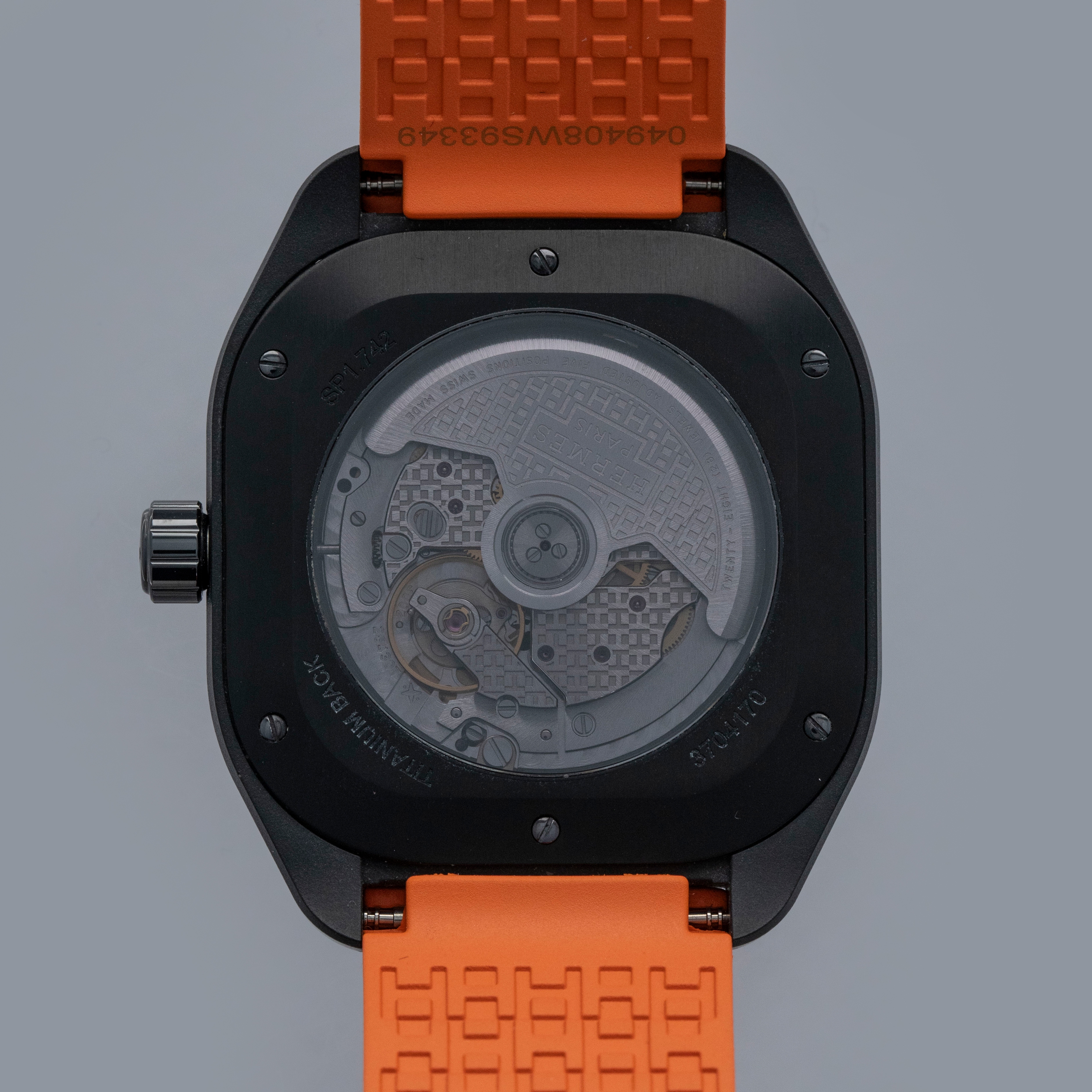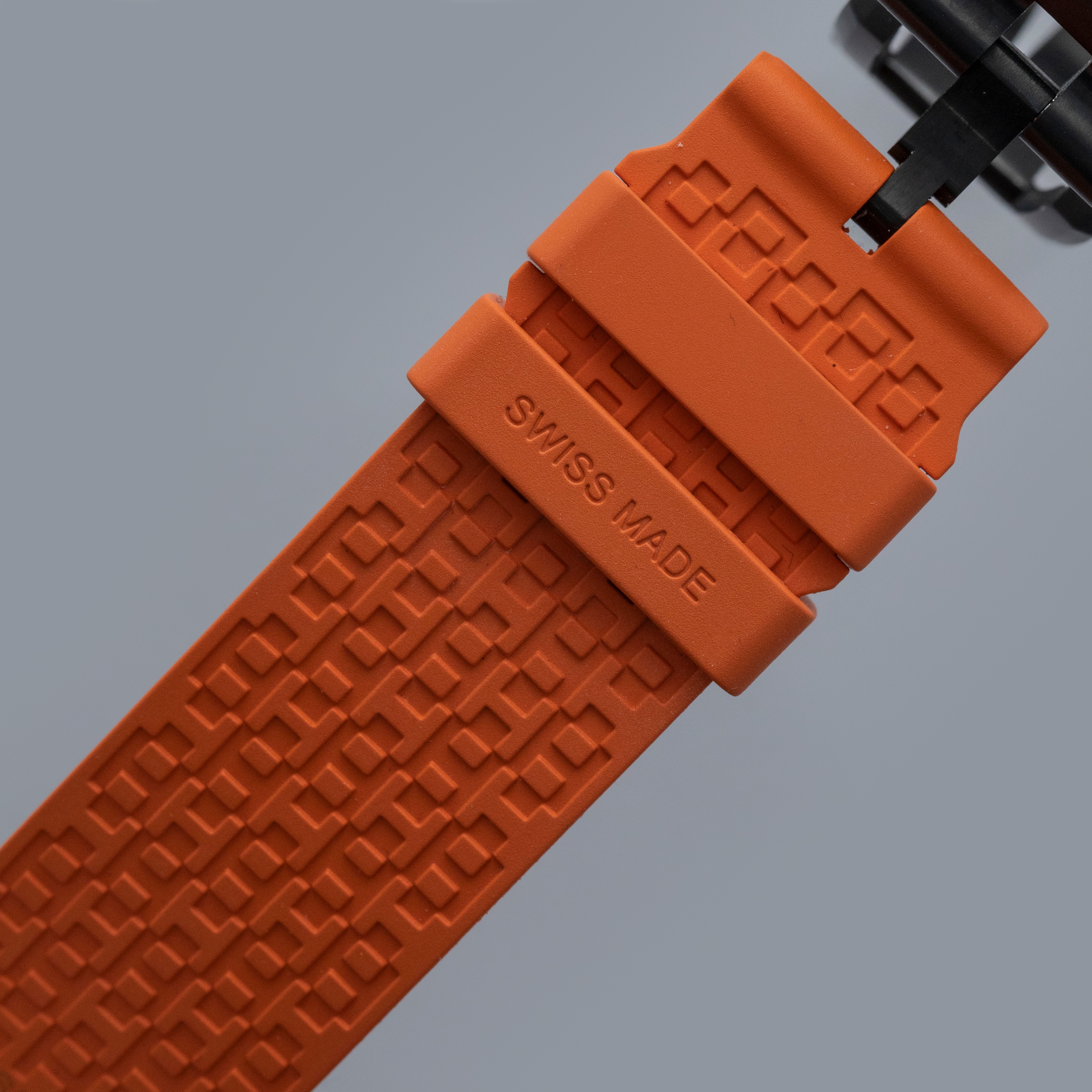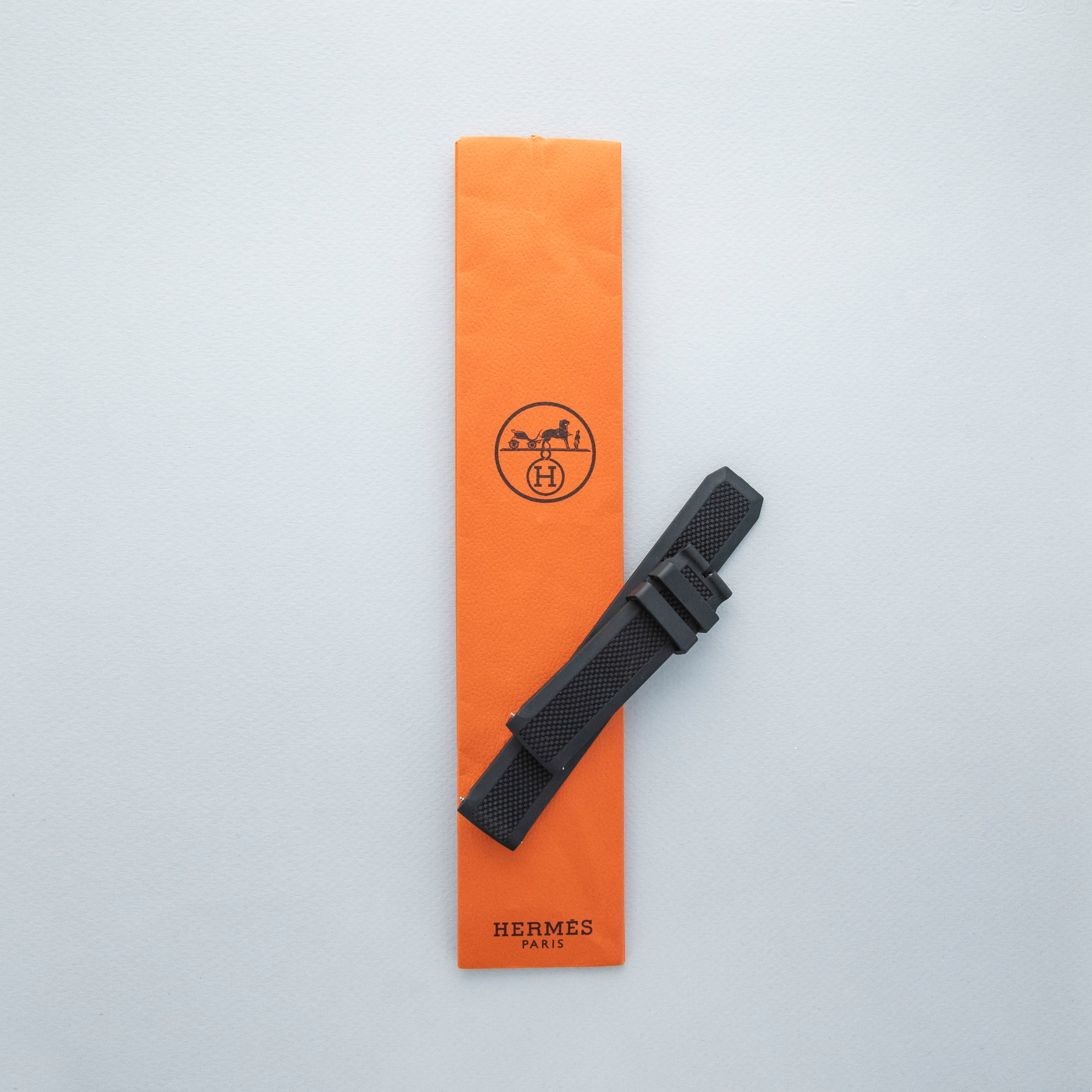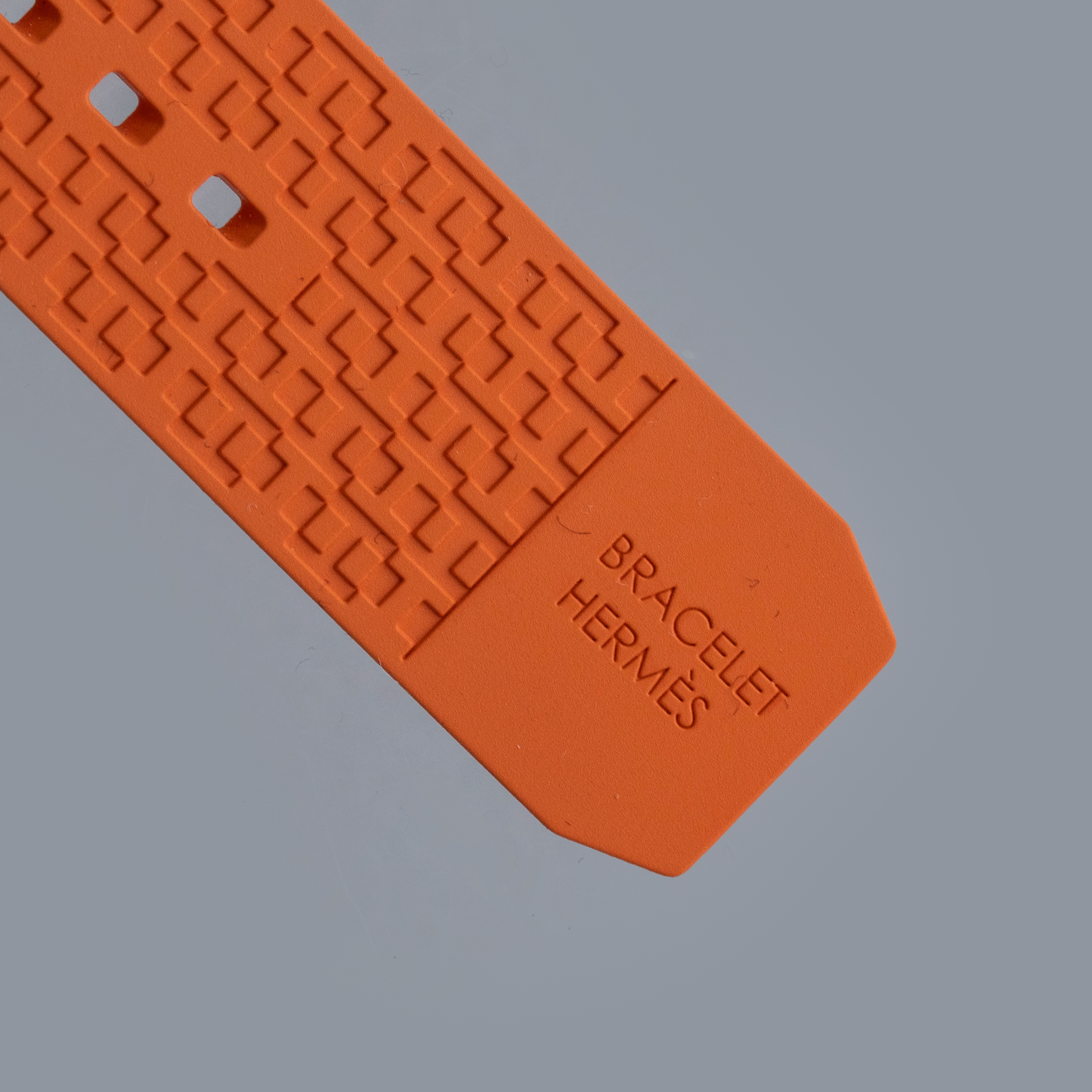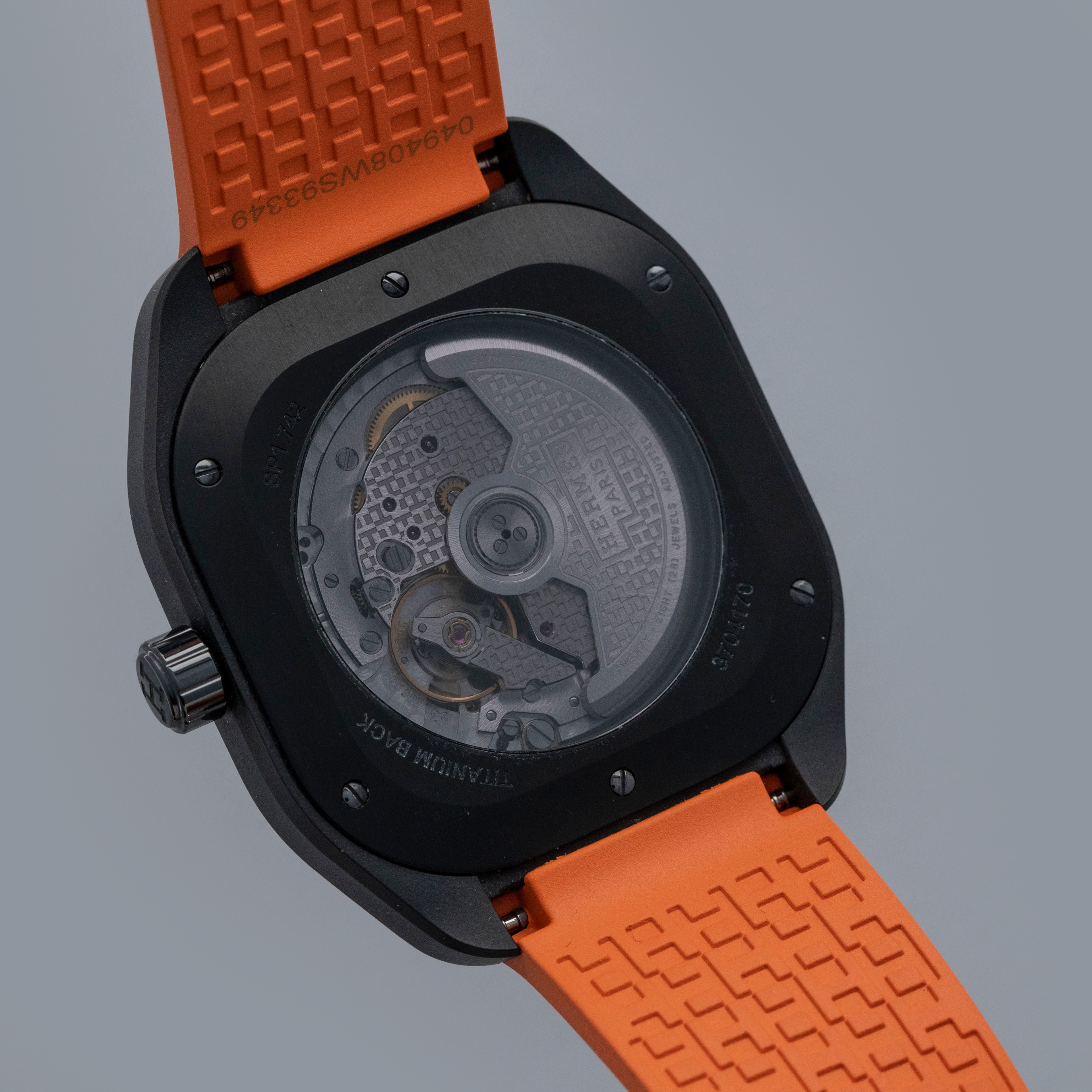 Watch is in overall near-mint condition. The graphite composite case shows a few light signs of wear, while the display case back displays some light surface marks with well-defined engravings around the edge. The dial and hands remain like new. It is fitted with an Hermès orange rubber strap and a black pin buckle, both remaining near mint, and includes a spare black Hermès rubber strap. Comes complete with inner and outer boxes and warranty booklets.