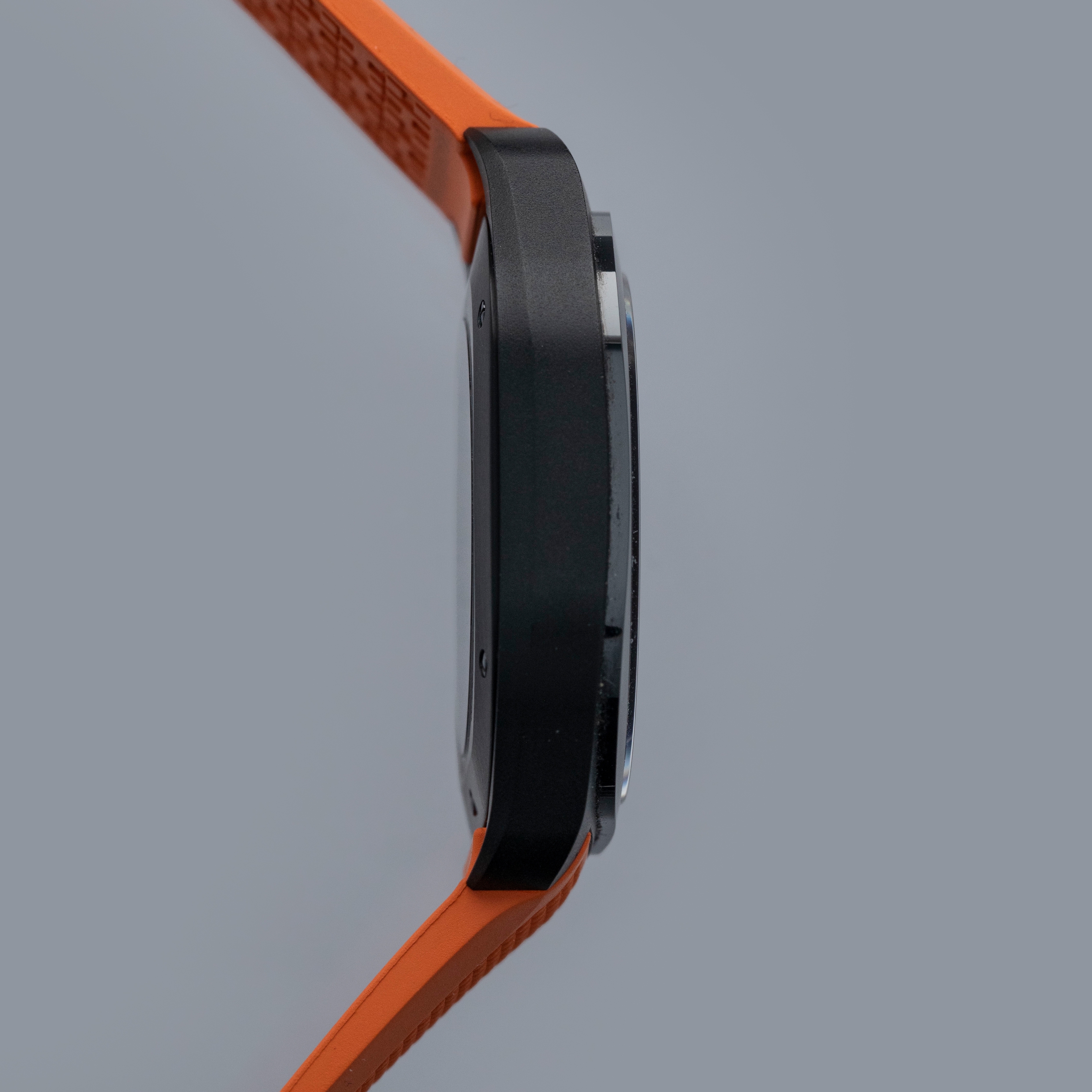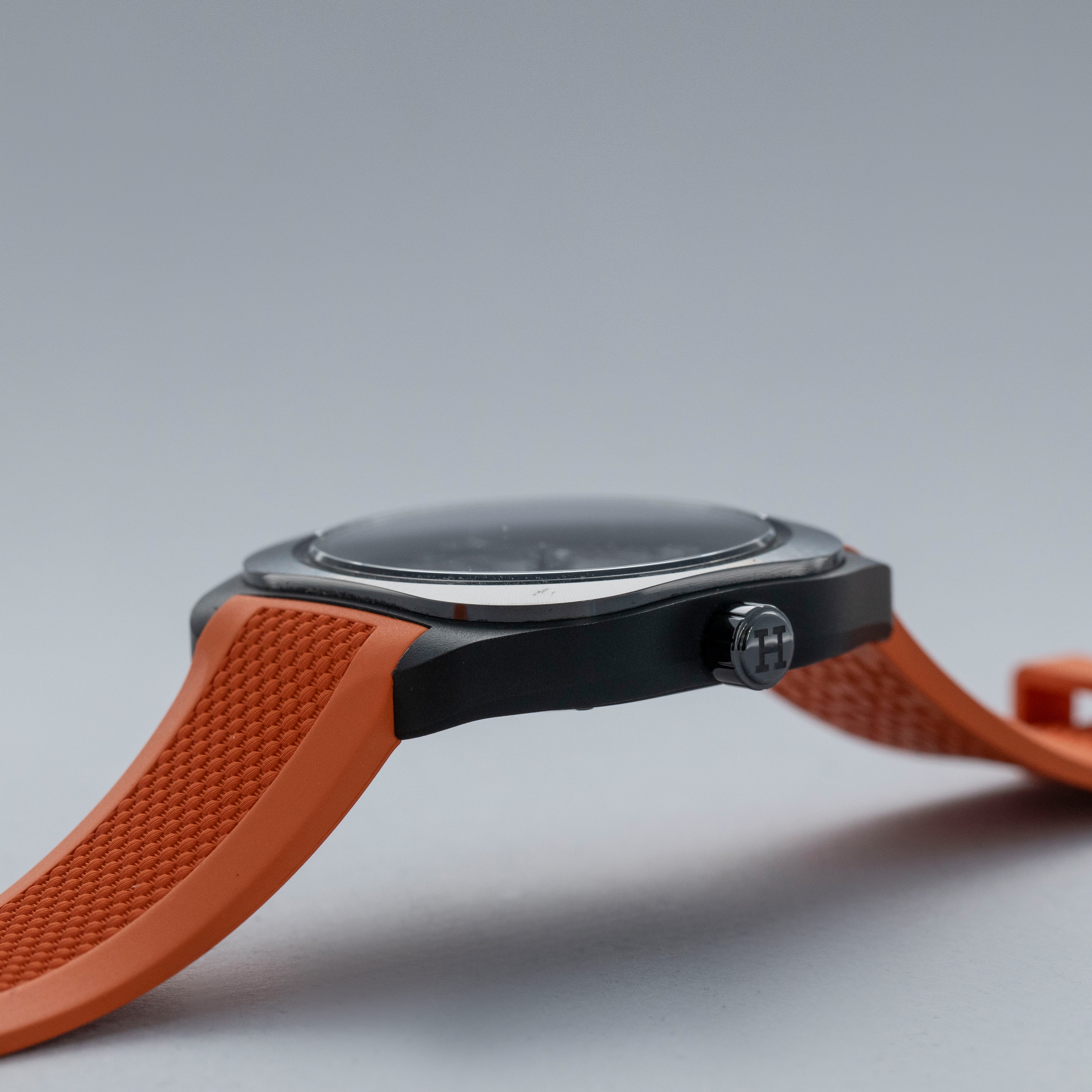Measuring 39mm in diameter and with its slight rectangular profile, the H08's light graphene composite and ceramic case fits comfortably as its rubber strap gently wraps around the wrist.