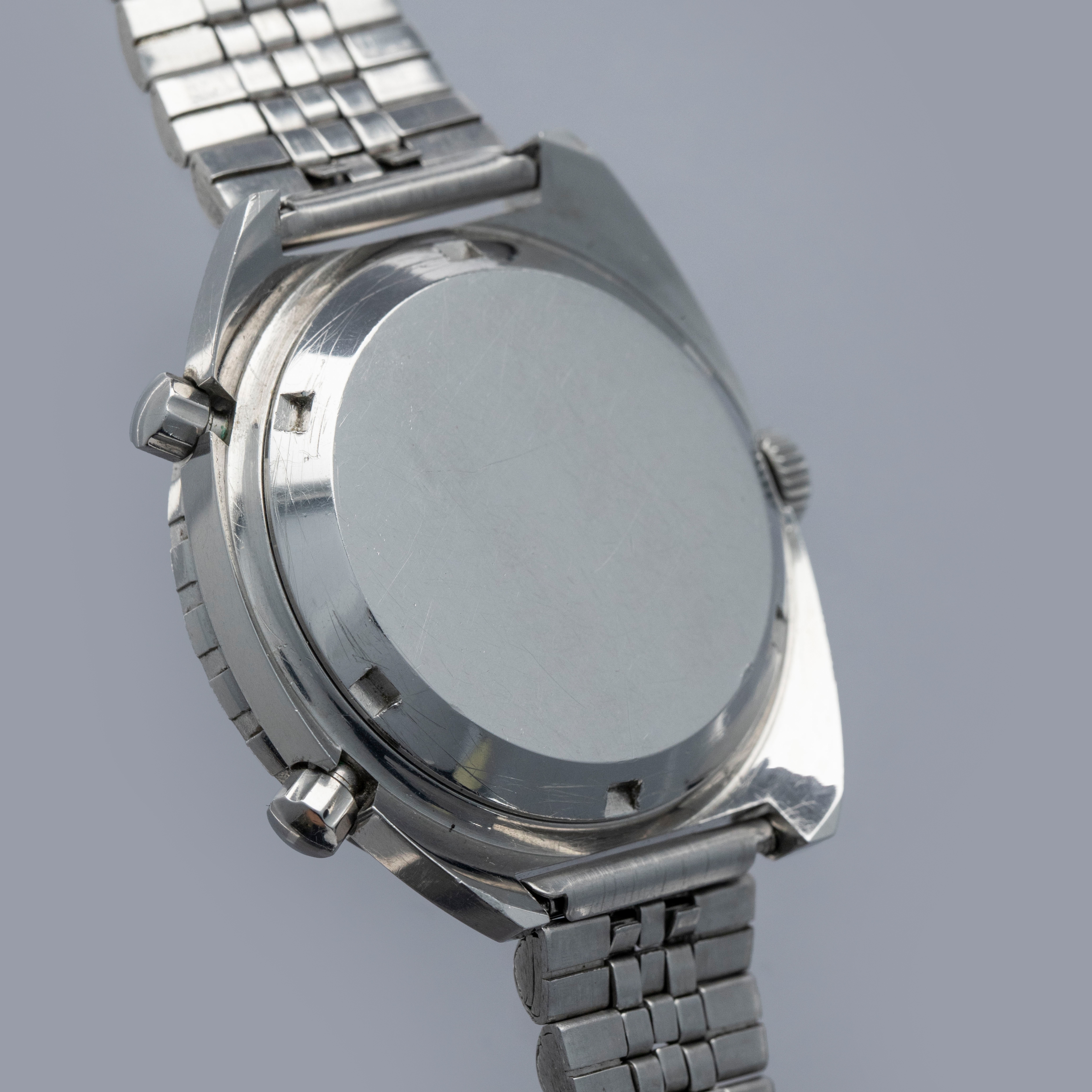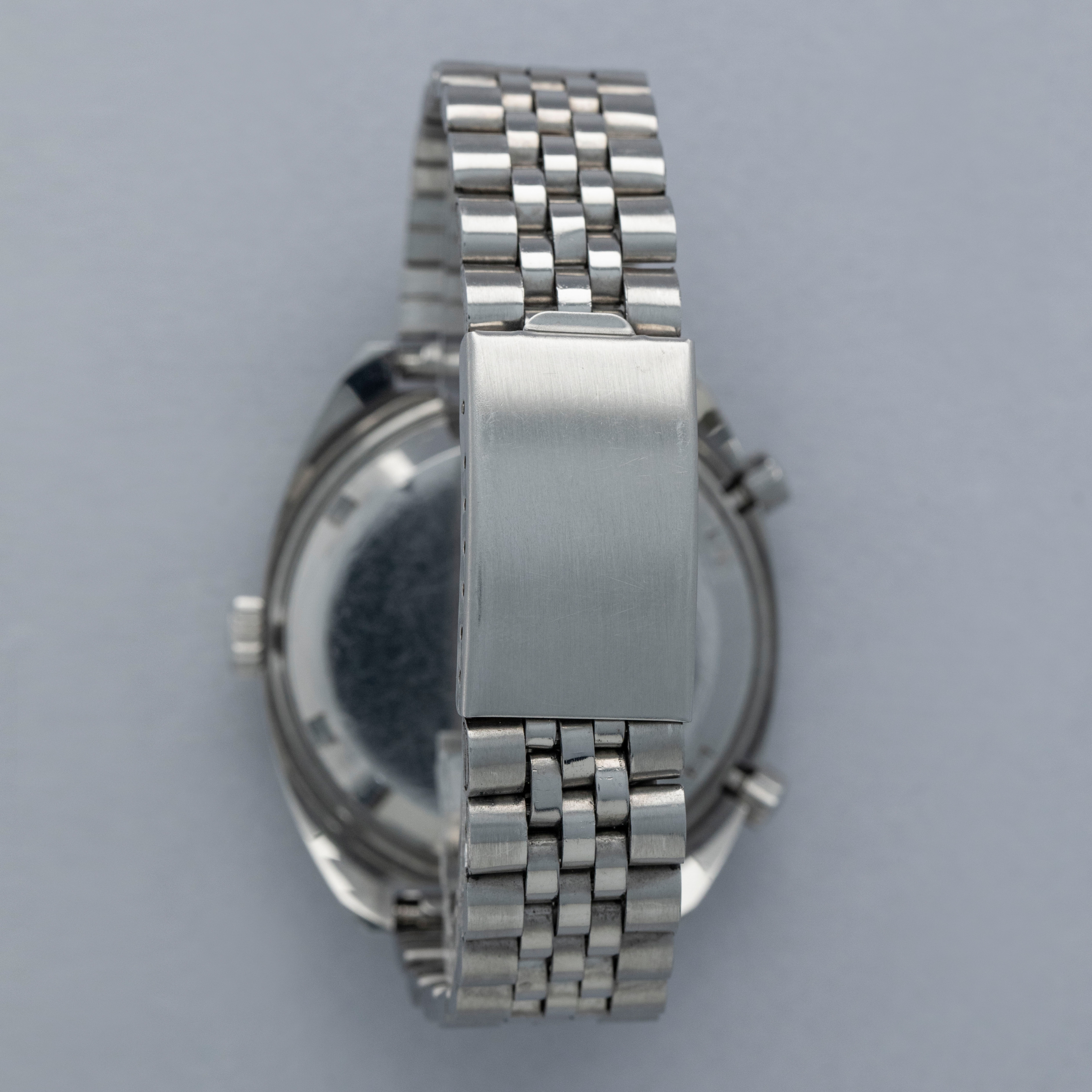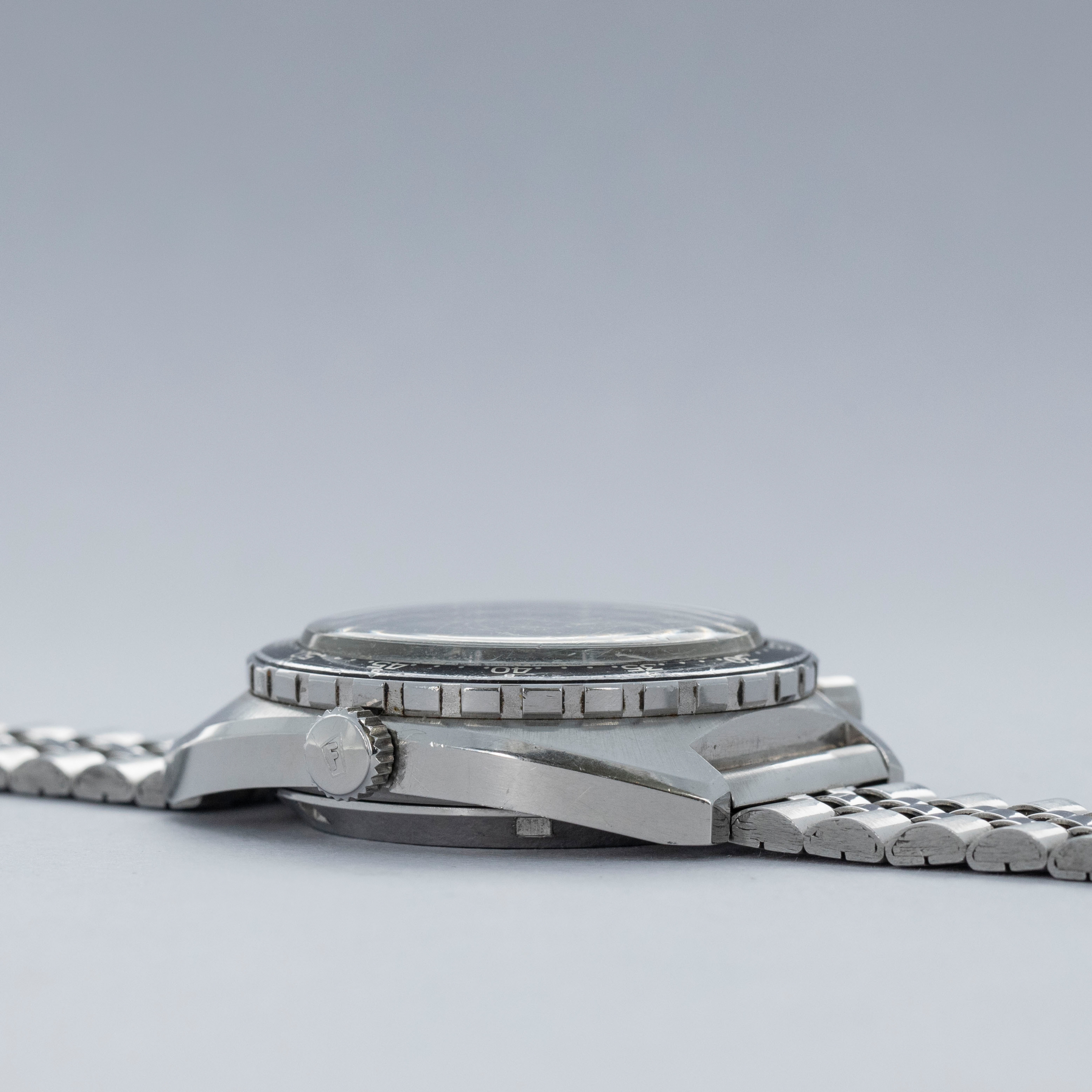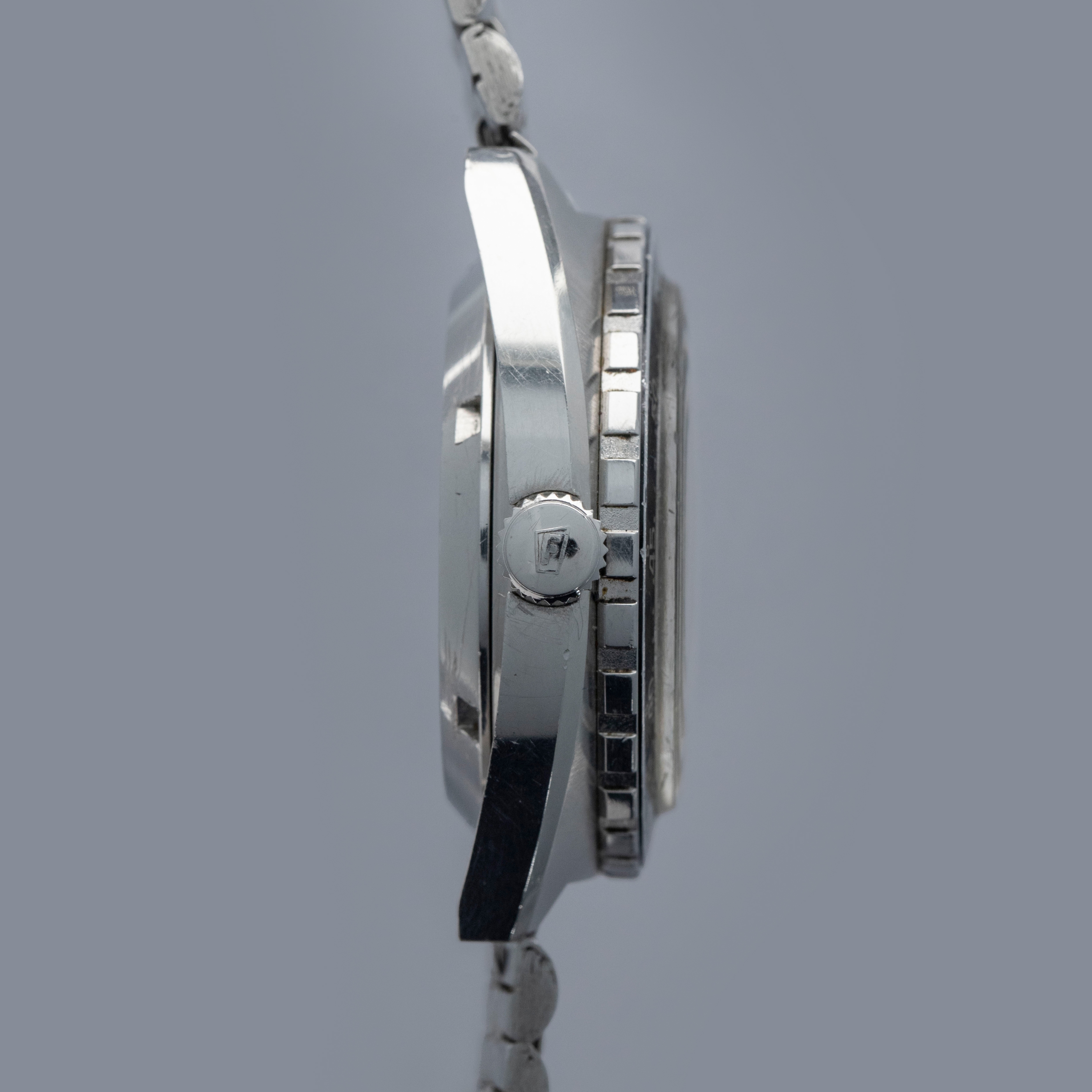 Watch is in overall excellent condition. The steel case shows light surface scratches and marks as expected of a watch of this vintage. The case back has scratches around the outer edge. The hour and minute graduated bezel remains well defined, while the black insert shows surface scratches and wear around the circumference. 1163 Viceroys are typically found with a tachymeter bezel, but some were fitted with the hour minute bezel like this example. The dial and hands remain excellent. The crystal shows scratches and small nicks. It is fitted with a folded five-link steel bracelet showing surface marks and light play between the links. The bracelet is fitted with 19 links and fits approximately a 7½” wrist.