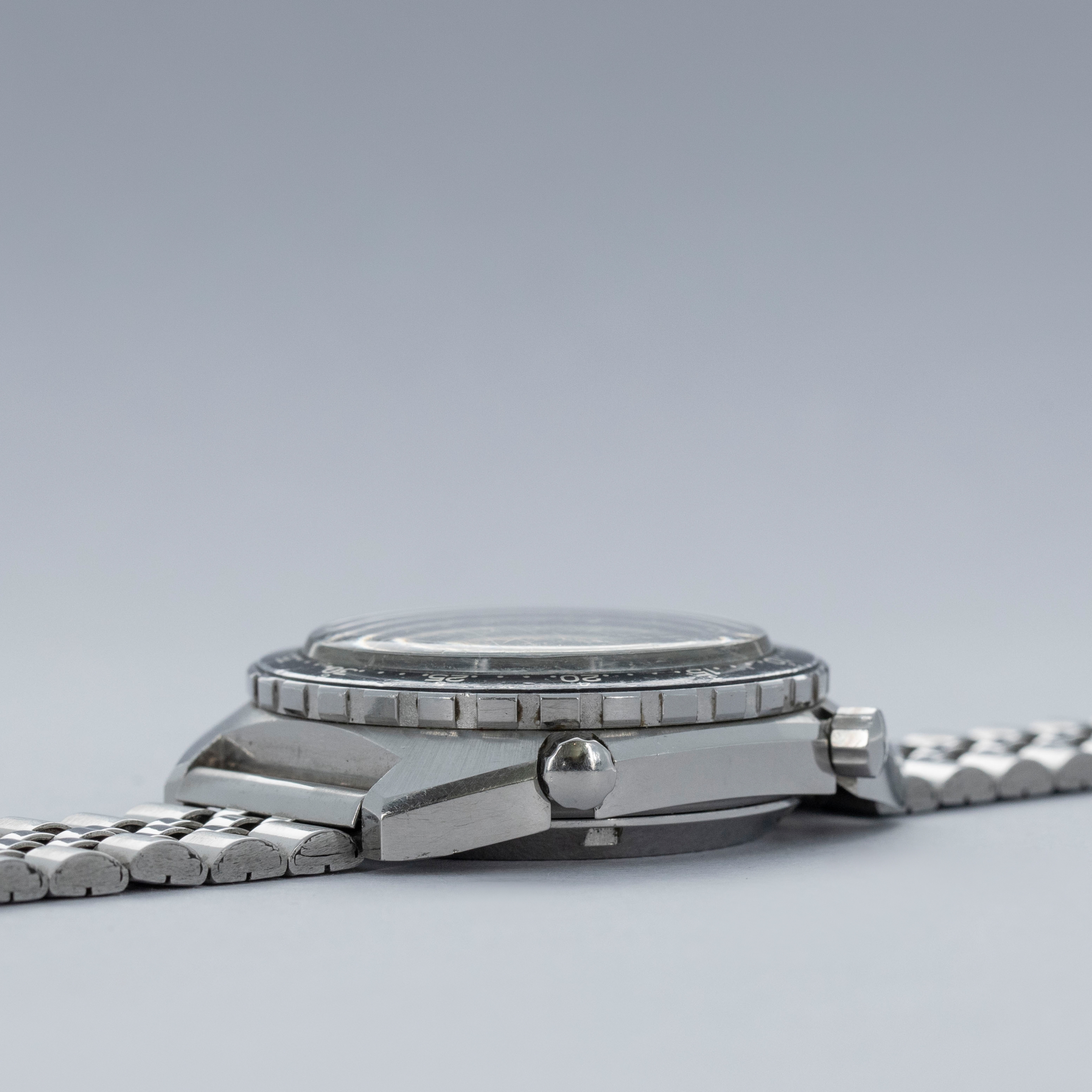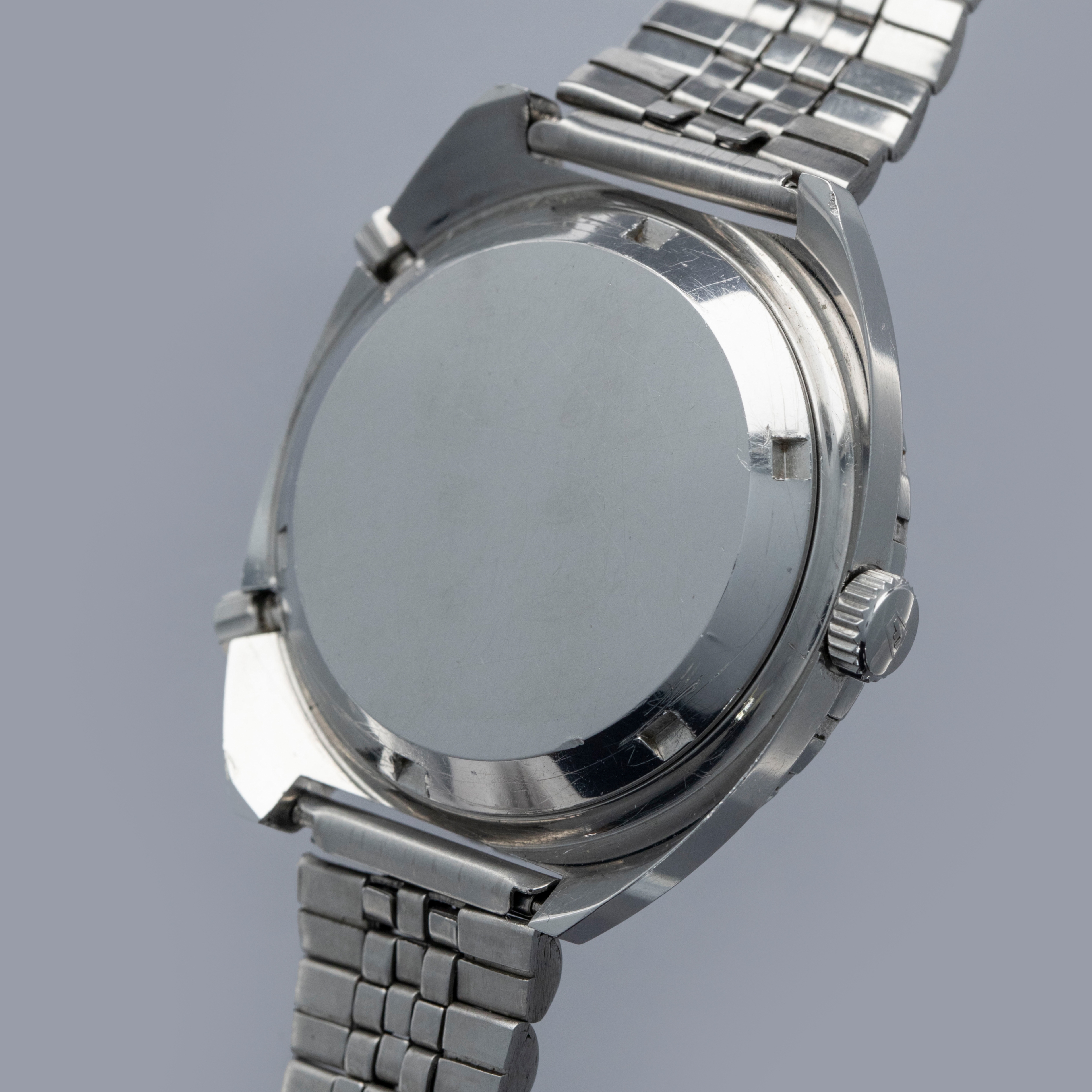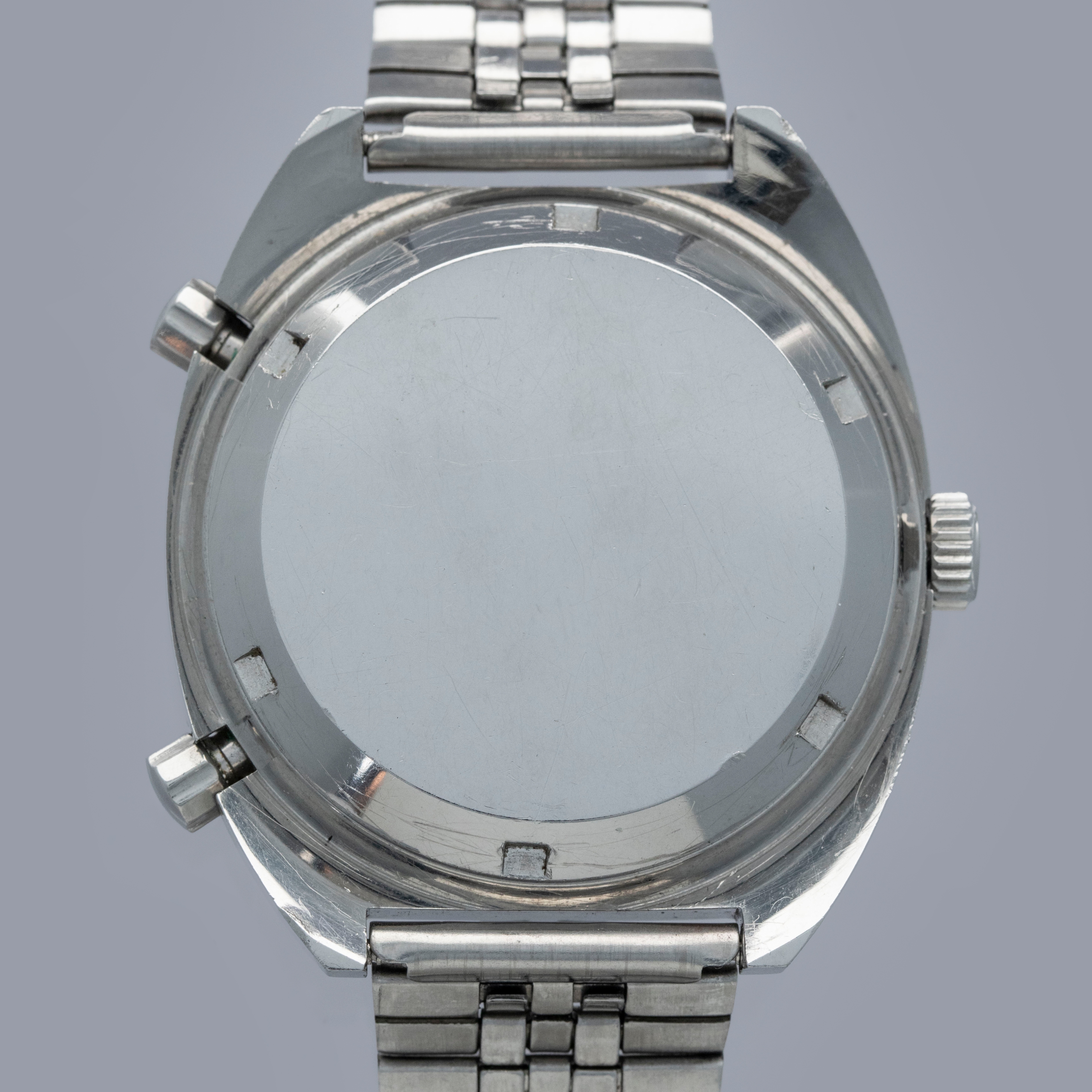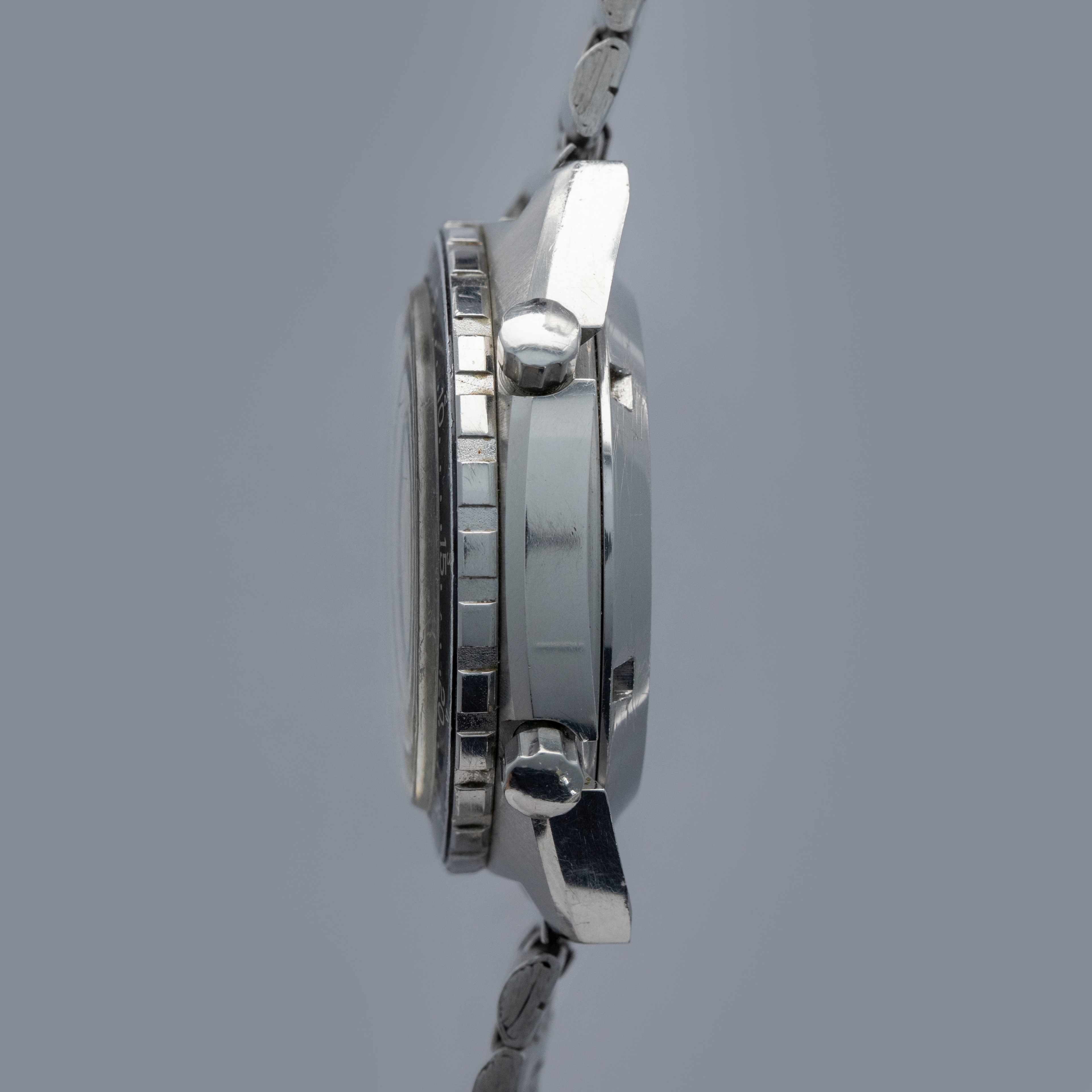 Watch is in overall excellent condition. The steel case shows light surface scratches and marks as expected of a watch of this vintage. The case back has scratches around the outer edge. The hour and minute graduated bezel remains well defined, while the black insert shows surface scratches and wear around the circumference. 1163 Viceroys are typically found with a tachymeter bezel, but some were fitted with the hour minute bezel like this example. The dial and hands remain excellent. The crystal shows scratches and small nicks. It is fitted with a folded five-link steel bracelet showing surface marks and light play between the links. The bracelet is fitted with 19 links and fits approximately a 7½” wrist.