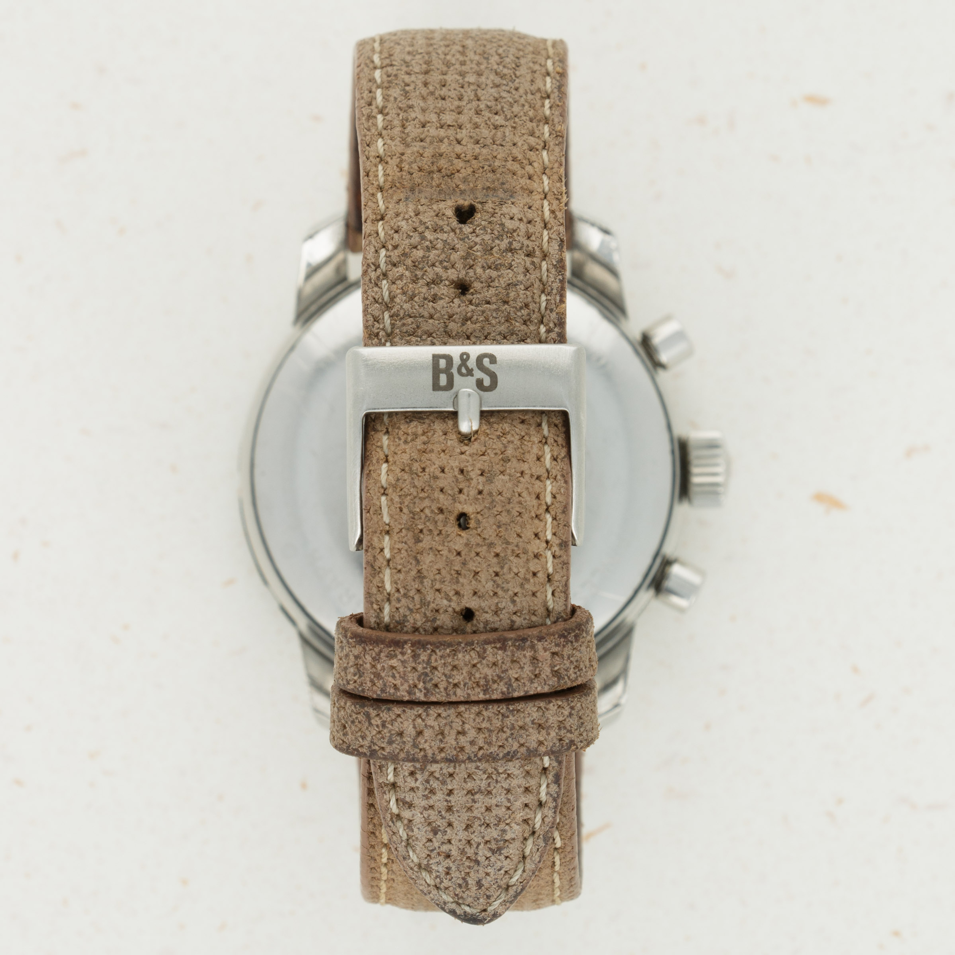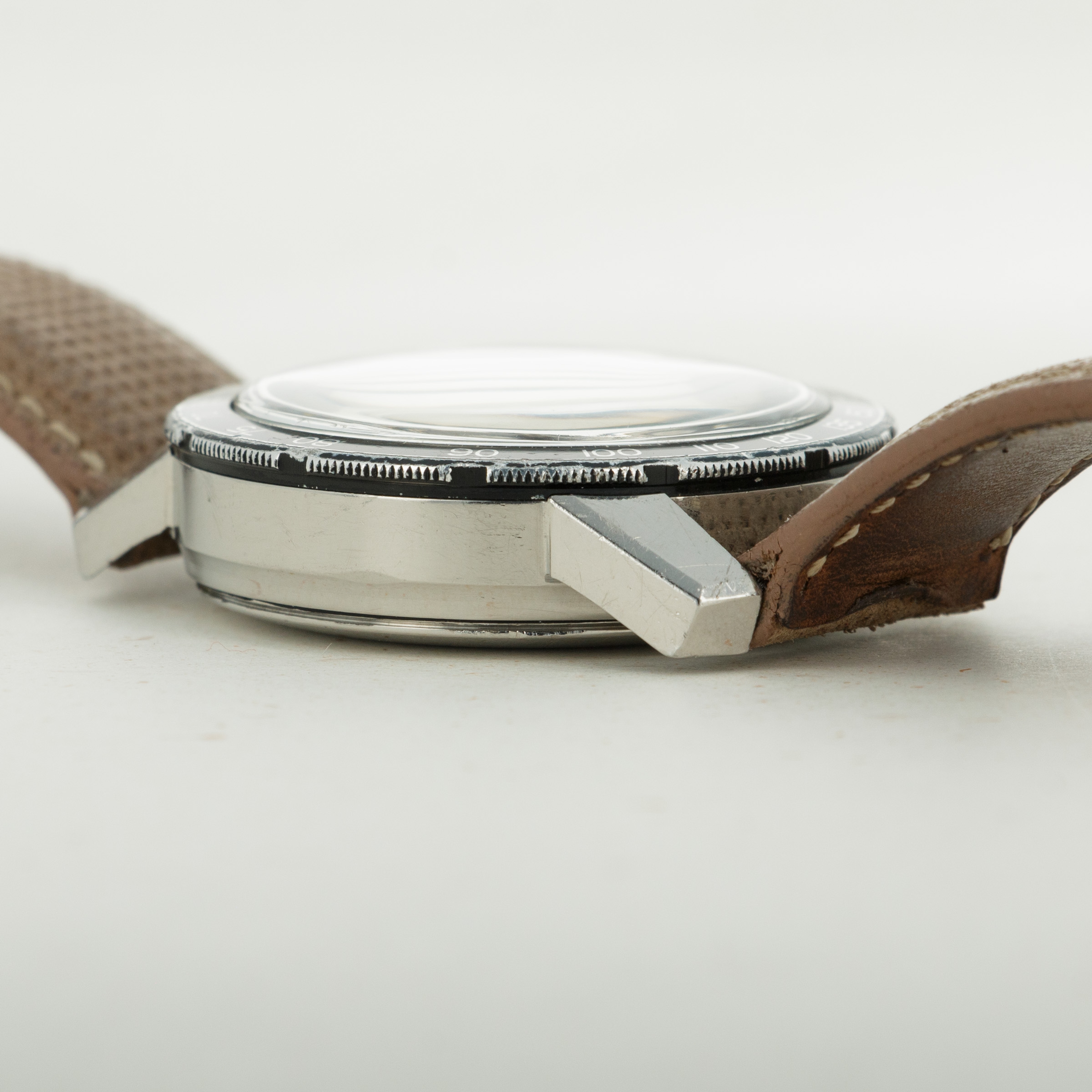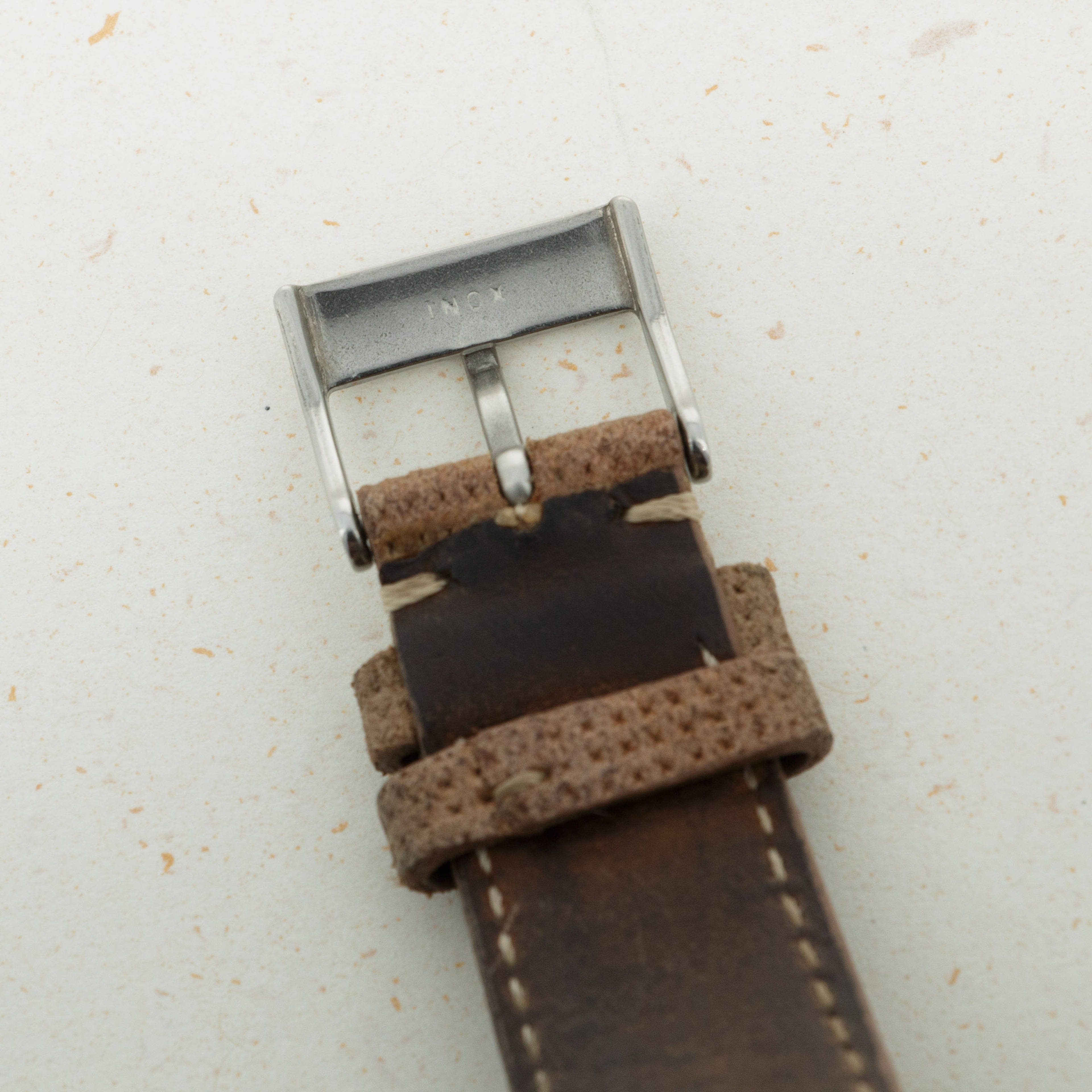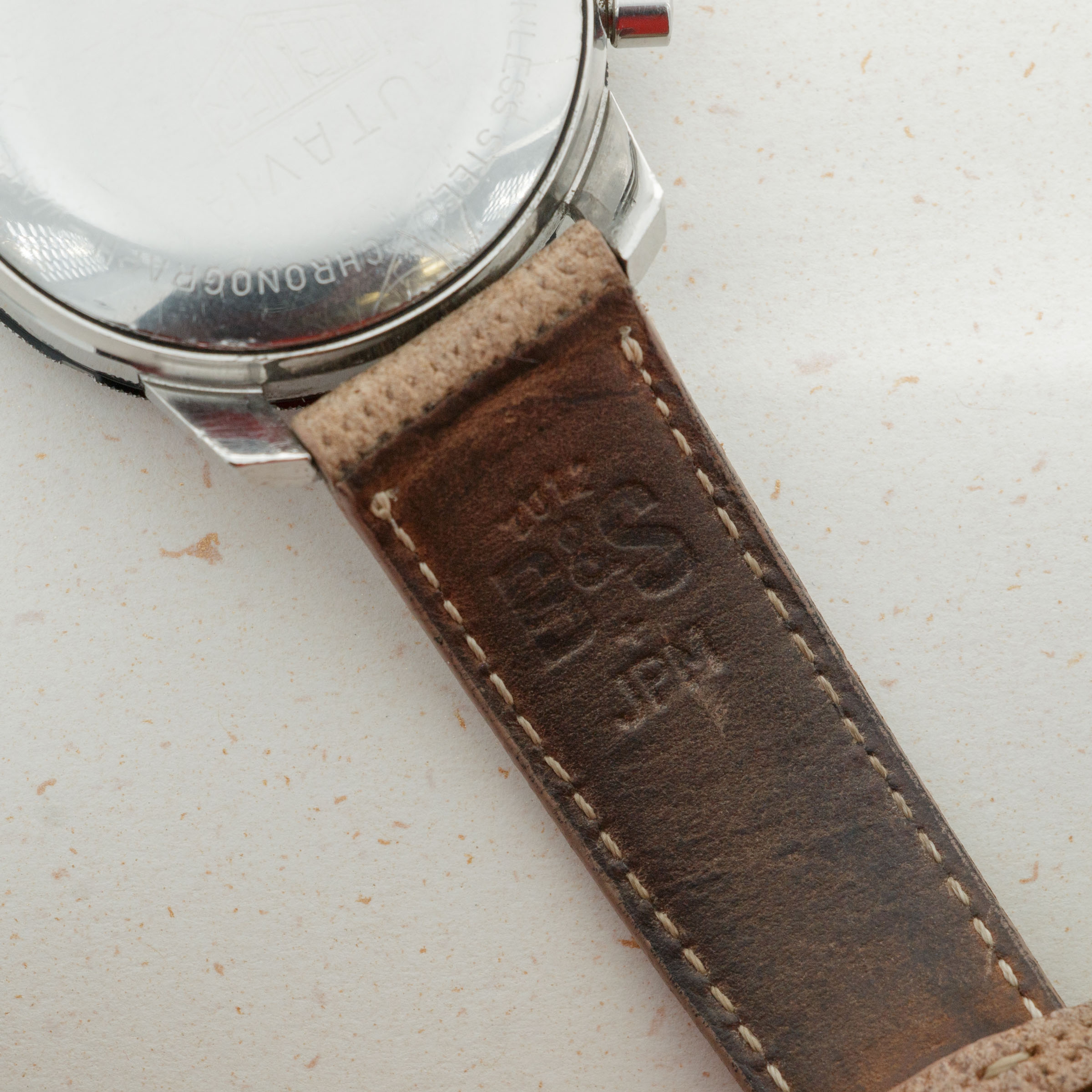 Overall condition of the watch is very good. The rare tachometer bezel has some surface abrasions along the edge. Dial appears to be untouched, with nice matching luminous on the indexes and a few minor imperfections. Case is sharp and all engravings on the caseback are worn but still visible, including the serial number. Strap and buckle are from Bulang and Sons.