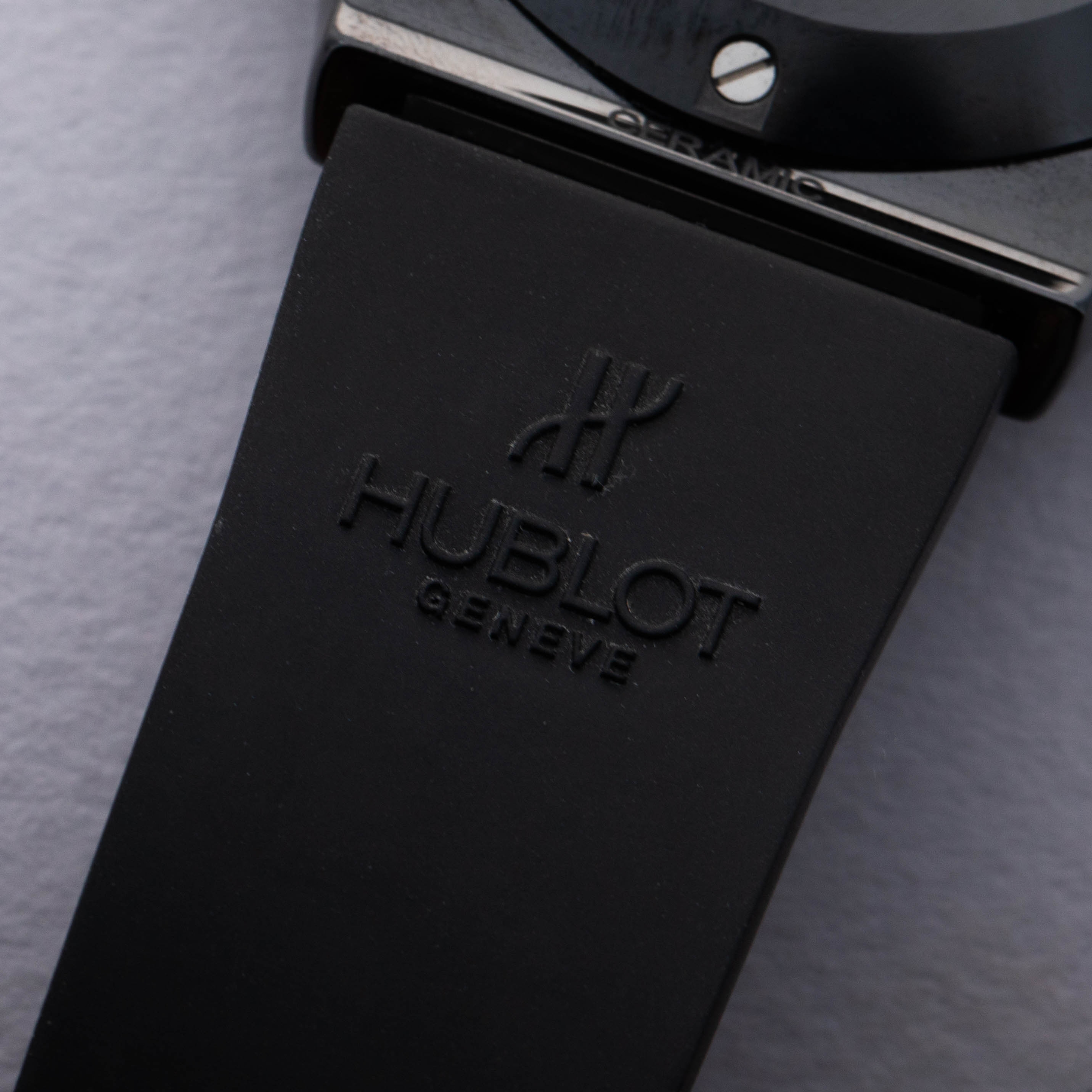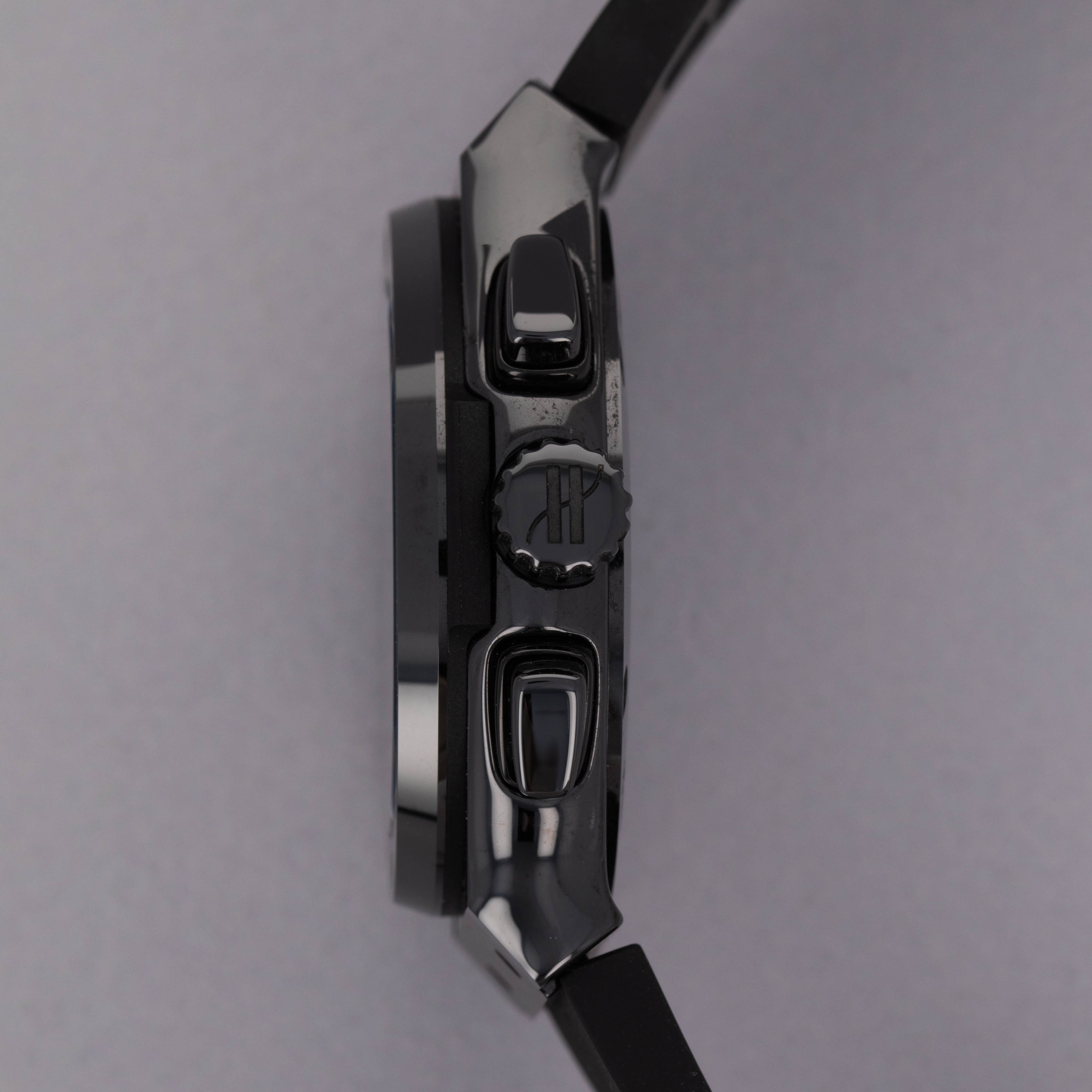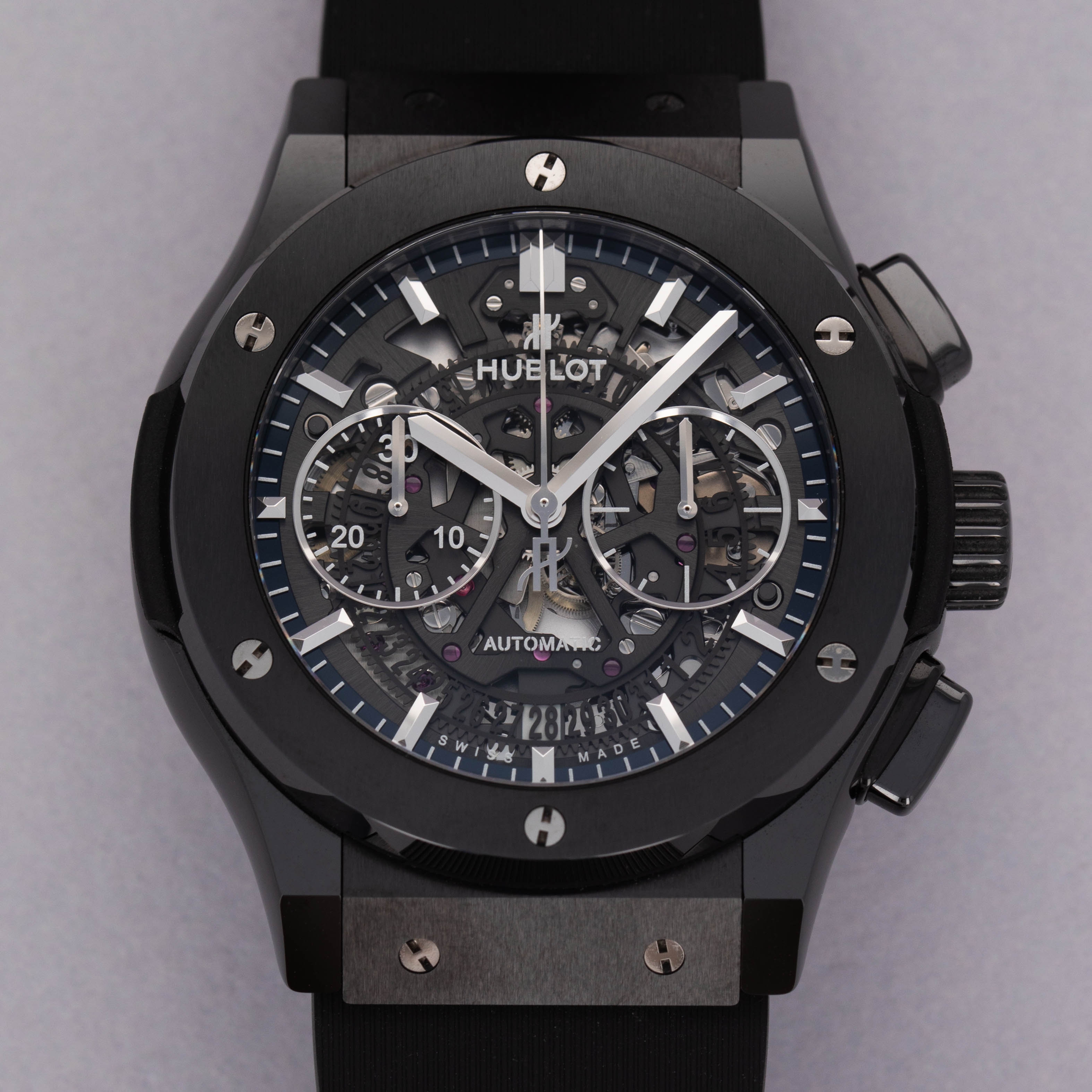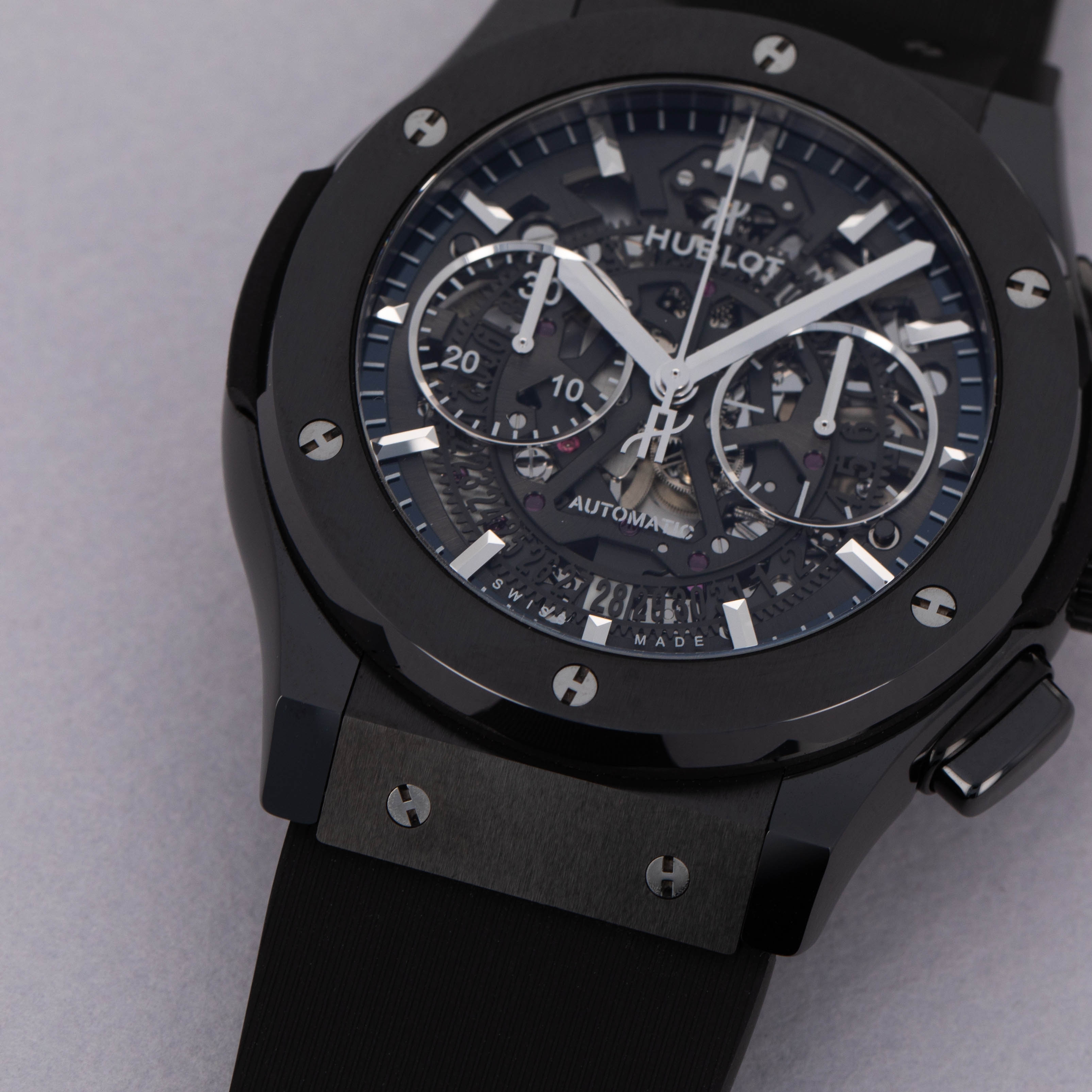 A striking blend of modern design and technical mastery, the Hublot Classic Fusion Aerofusion Ceramic ref. 525.CM.0170.RX is sleek black ceramic take on Hublot’s signature offering, the Classic Fusion. Launched in 2016 and offering a refined, stealthy look that’s both durable and lightweight, this timepiece is perfect for those who appreciate a watch that stands out without shouting. Boasting a blacked-out skeletonized dial that reveals the inner workings of its, also blacked-out, automatic chronograph cal. HUB1155 movement, the Classic Fusion Aerofusion seamlessly blends avant garde design and horological engineering. Offering unique presence on the wrist without being overwhelming, the Classic Fusion Aerofusion Ceramic’s 45mm case size sits confidently on the wrist thanks to its commanding silhouette, however, with the blacked-out color combination of its ceramic case and rubber strap it wears smaller than one might assume from its dimensions. Perfectly capturing Hublot’s ethos of being a bold, innovative, and undeniably stylish watchmaker, the Classic Fusion Aerofusion Ceramic is a statement piece that commands attention, as per Hublot’s raison d'etre