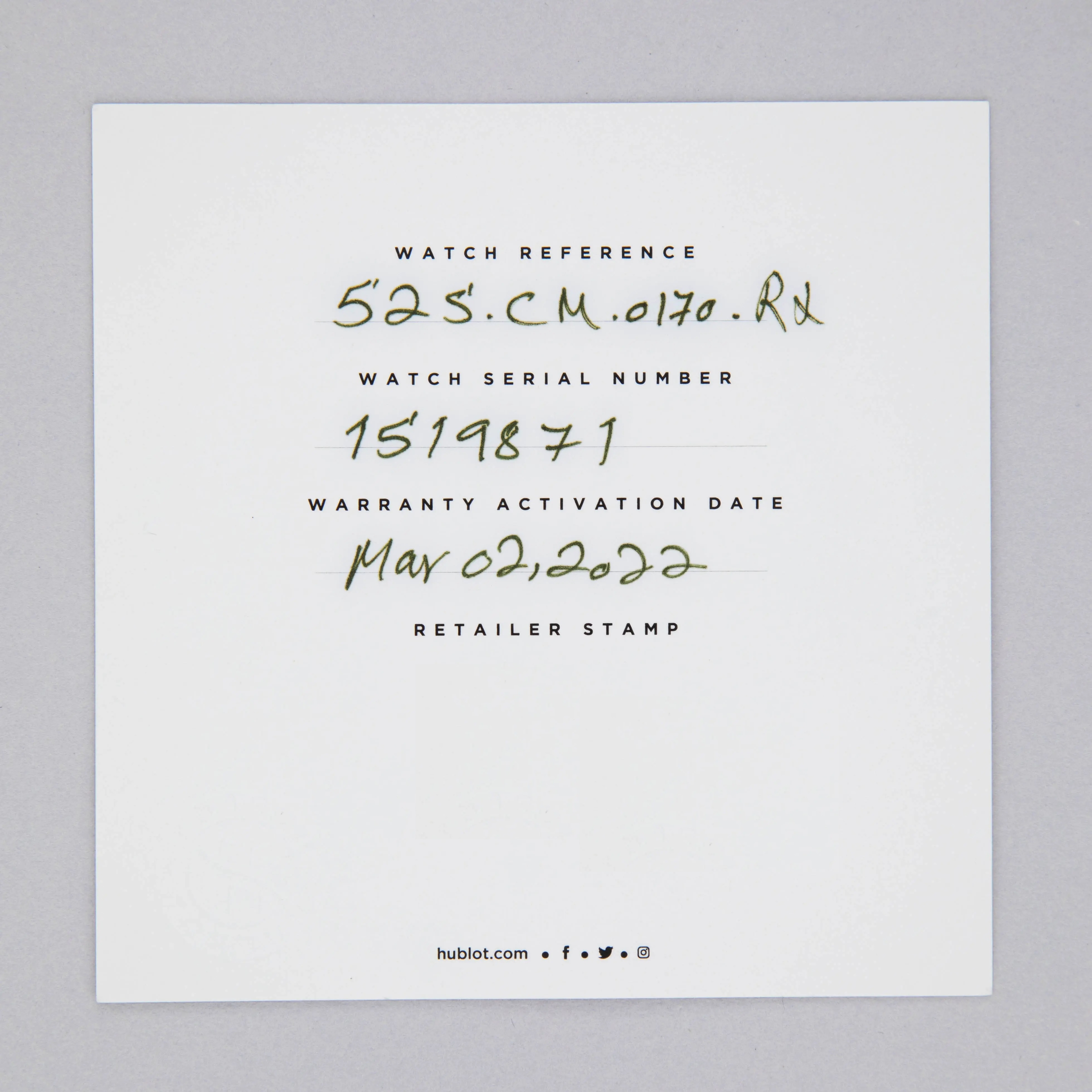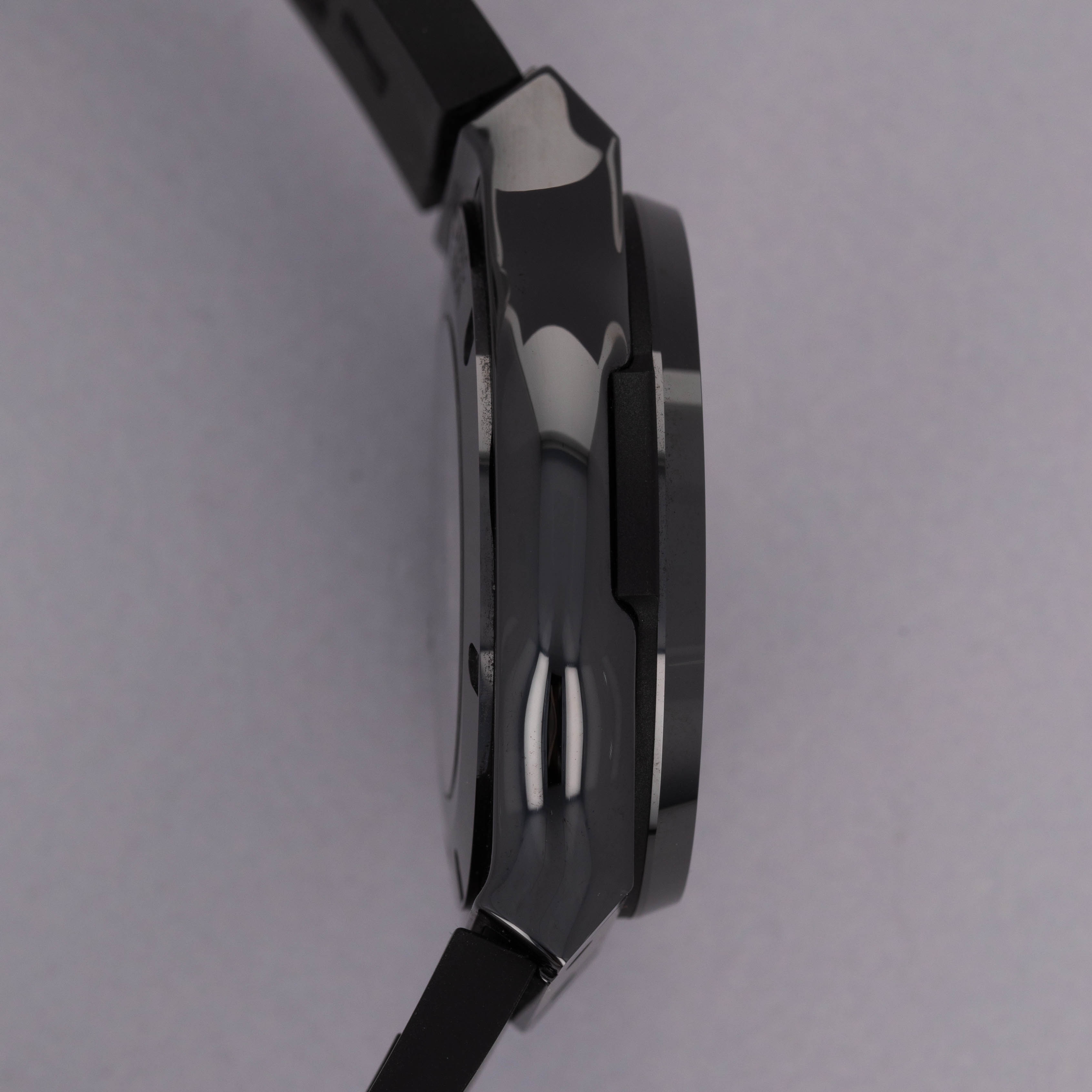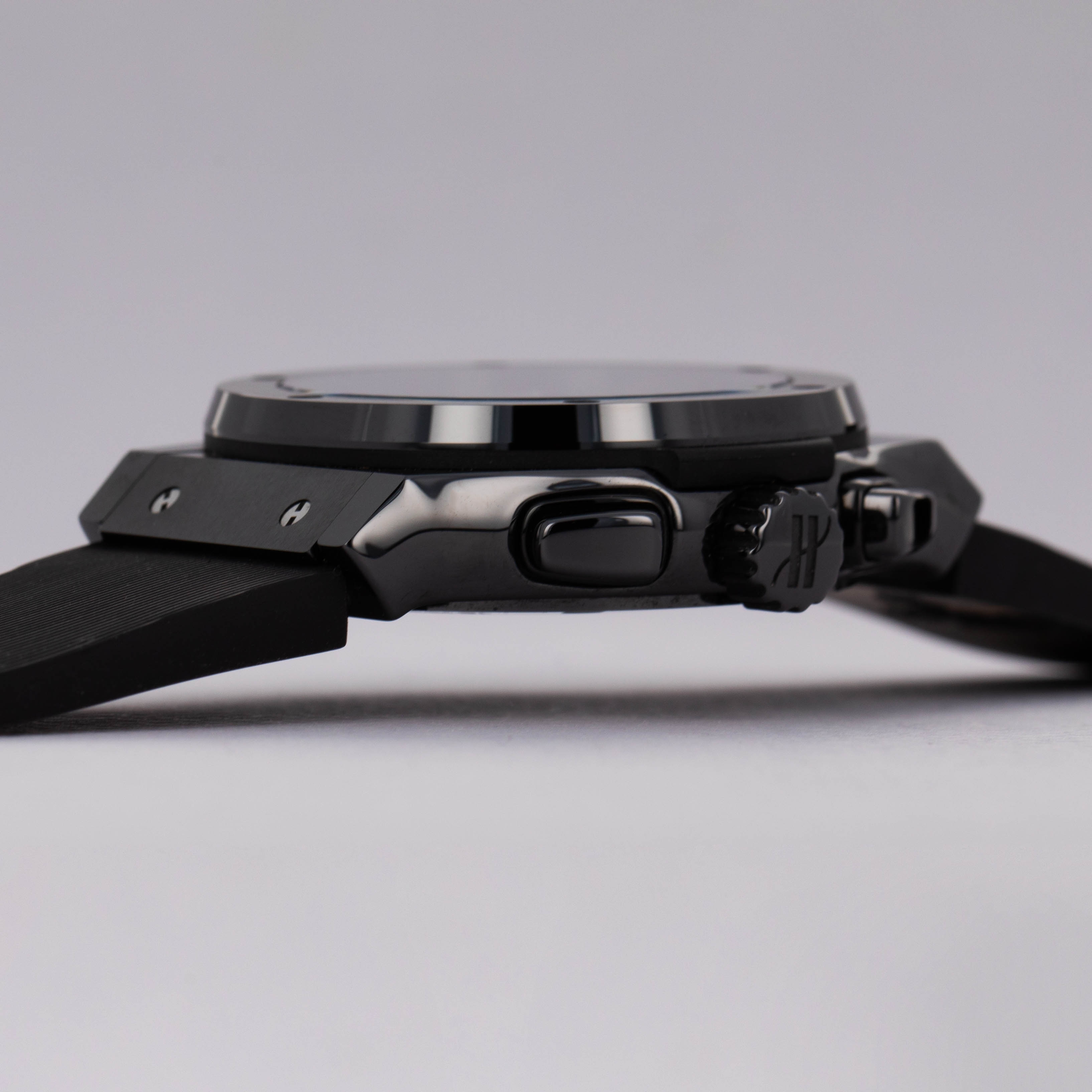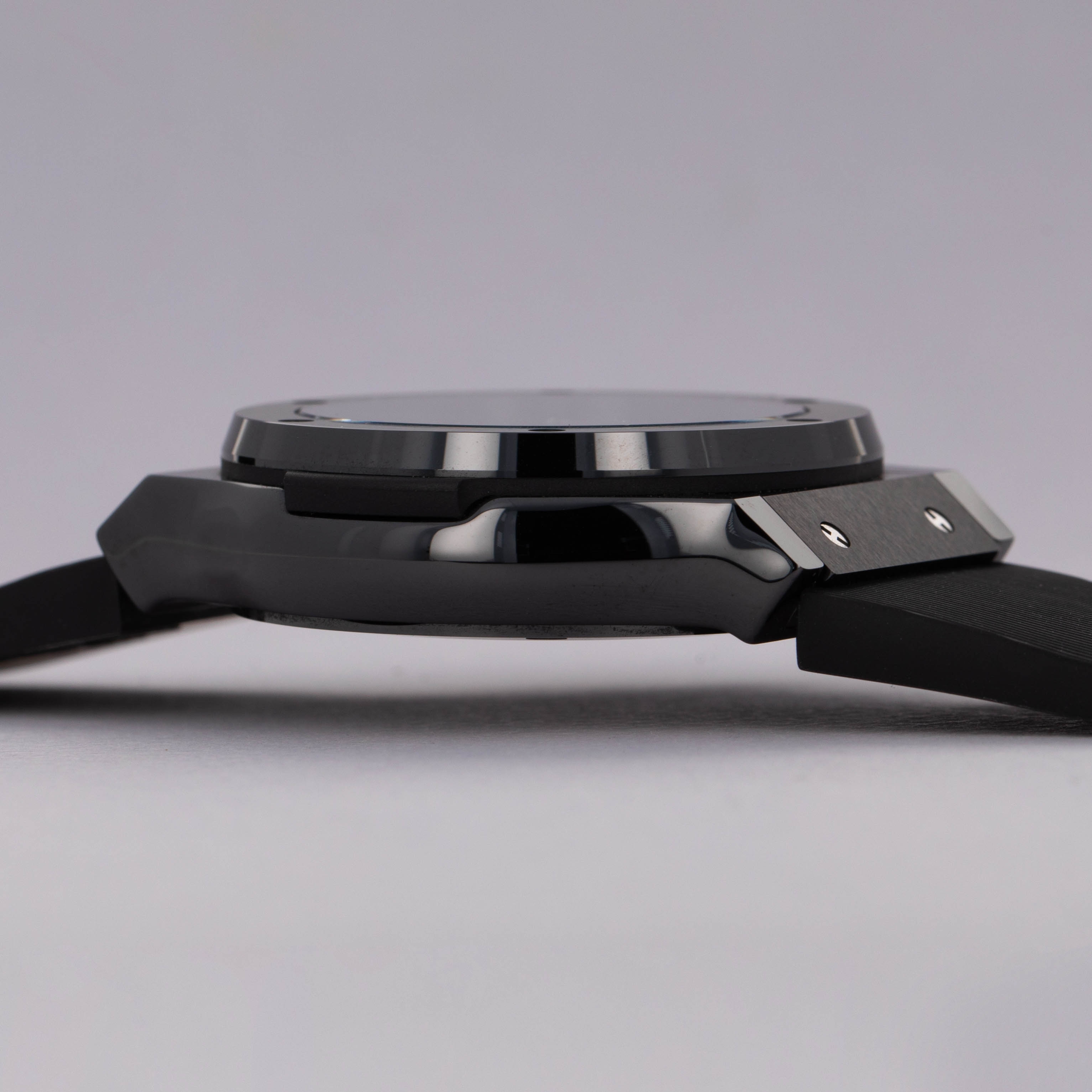 A striking blend of modern design and technical mastery, the Hublot Classic Fusion Aerofusion Ceramic ref. 525.CM.0170.RX is sleek black ceramic take on Hublot’s signature offering, the Classic Fusion. Launched in 2016 and offering a refined, stealthy look that’s both durable and lightweight, this timepiece is perfect for those who appreciate a watch that stands out without shouting. Boasting a blacked-out skeletonized dial that reveals the inner workings of its, also blacked-out, automatic chronograph cal. HUB1155 movement, the Classic Fusion Aerofusion seamlessly blends avant garde design and horological engineering. Offering unique presence on the wrist without being overwhelming, the Classic Fusion Aerofusion Ceramic’s 45mm case size sits confidently on the wrist thanks to its commanding silhouette, however, with the blacked-out color combination of its ceramic case and rubber strap it wears smaller than one might assume from its dimensions. Perfectly capturing Hublot’s ethos of being a bold, innovative, and undeniably stylish watchmaker, the Classic Fusion Aerofusion Ceramic is a statement piece that commands attention, as per Hublot’s raison d'etre
