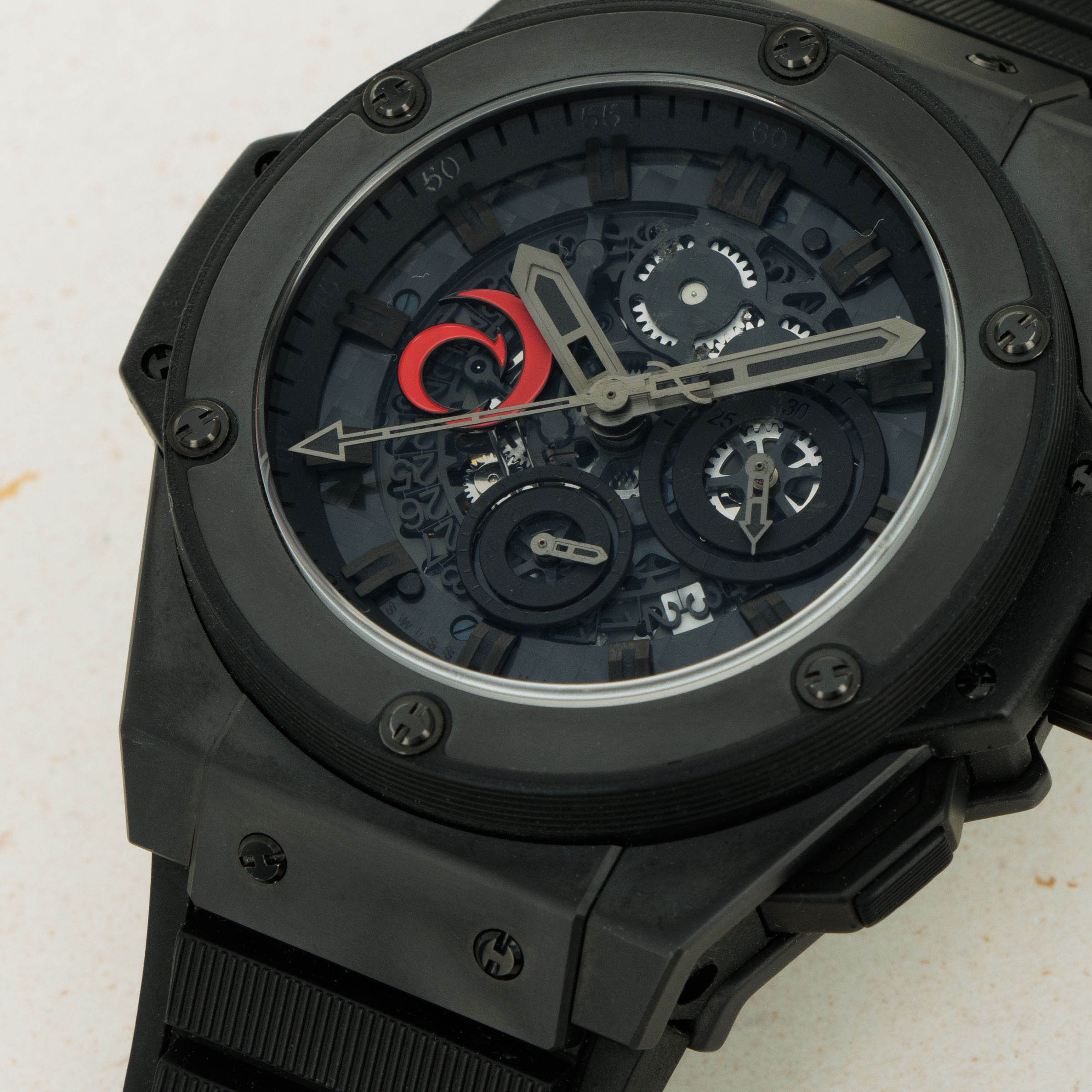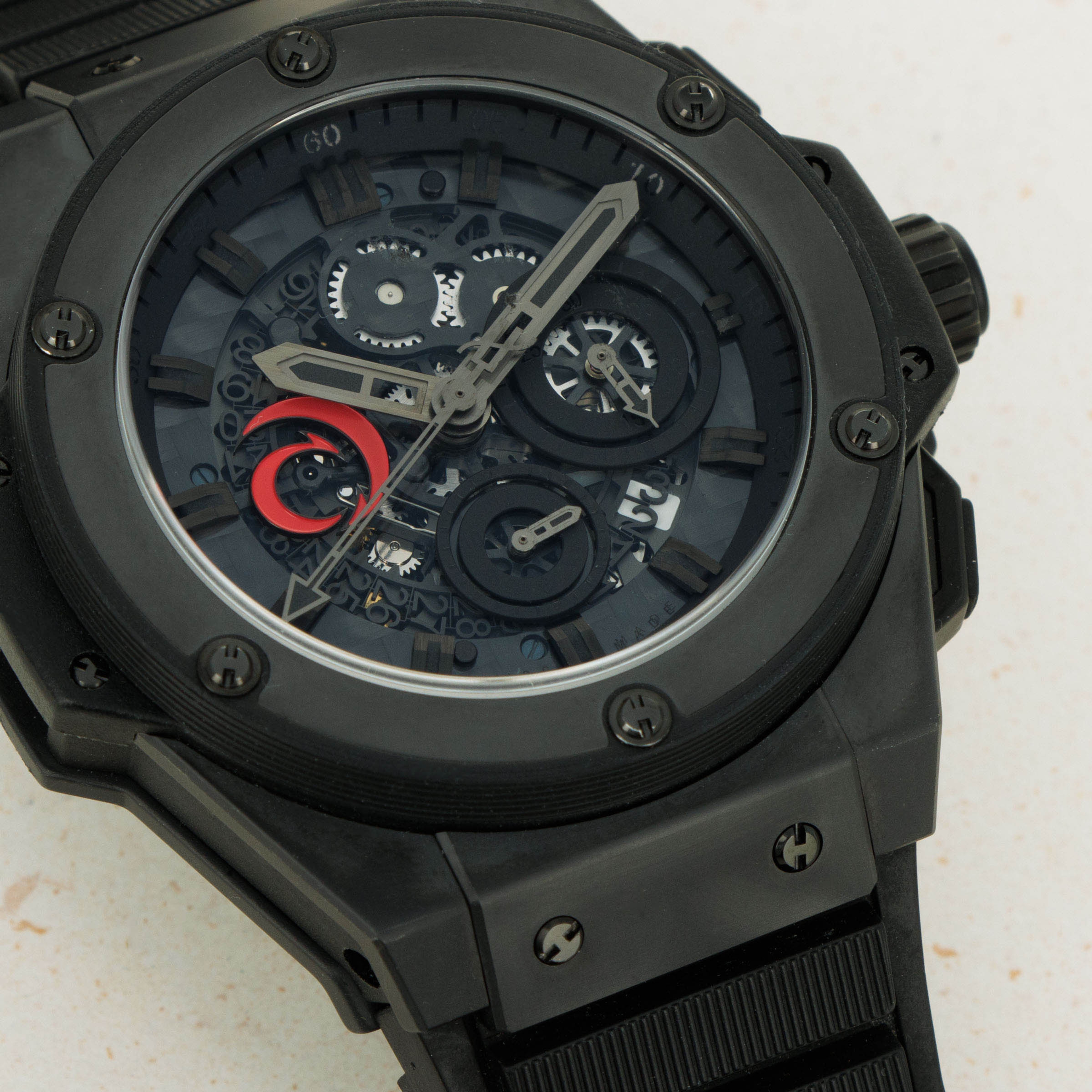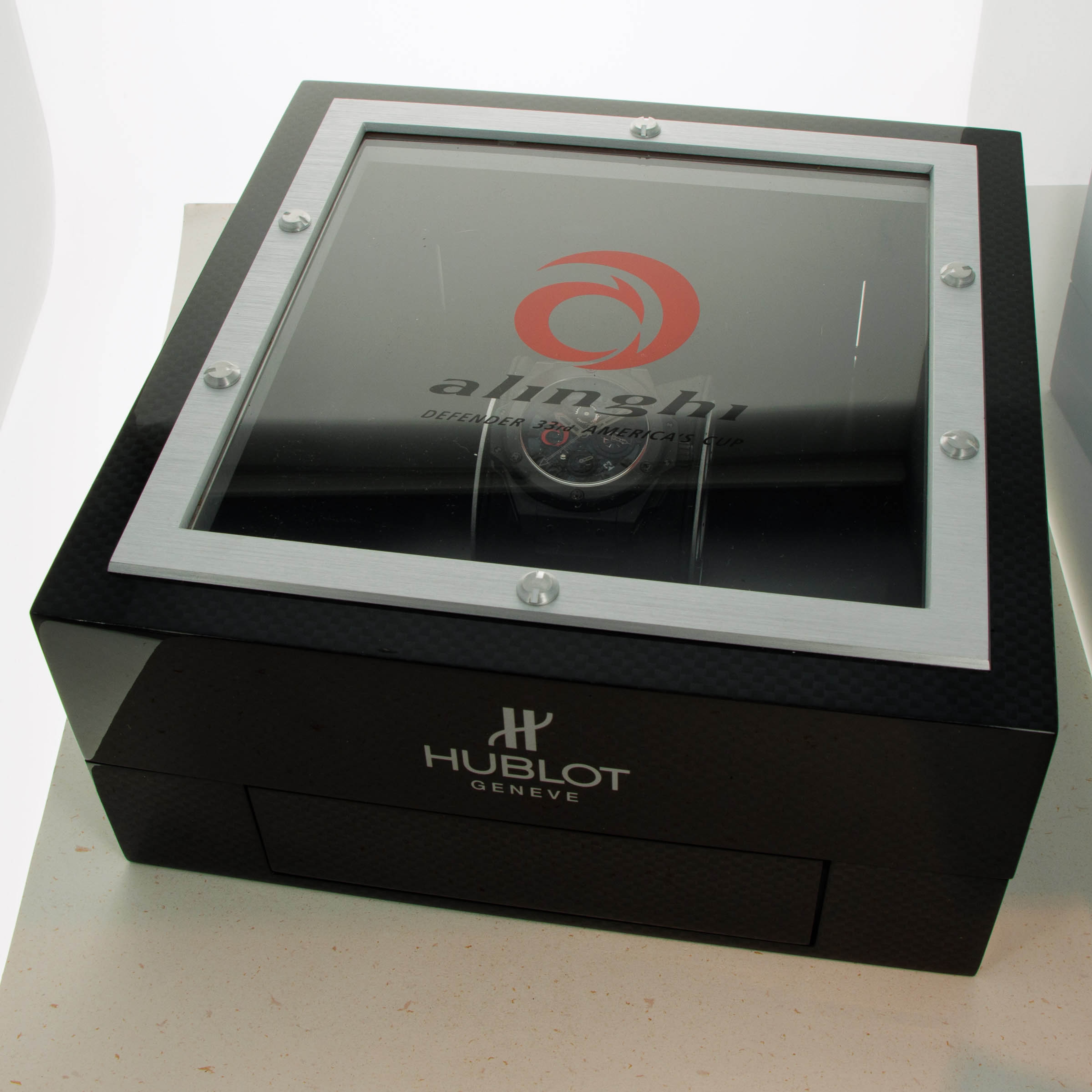 Famed for their unique aesthetics and wild designs, Hublot are a brand that have driven the watchmaking industry’s ever-evolving expectations of what a watch should look like. While it began with their “Art of Fusion” movement in the 1980s by combining precious metals with rubber straps, their modern day watches continue to be aesthetically and visually unique, much like this Big Bang "King Power Alinghi”. Launched in 2010 in collaboration with the Alinghi sail team, this watch was inspired by Alinghi’s Defender Yacht, which raced in the America’s Cup. Unveiled by Ernesto Bertarelli and Hublot’s CEO at the time, watchmaking visionary Jean Claude Biver, the Big Bang "King Power Alinghi” boasts an entirely blacked-out design with a sand-blasted ceramic and titanium case, a black rubber strap and a blacked out dial with Alinghi’s red logo at 9 o’clock that adds a bright punch of color to the stealthy timepiece. Powered by the automatic cal. HUB4400, which is on display behind its exhibition caseback, this unique timepiece carries on Hublot’s tradition of creating visually distinguished timepieces that break from convention and offer something unique and interesting.