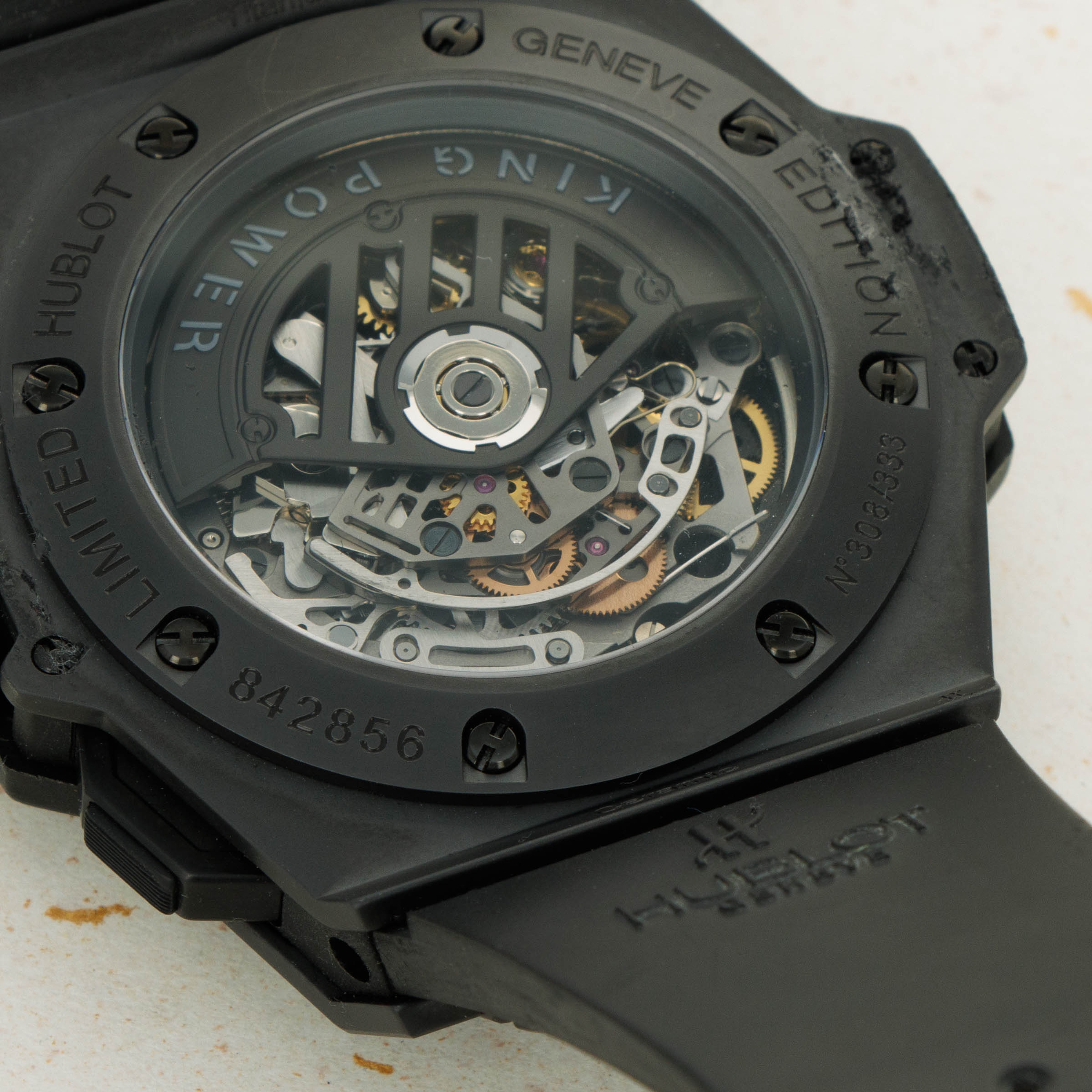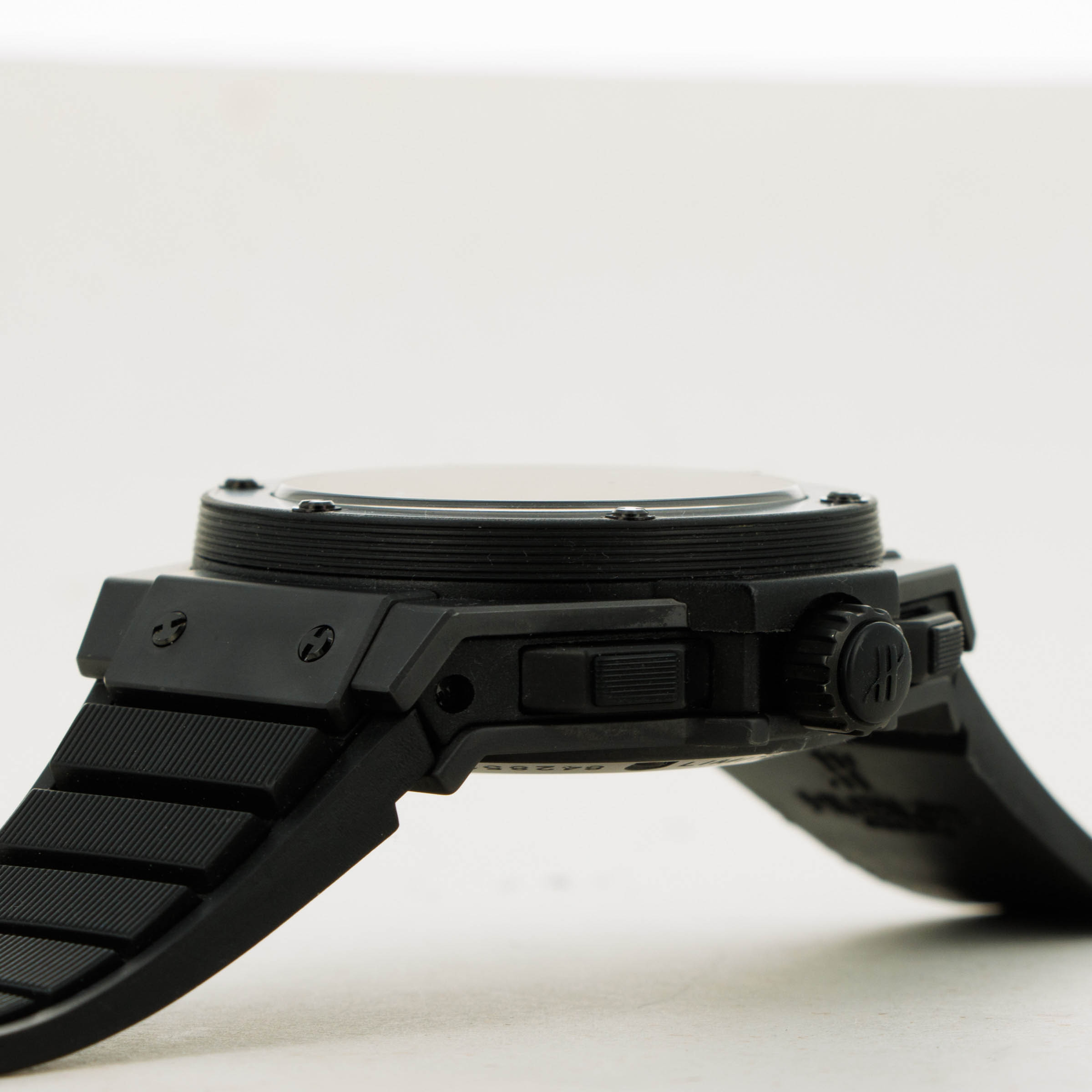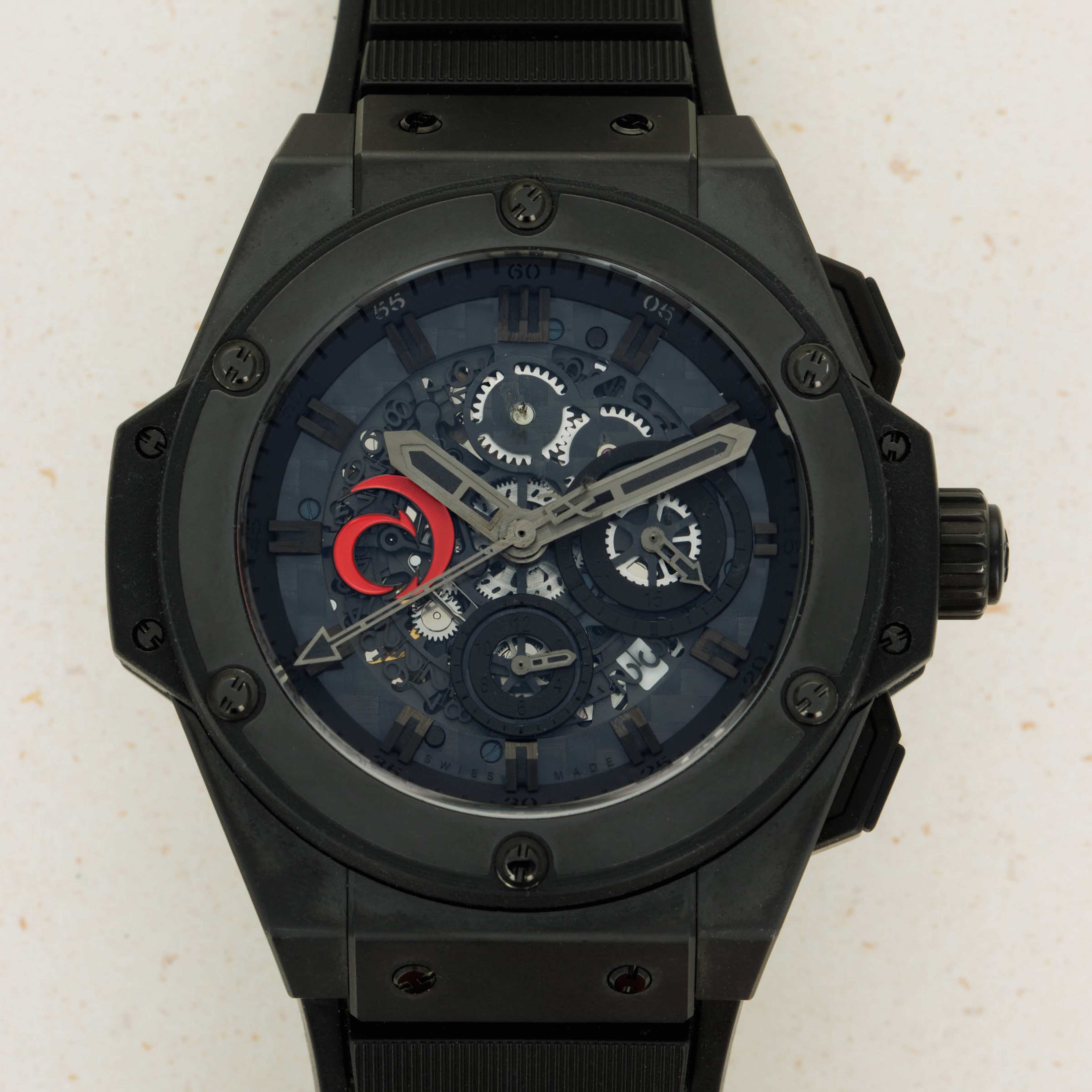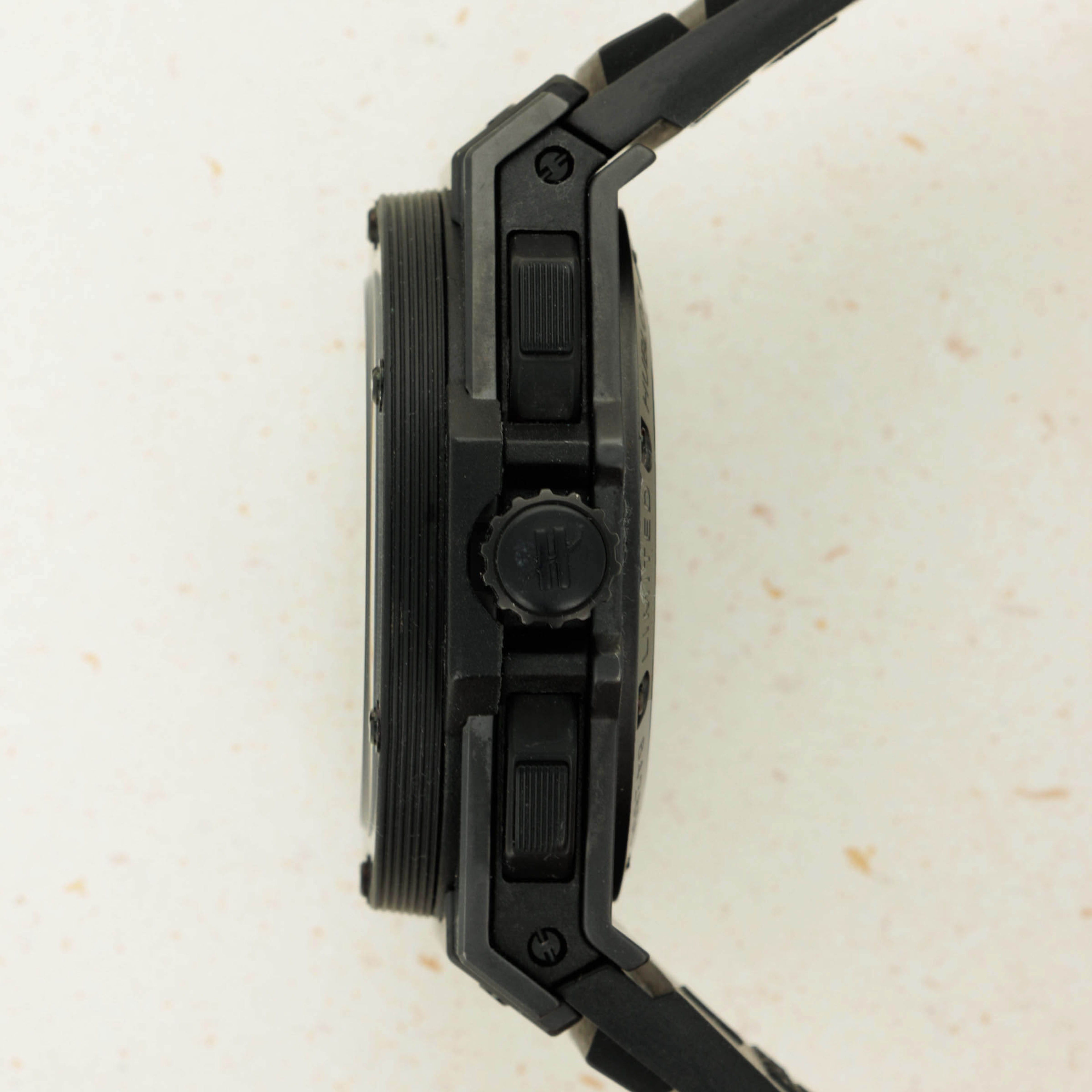 Famed for their unique aesthetics and wild designs, Hublot are a brand that have driven the watchmaking industry’s ever-evolving expectations of what a watch should look like. While it began with their “Art of Fusion” movement in the 1980s by combining precious metals with rubber straps, their modern day watches continue to be aesthetically and visually unique, much like this Big Bang "King Power Alinghi”. Launched in 2010 in collaboration with the Alinghi sail team, this watch was inspired by Alinghi’s Defender Yacht, which raced in the America’s Cup. Unveiled by Ernesto Bertarelli and Hublot’s CEO at the time, watchmaking visionary Jean Claude Biver, the Big Bang "King Power Alinghi” boasts an entirely blacked-out design with a sand-blasted ceramic and titanium case, a black rubber strap and a blacked out dial with Alinghi’s red logo at 9 o’clock that adds a bright punch of color to the stealthy timepiece. Powered by the automatic cal. HUB4400, which is on display behind its exhibition caseback, this unique timepiece carries on Hublot’s tradition of creating visually distinguished timepieces that break from convention and offer something unique and interesting.
