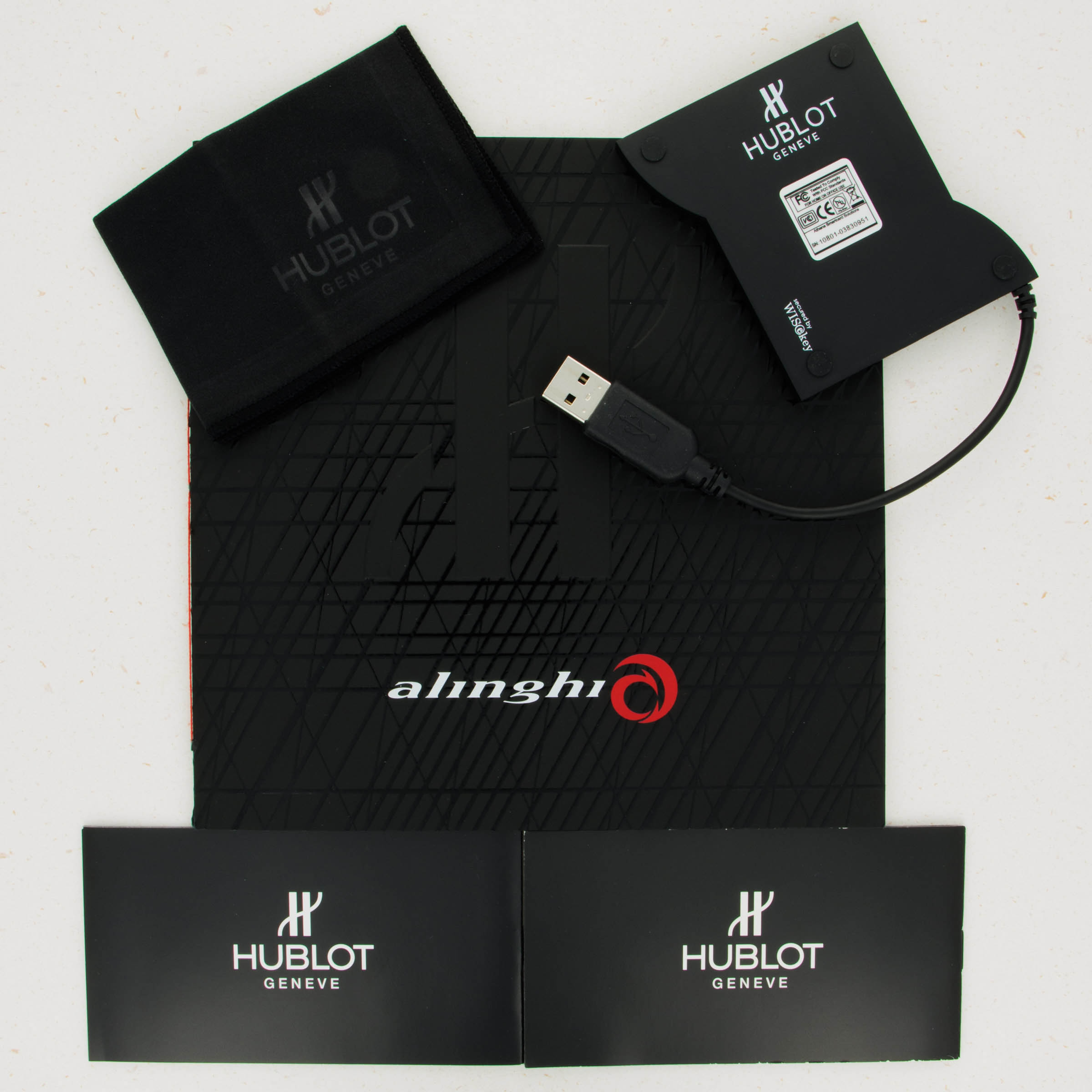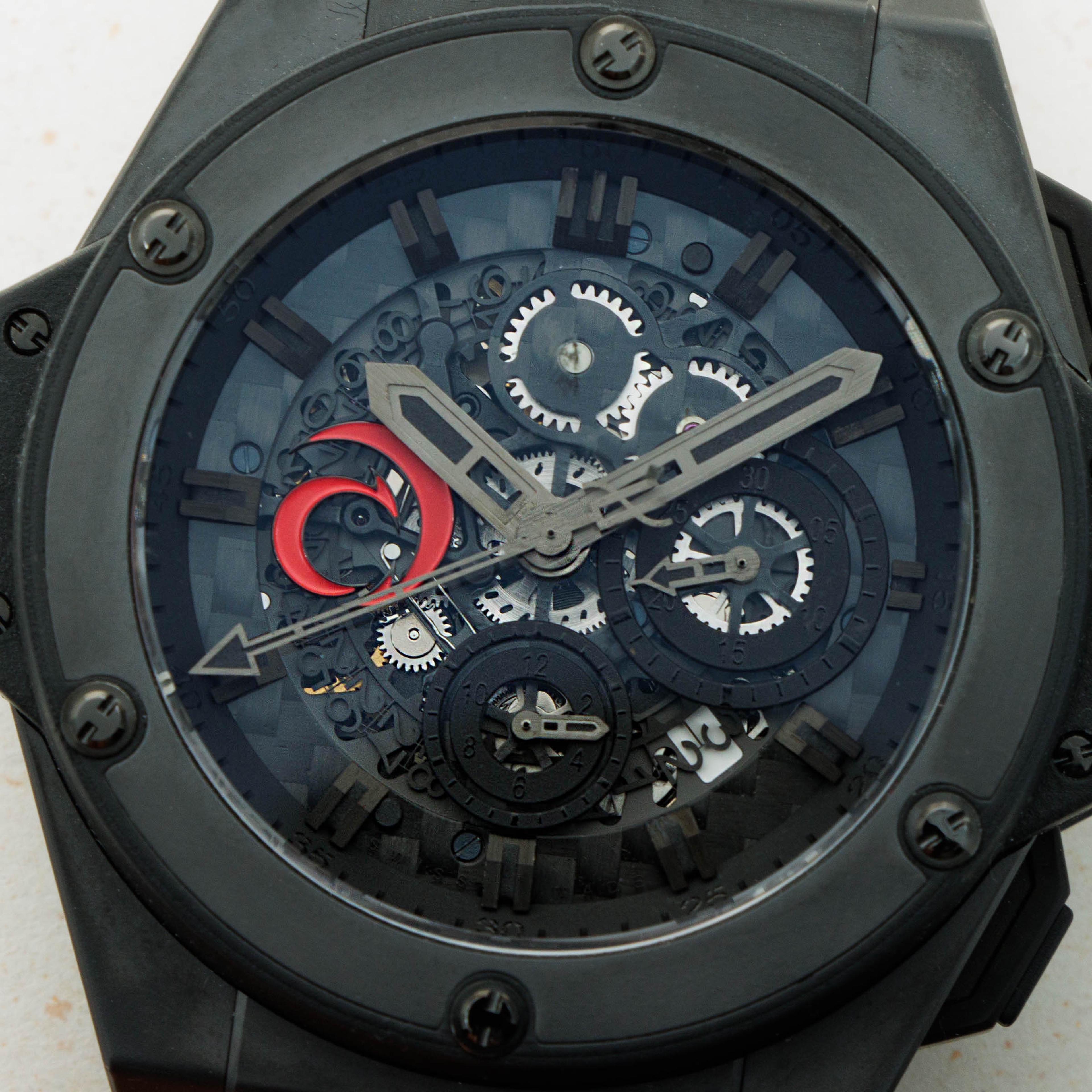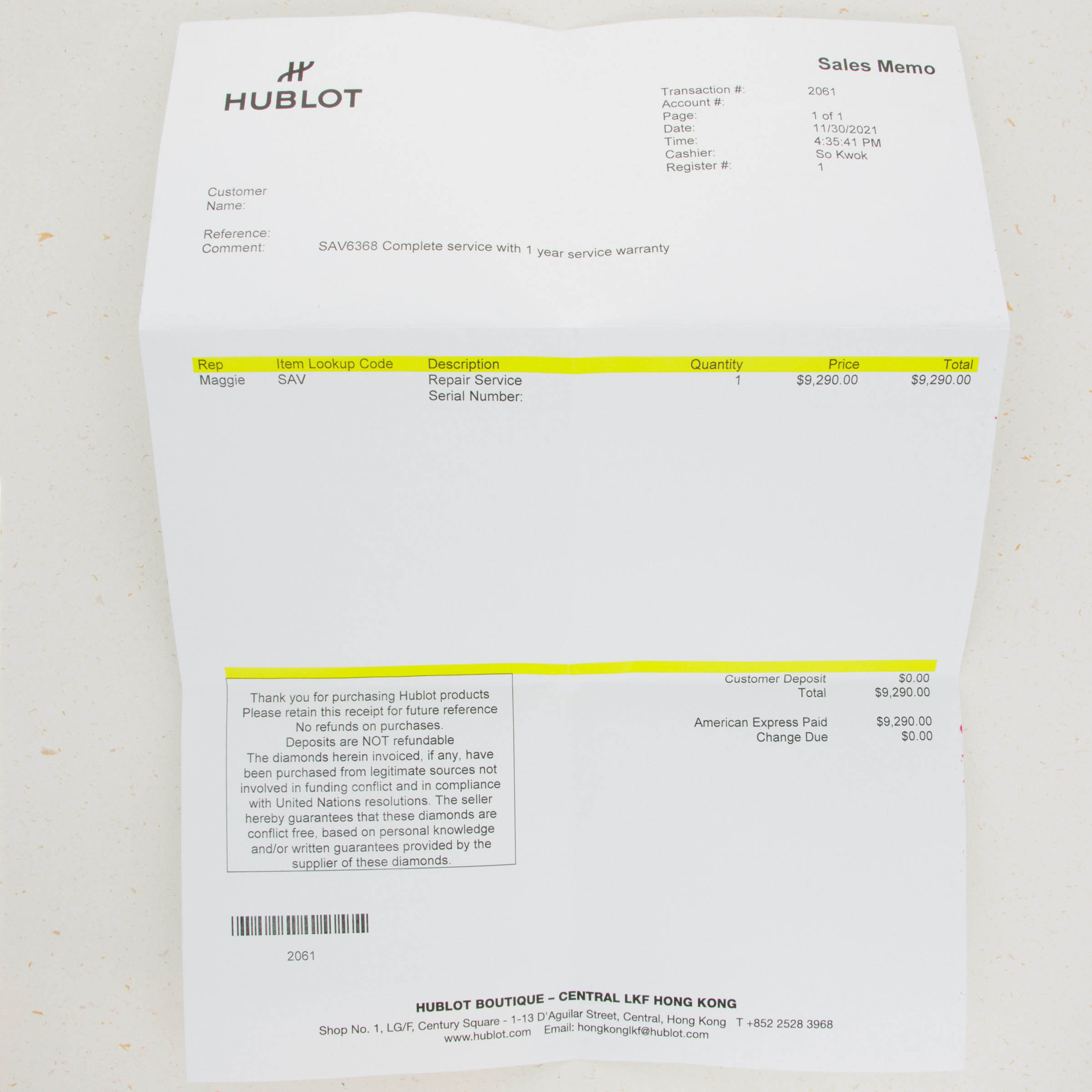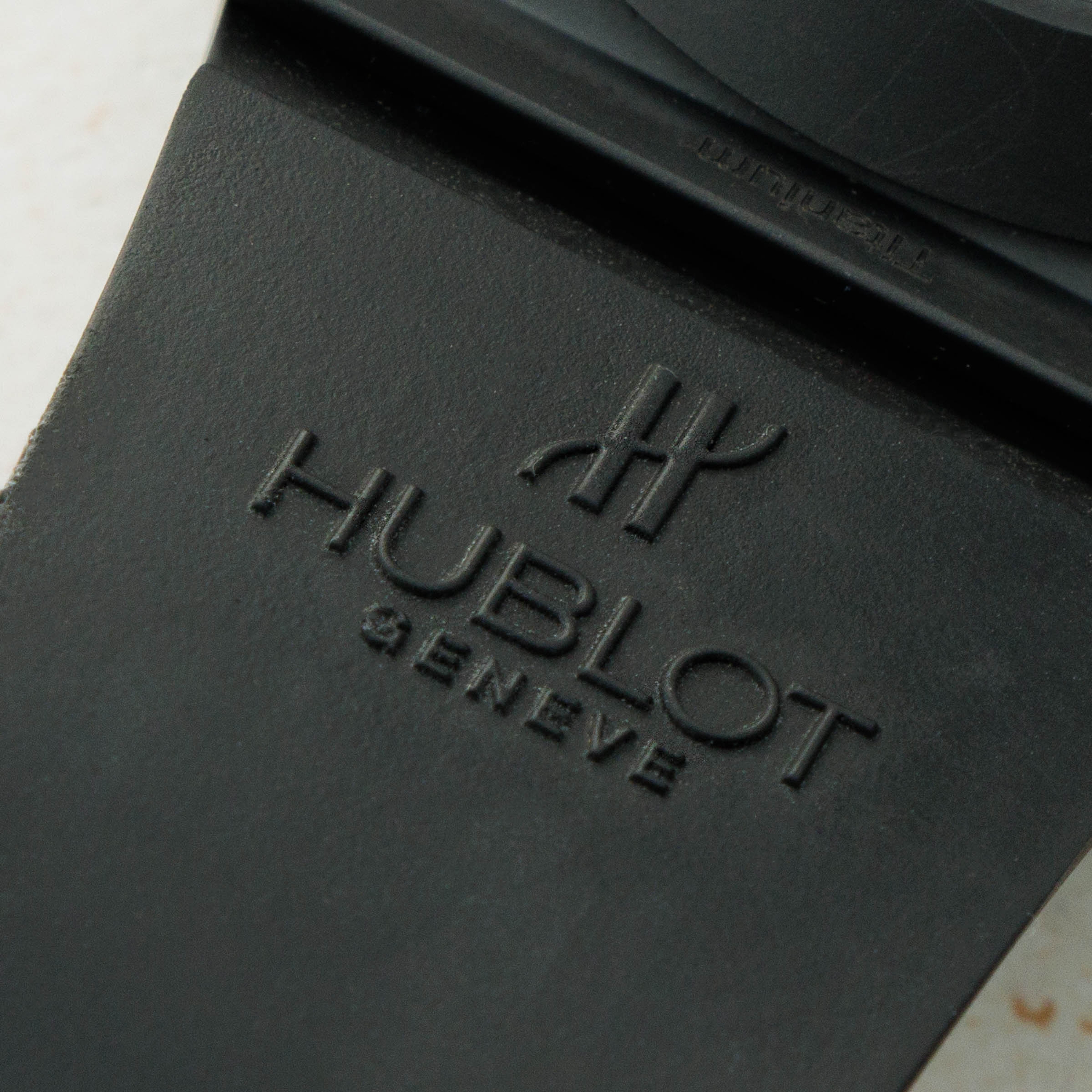 Watch is in excellent overall condition. There are minor signs of wear on the surface, with a few tiny scratches and marks visible on the black surface. Please note, on the caseback at the 3 and 9 sides, this is the result of the watch sticking to the cuff inside the box and not damage on the watch. It will easily wipe off. Watch comes with a service paper from 2021 by Hublot HK.