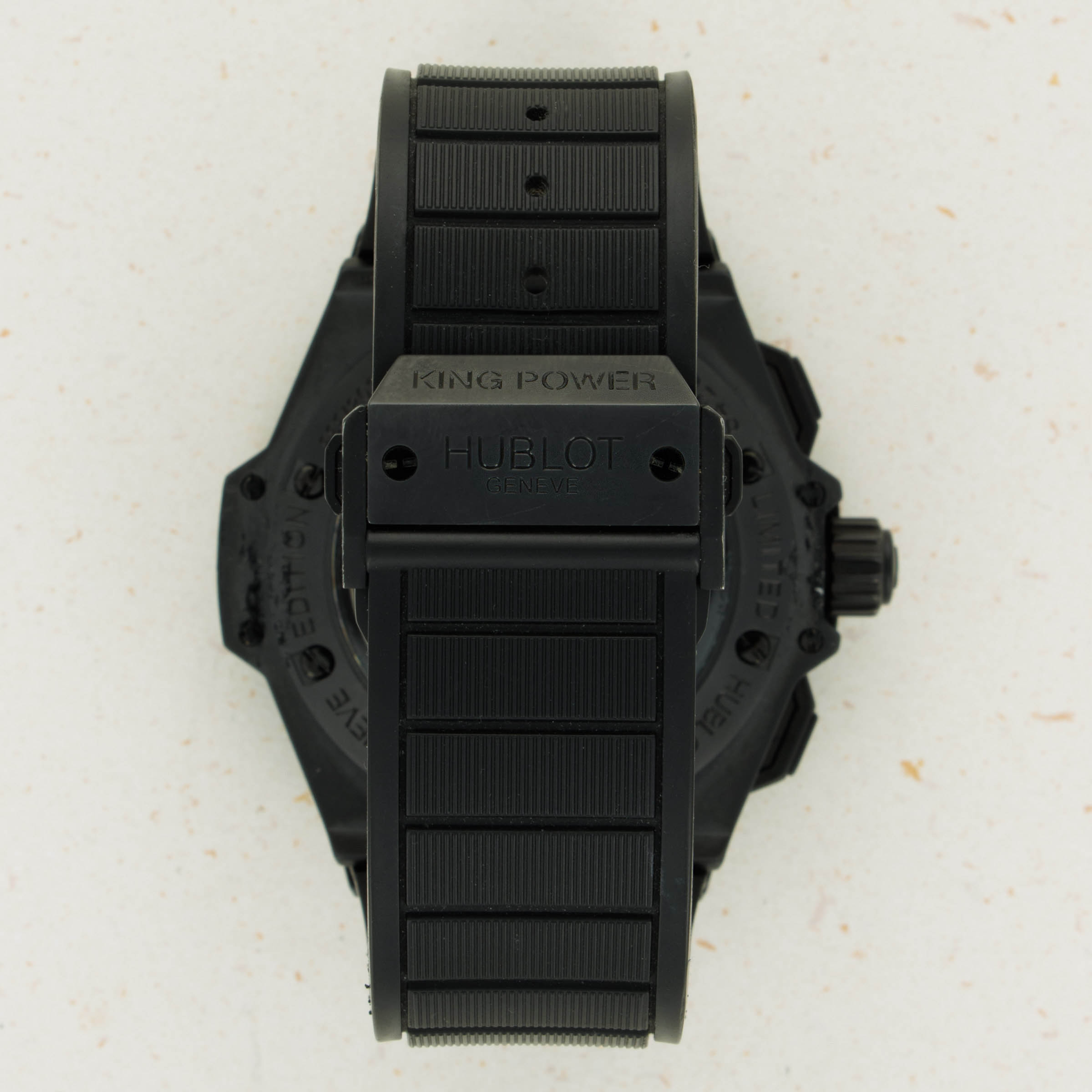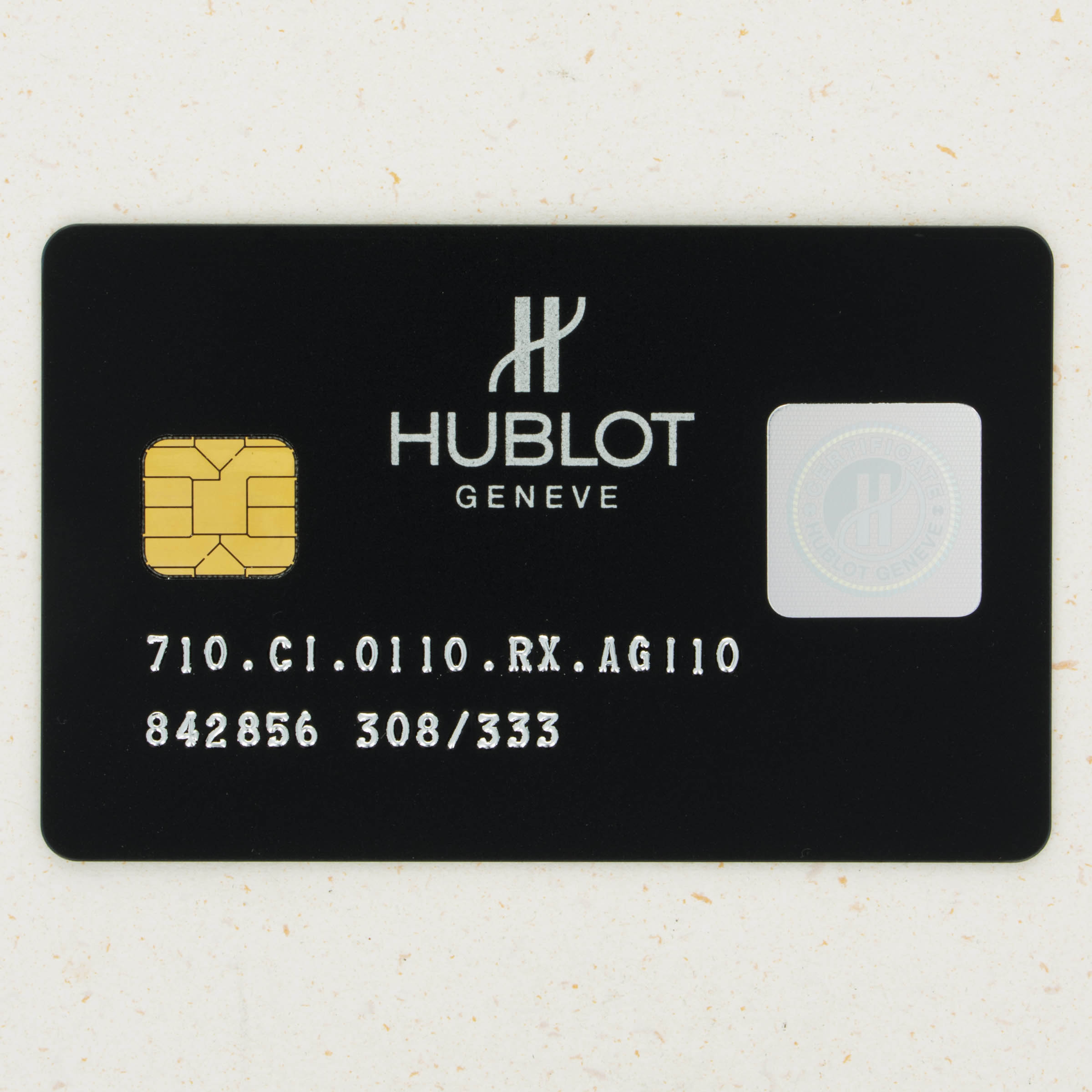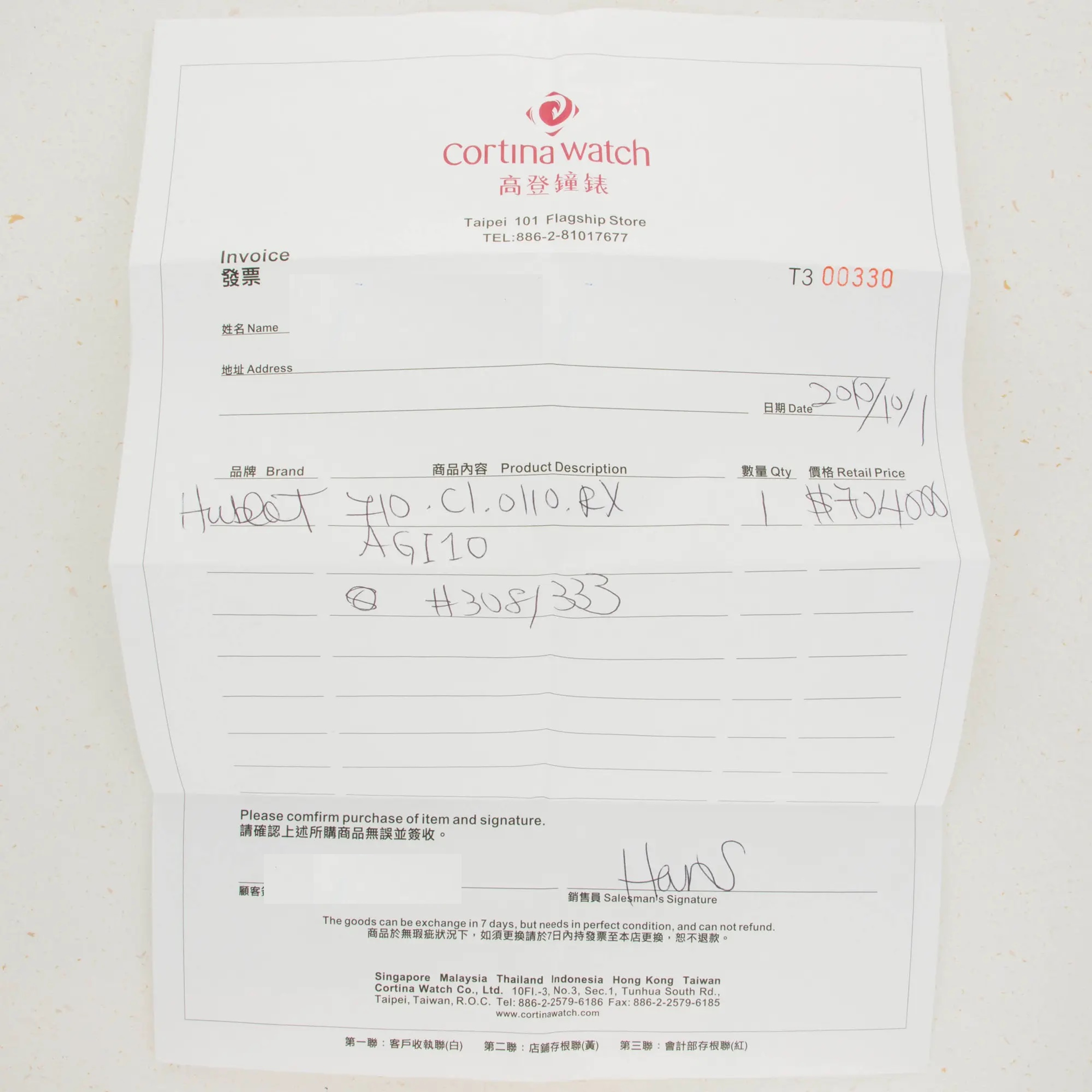 Watch is in excellent overall condition. There are minor signs of wear on the surface, with a few tiny scratches and marks visible on the black surface. Please note, on the caseback at the 3 and 9 sides, this is the result of the watch sticking to the cuff inside the box and not damage on the watch. It will easily wipe off. Watch comes with a service paper from 2021 by Hublot HK.