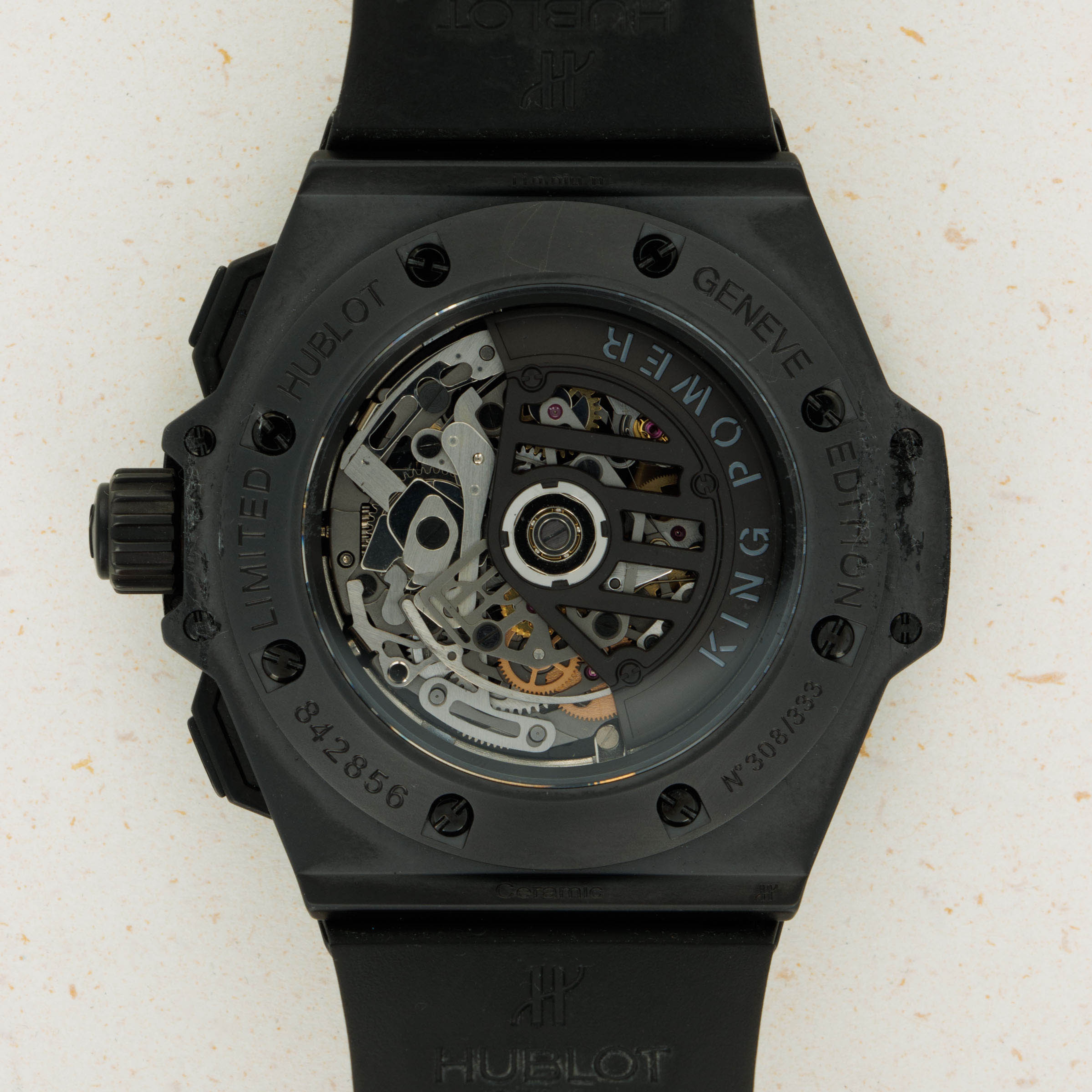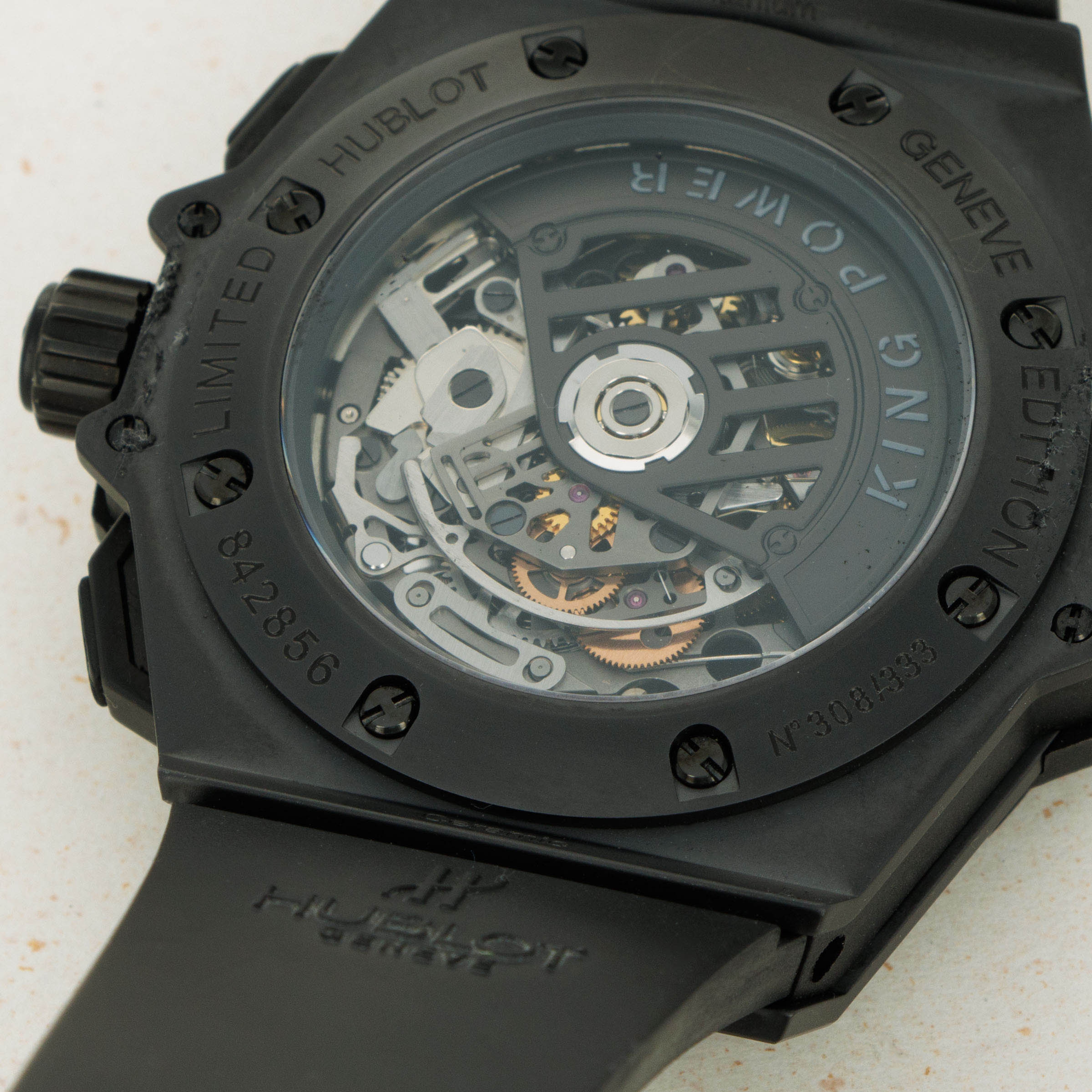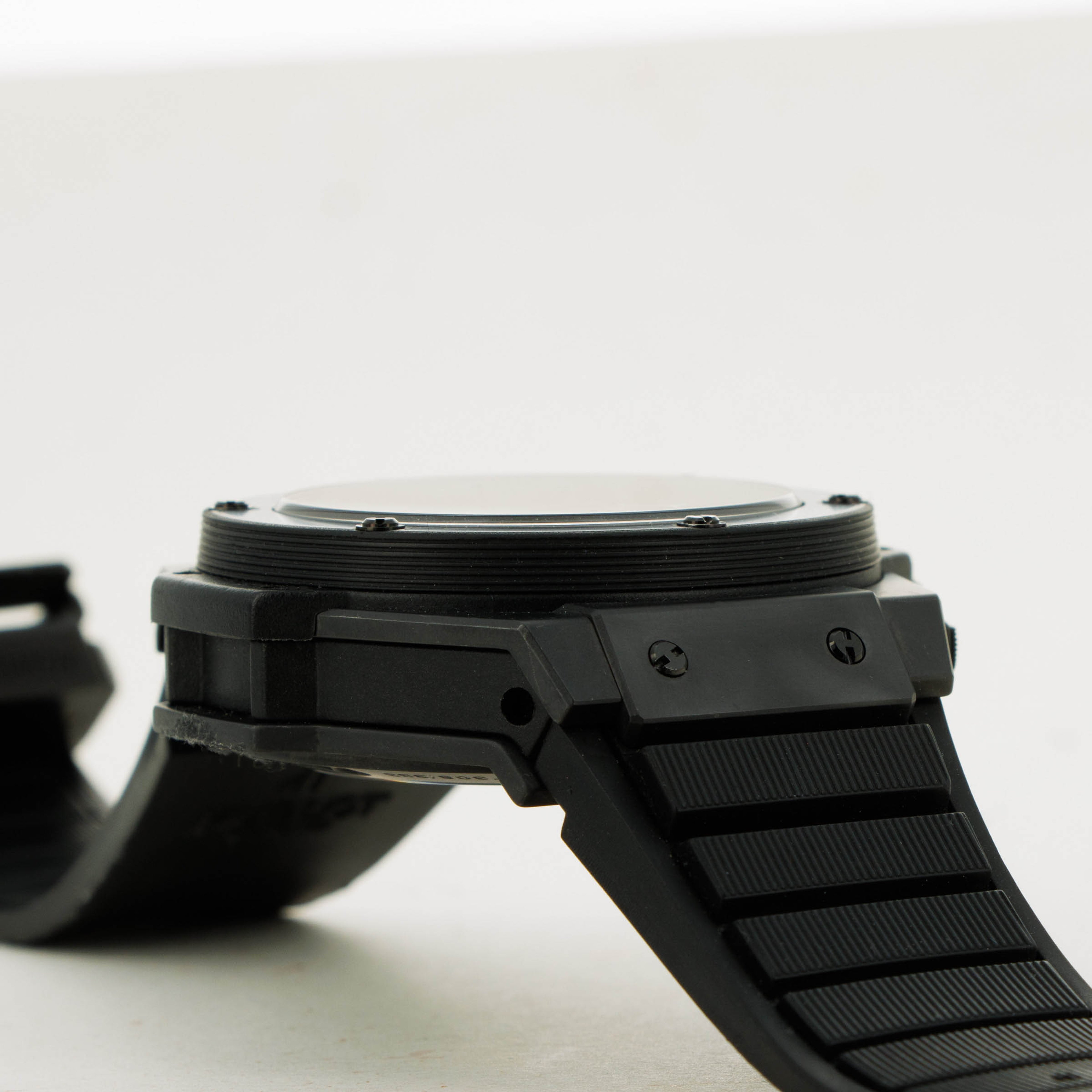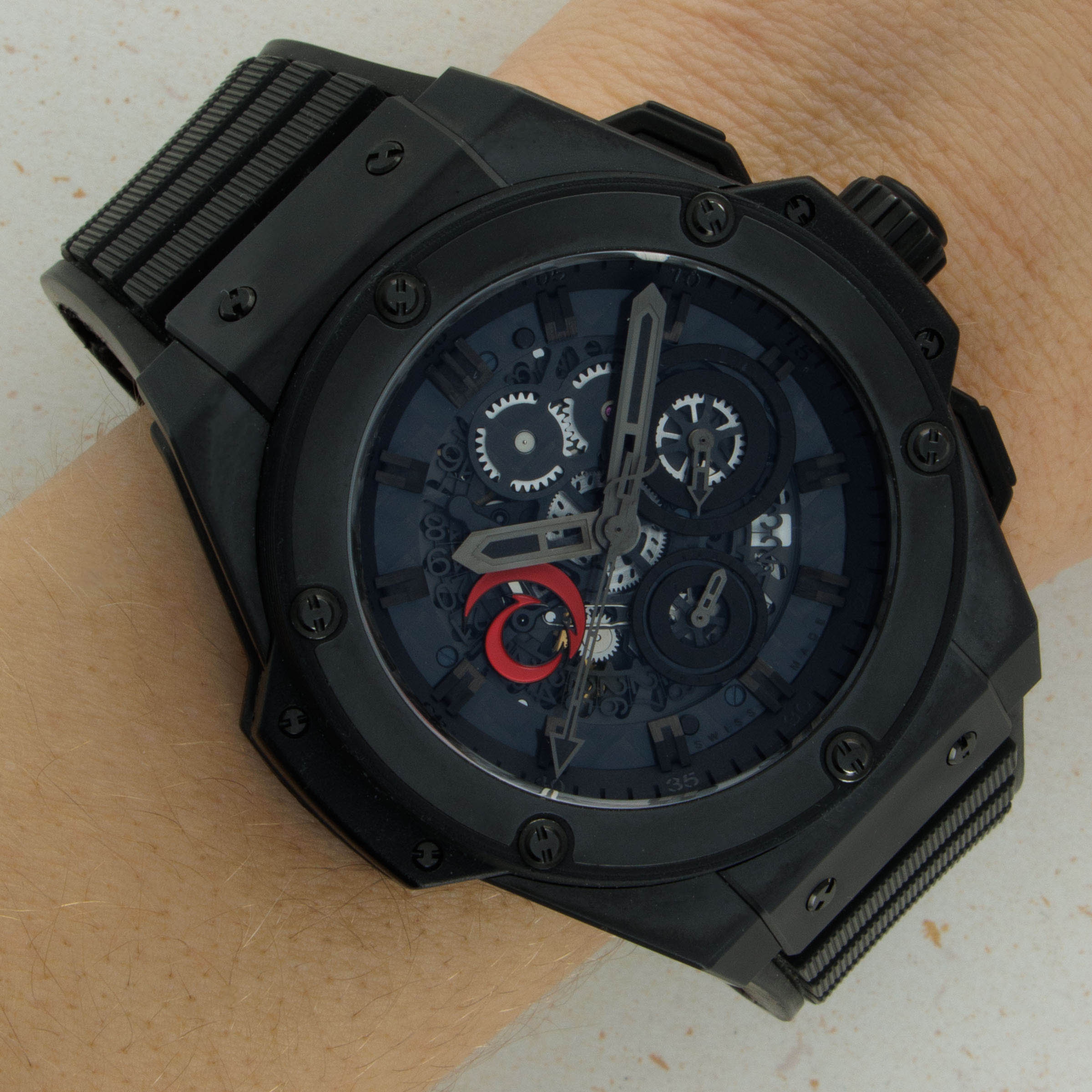 Watch is in excellent overall condition. There are minor signs of wear on the surface, with a few tiny scratches and marks visible on the black surface. Please note, on the caseback at the 3 and 9 sides, this is the result of the watch sticking to the cuff inside the box and not damage on the watch. It will easily wipe off. Watch comes with a service paper from 2021 by Hublot HK.