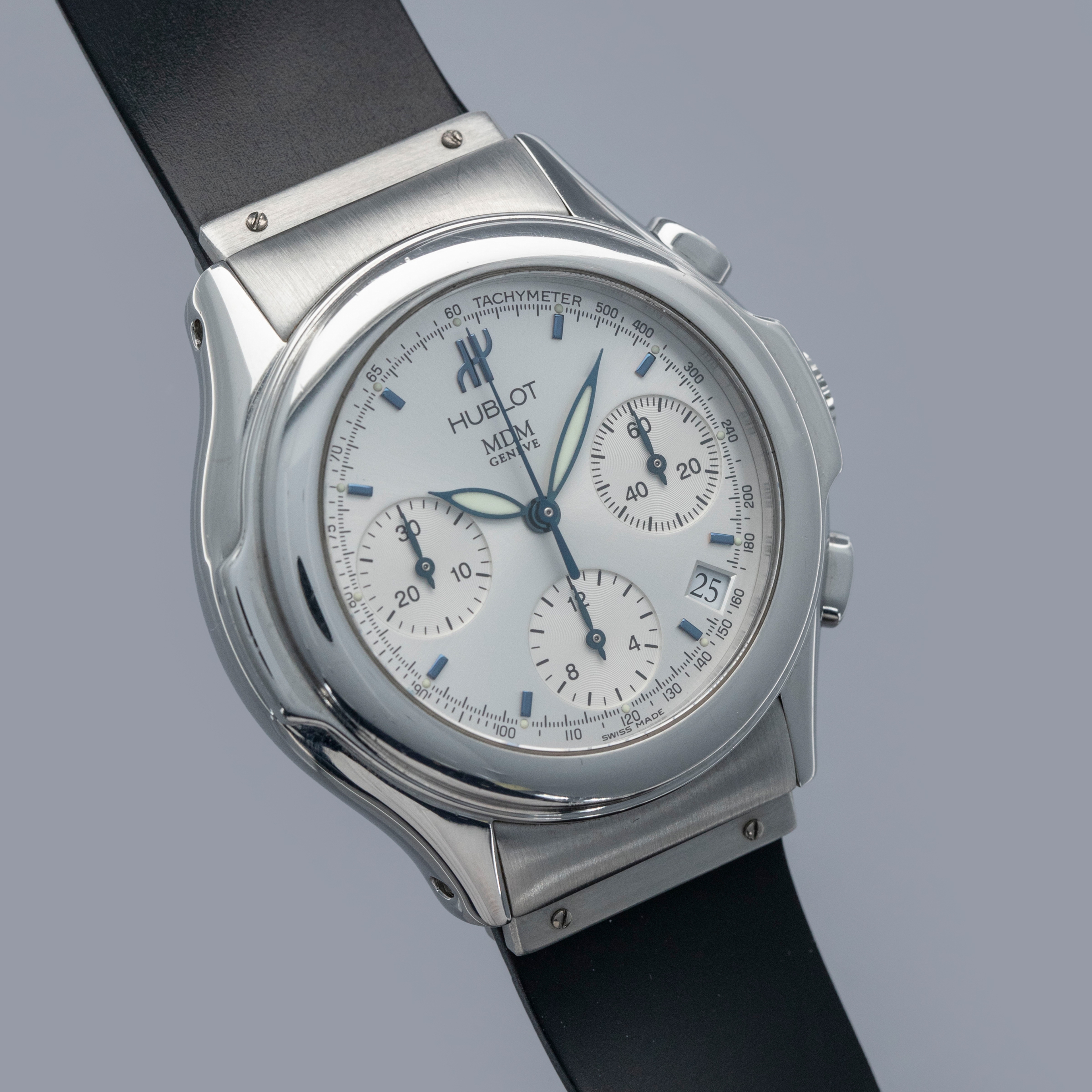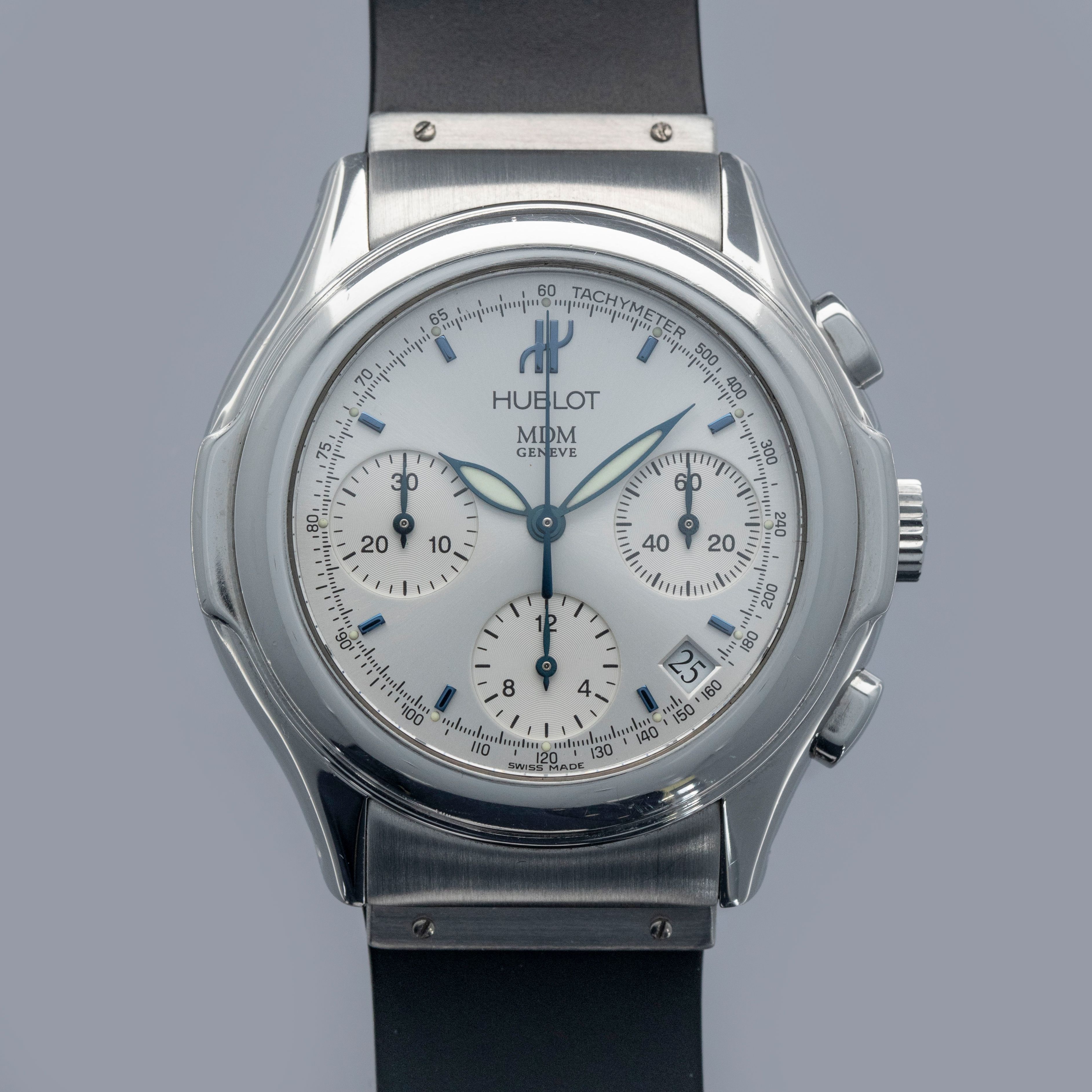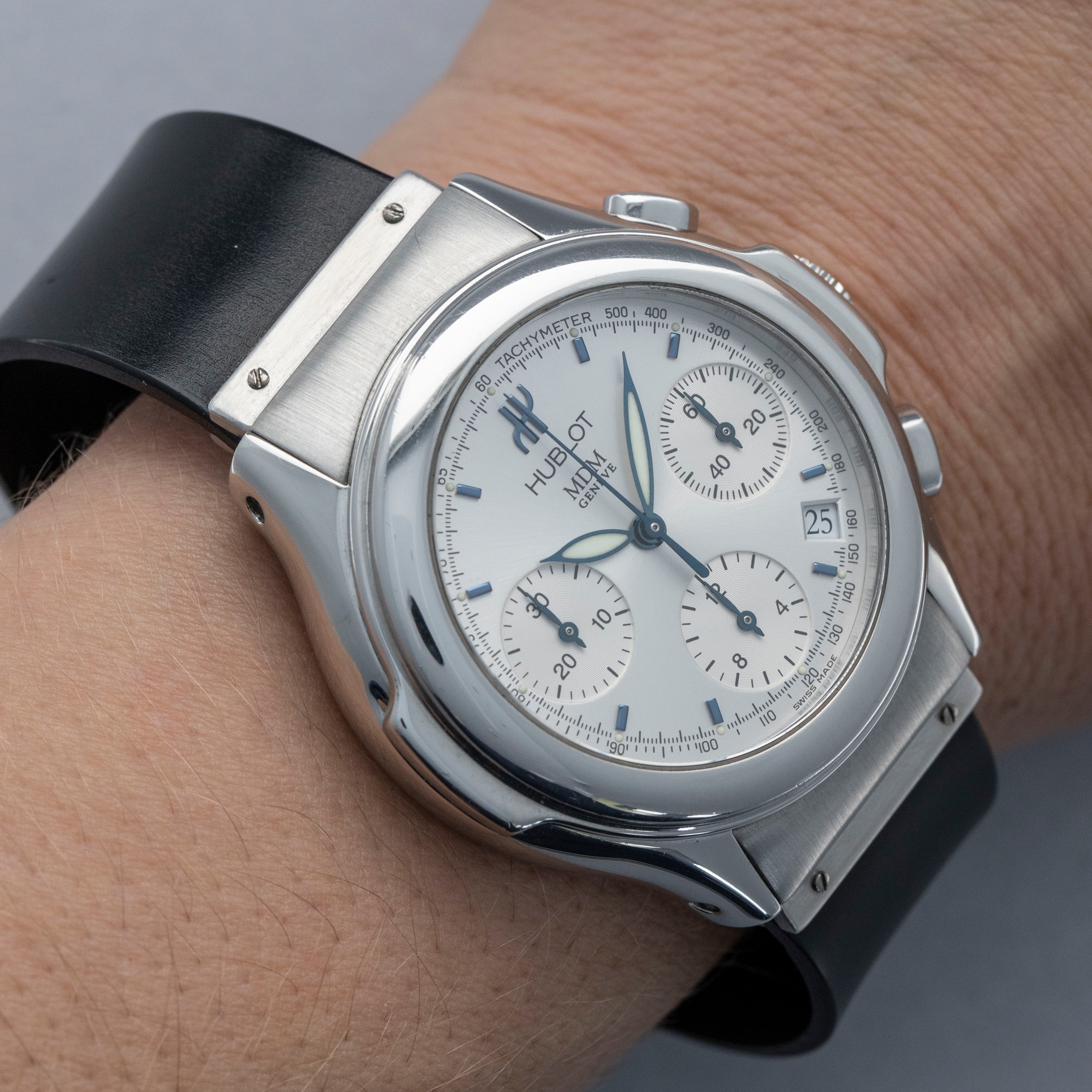 While not hammering home Hublot's case design like later watches would, the MDM Geneva Chronograph still offers just enough of the brand's details to make it clear that it is an early Hublot, with its case's ears and integrated rubber strap giving it the right amount of wrist presence.