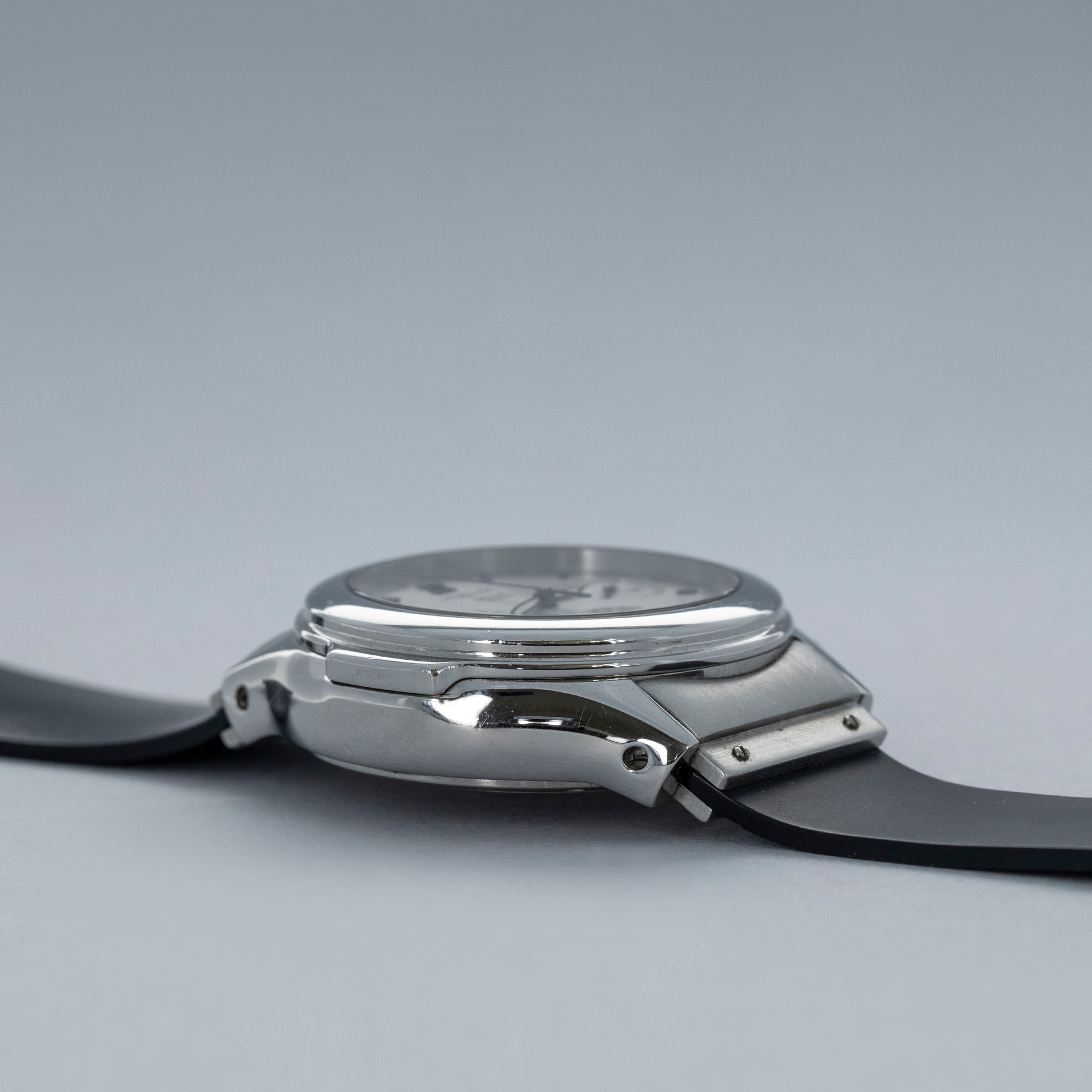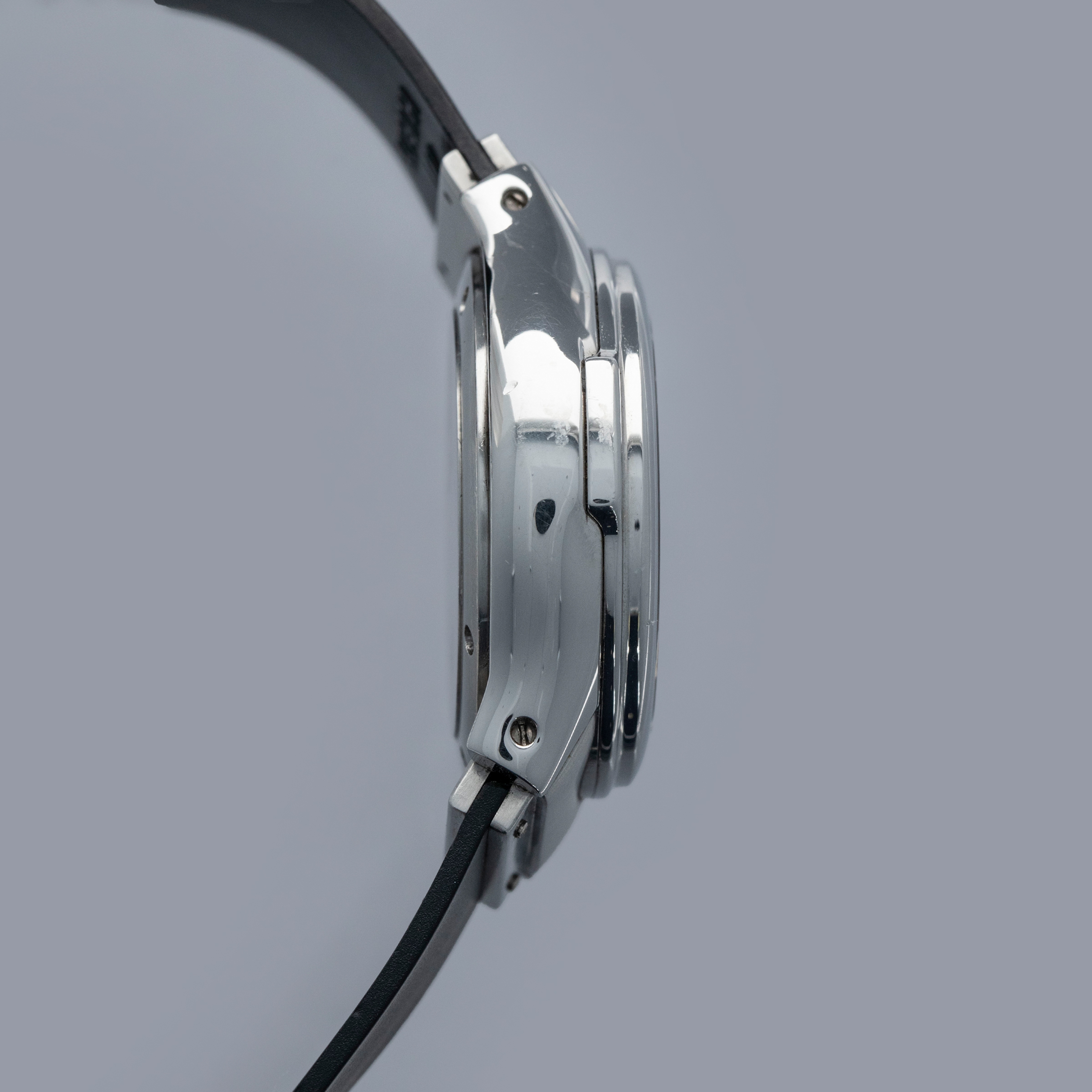 The watch is in overall excellent condition. The case and bezel show scratches and small nicks, with signs of a previous polish. The case back engravings remain legible, though slightly worn, and there is visible wear to the screw heads. The dial and hands are near-mint. It is fitted with a rubber strap in excellent condition and a stainless steel deployant clasp with light marks. The watch fits an approximately 6¾” wrist.