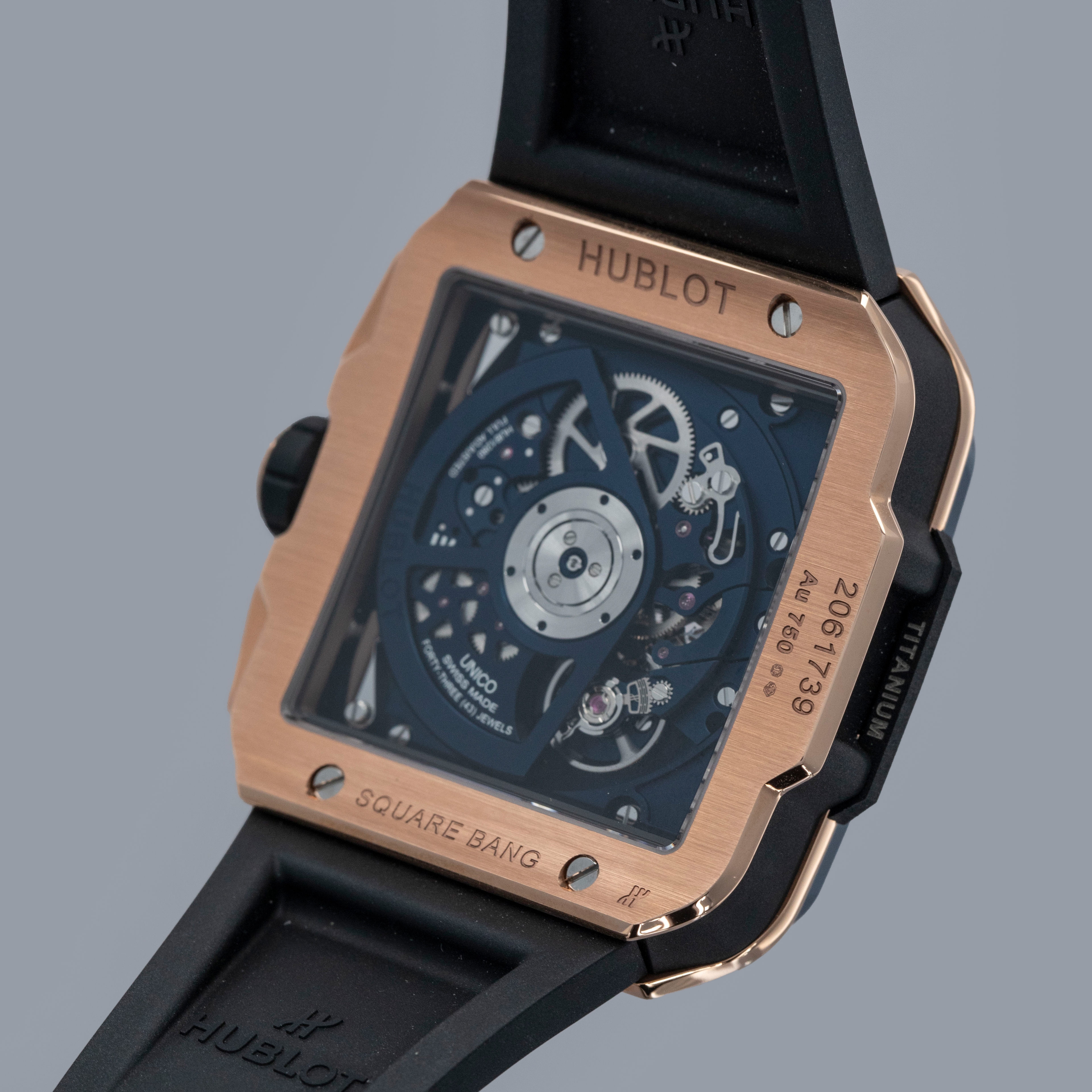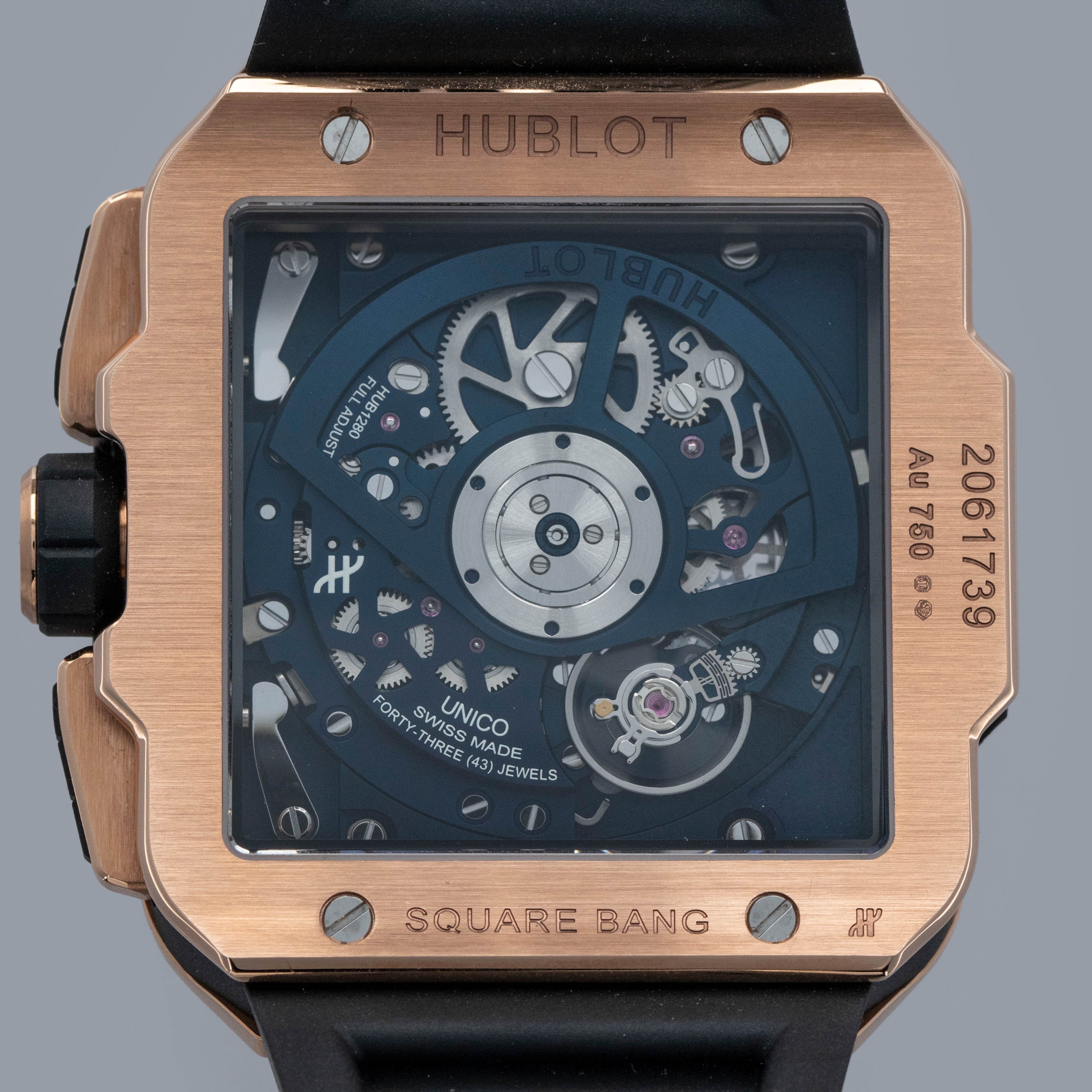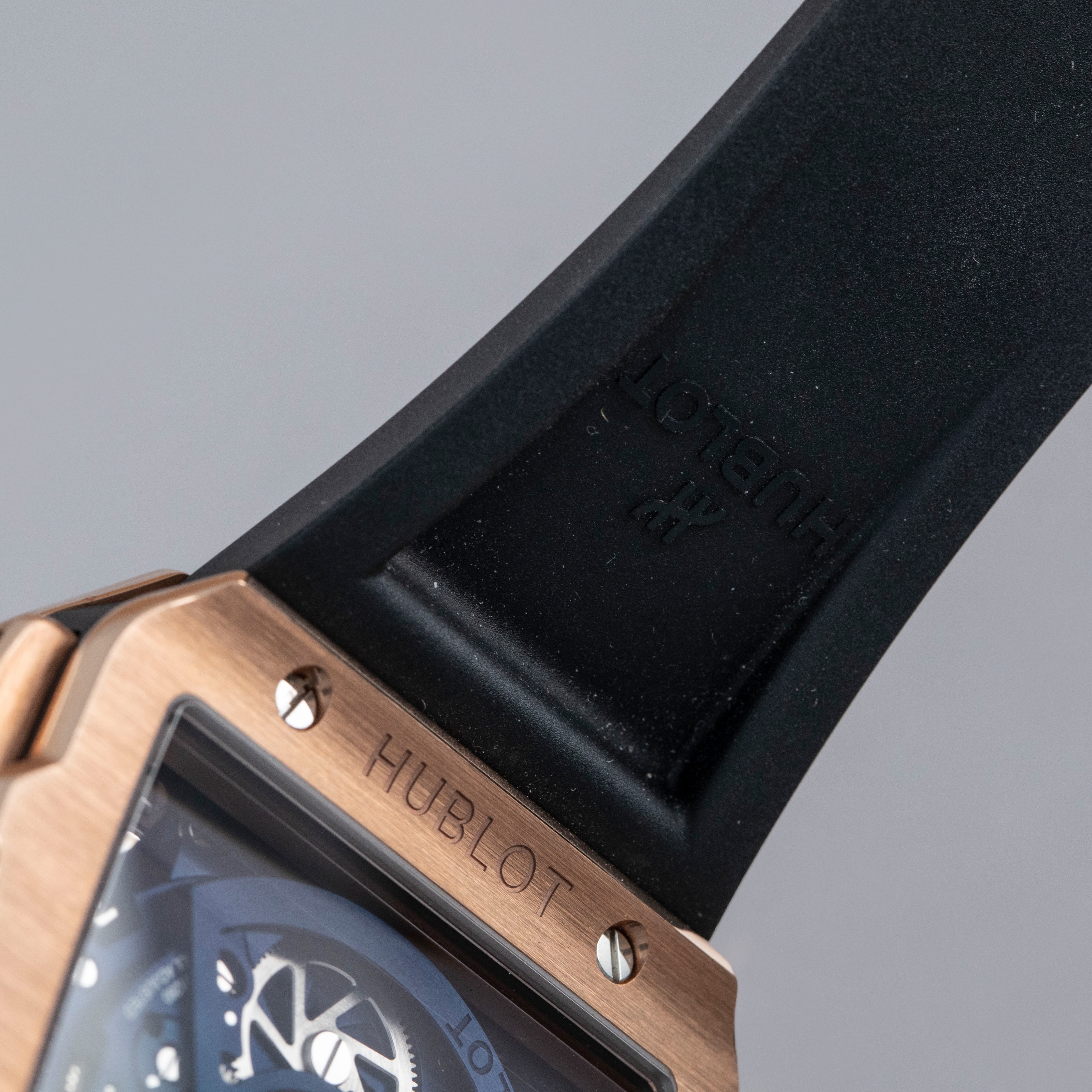 Made of a proprietary 18kt rose gold alloy named "King Gold", the Square Bang Unico's gold construction is infused with ceramic to make it more scratch resistant and ensure it looks newer for longer.