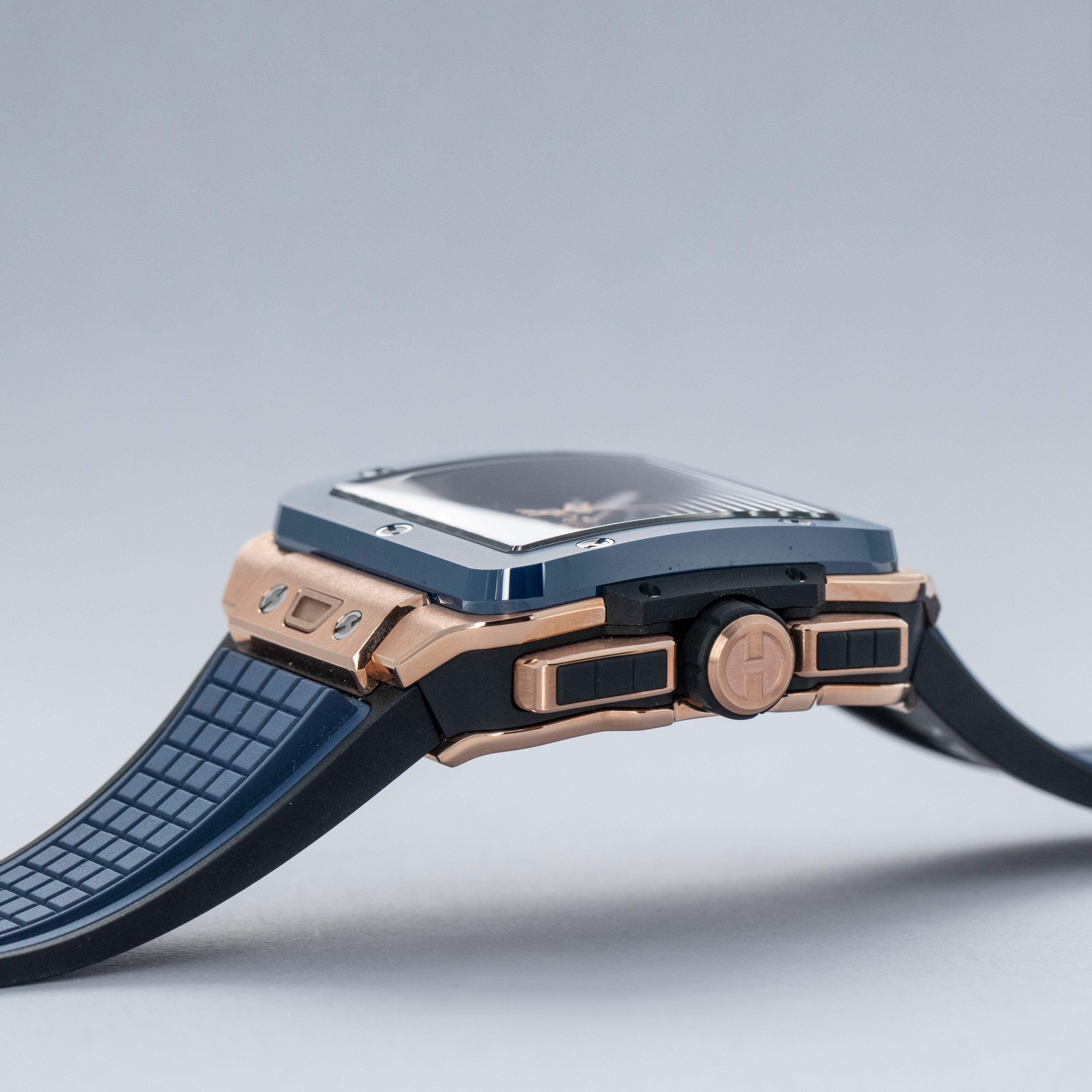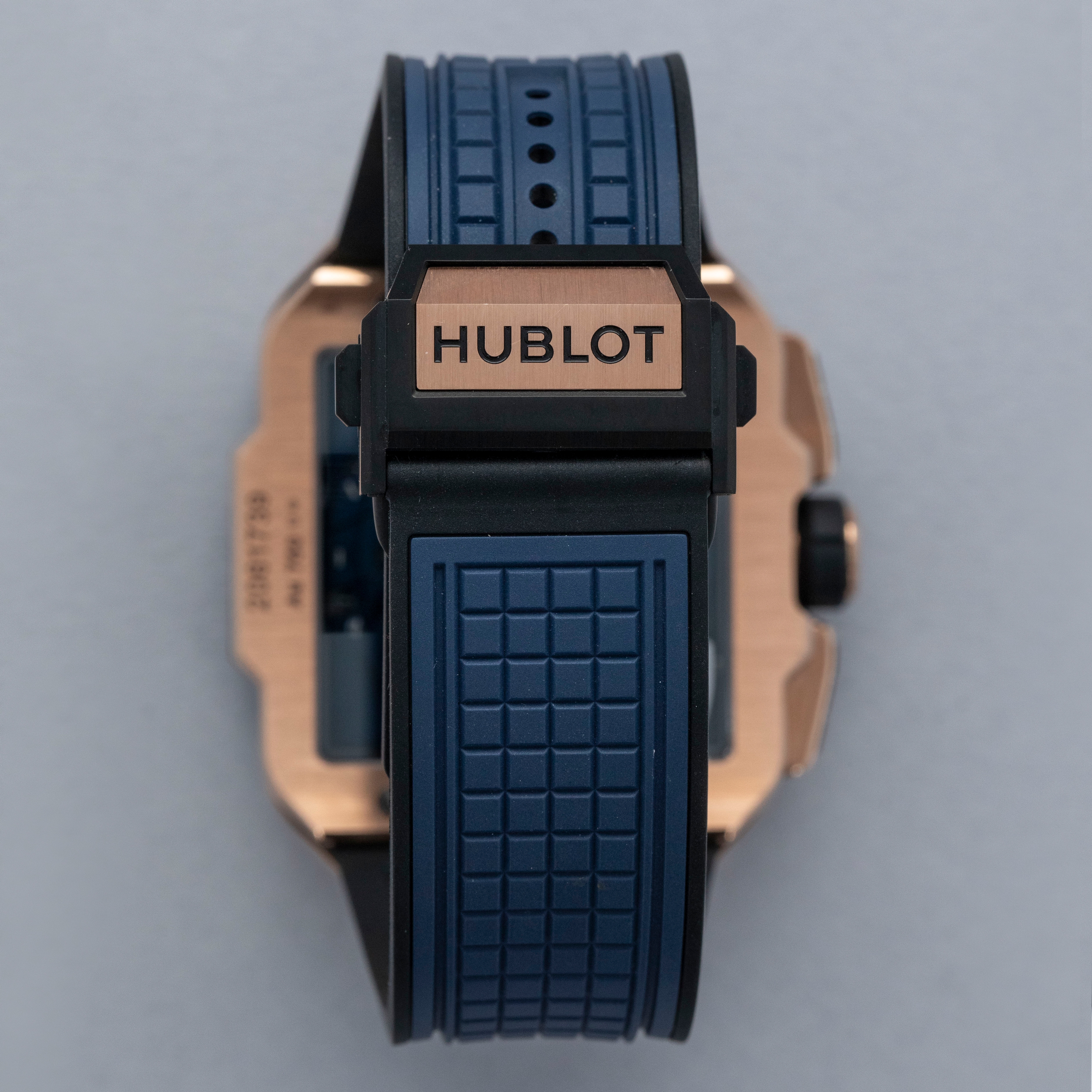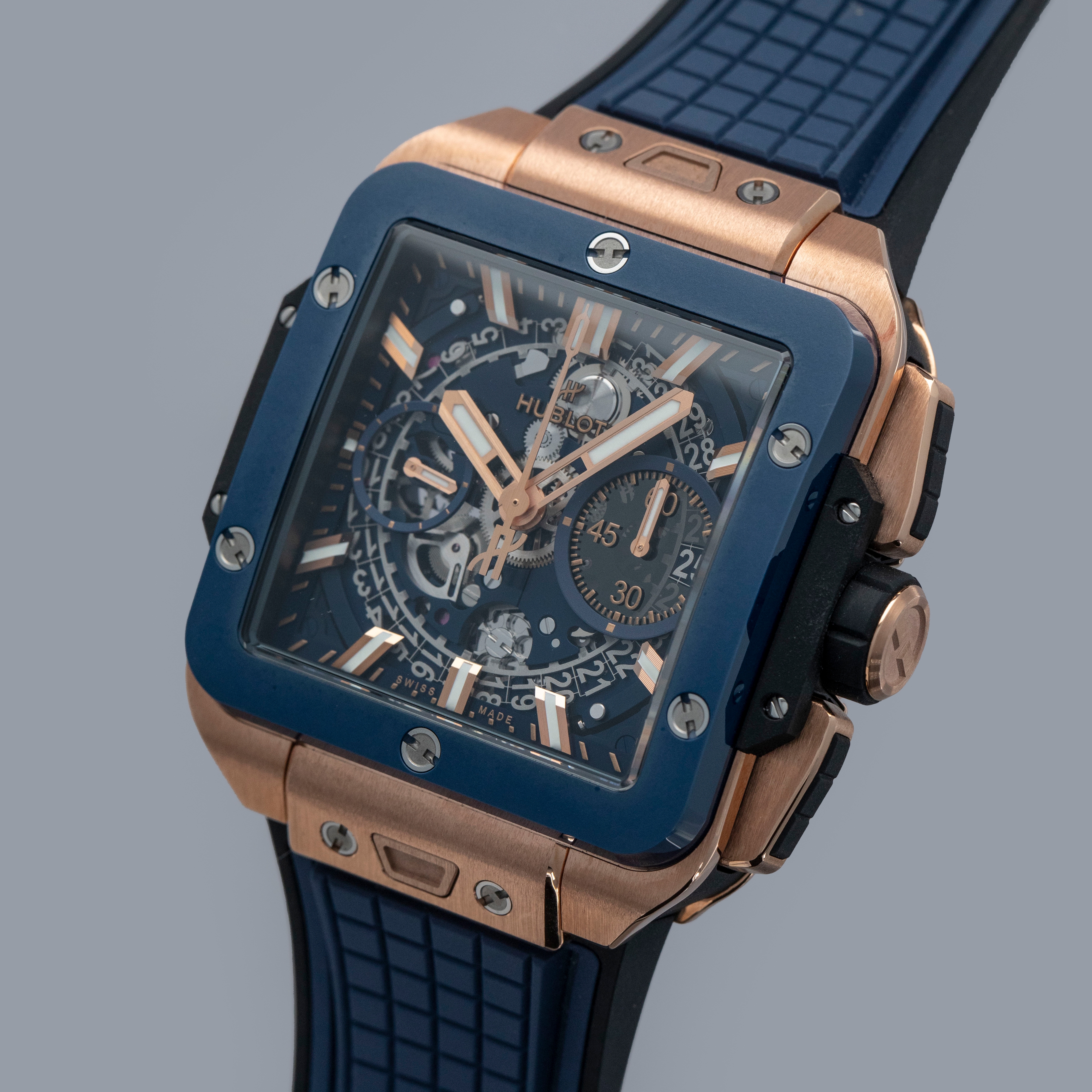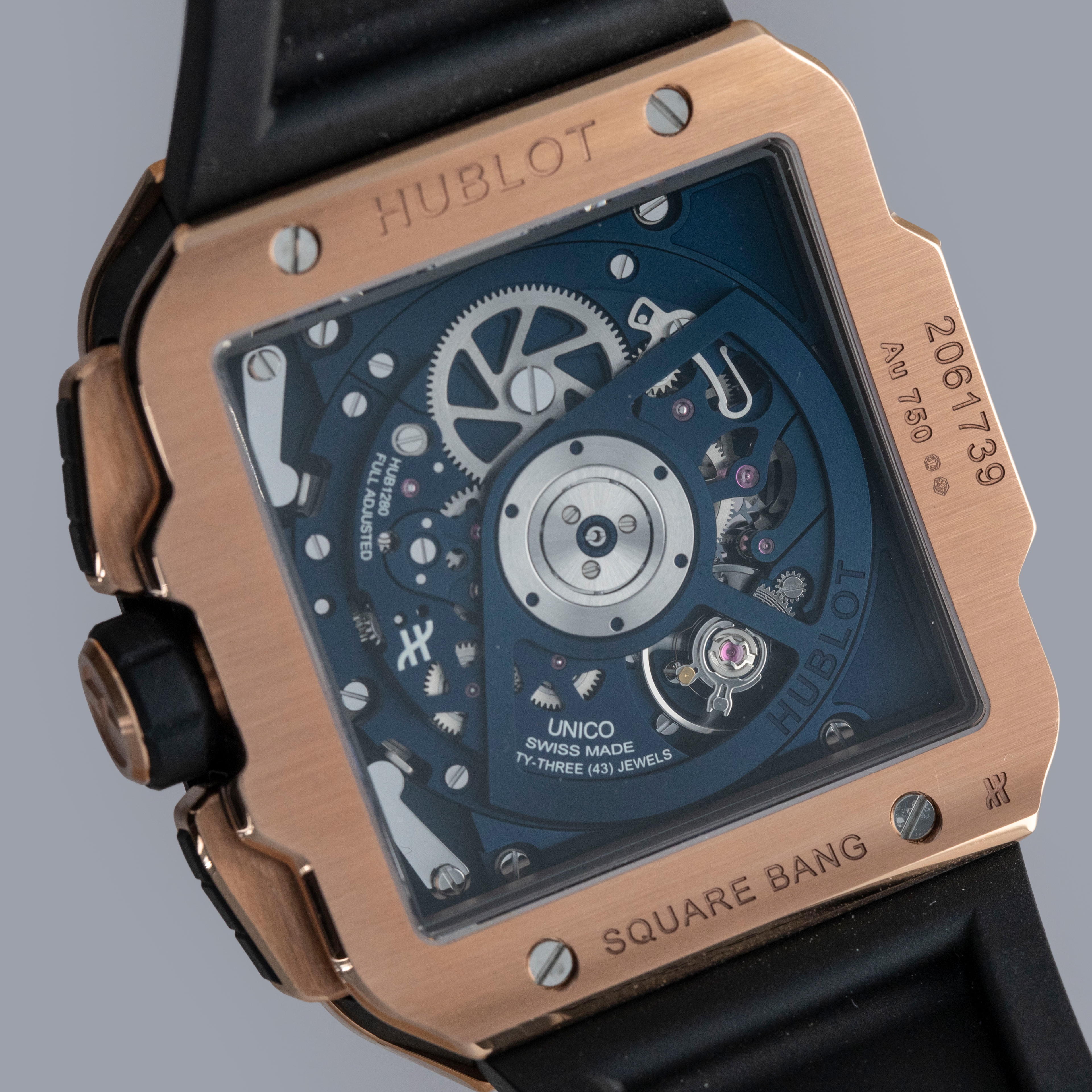 Made of a proprietary 18kt rose gold alloy named "King Gold", the Square Bang Unico's gold construction is infused with ceramic to make it more scratch resistant and ensure it looks newer for longer.