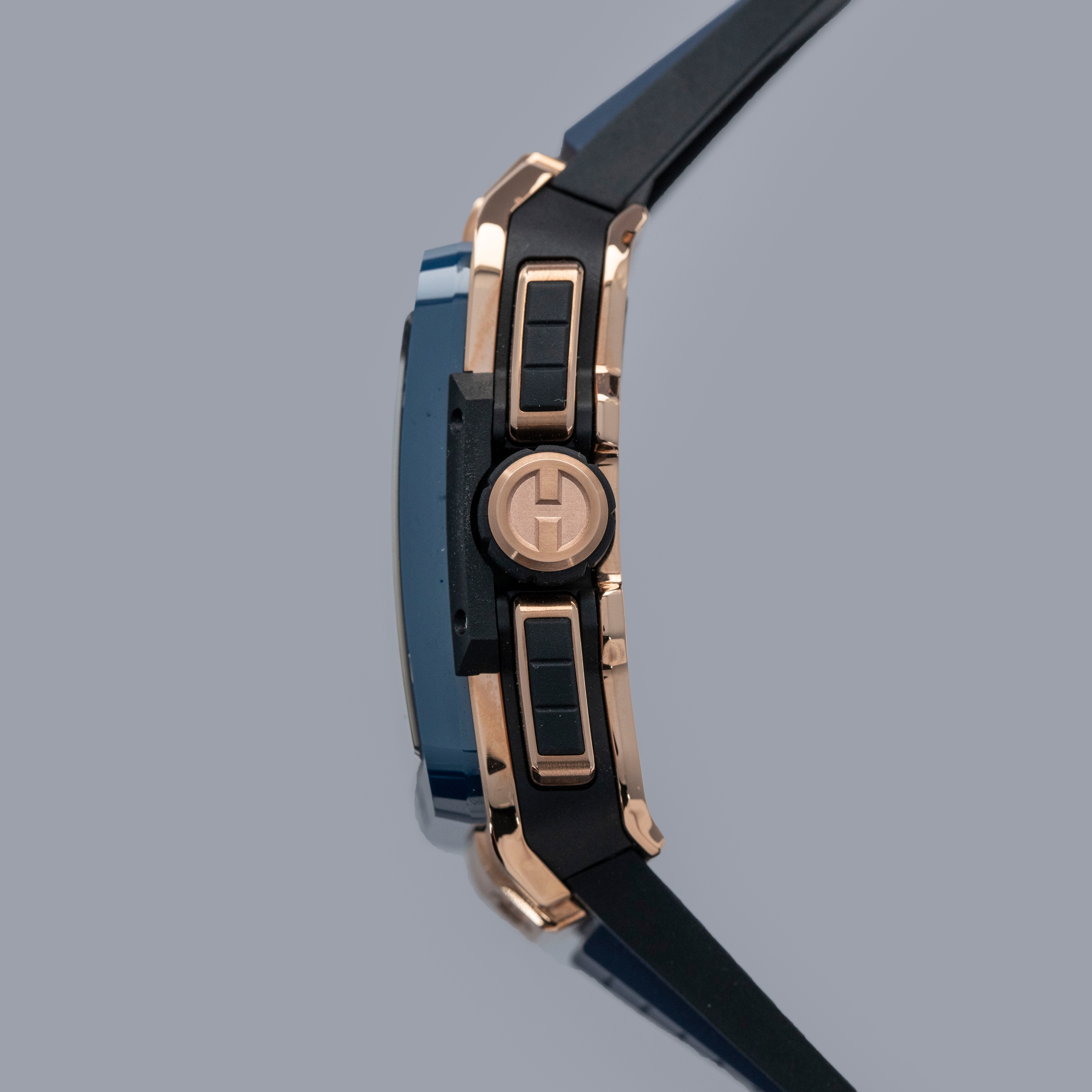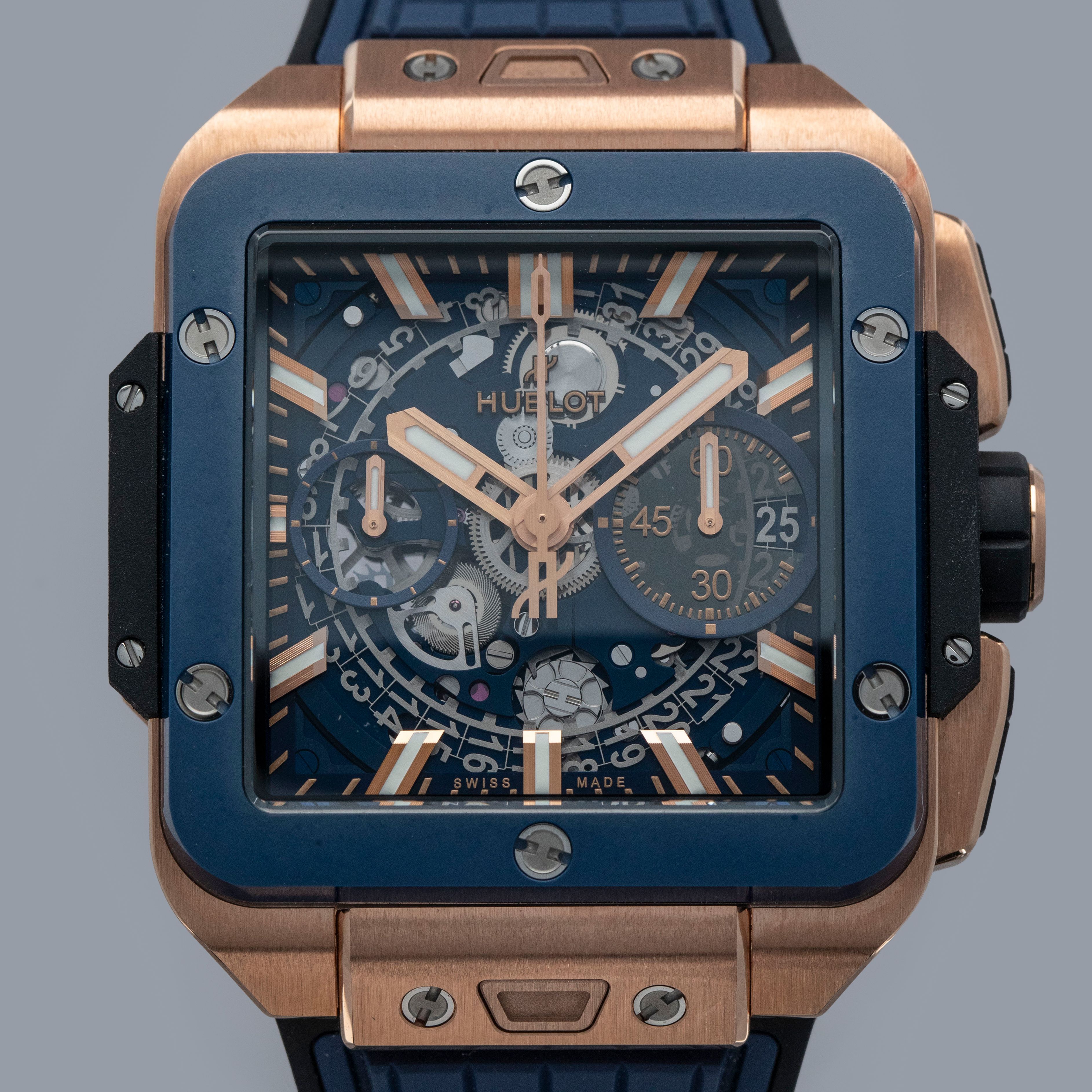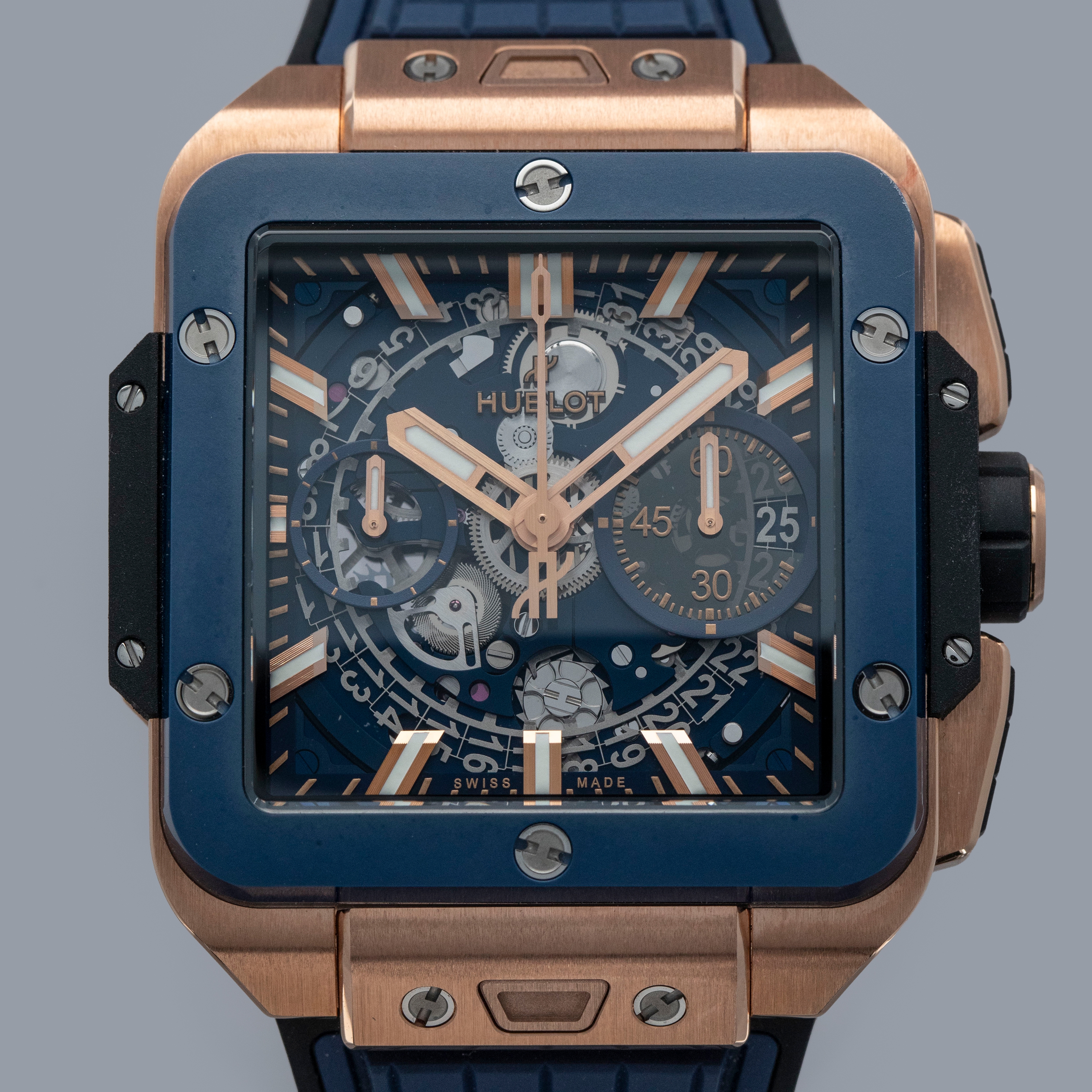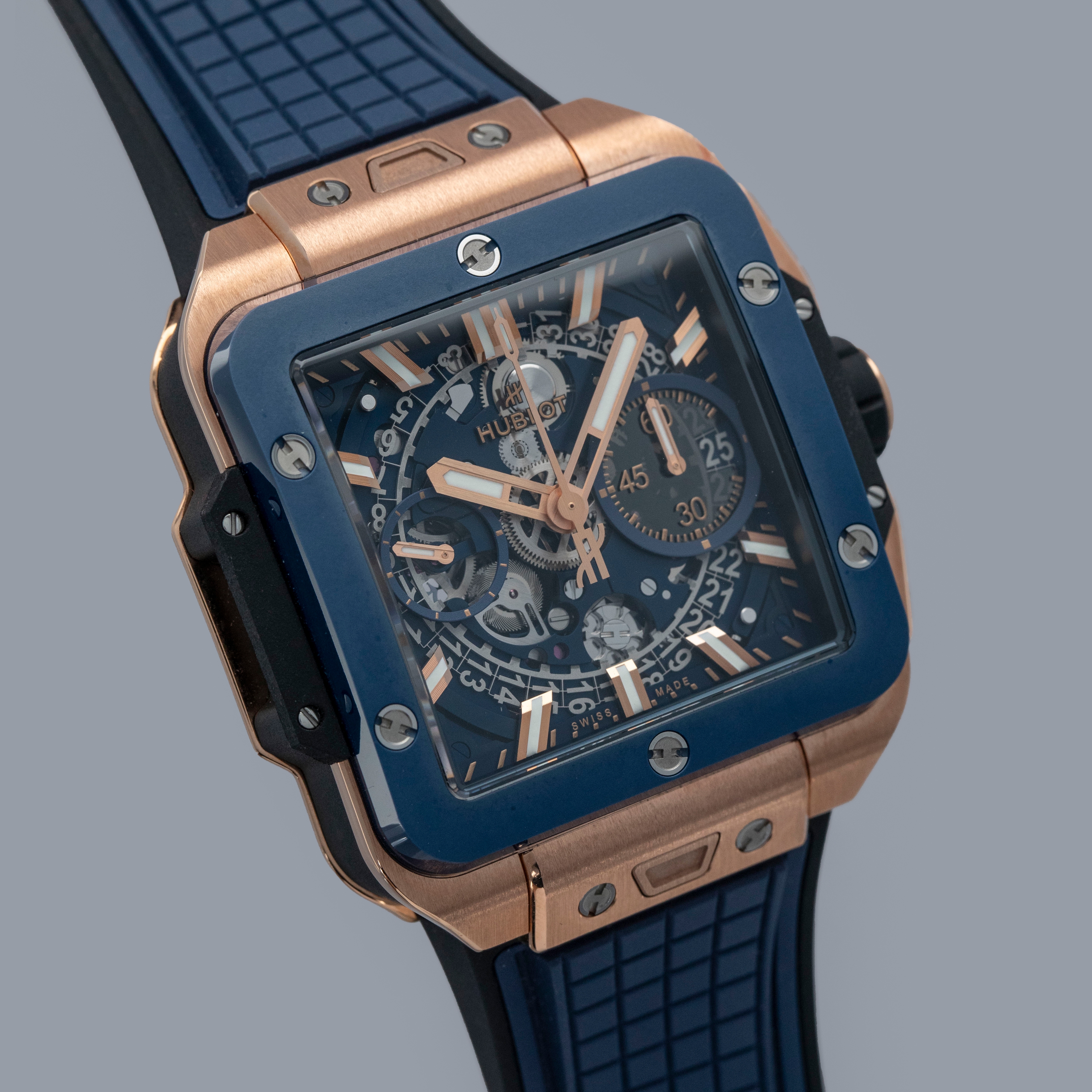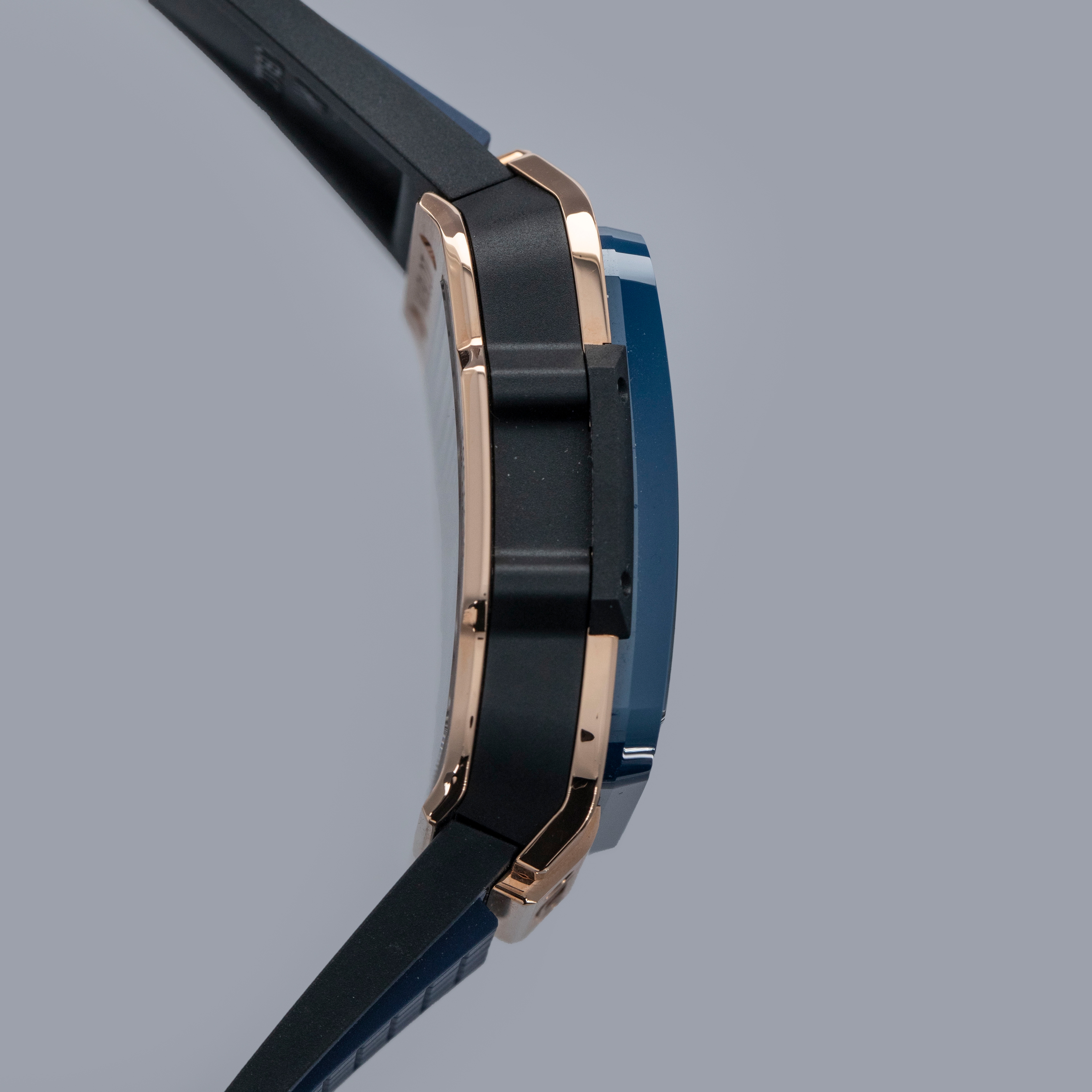 Famed for their entirely unique creations, Hublot has become a brand whose aggressive aesthetics have become synonymous with their impressive command of watchmaking and use of unusual materials. Offered here as a striking blend of modern design and technical mastery, the Hublot Square Bang Unico King ref. 821.0L.5180.RX. Emblematic of their brand’s avant-garde aesthetic, this 42mm timepiece features an 18kt rose gold blue ceramic construction attached to a rubber strap, as has been the brand’s signature since its inception. Boasting an openworked dial and movement, the ref. 821.0L.5180.RX’s display is entirely skeletonized, providing its wearer with an all-encompassing view of its automatic cal. HUB1280 Unico movement, which was the brand’s first in-house automatic chronograph, complete with flyback functionality and a column wheel for smooth actuation, thus seamlessly blending avant garde design with horological engineering. Perfectly capturing Hublot’s ethos of being a bold, innovative, and undeniably stylish watchmaker, the Square Bang Unico King is a statement piece that commands attention, as per Hublot’s raison d'etre.