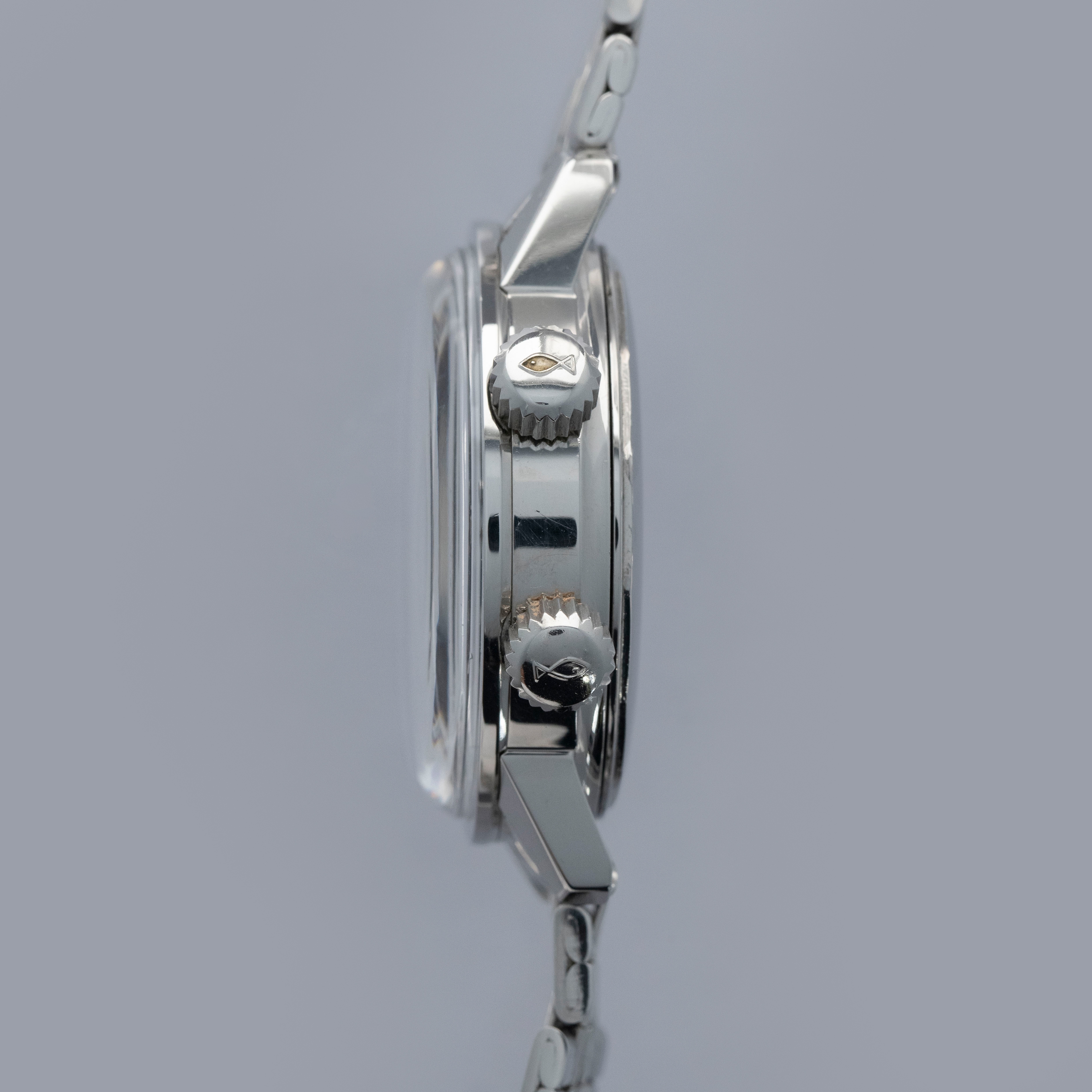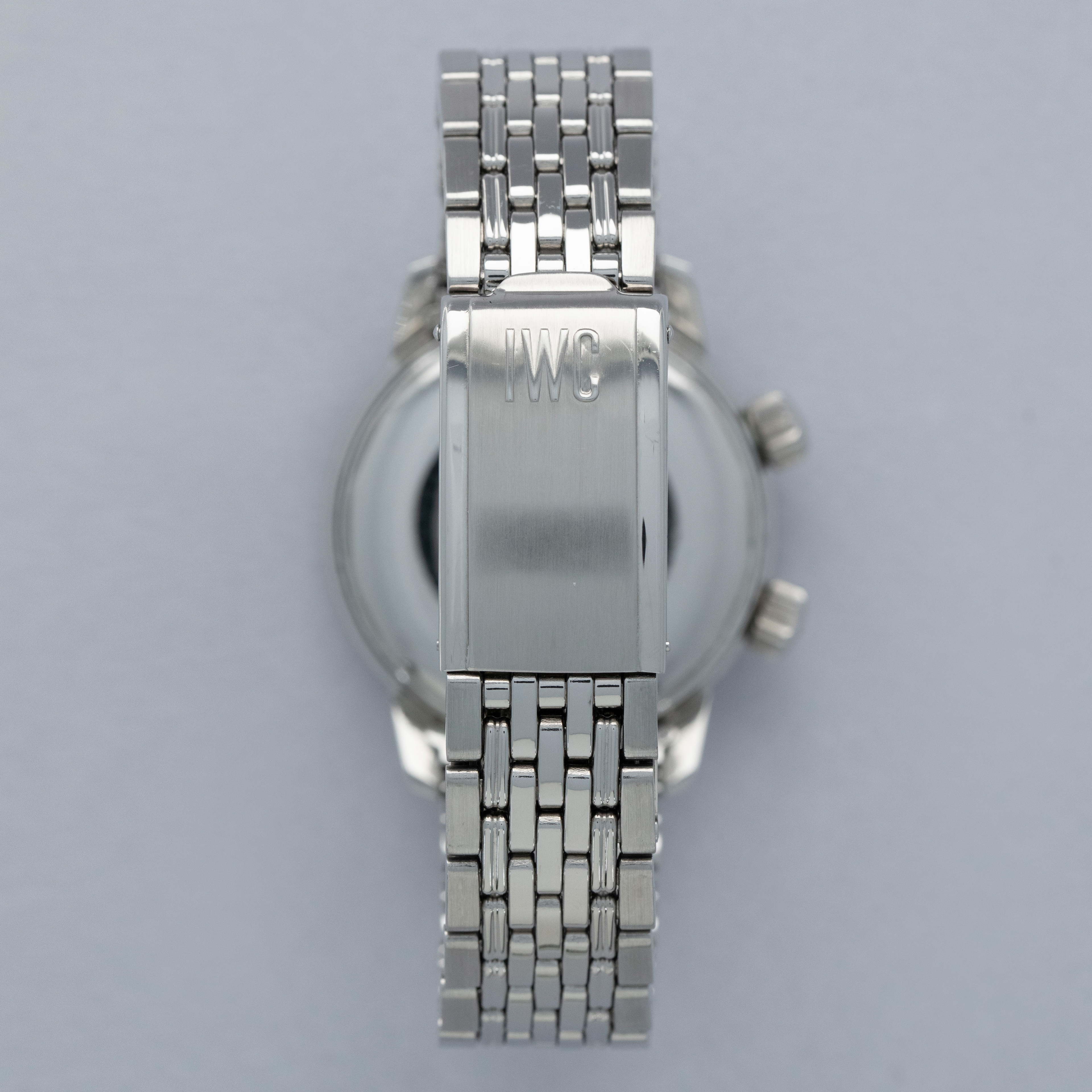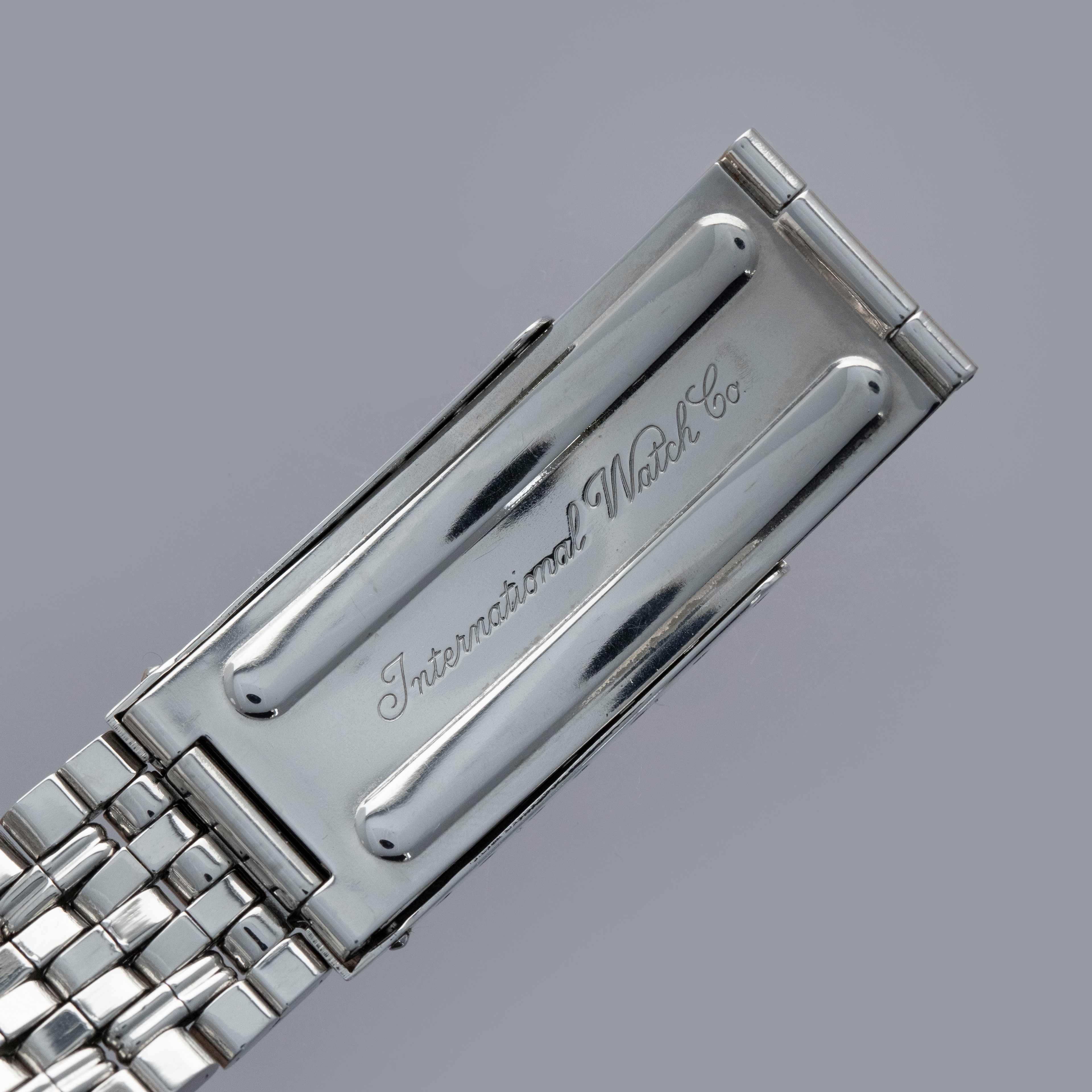 Watch is in overall excellent condition. The steel Super Compressor case shows surface scratches and marks, while the tetradecagonal case back displays light surface scratches and retains a well-defined embossed design in the centre. The IWC fish-insignia crowns are both present and remain in excellent condition. The dial shows some light surface marks, while the rotating inner bezel remains very clean. There is some discoloration visible to the lume in the hour markers, and the date window frame shows light oxidation. The hands appear to have been relumed. It is fitted with its original IWC beads-of-rice style bracelet in excellent condition. The bracelet is fitted with 18 links and fits approximately a 7½” wrist.