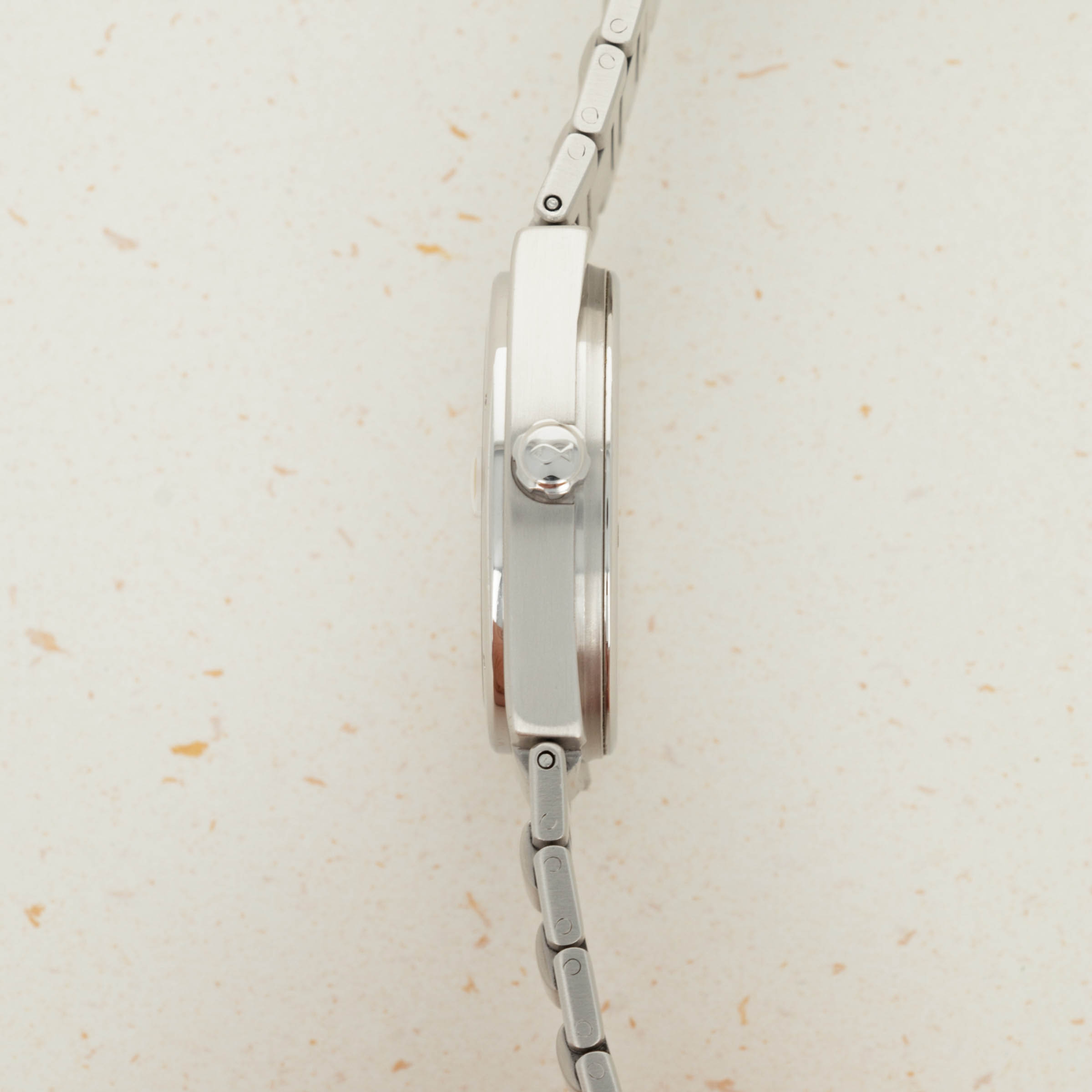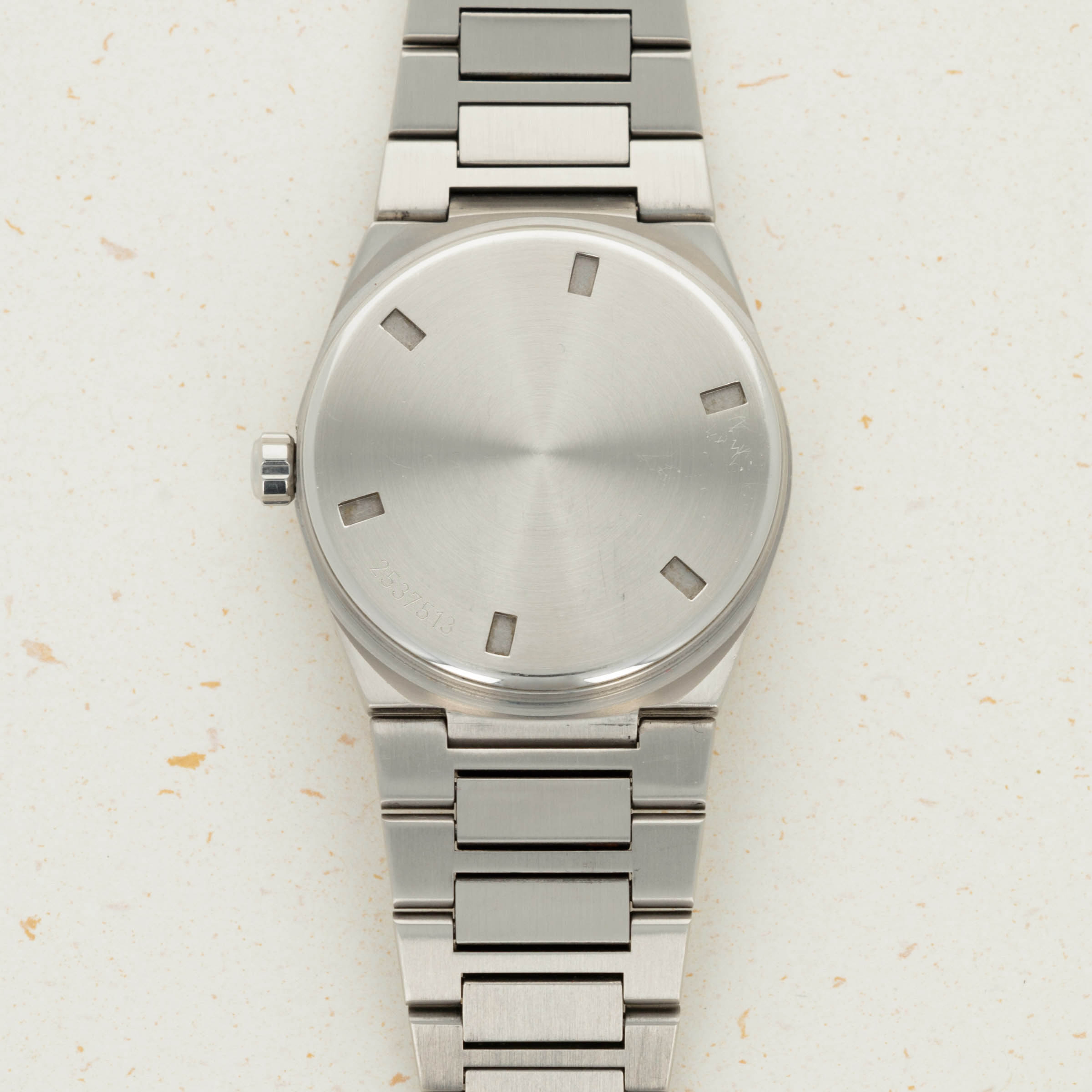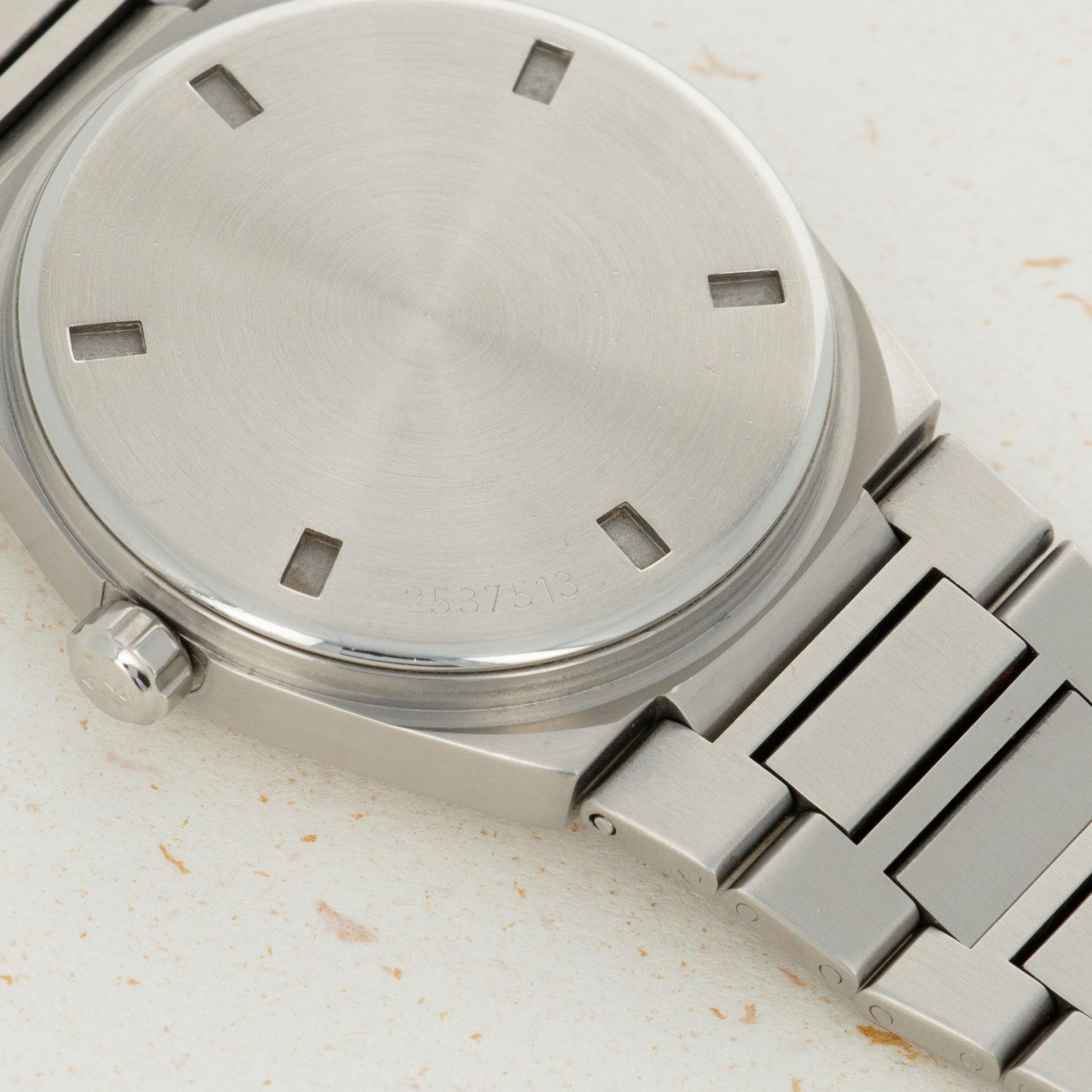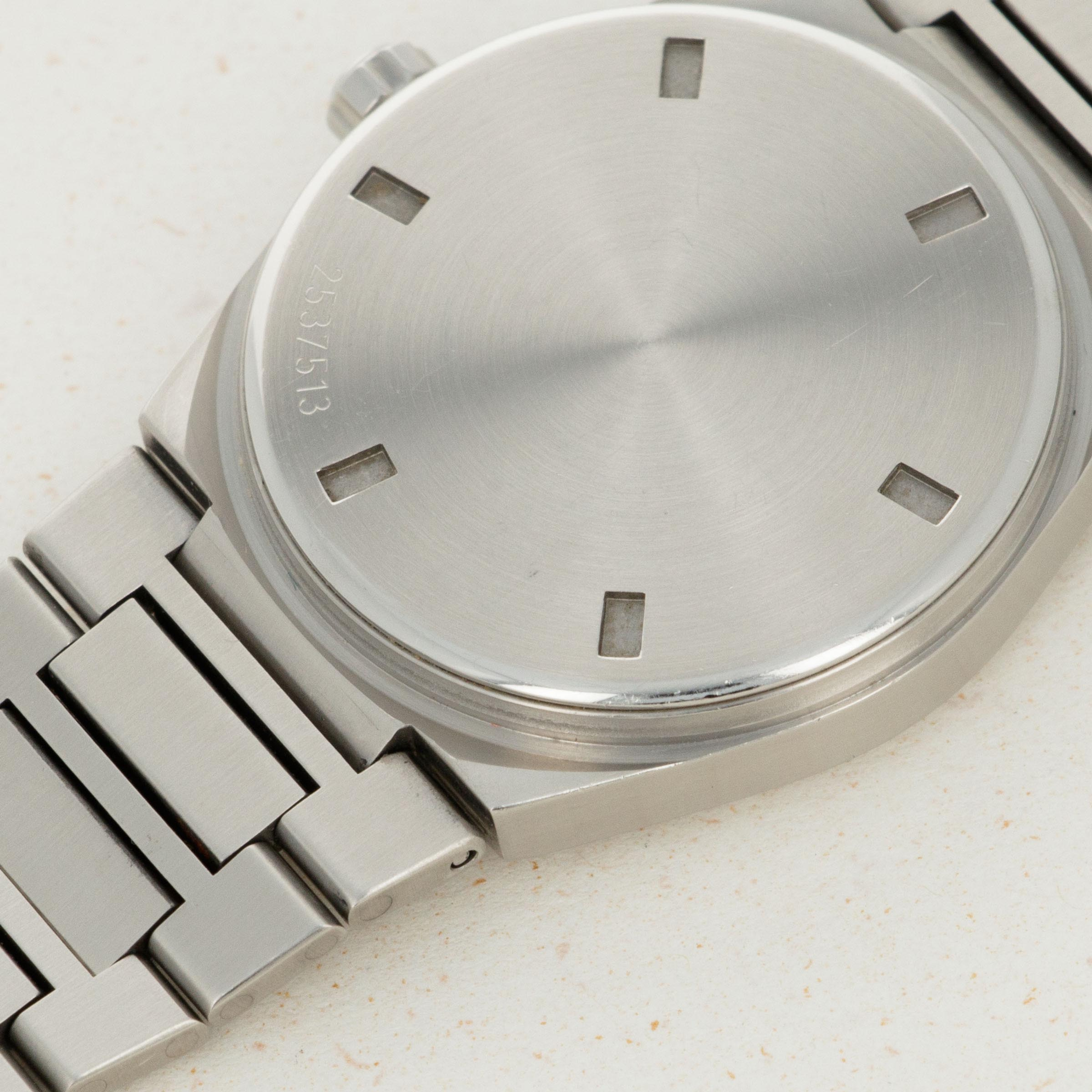 In very well preserved condition. The dial is excellent and the gold numerals and hands with minor tarnish. The case and bracelet are equally well preserved with nice proportions and case lines. There is only very slight surface wear to both the case and bracelet. The case back with still very clear and easy to read case number. The bracelet with 20 links, 2 removable.
