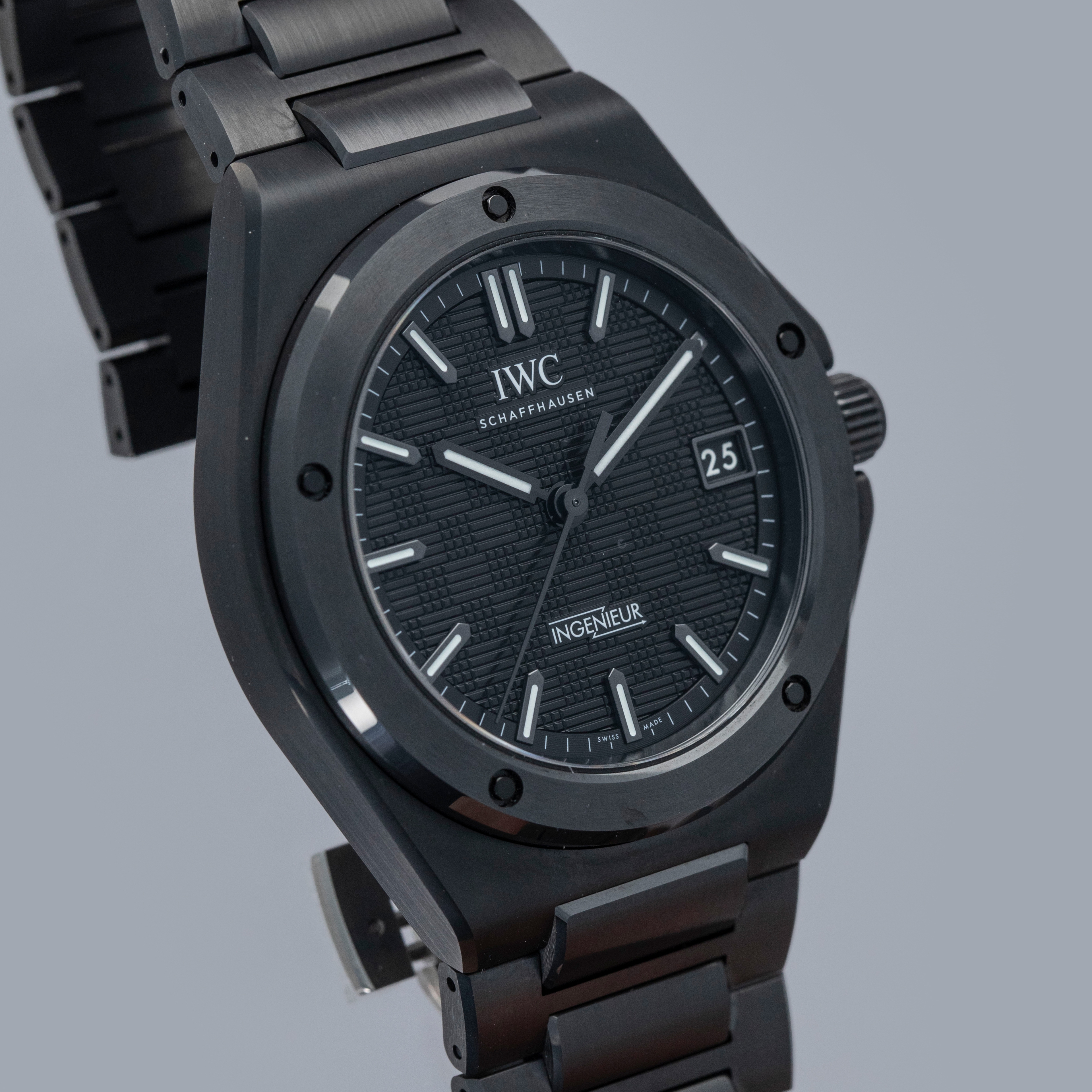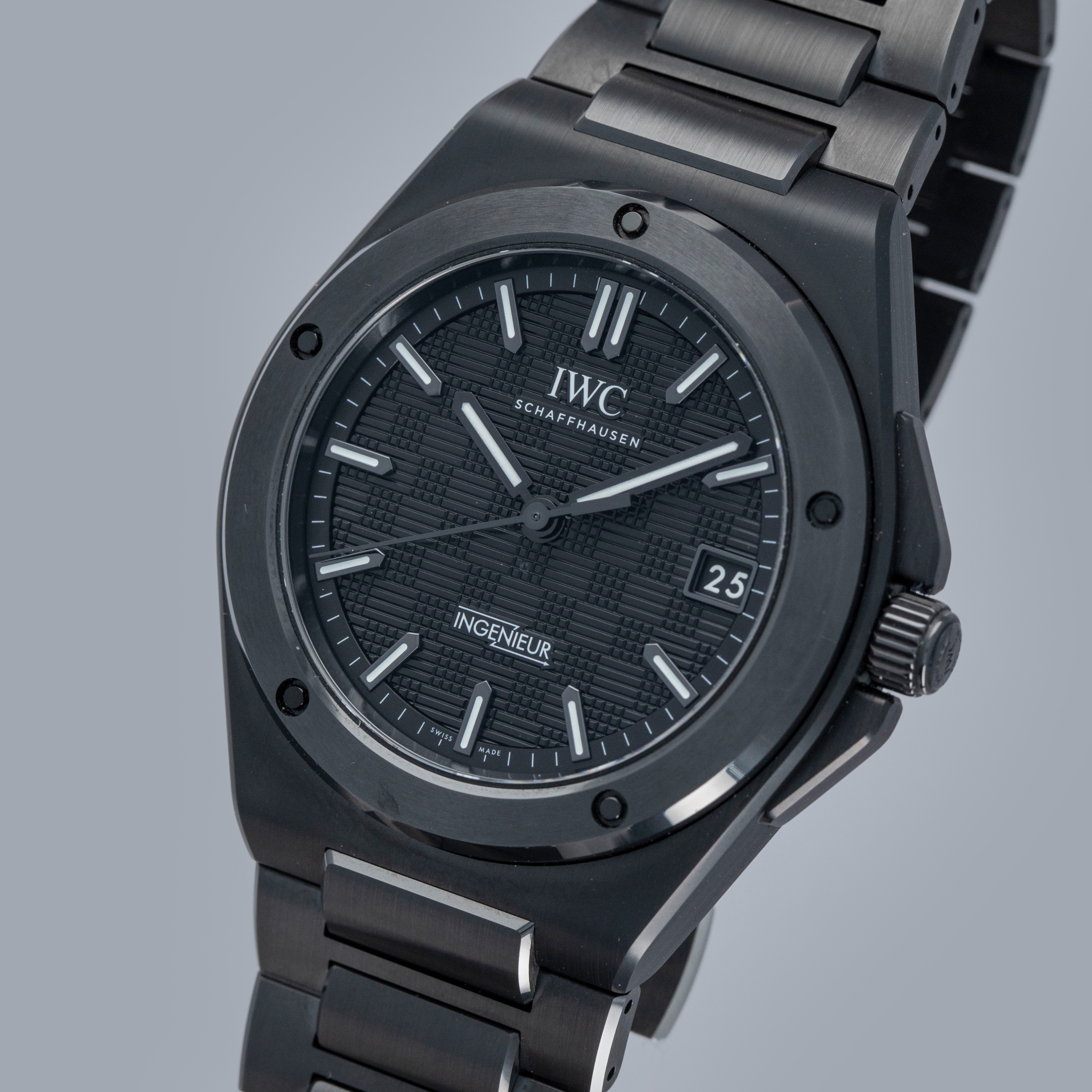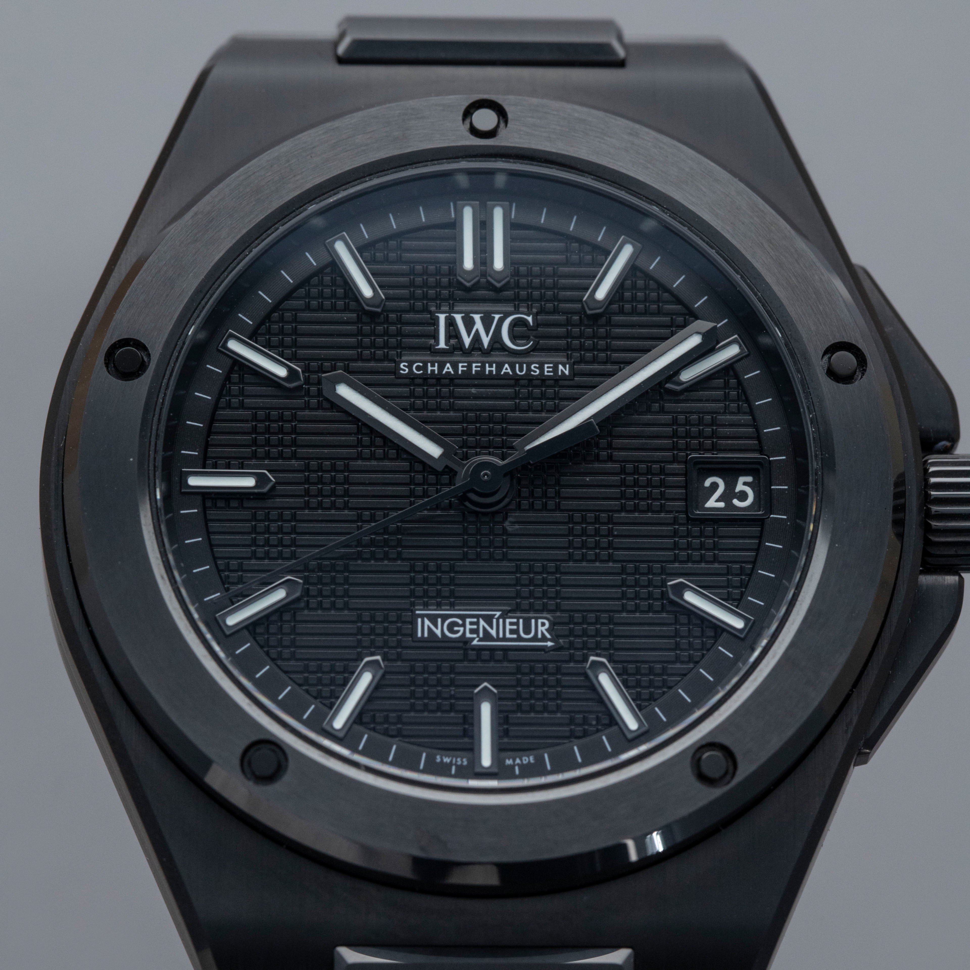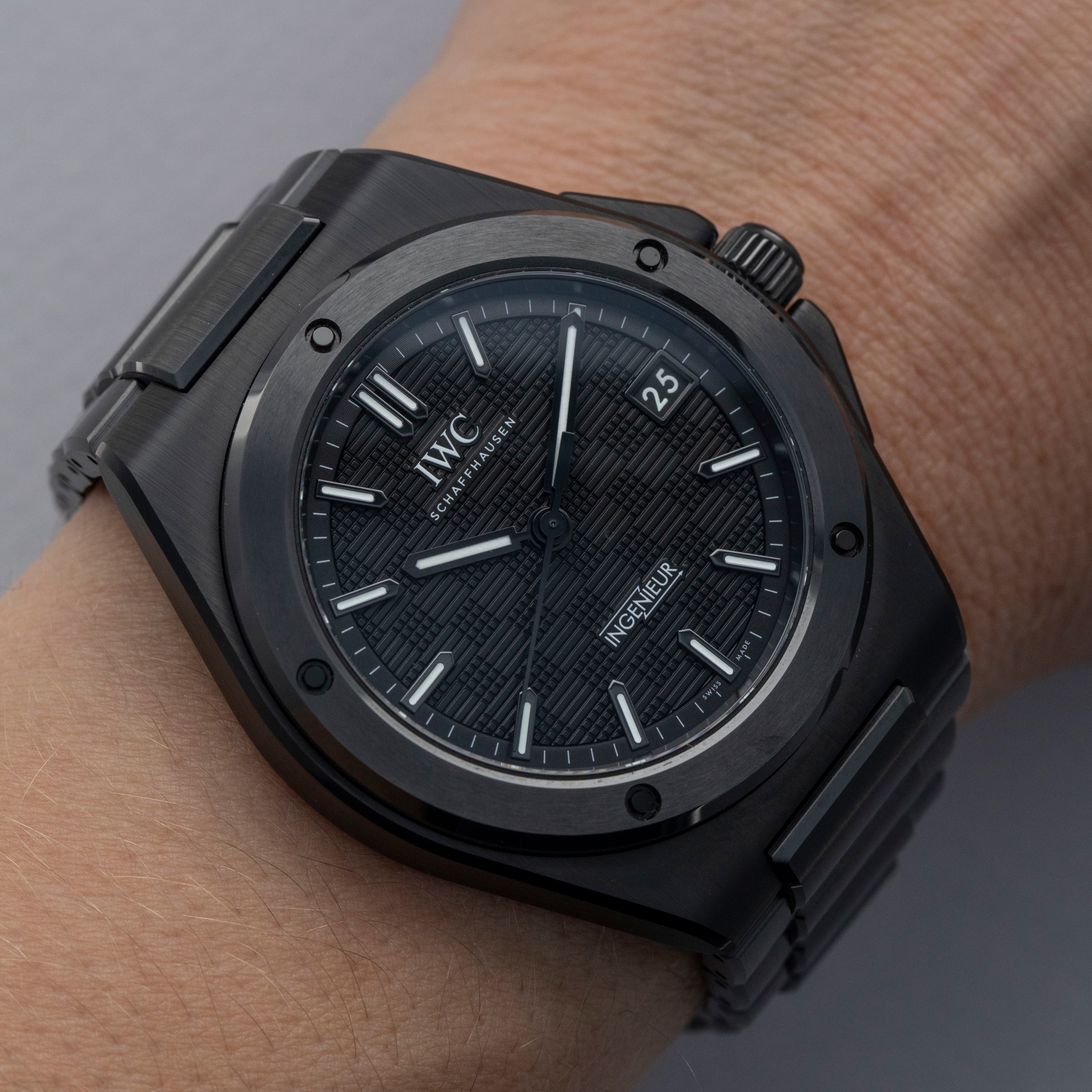 Featuring a black dial with a crosshatch textured pattern made up of blocks with alternating engraving directions, the Ingenieur's dial has a wonderful depth to it.
