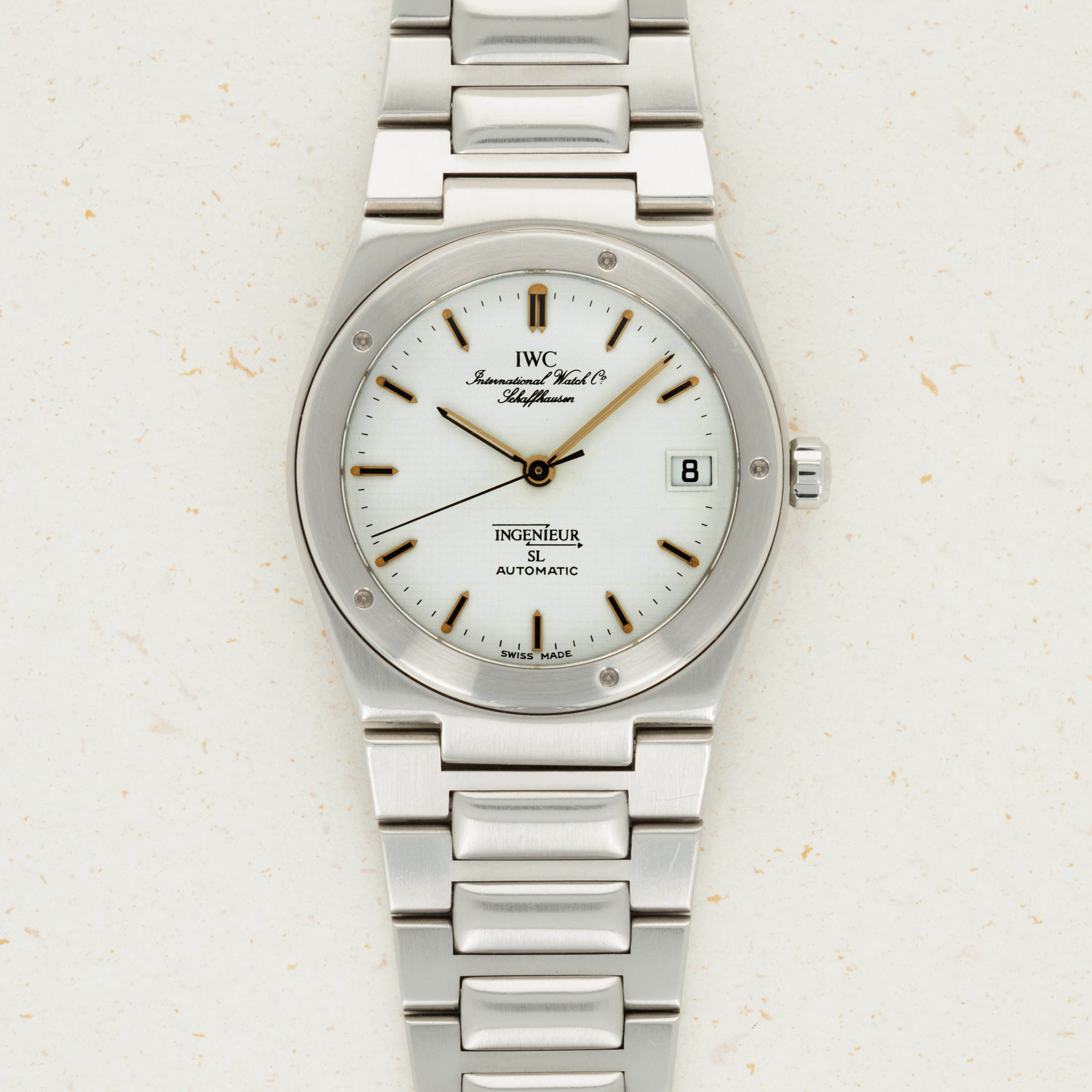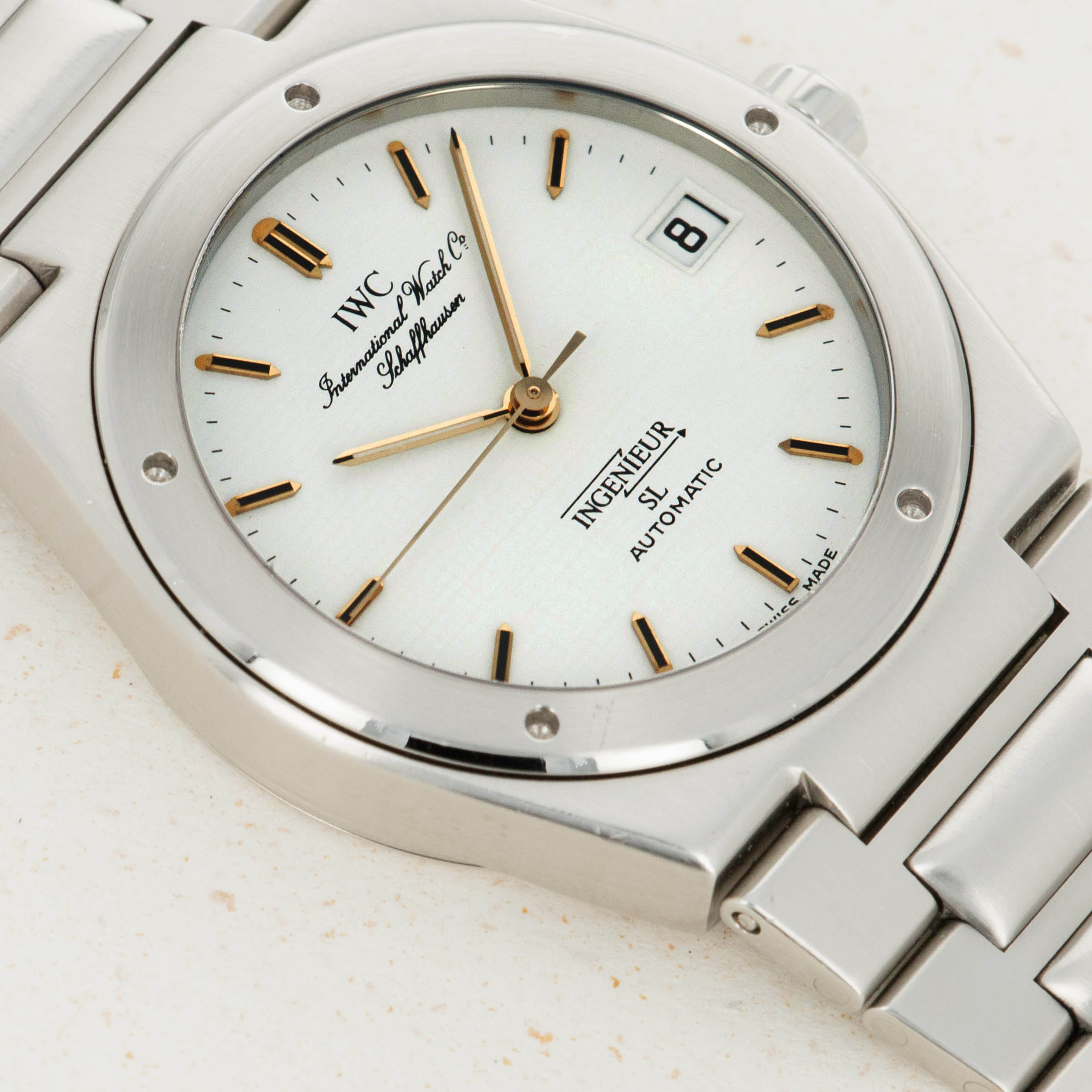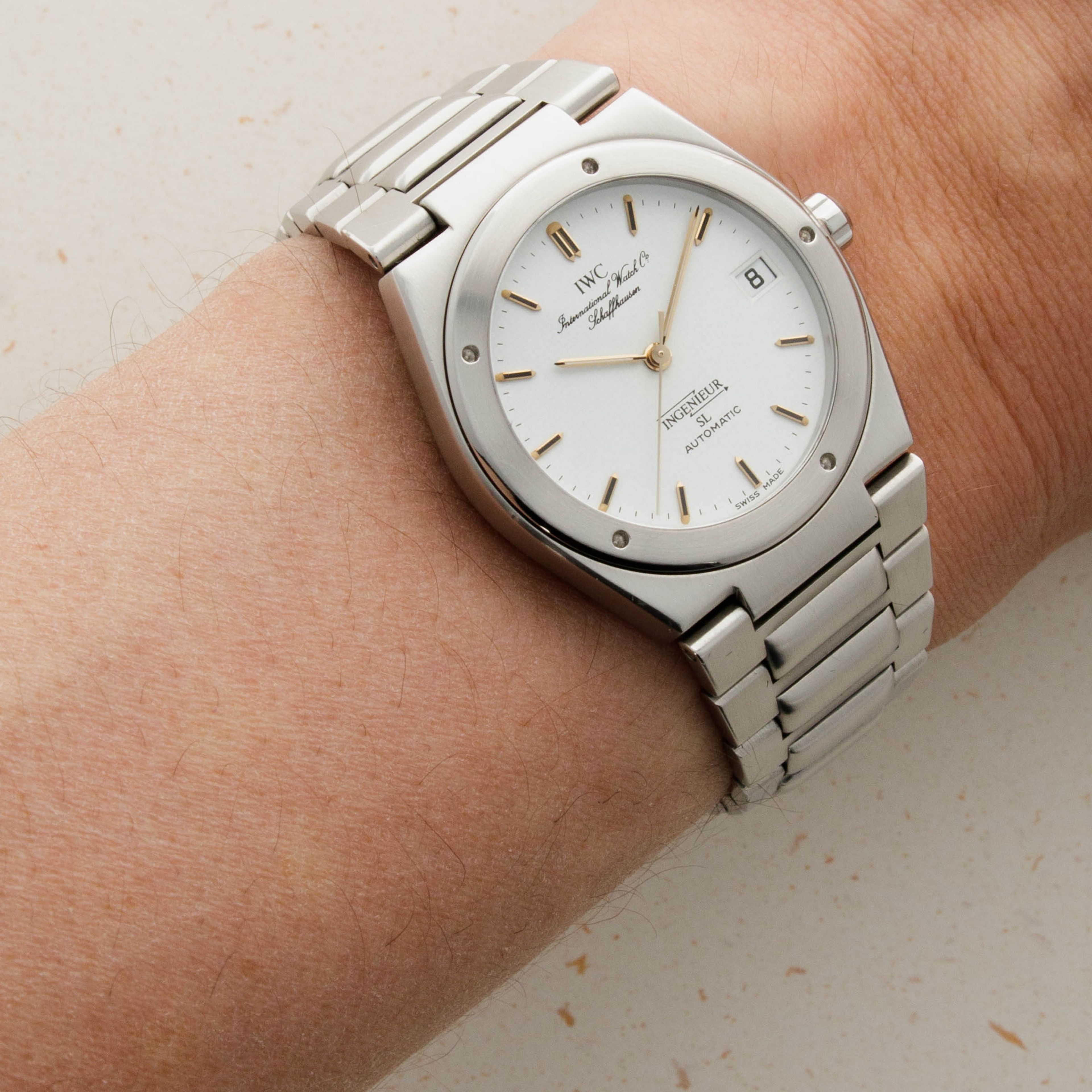 With its gold hour markers and hands, the Ingenieur's subtle crosshatch texture within its white dial is difficult to see without taking a closer look.