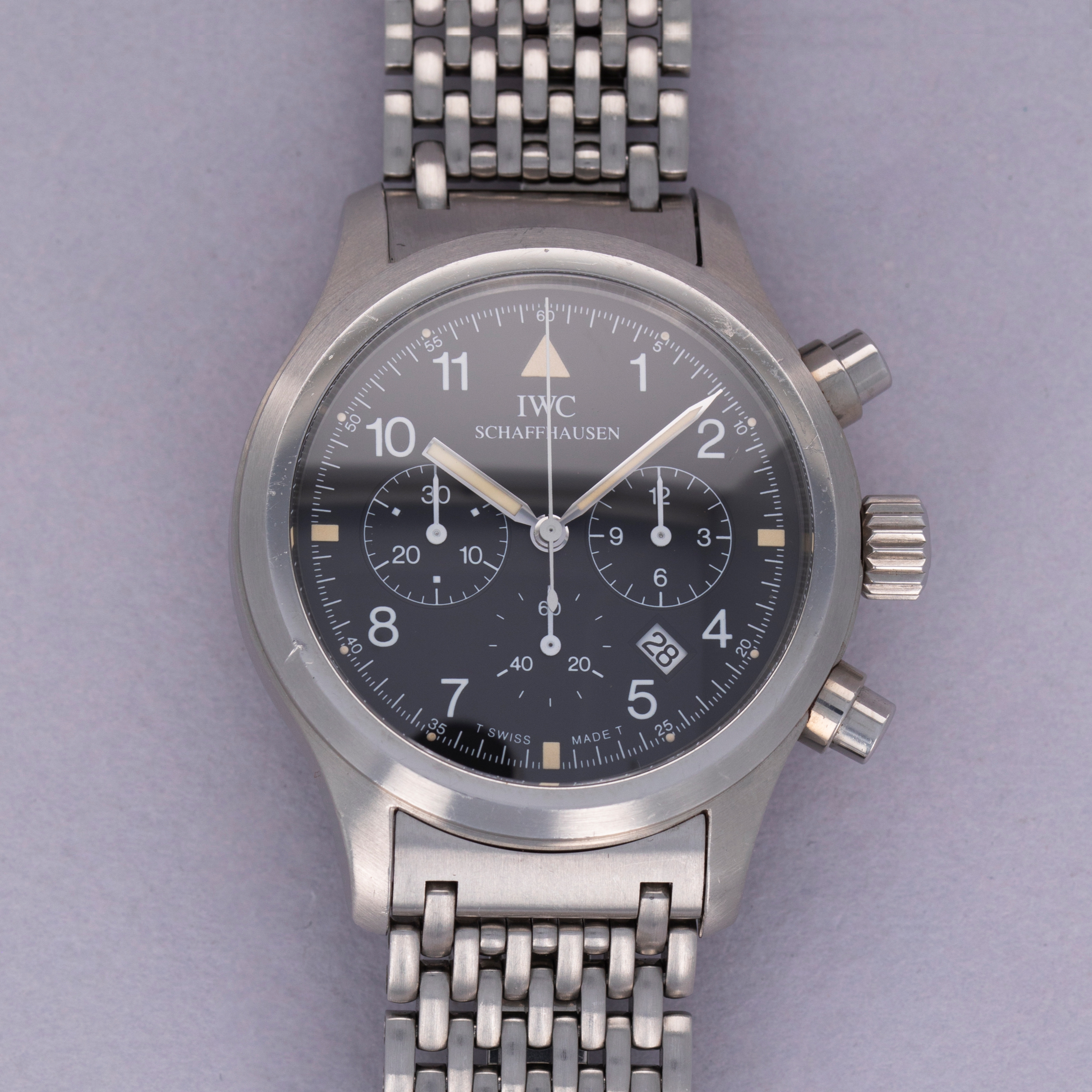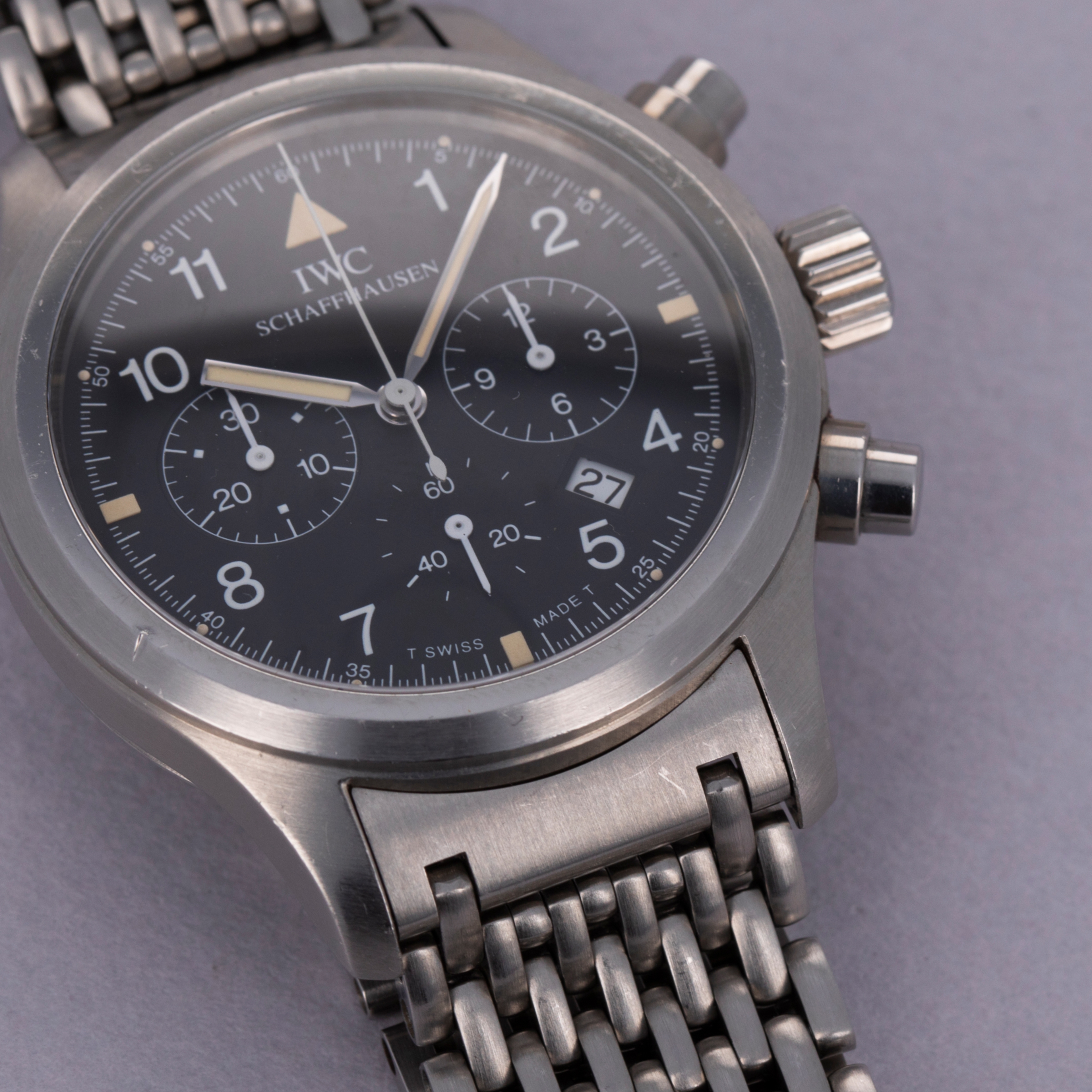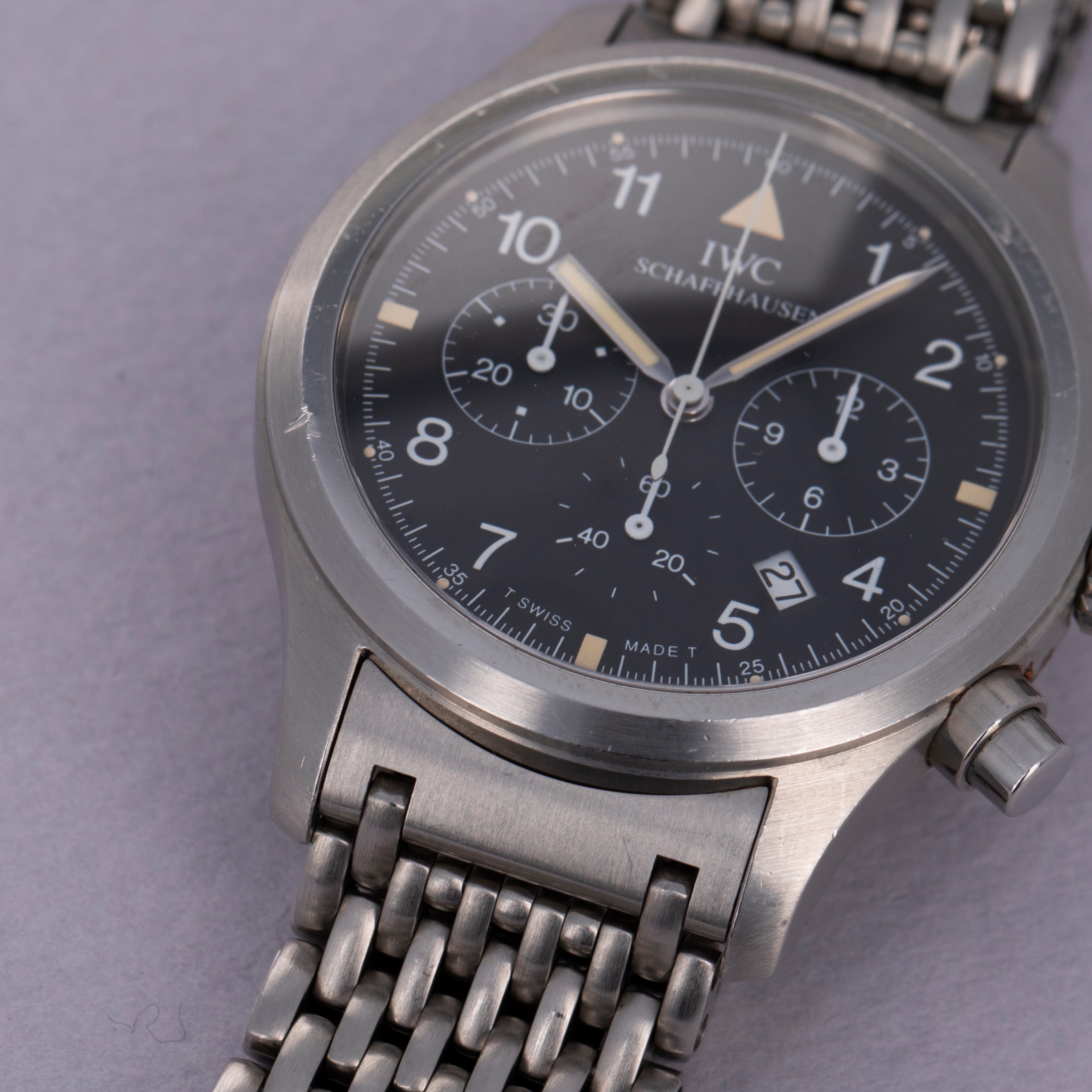 Offered with the original tritium dial as showcased by the two letter Ts in "T SWISS MADE T" across the 6 o'clock periphery of the black dial, this ref. IW3741's hour markers and hands have aged to include a wonderful orange patina that is a highly cherished detail among collectors.