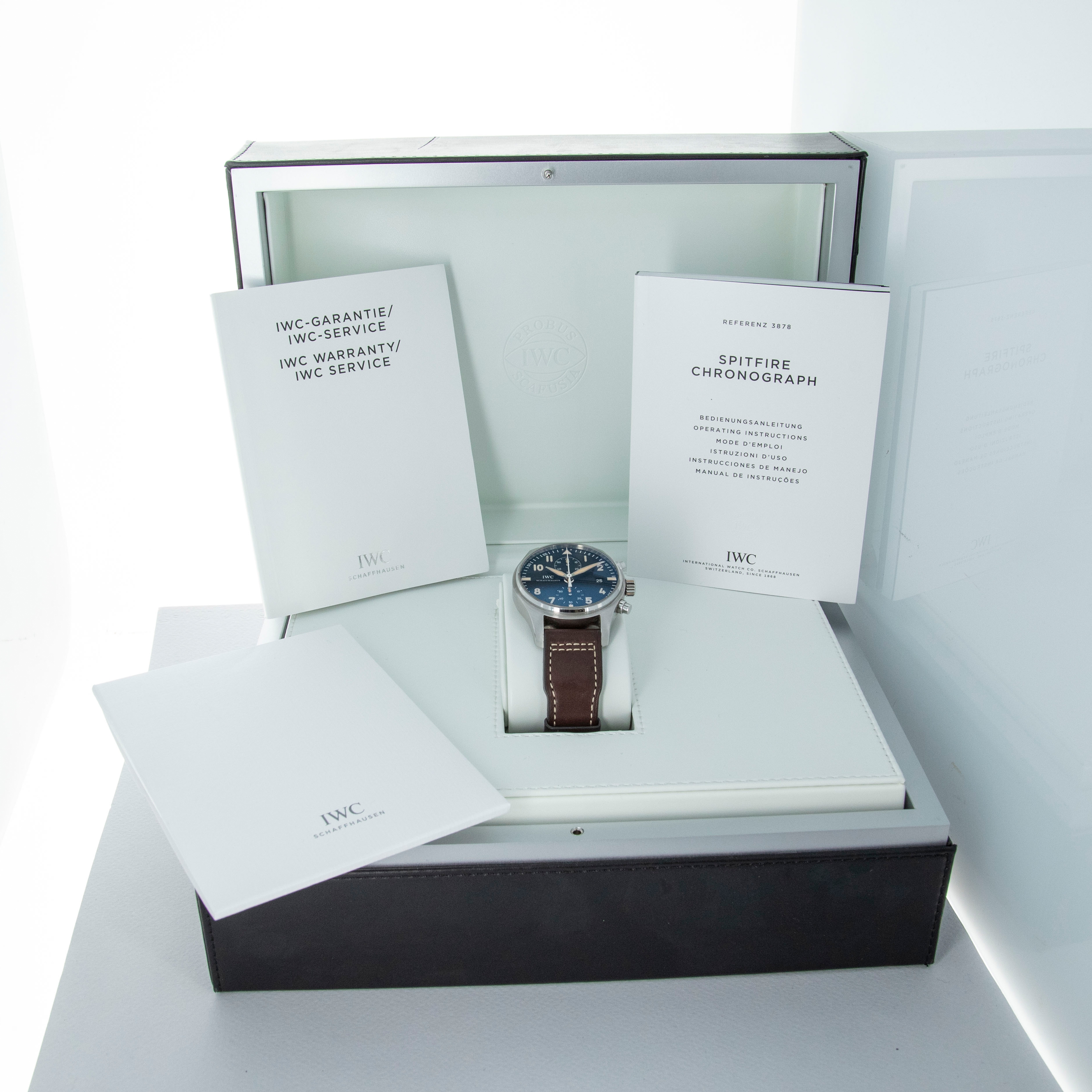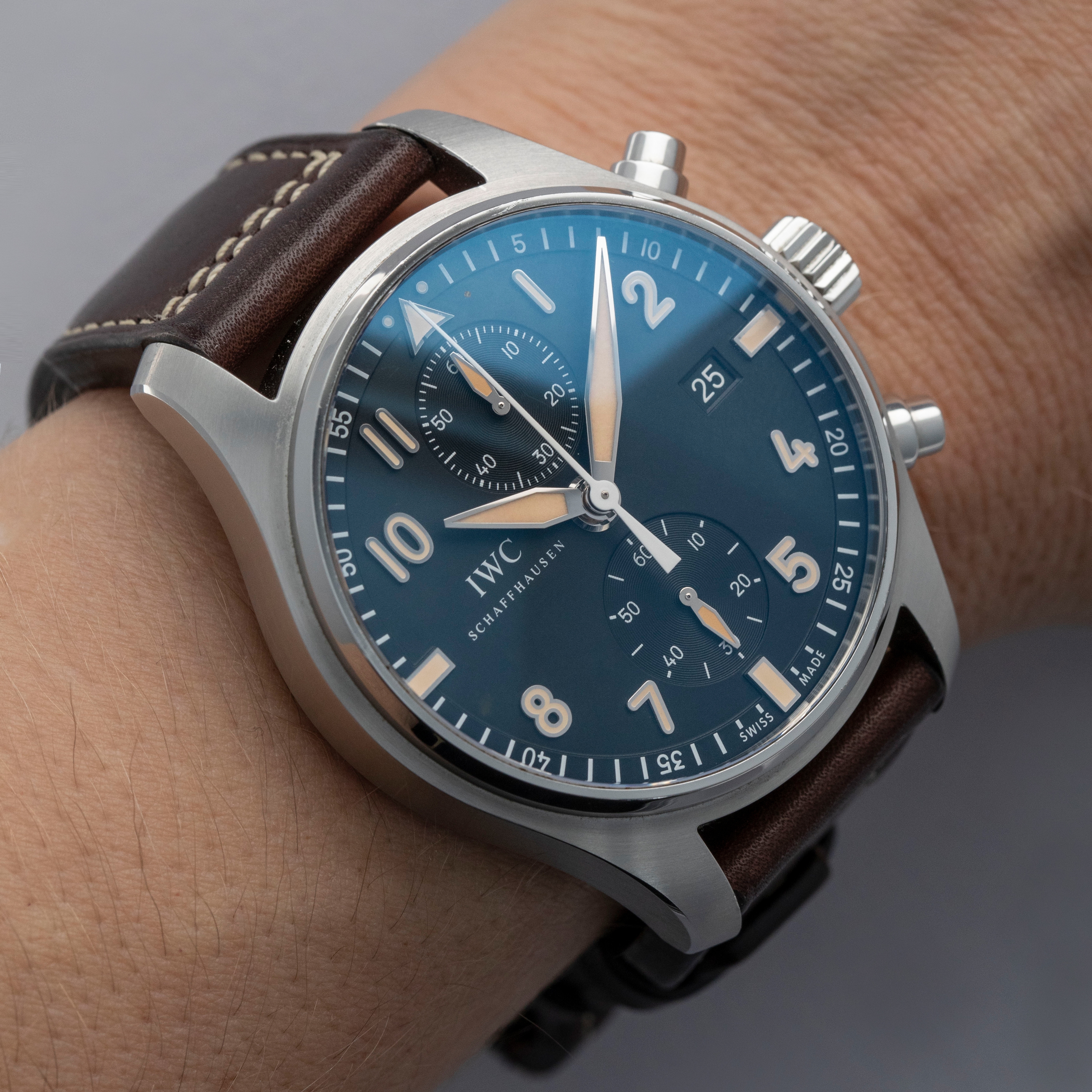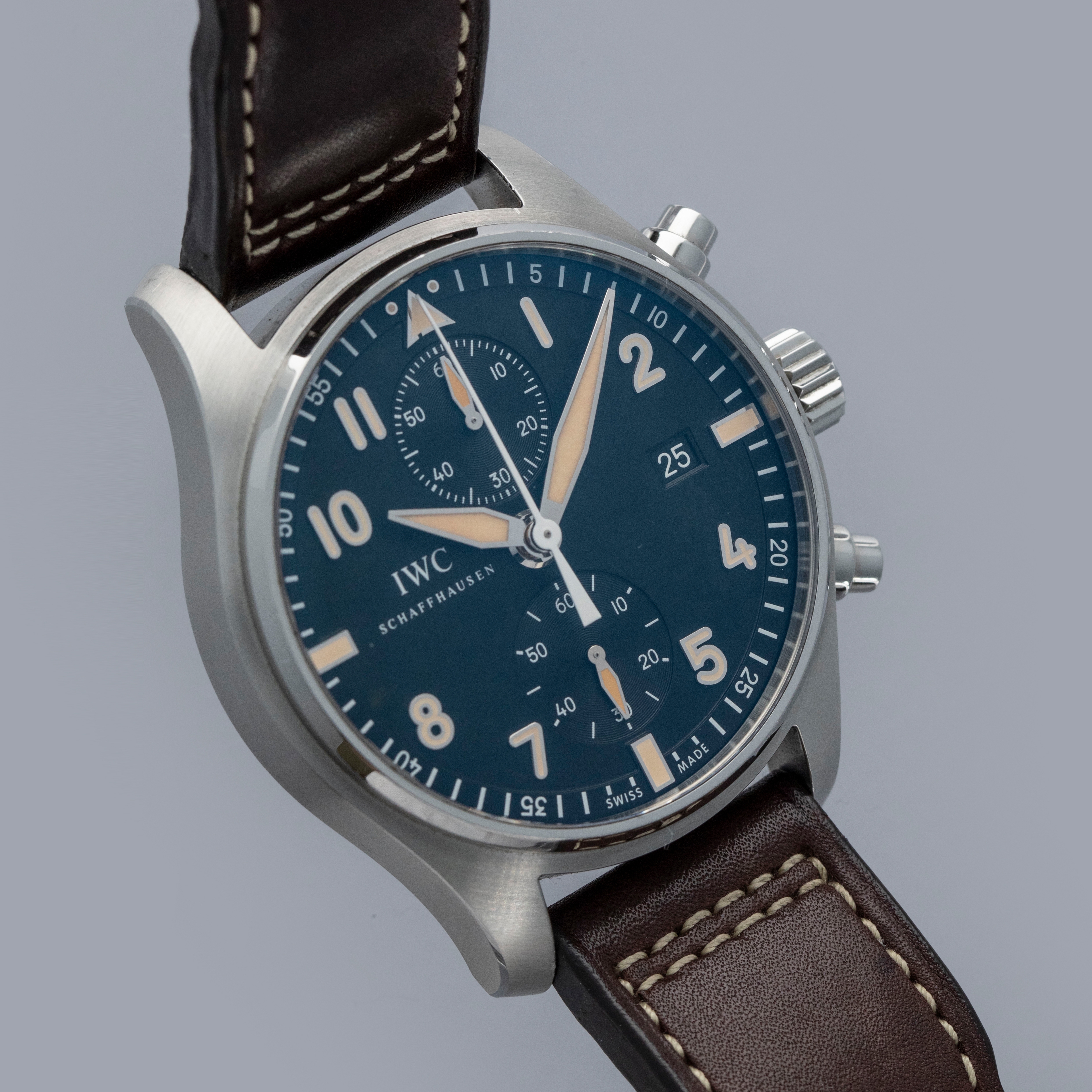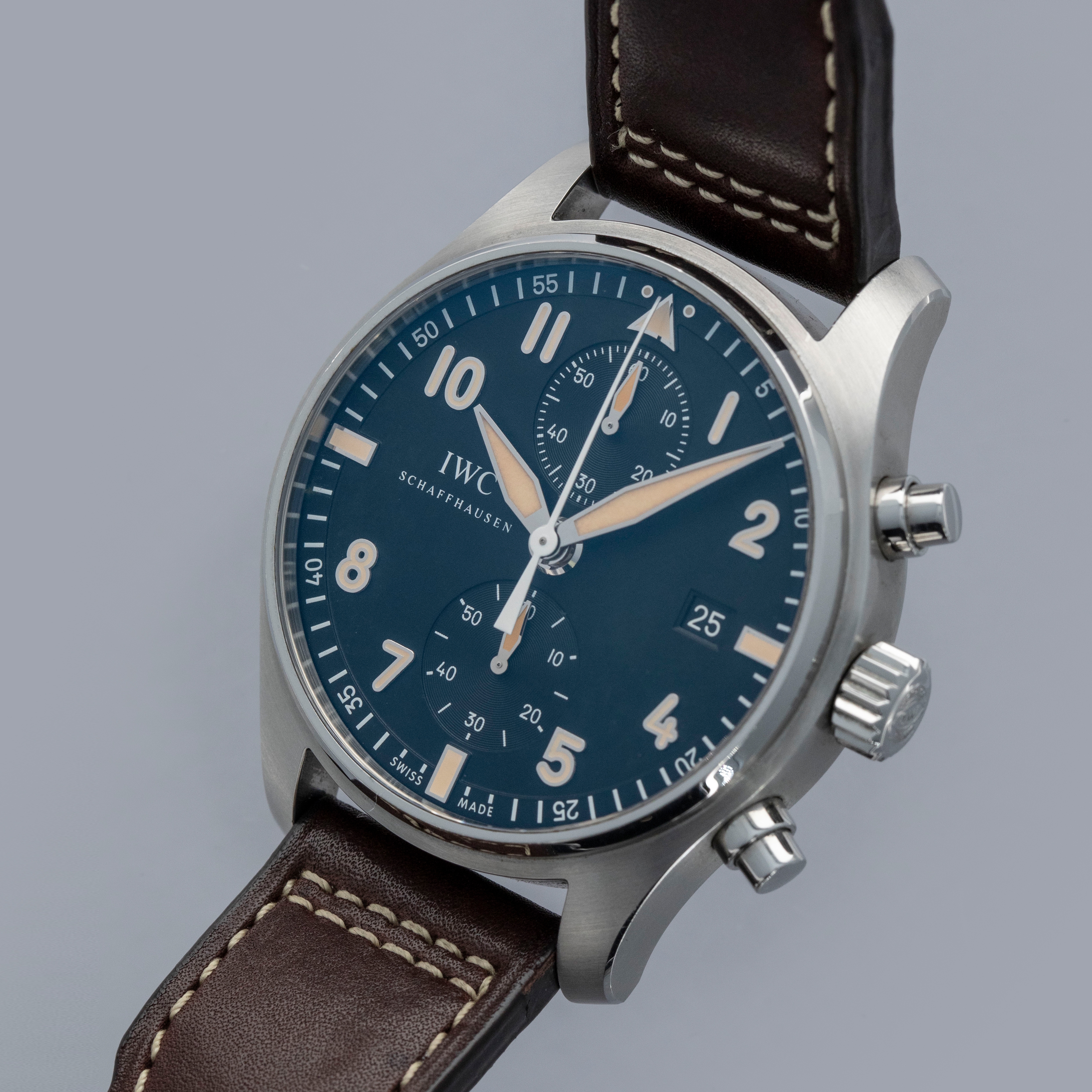 Boasting a powerful 43mm stainless steel construction, the IW3878-08 offers IWC's distinctive wrist presence with its thin bezel, shielded pump pushers, and large footprint.