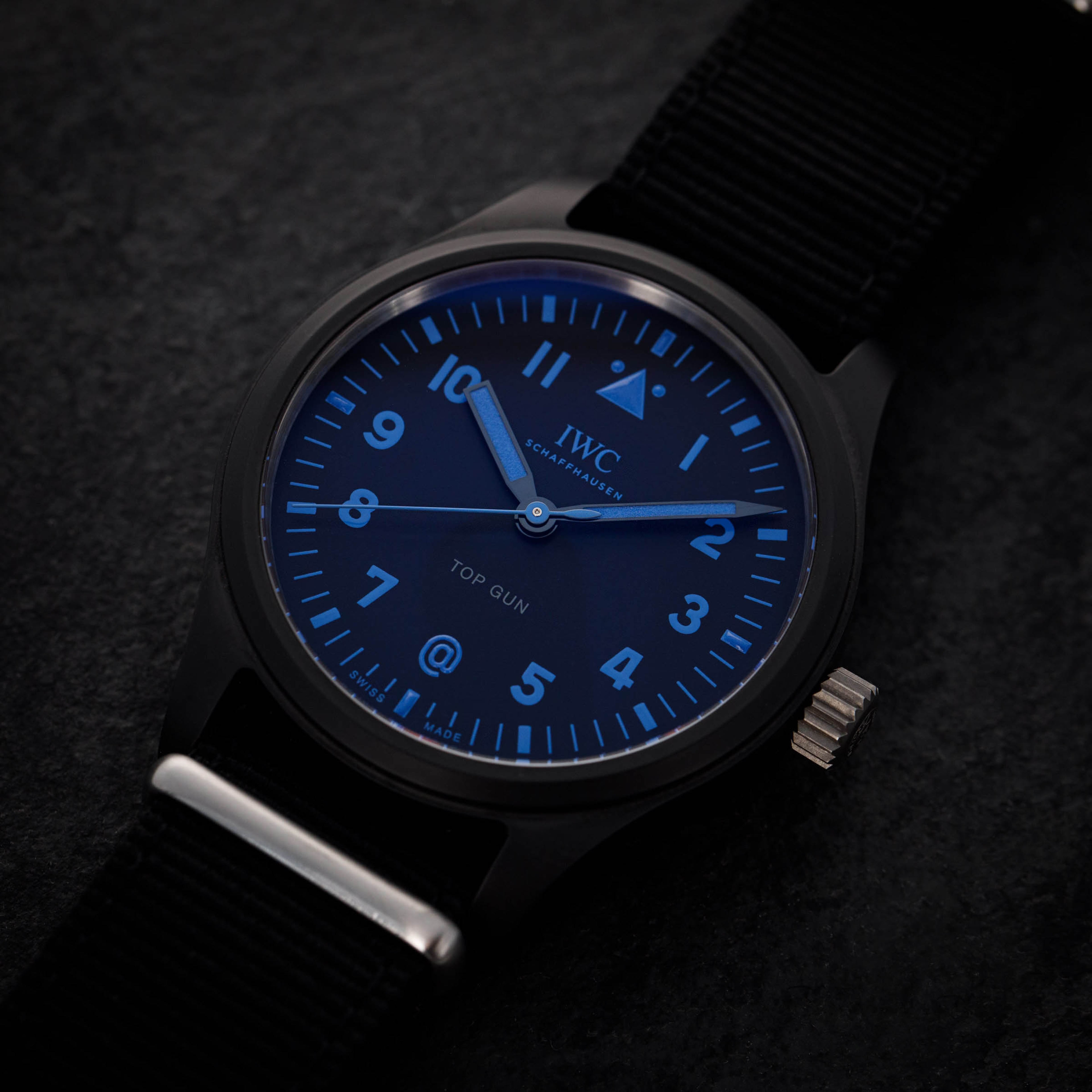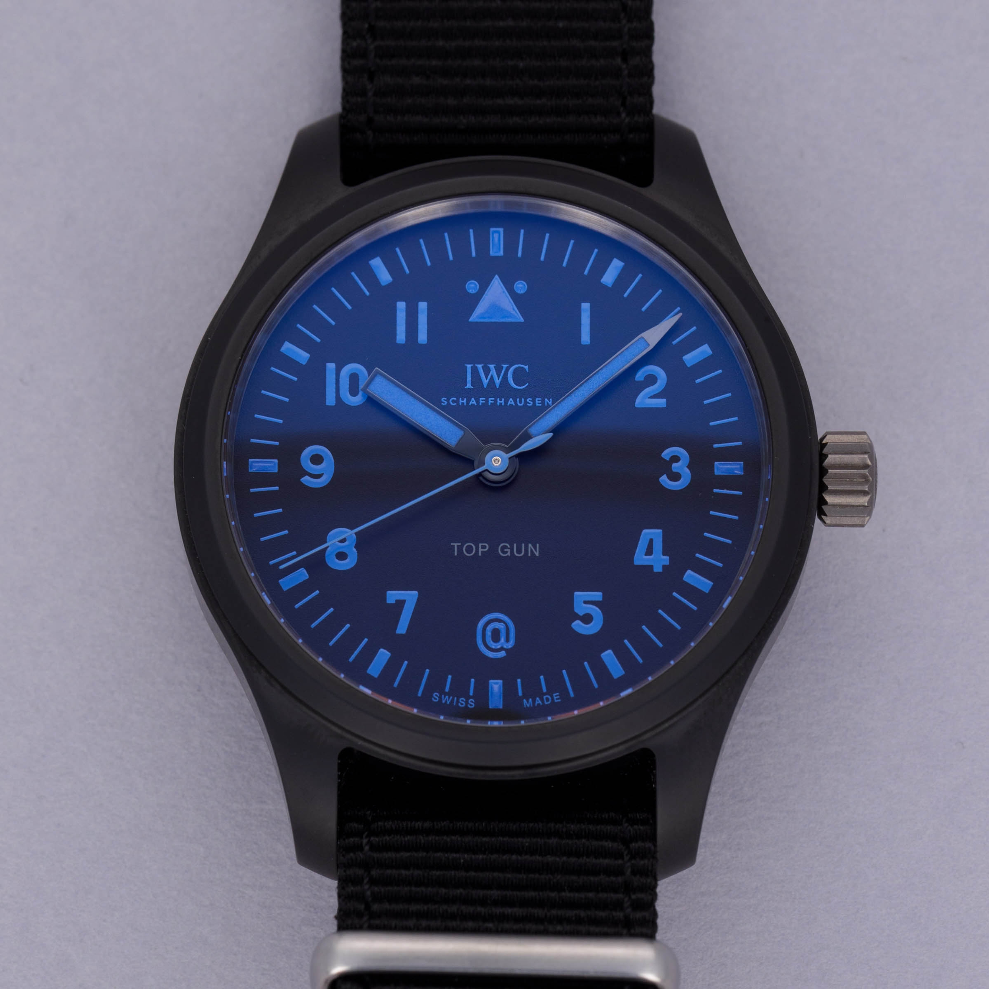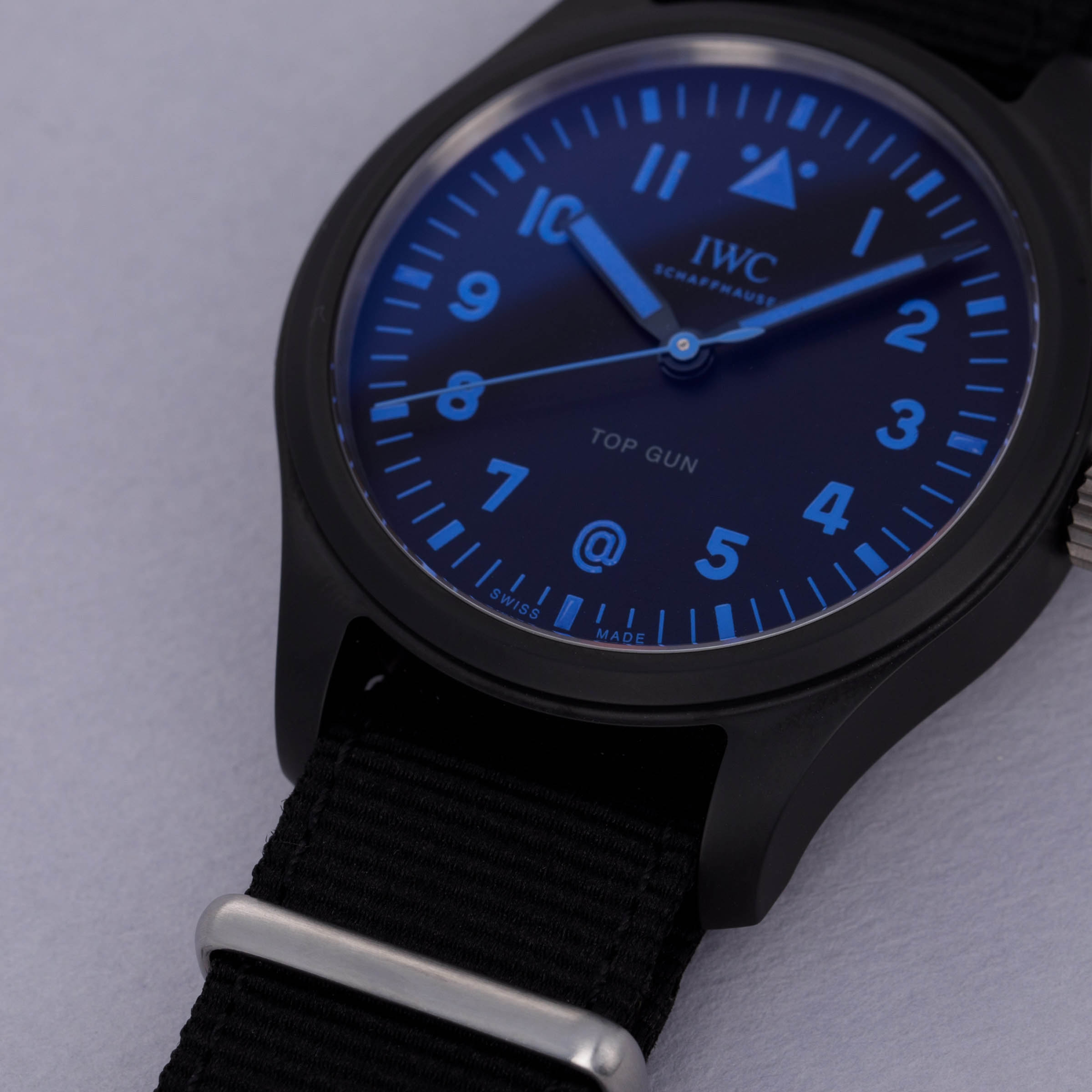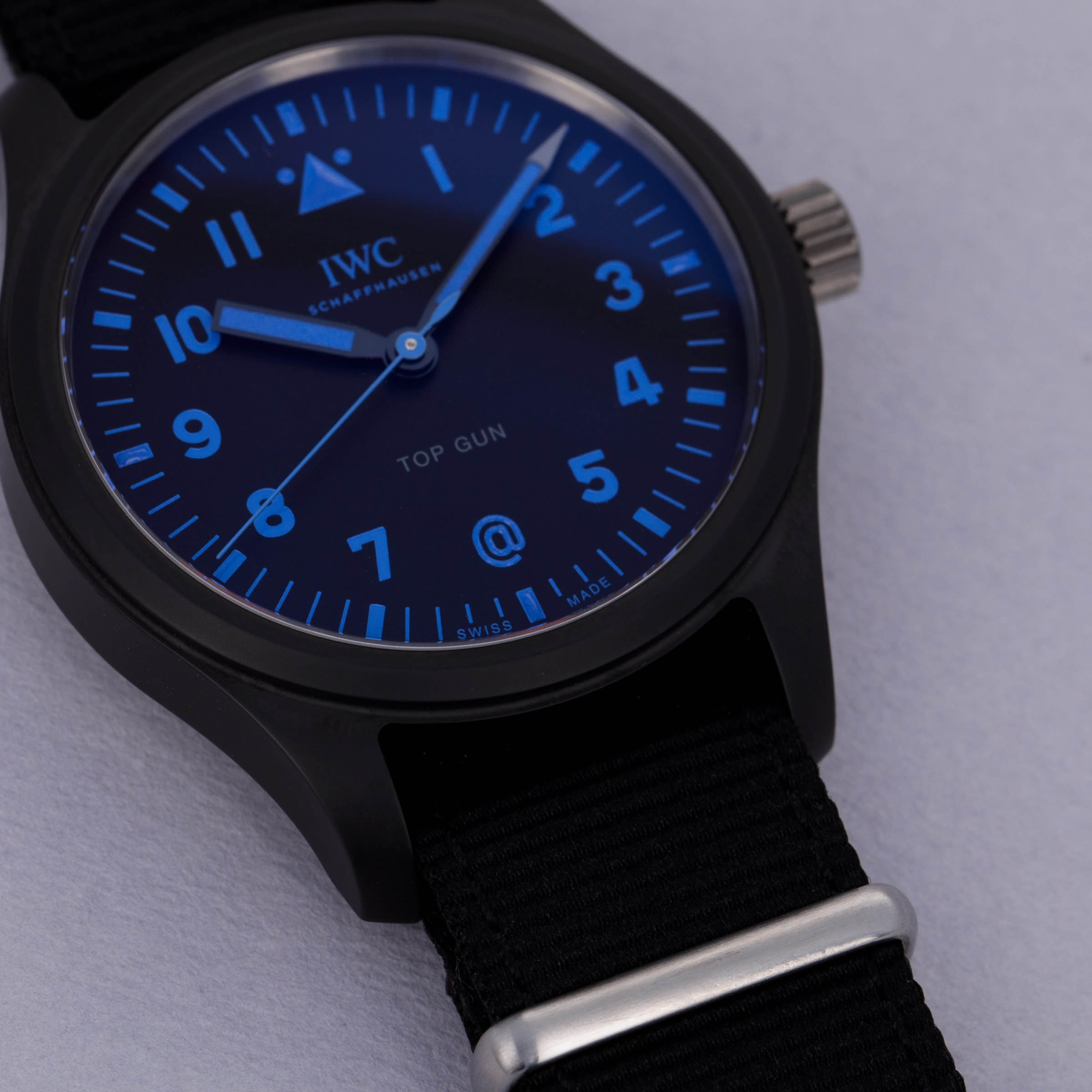 Incredibly rare and equally stunning, this special edition IWC Pilot Top Gun boasts a subtle hint as to its limited quantity through its blue inscriptions and tasteful @ symbol.