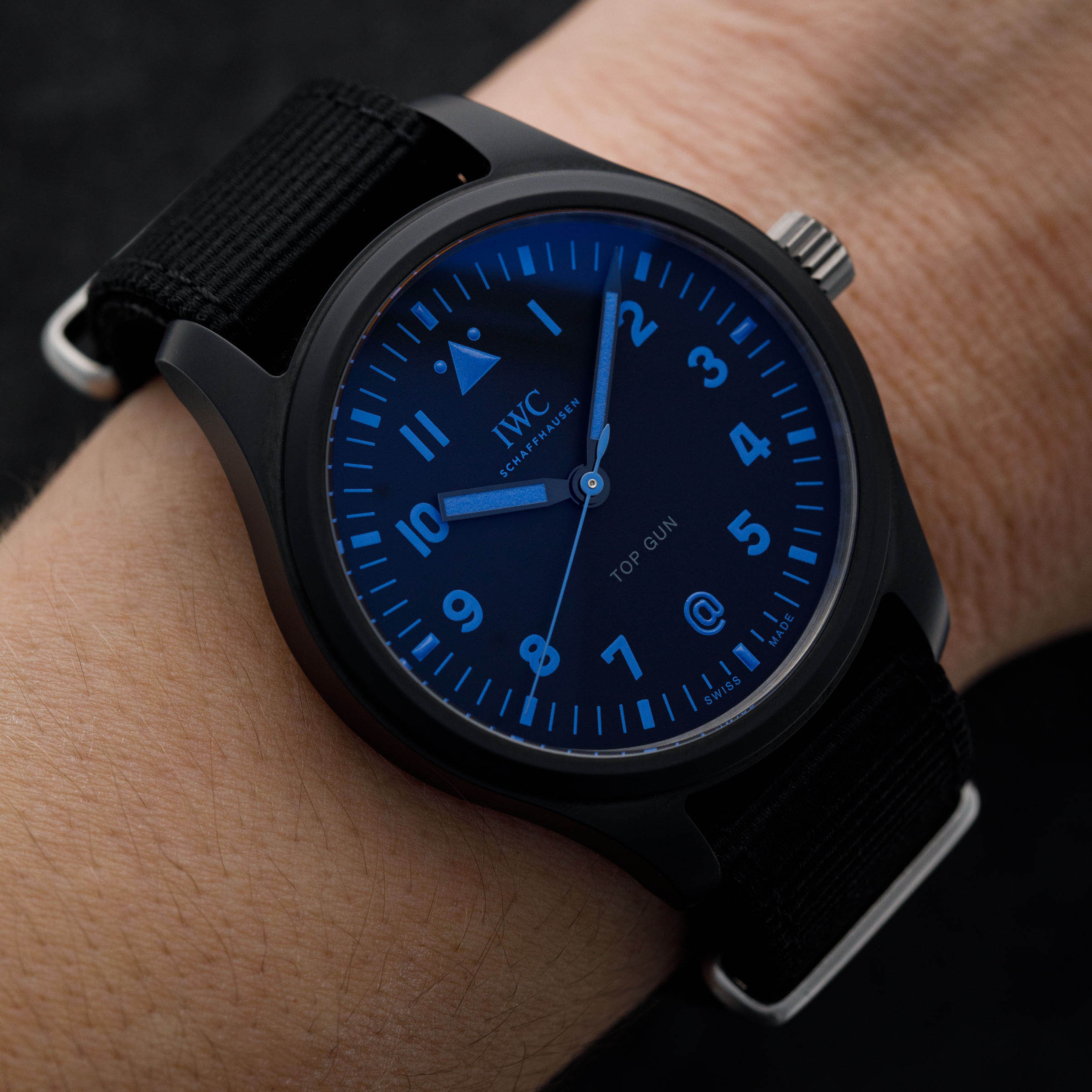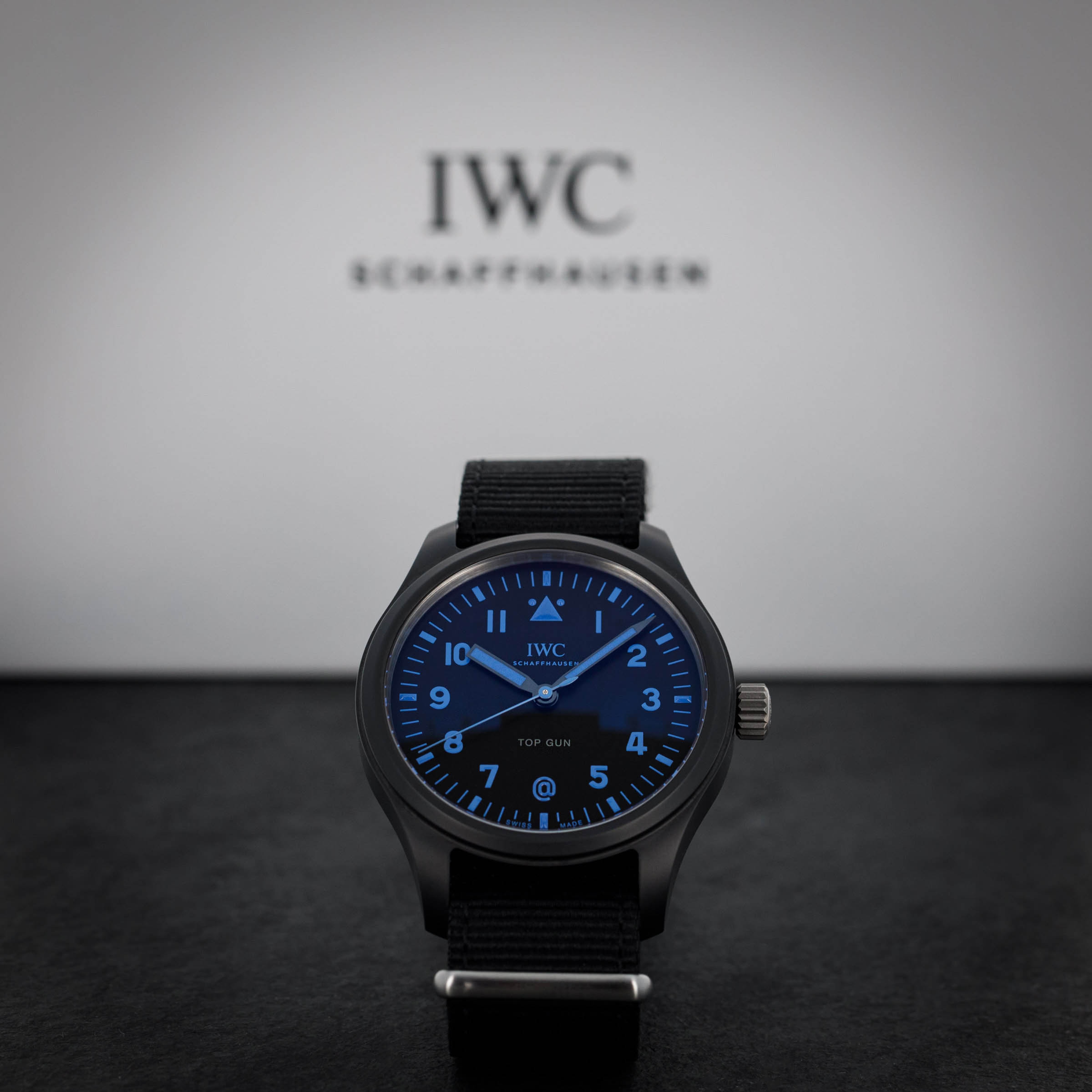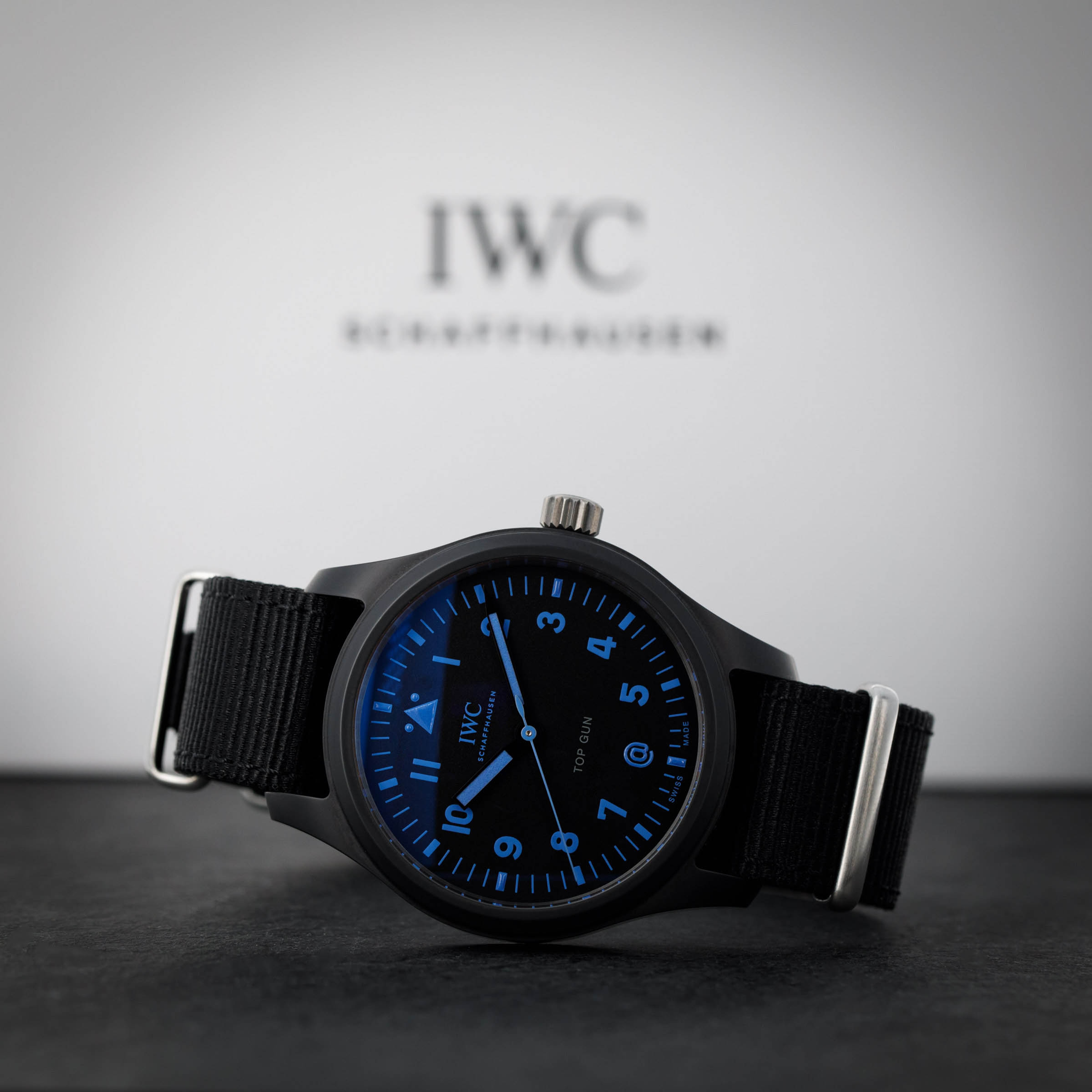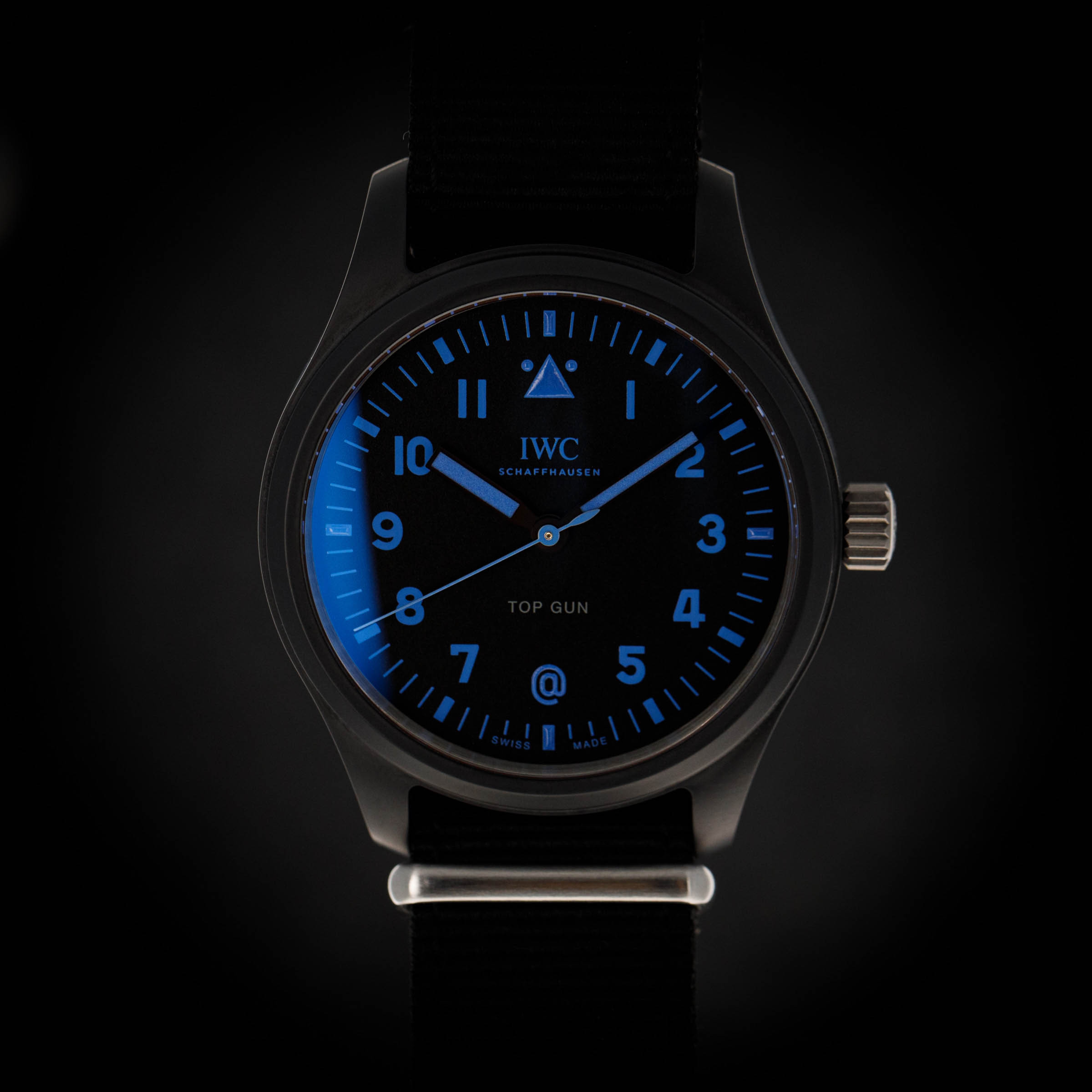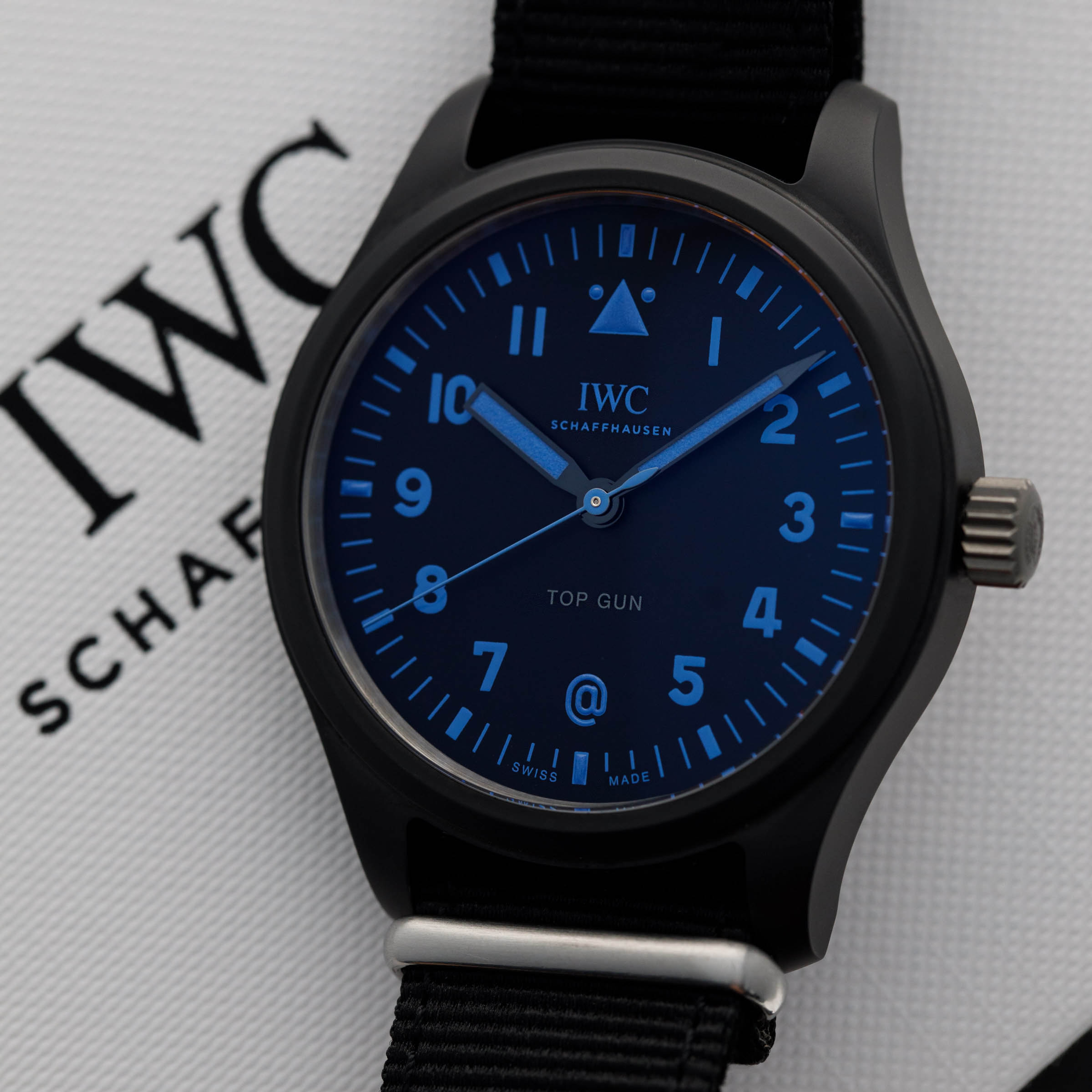 Incredibly rare and equally stunning, this special edition IWC Pilot Top Gun boasts a subtle hint as to its limited quantity through its blue inscriptions and tasteful @ symbol.