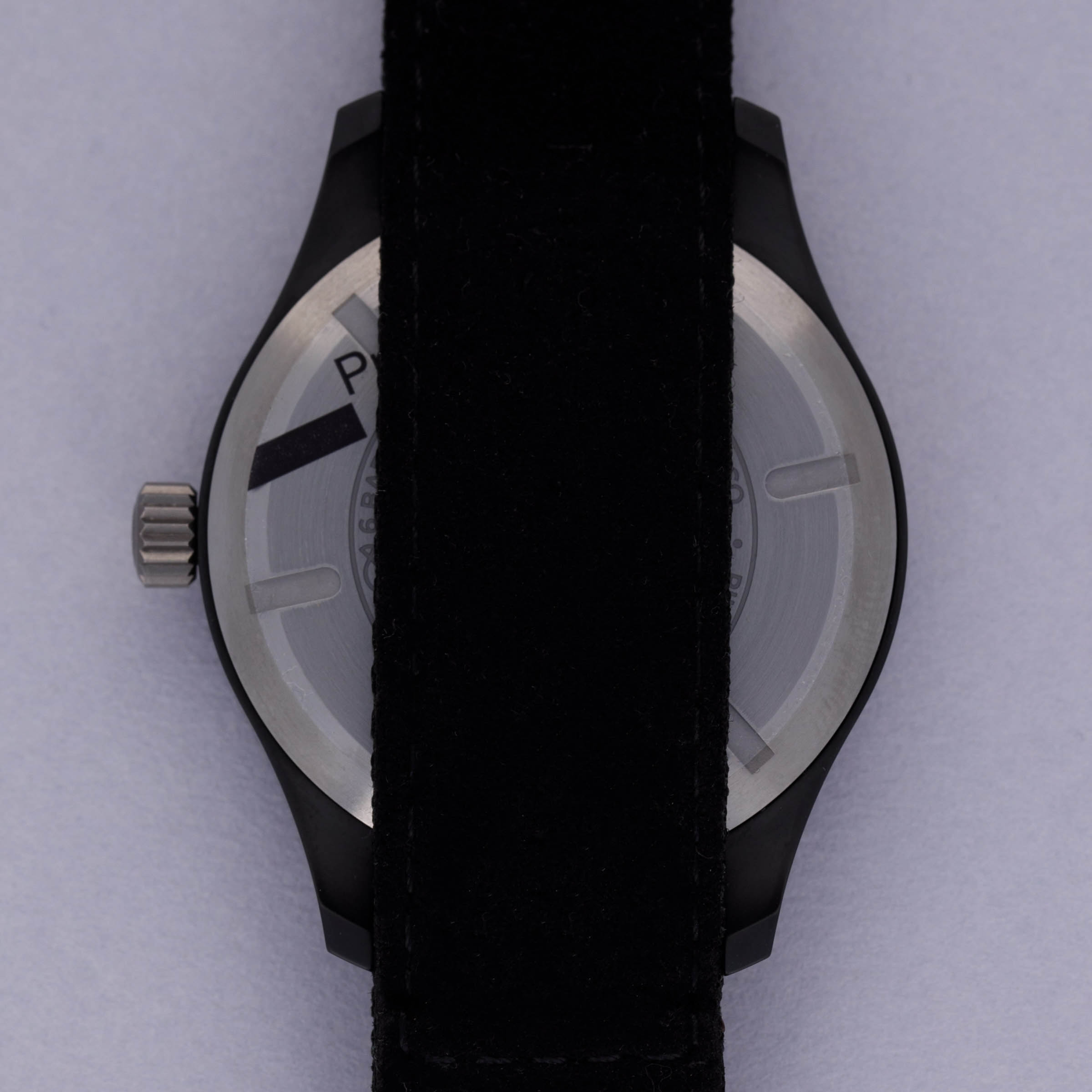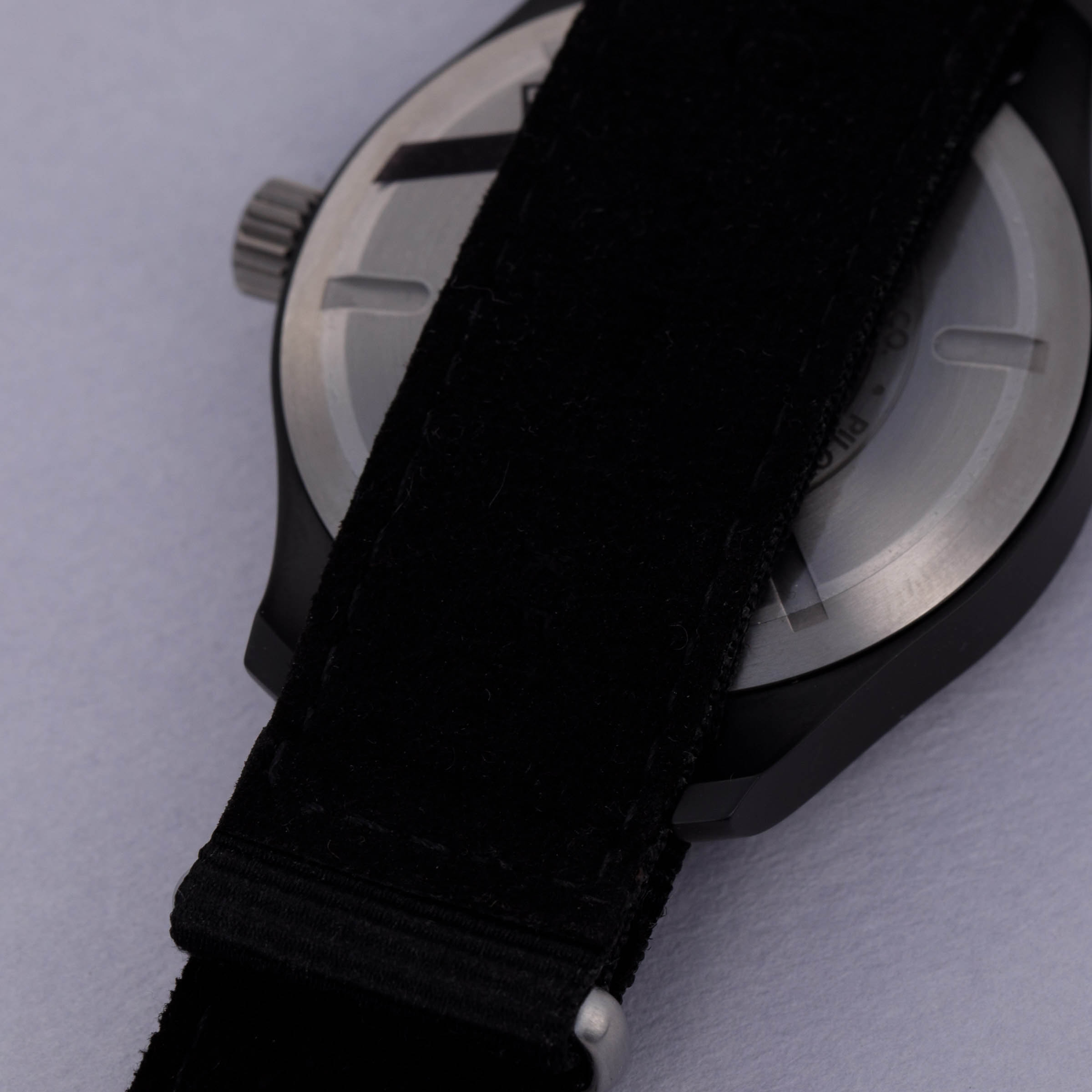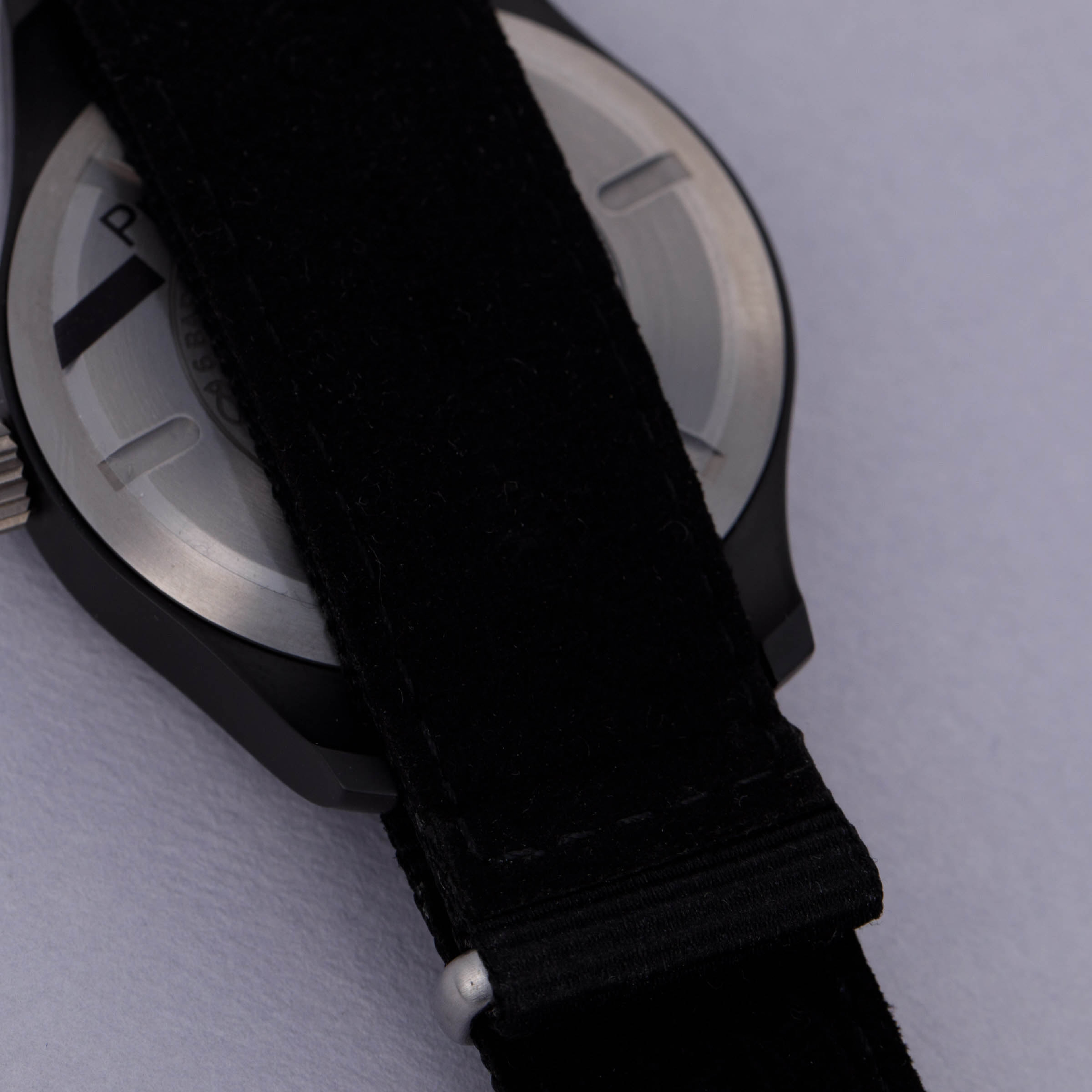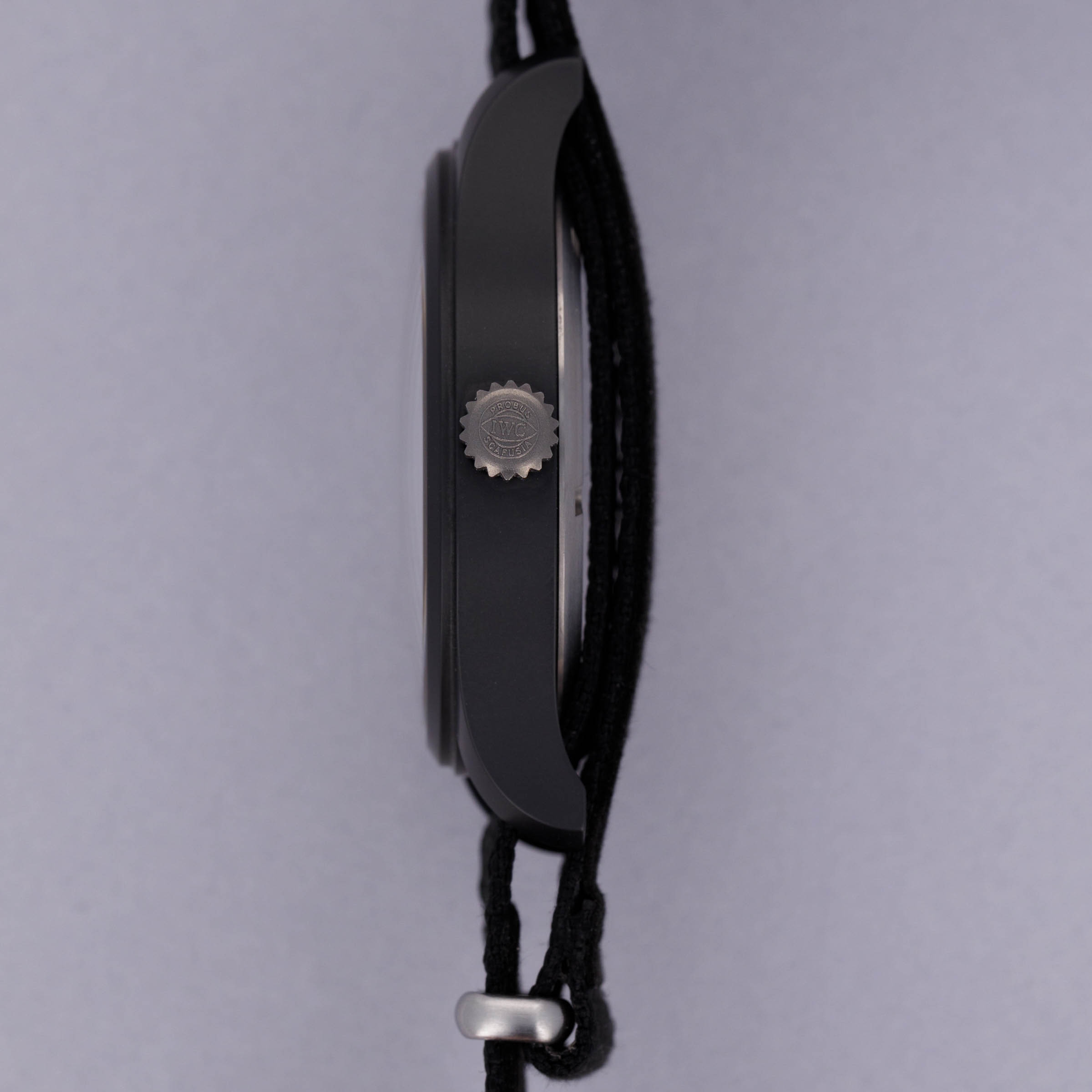 Launched in secret in 2023 as a special edition IWC Pilot Top Gun for “Watches@” - a private watch group made up of Google employees, the IWC Pilot Top Gun ref. IW326904 that we have here is a sleek and understated timepiece that has been designed to fly under the radar exactly like the characters in the film the watch was inspired by. While this model’s exact production quantities are unknown at the moment, this is likely the first time this watch has appeared on the open market, making it a rare beast indeed. Offered in a black ceramic case, with a matching black dial that has its date window at 3 o’clock deleted and IWC’s iconic square hour hand, the IW326904’s design is stunning However, its most telling detail is the array of blue inscriptions throughout its dial and luminous @ symbol, which is Watch@’s logo, at 6 o’clock which subtly hints at its limited edition status and obscurity within IWC’s catalog.