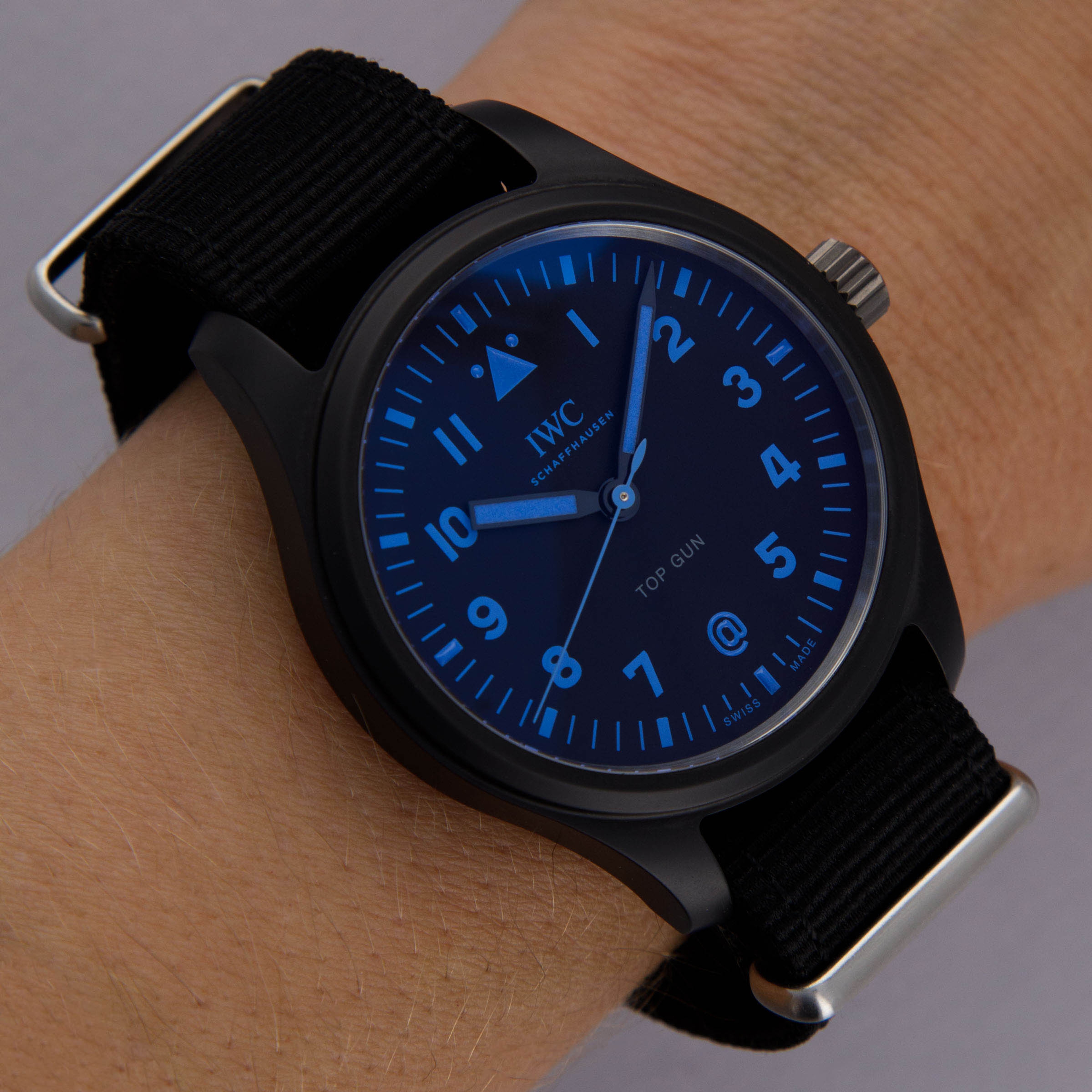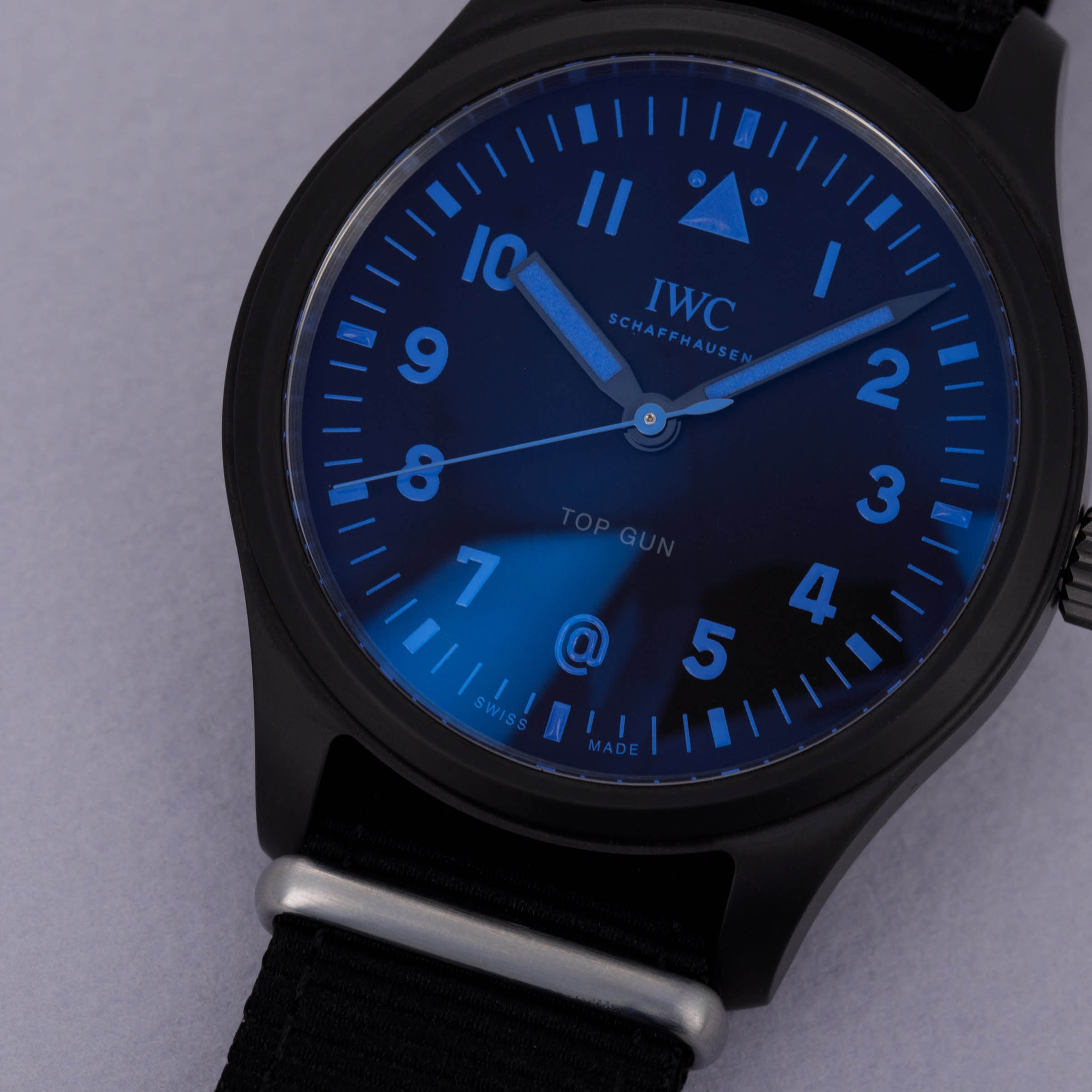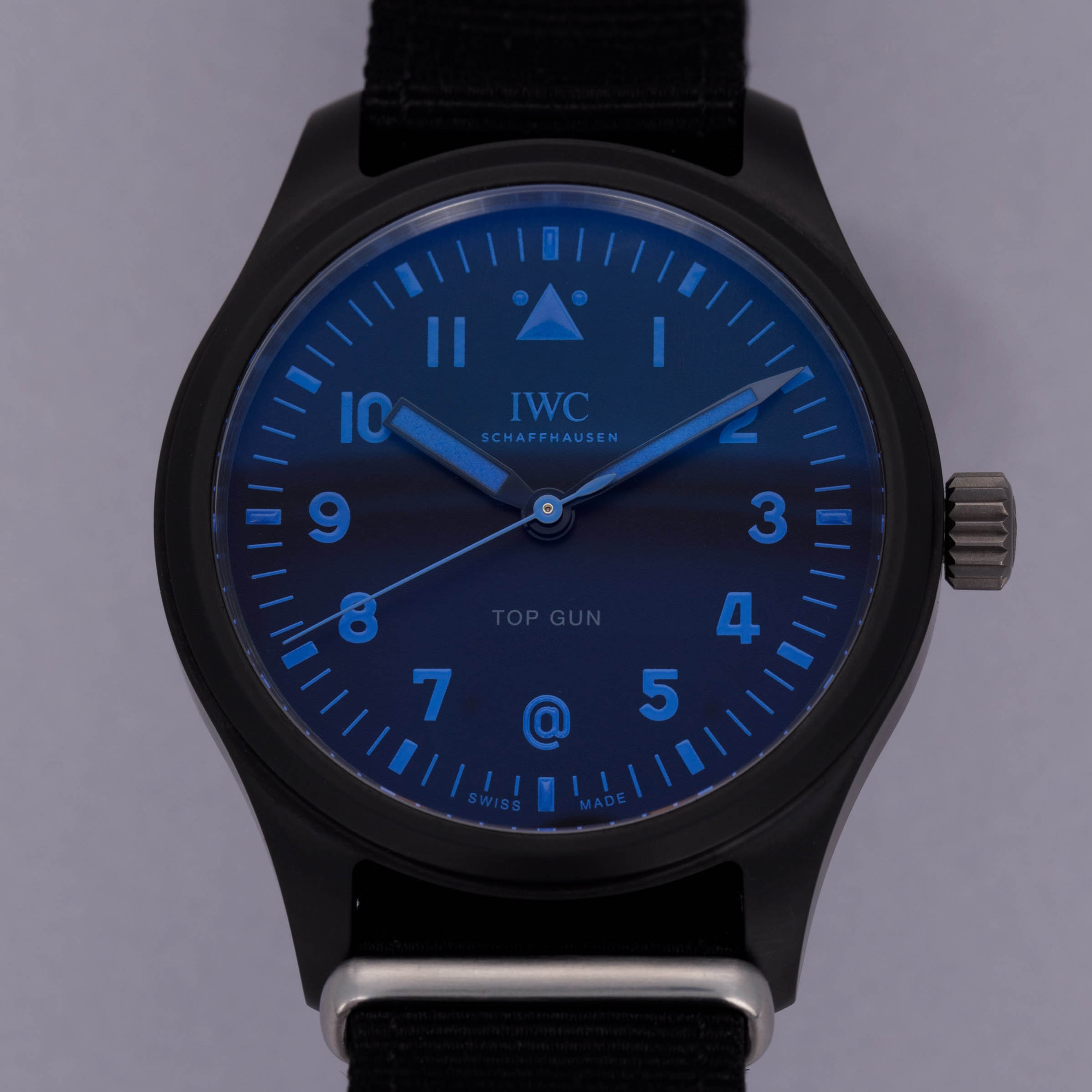 Incredibly rare and equally stunning, this special edition IWC Pilot Top Gun boasts a subtle hint as to its limited quantity through its blue inscriptions and tasteful @ symbol.