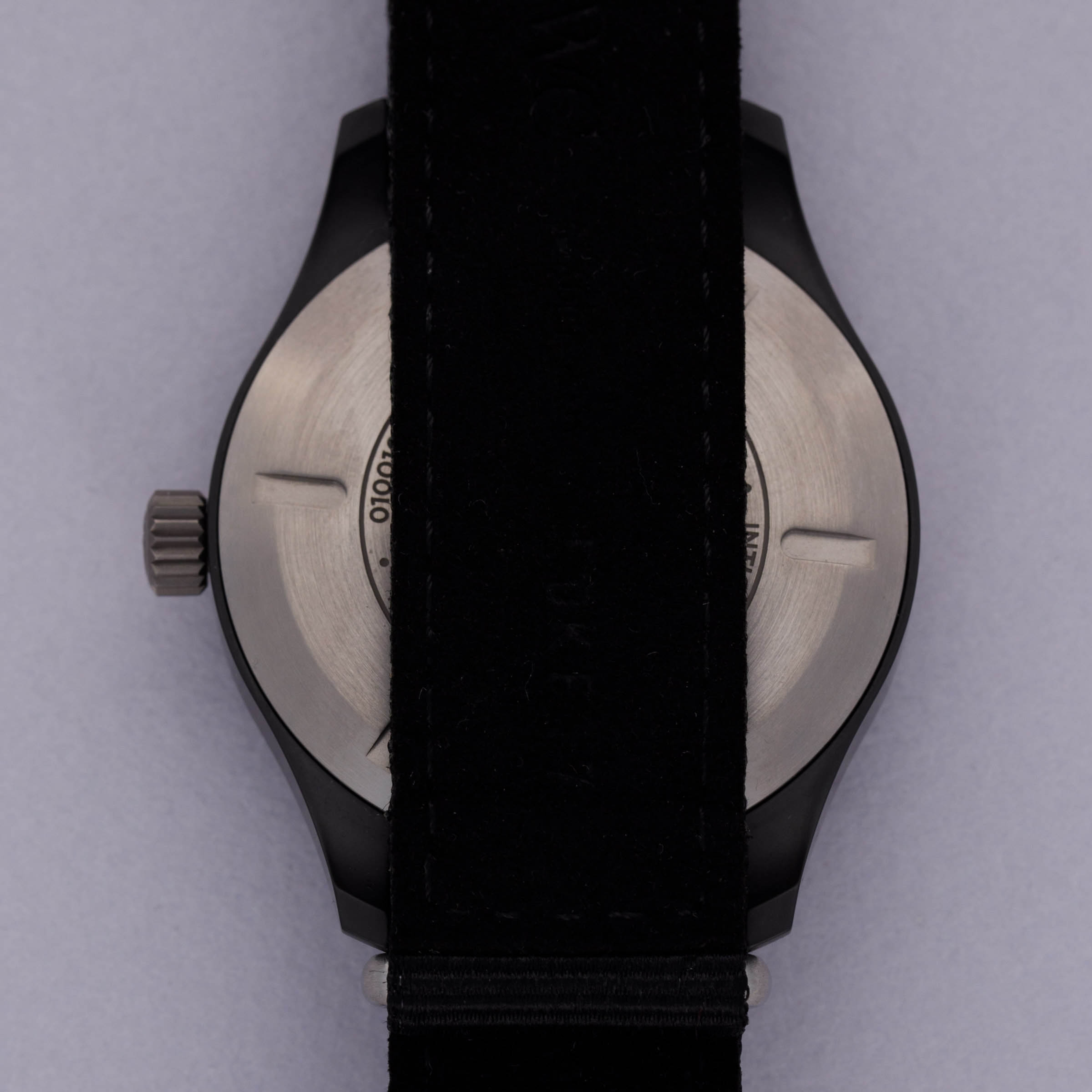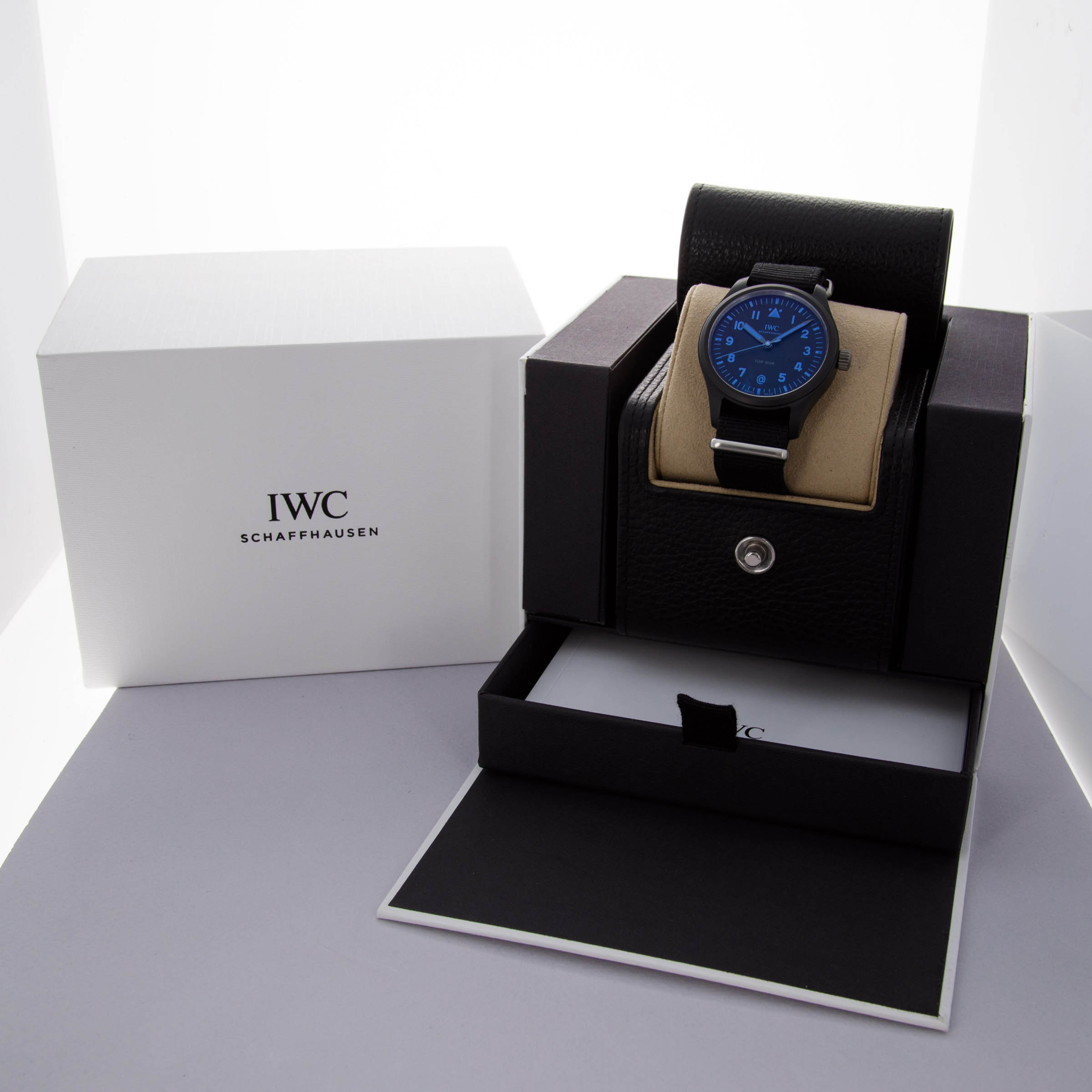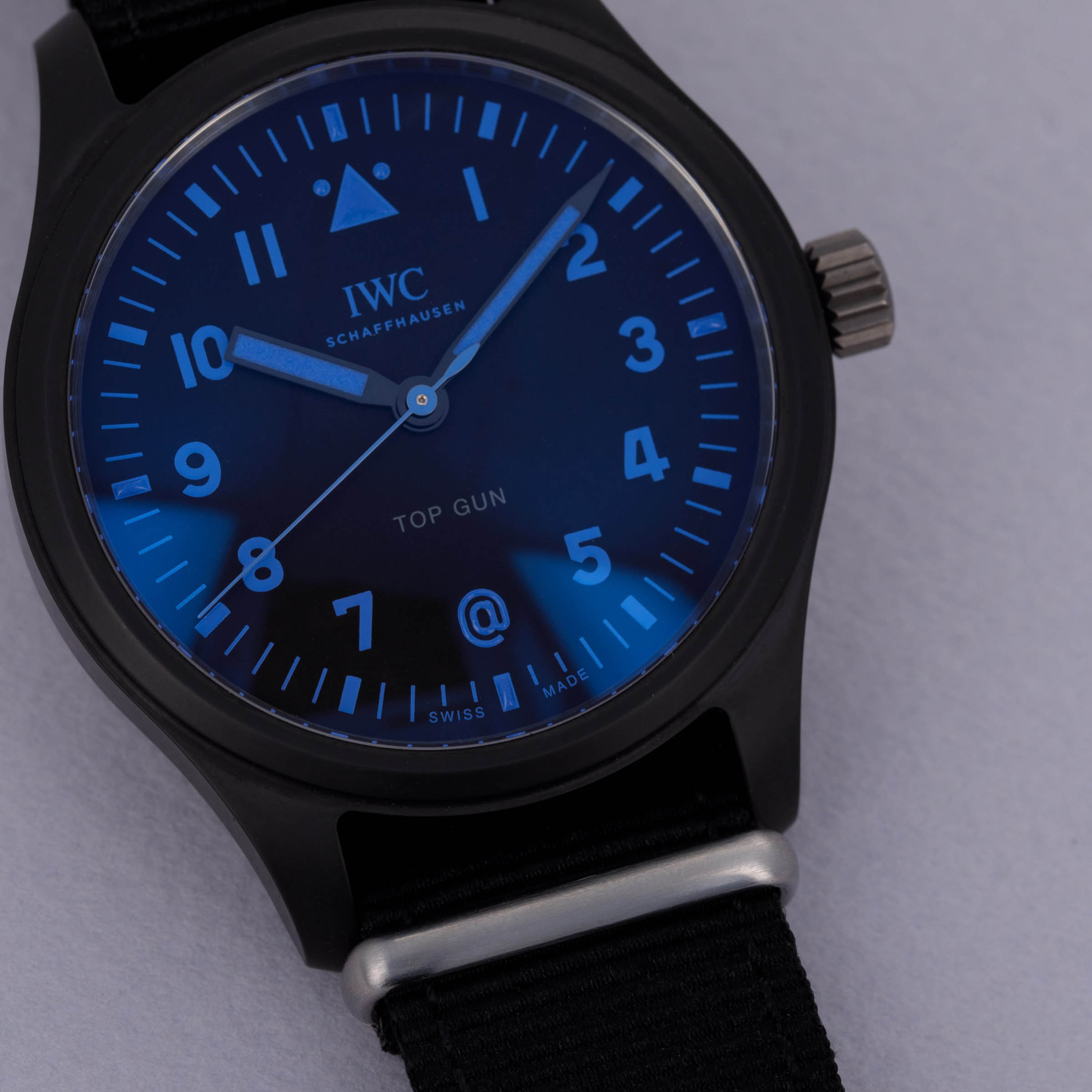 Incredibly rare and equally stunning, this special edition IWC Pilot Top Gun boasts a subtle hint as to its limited quantity through its blue inscriptions and tasteful @ symbol.