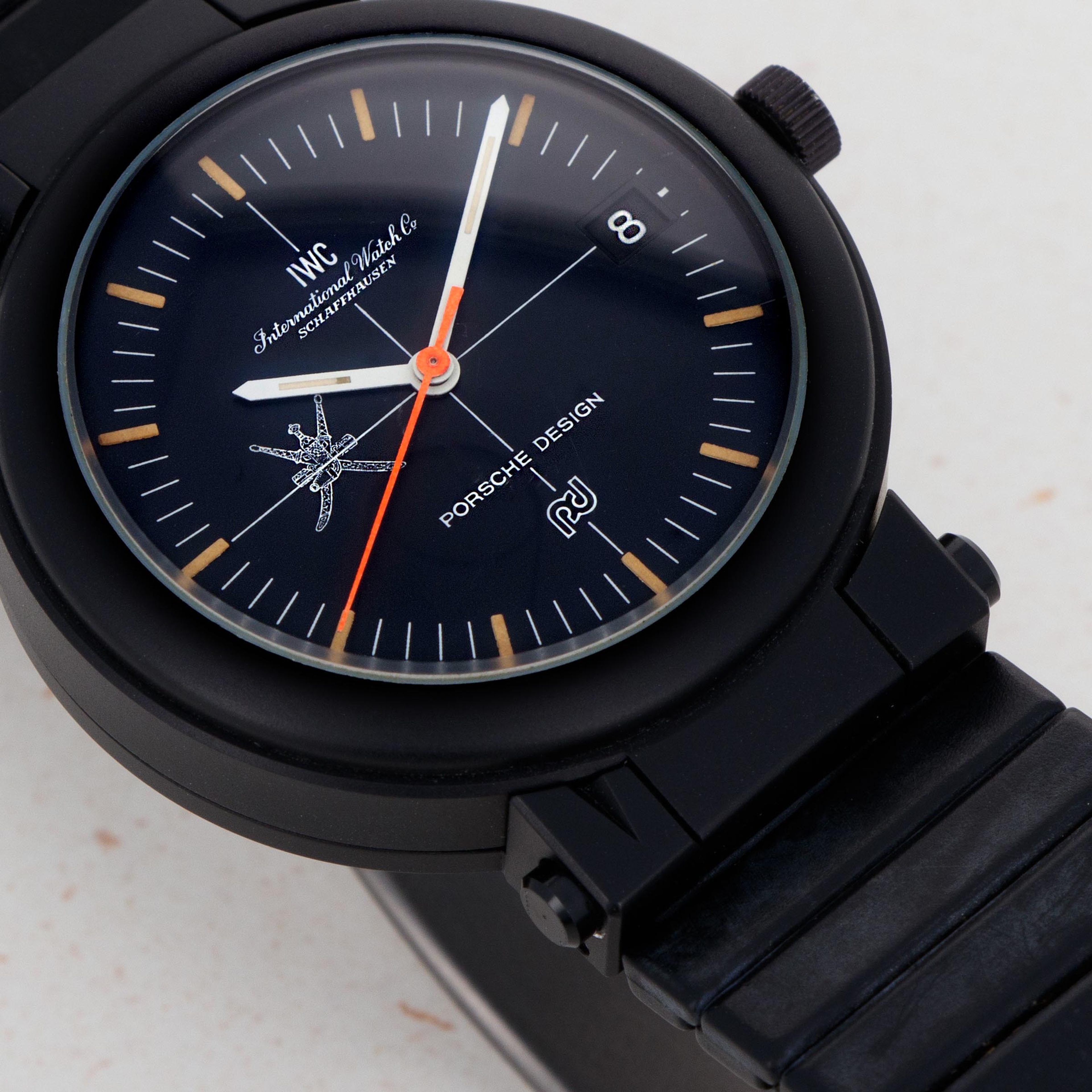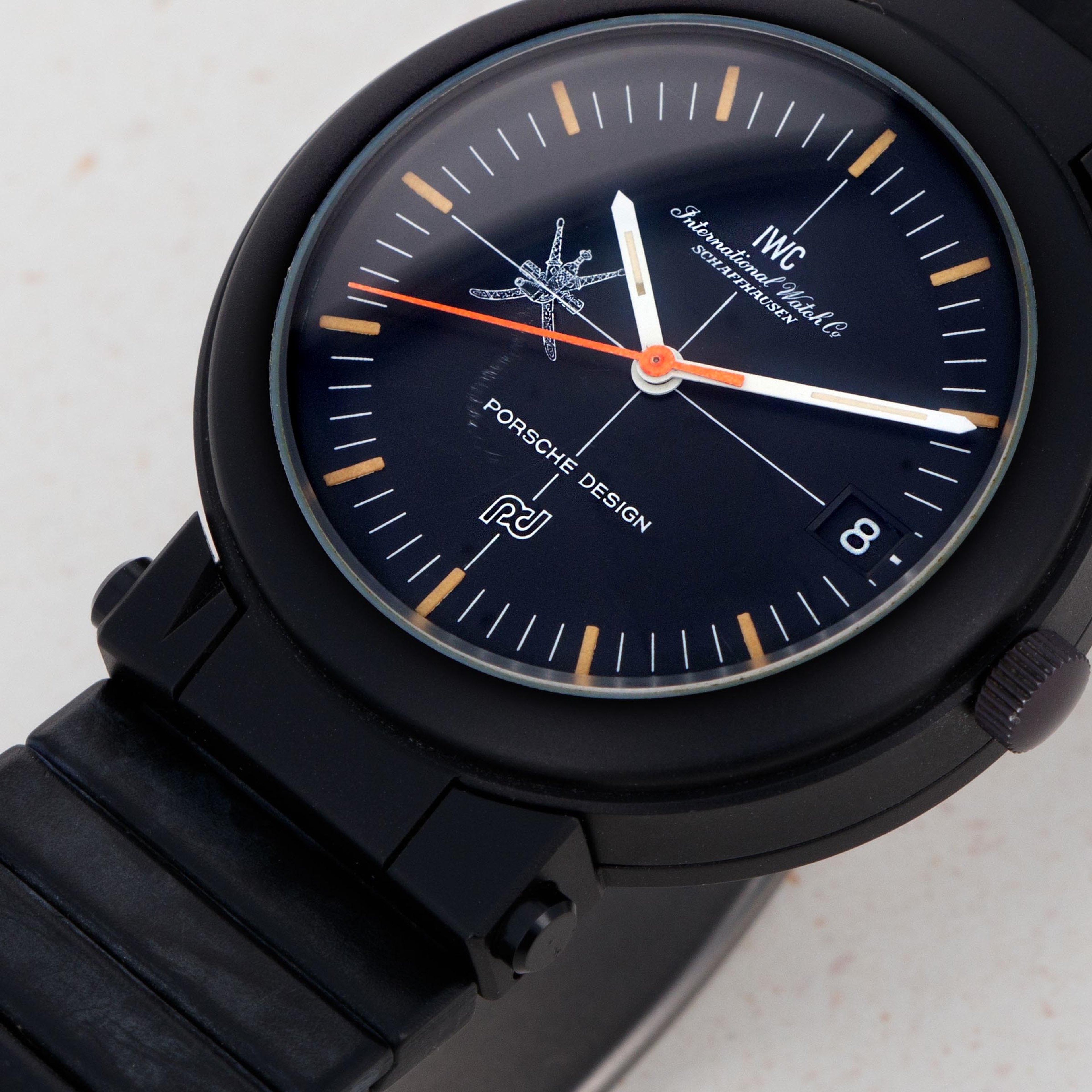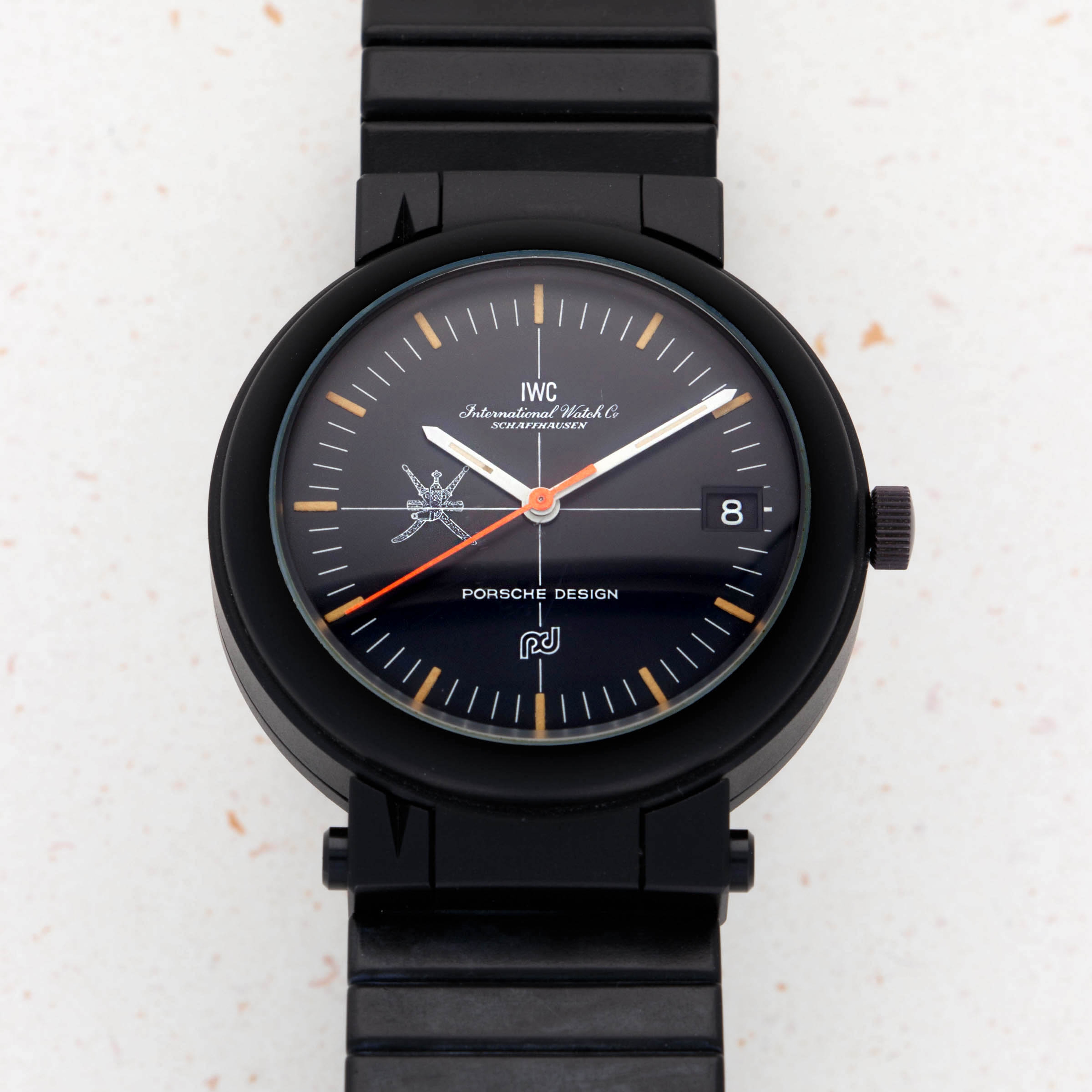 Coming together in 1978 and beginning as a means for IWC to bolster sales and create new markets for them to tap into, the Swiss watchmaker's collaboration with Porsche Design has gone down as one of the most successful and iconic collaborations within watchmaking. The collaboration has produced some fantastic watches over the decades, one of which being the very first timepiece they ever produced together, the IWC Porsche Design Compass Watch. Launched in 1978, it was designed by the same man who designed the Porsche 911 in 1963, Ferdinand A. Porsche. Having left his family’s eponymous automaker, Ferdinand founded Porsche Design Studio in 1972 and became known for his affinity for Bauhaus design aesthetics – a design language that IWC and Porsche Design’s collaboration watches would embody. As such, the IWC Porsche Design Compass Watch is a famously minimalist timepiece that features an uncomplicated circular 39mm two-tier PVD-coated aluminum case that features a black sector dial to display the time and a compass on the tier beneath that can be shown when the case has been opened via the pushers on either side of the lugs at 6 o’clock, with the lugs at 12 o’clock doubling as a hinge. A rare and interesting timepiece by all accounts, the example we have here was also commissioned by the Sultanate of Oman and so features a Khanjar dagger on its dial in keeping with the Royal family’s tradition when ordering timepieces from watchmakers.