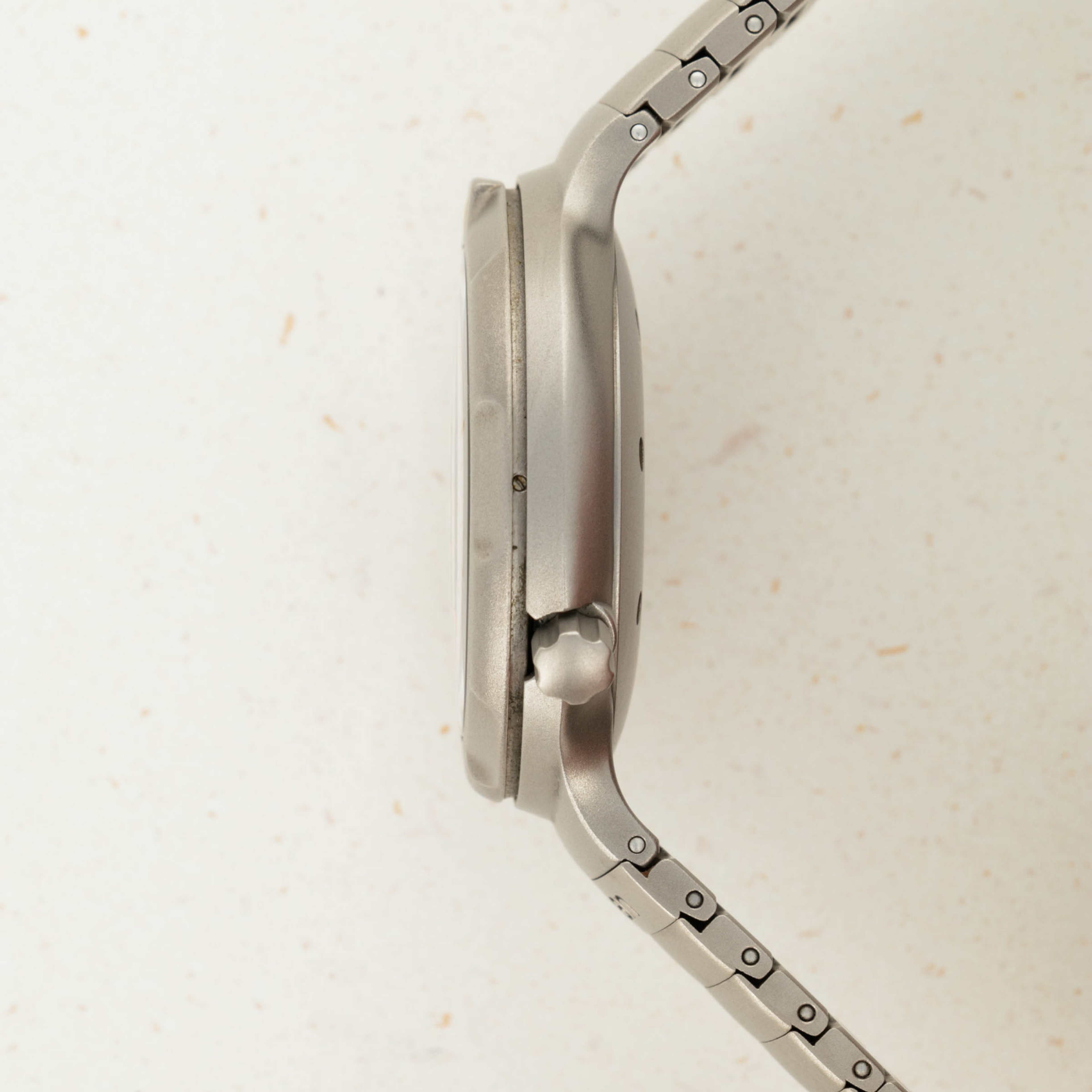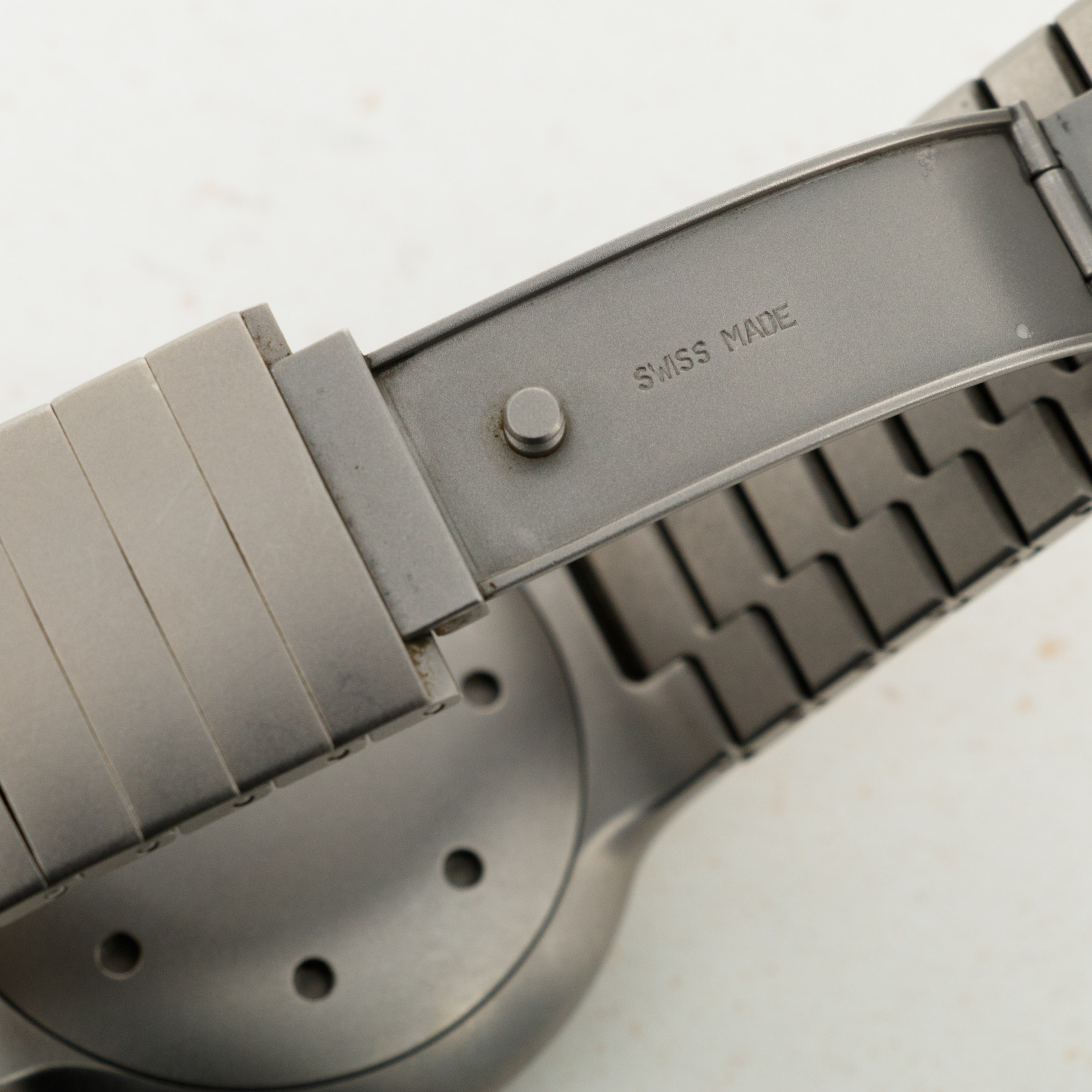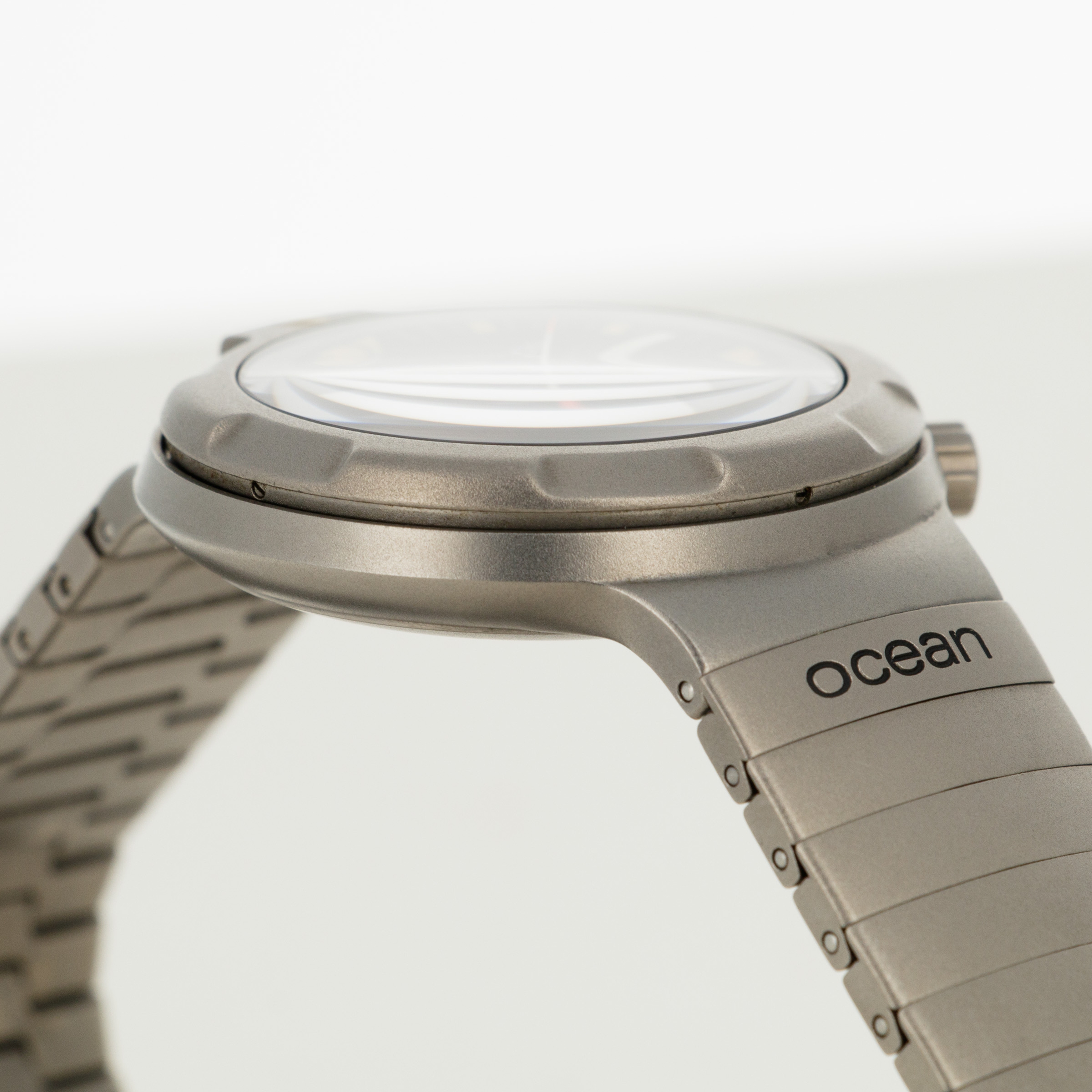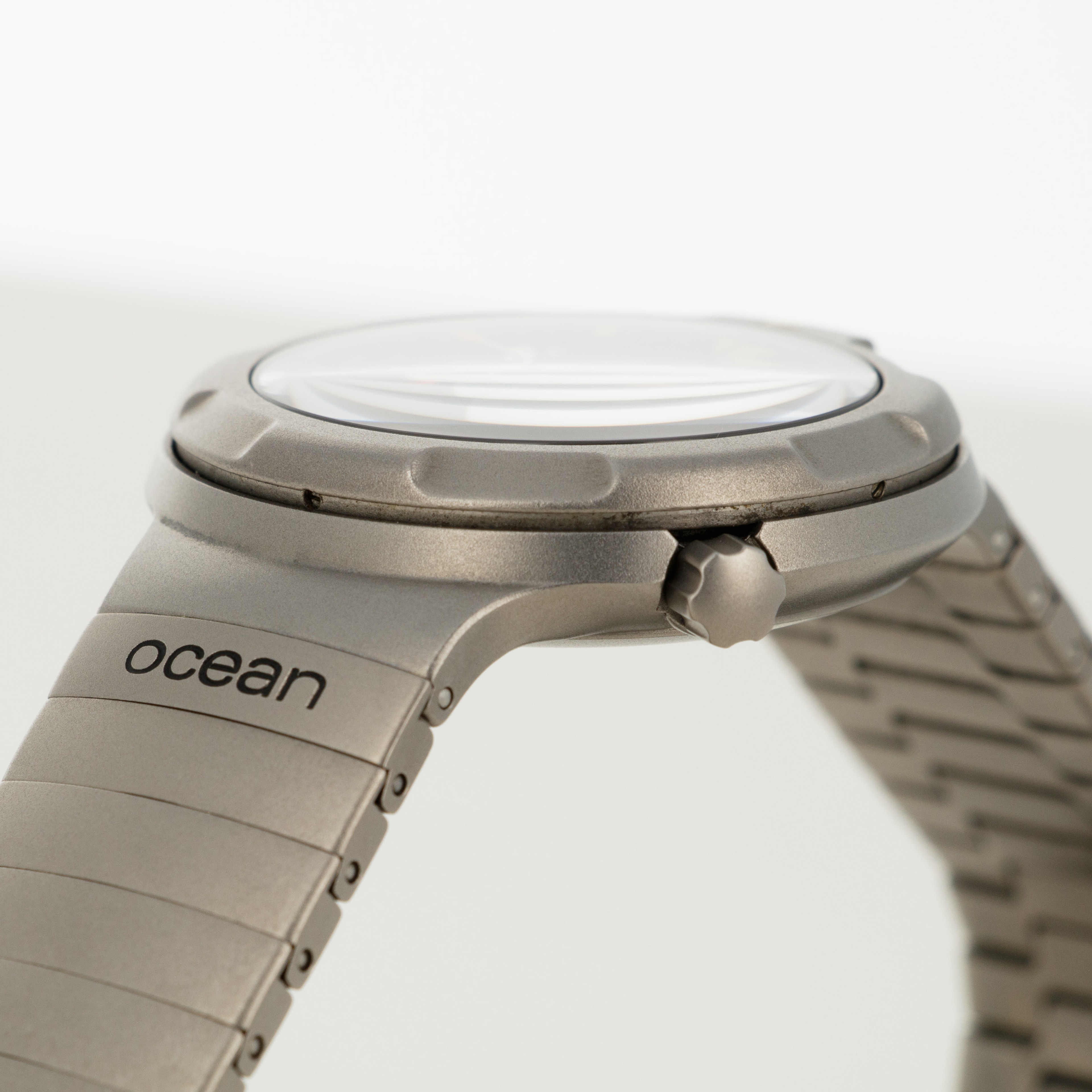 A unique watch for the time, and still to this day, the Ocean 2000's peculiar titanium construction is further set aside due to its aesthetic dissimilarities from other watches of its time, with a single-link integrated bracelet, round case and 4 o'clock position winding crown.