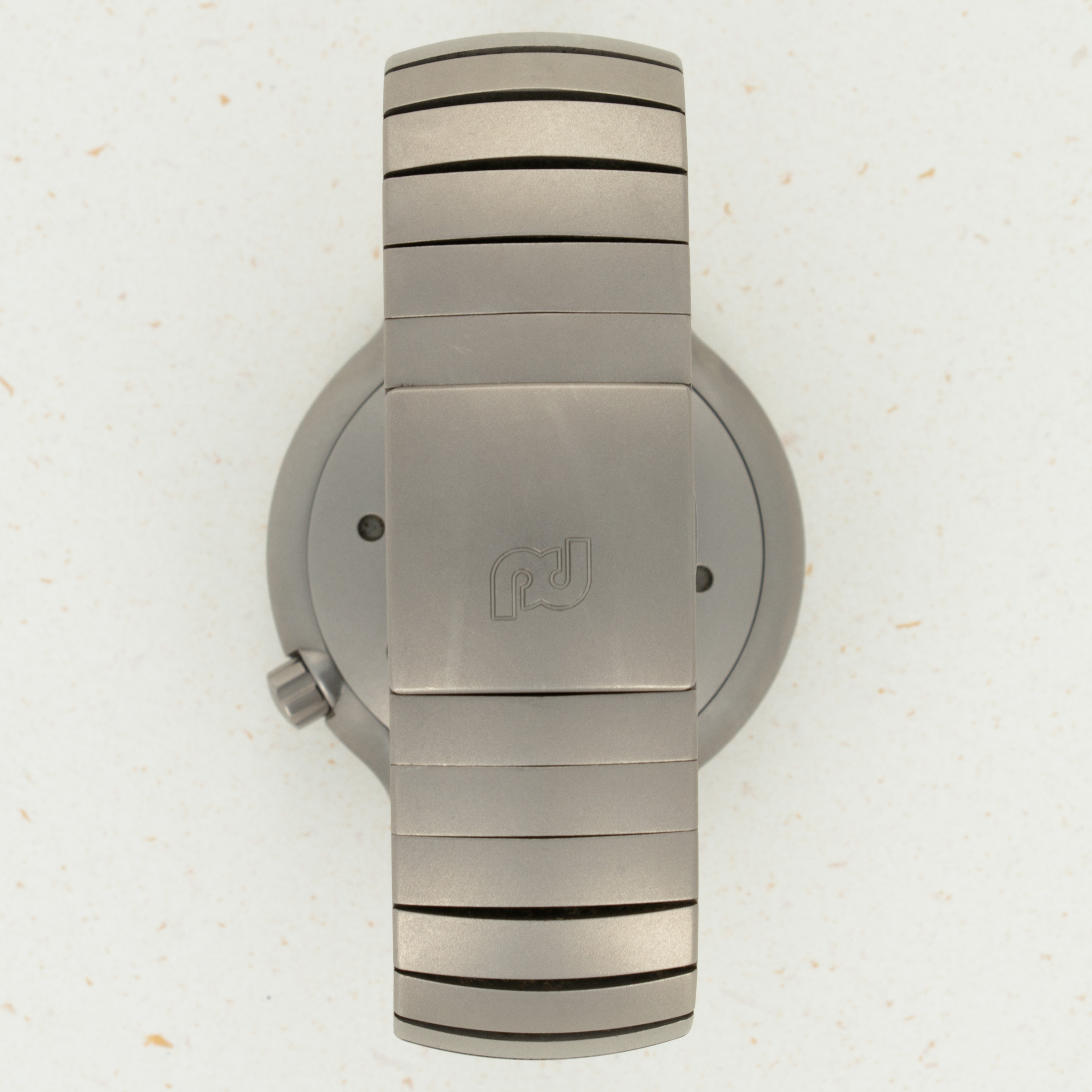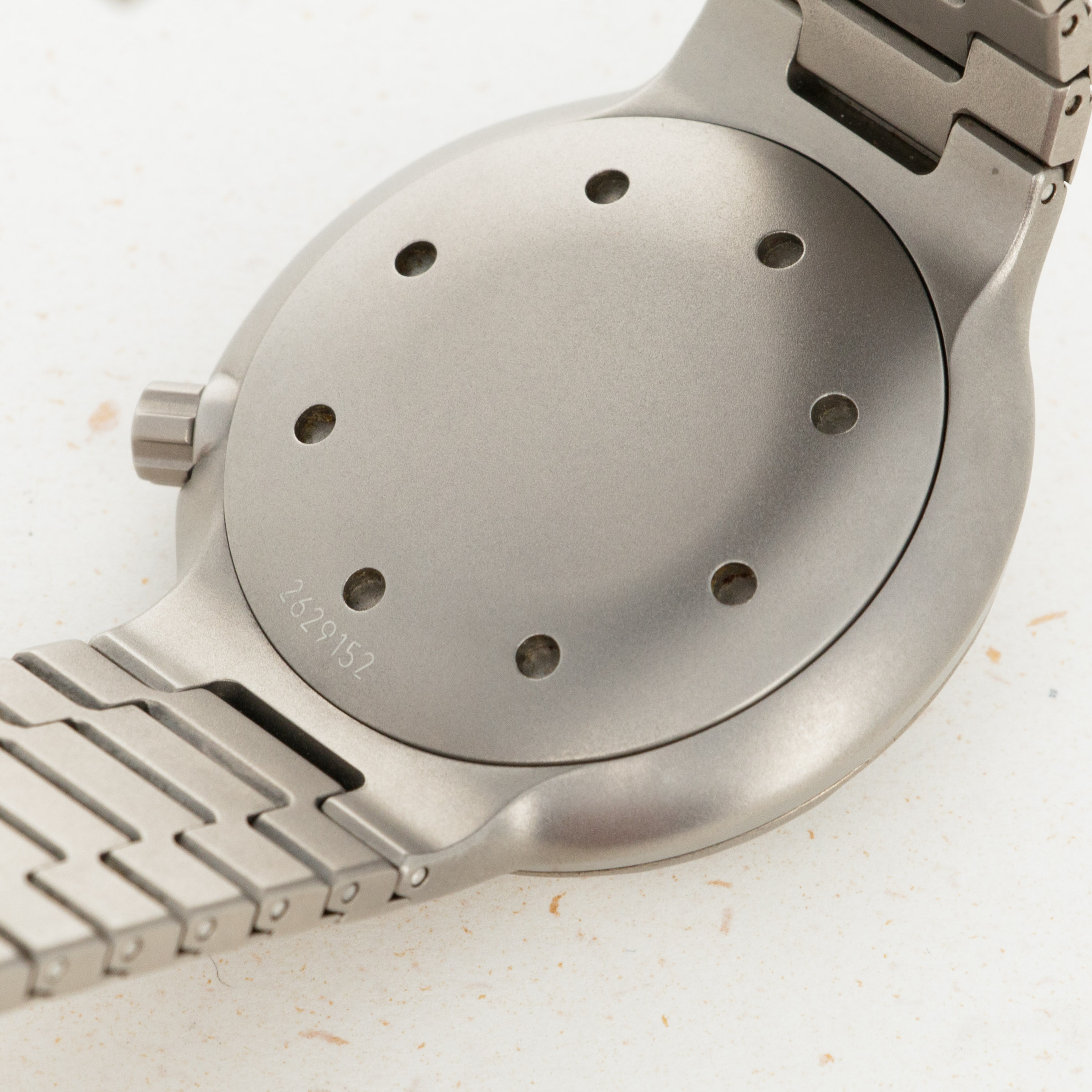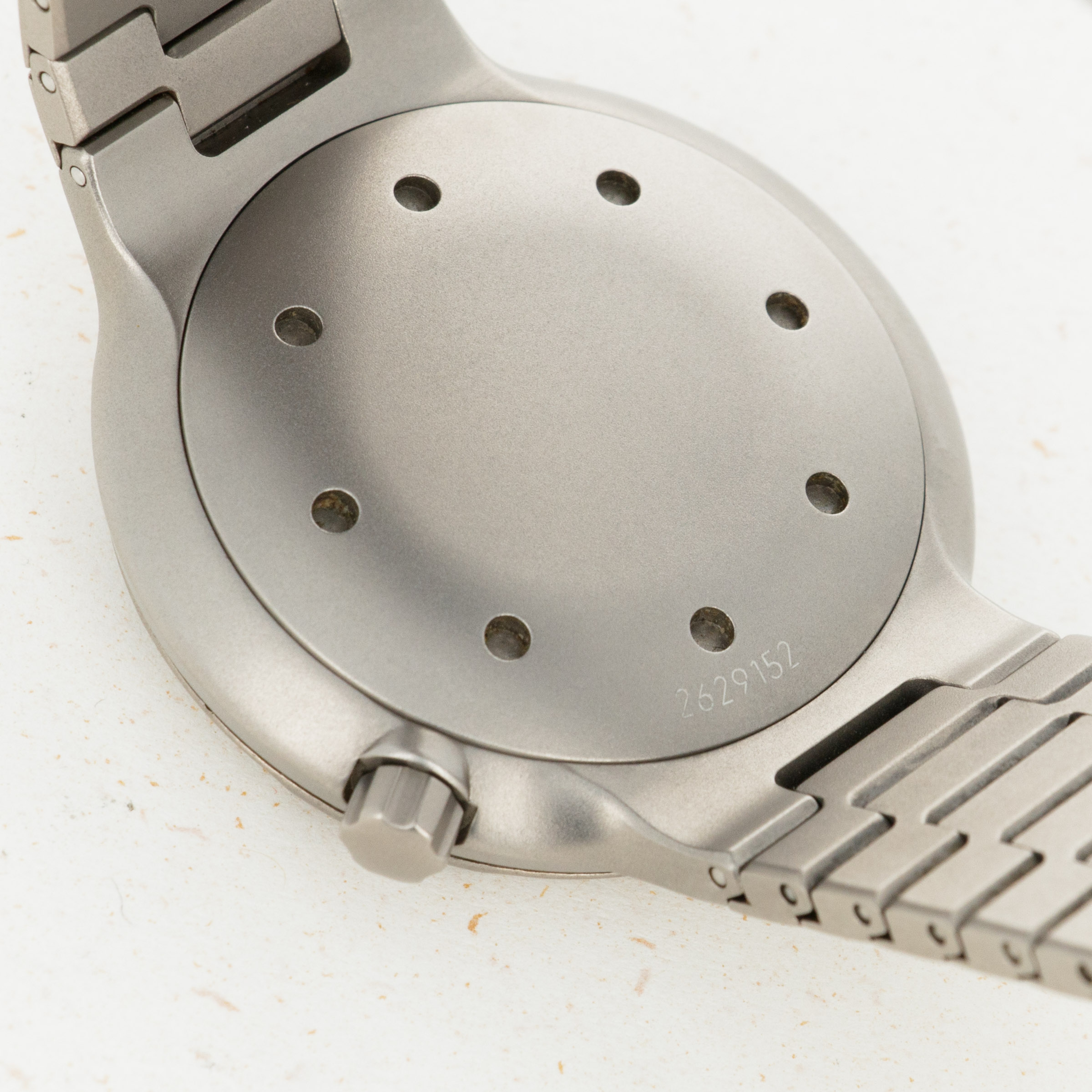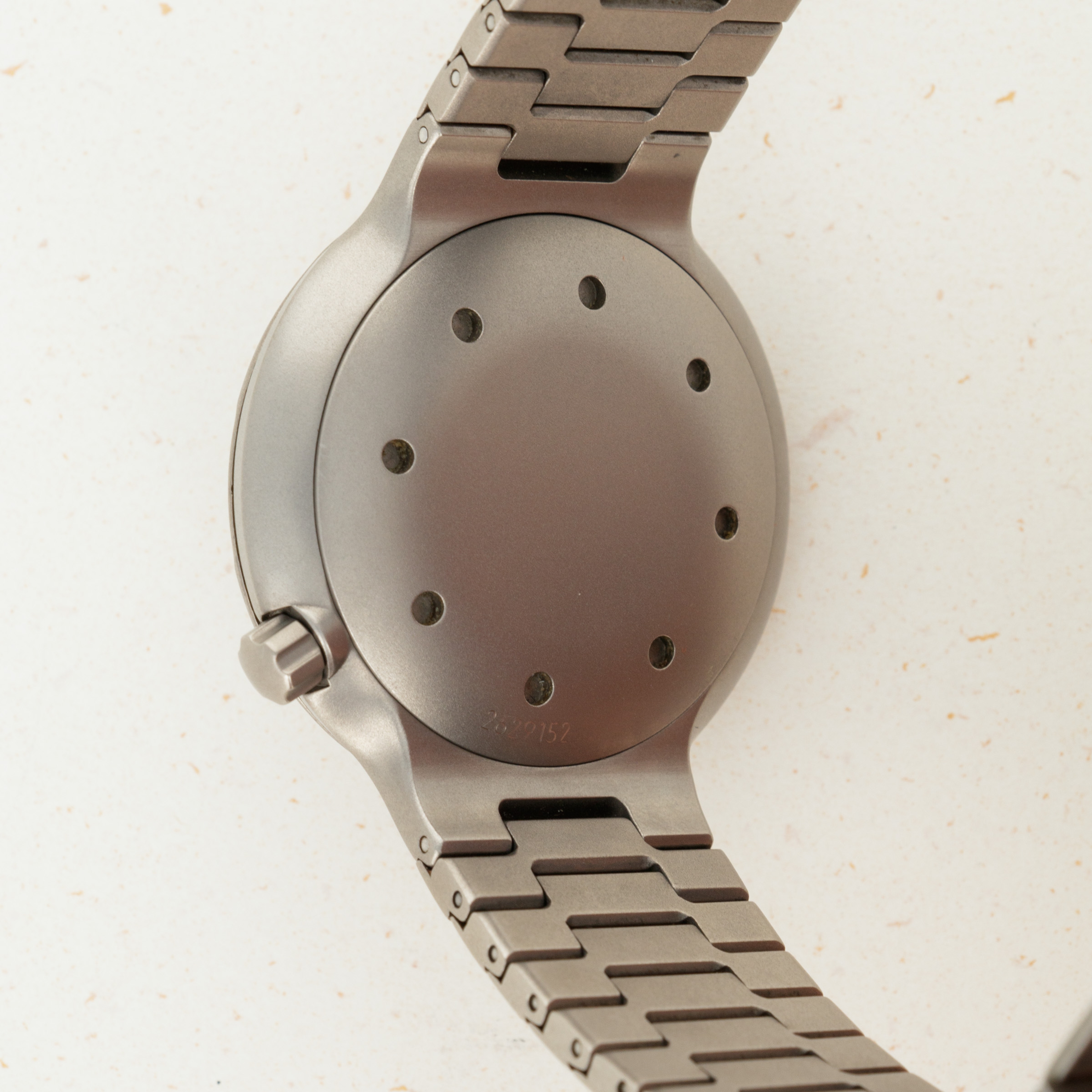 A unique watch for the time, and still to this day, the Ocean 2000's peculiar titanium construction is further set aside due to its aesthetic dissimilarities from other watches of its time, with a single-link integrated bracelet, round case and 4 o'clock position winding crown.